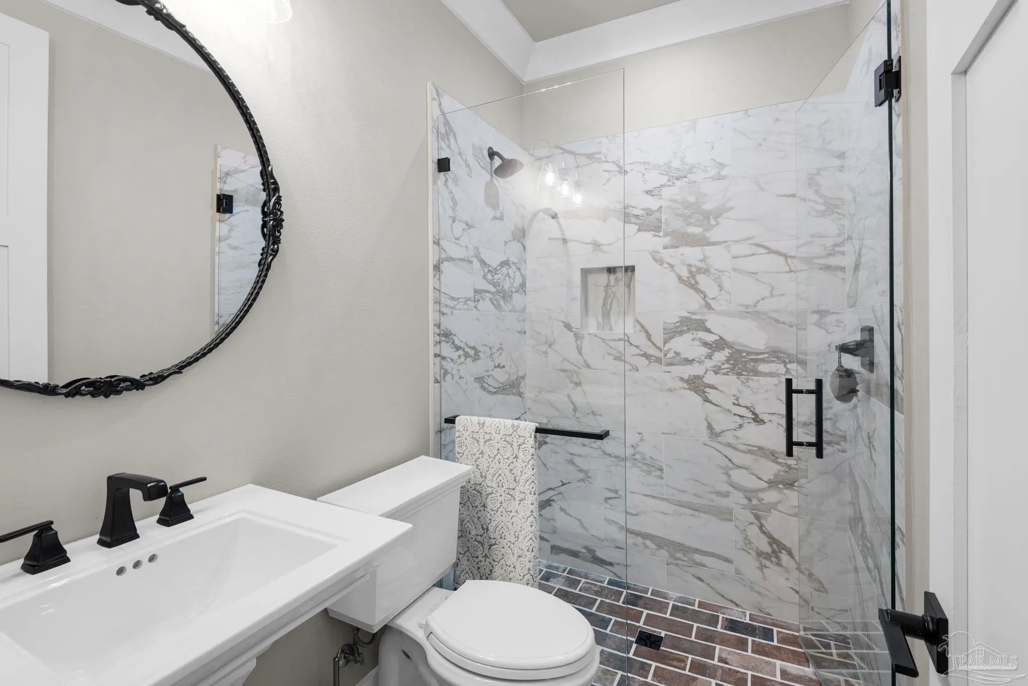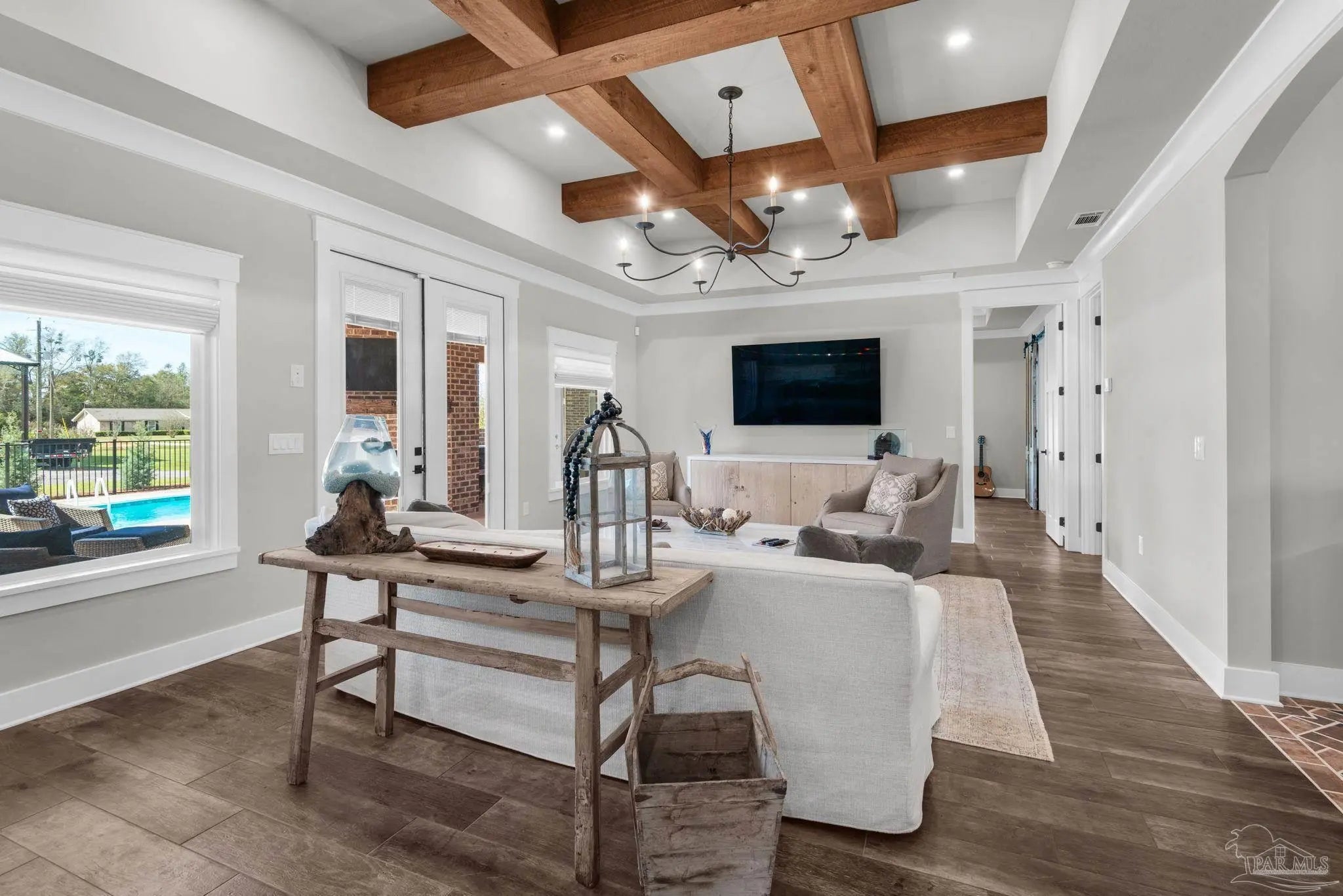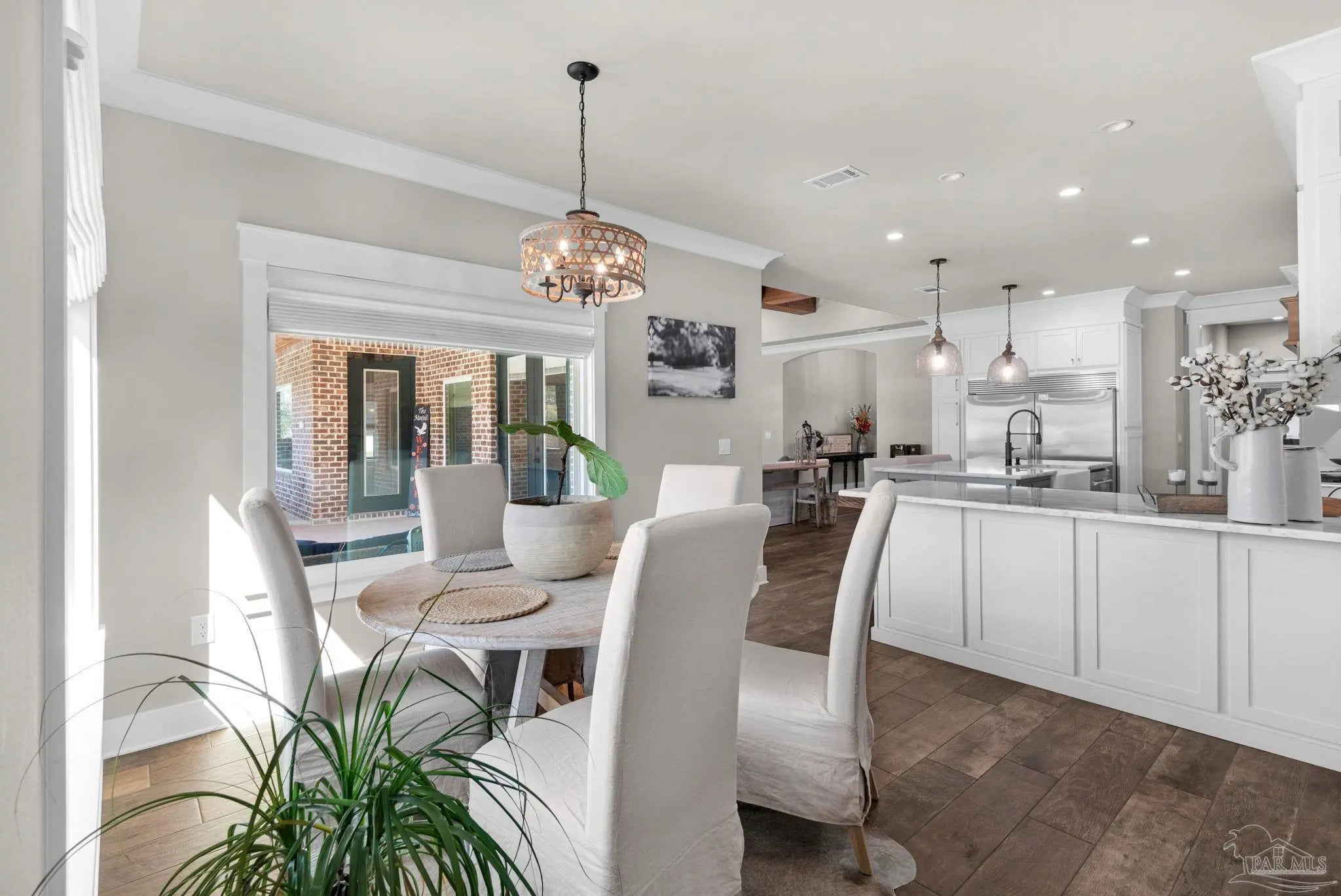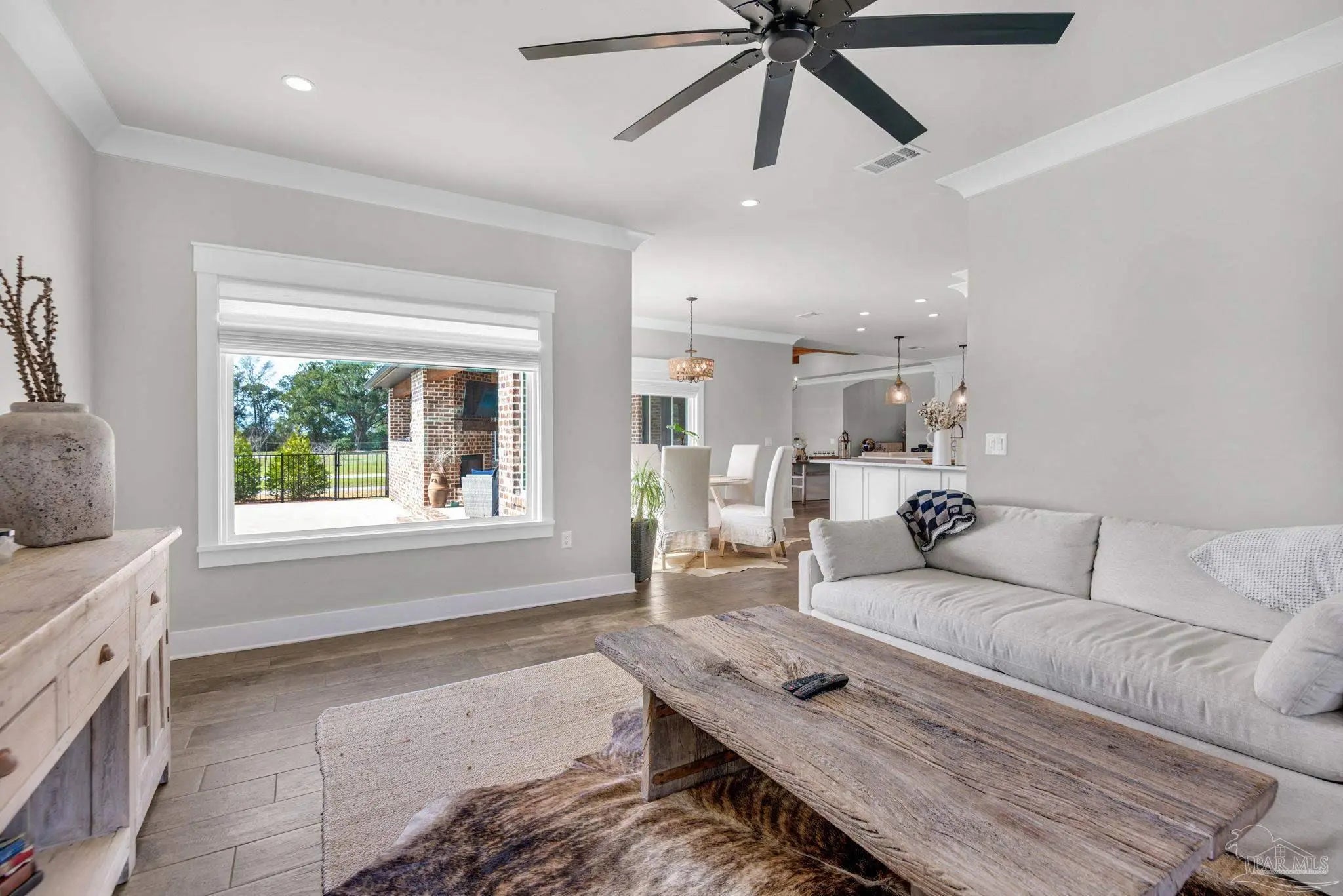 URGENT MUST-SEE! This executive custom home is loaded with upgrades and every bell and whistle, situated on a beautiful one-acre lot in the heart of Pace with no HOA. Offering 5 bedrooms and 4 bathrooms, this stunning home blends luxury finishes, thoughtful design, and incredible indoor and outdoor living. Inside, the welcoming foyer features Chicago brick accents and opens to a spacious living room with beautiful coffered wood beam ceilings. The private primary suite offers tray ceilings, an antique barn door, and a spa-inspired bathroom complete with hexagon tile flooring, a freestanding soaking tub, glass walk-in shower with bench seating, private water closet, and dual custom walk-in closets. The chef’s kitchen is a showstopper featuring quartz countertops, farmhouse sink, and a professional 48" dual-fuel range with a 7-burner gas cooktop, cast iron griddle, and double electric ovens. Additional highlights include a full-size refrigerator and freezer, floor-to-ceiling cabinetry, vent hood, under-cabinet lighting, pull-out microwave drawer, herringbone subway tile backsplash, oversized island, walk-in pantry, and drop zone. Upstairs offers a loft-style bedroom with a full bath, and walk-in attic storage. Step outside to enjoy the in-ground pool with metal safety fence and a covered lanai featuring a gas fireplace and aoutdoor kitchen, perfect for entertaining. Also includes a tankless gas water heater, spray foam installation, sprinkler system, and an oversized garage designed to fit a king-cab truck. Two driveways provide easy access to the impressive 40x80 metal building with a 20-foot open span and 14-foot roll-up doors, ideal for RVs, boats, a workshop, or additional storage. Plus, a air-conditioned workout room with full bath. Homes with this level of custom detail, land, pool, and shop rarely come available. Schedule your private showing today before this incredible property is gone.