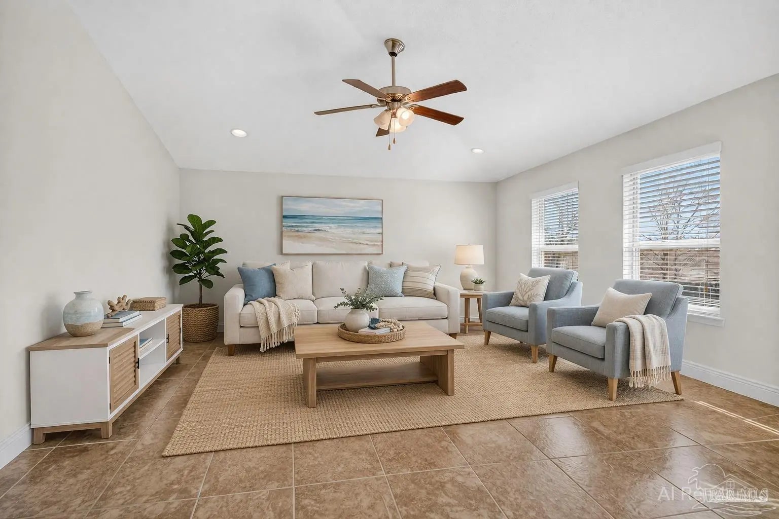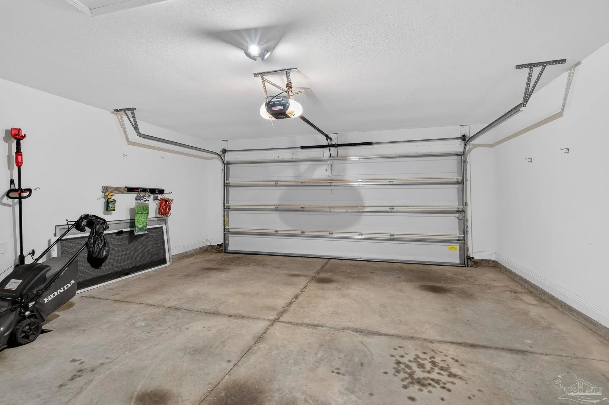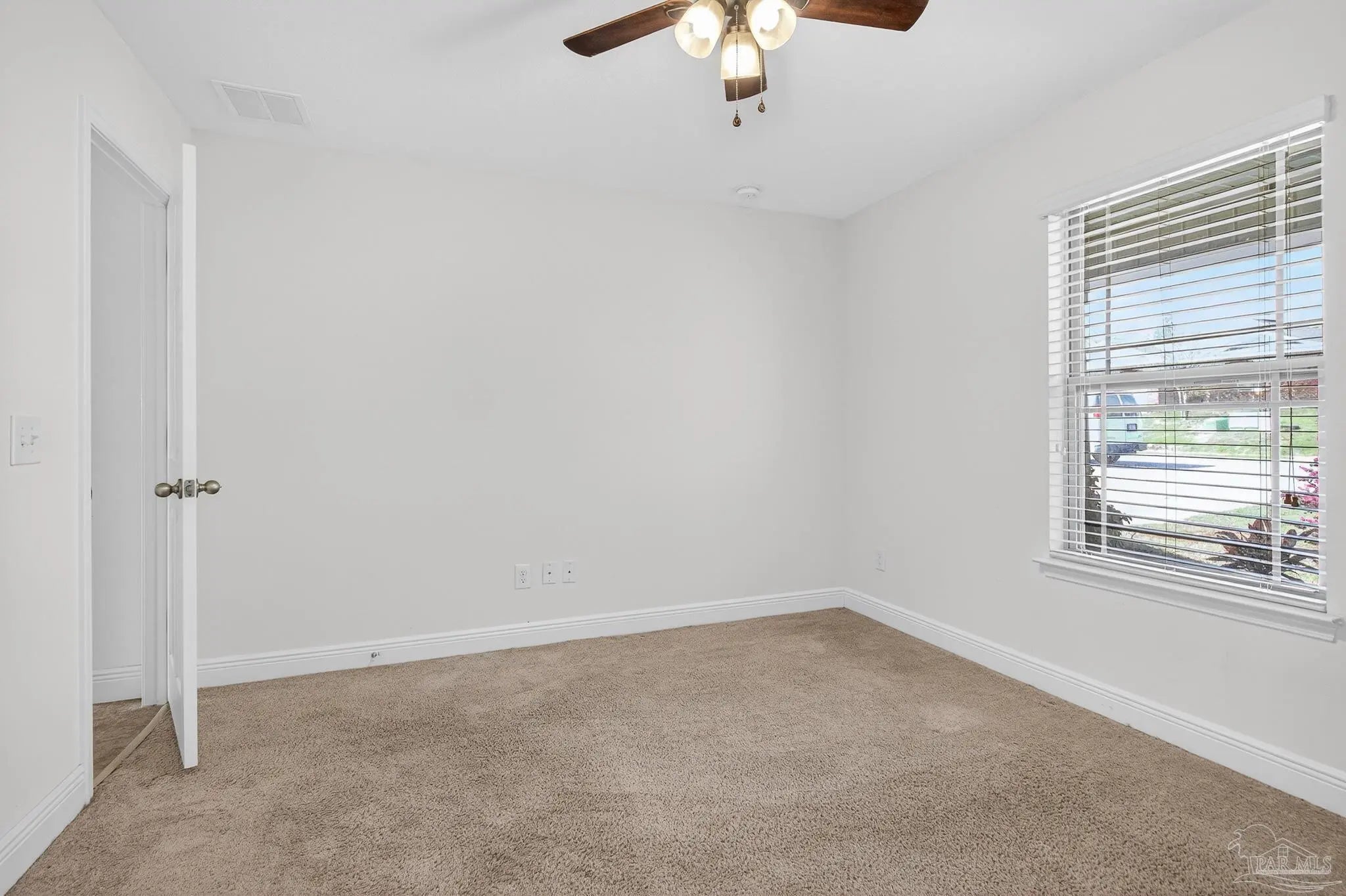 Located on a corner lot in Bon View, this all-brick home offers a comfortable layout, thoughtful details, and a convenient location just minutes from I-10 and about 30 minutes to Pensacola Beach. The heart of the home features an open living, dining, and kitchen space with vaulted ceilings that create an airy feel. A large island anchors the kitchen, complemented by crown-molded cabinetry and a pantry for extra storage. Tile flooring runs throughout the main living areas, laundry room, and bathrooms for durability and easy upkeep. The split bedroom design provides privacy, with two secondary bedrooms and a full bath positioned at the front of the home behind an arched entry. The primary suite is generously sized and includes a tray ceiling, a walk-in closet, and a spacious bath with double vanities, a garden tub, separate shower, and a private water closet. Outdoor spaces are just as inviting. The covered front porch offers shade throughout much of the day, while the fenced backyard features a patio area ideal for grilling or relaxing. Fruit-bearing olive, blueberry, and fig trees add a unique touch to the landscape. Additional highlights include a fully finished two-car attached garage with attic storage and a ¾-horsepower Craftsman opener. Residents of Bon View enjoy annual community gatherings, including Fourth of July celebrations and a neighborhood fall chili cook-off.
