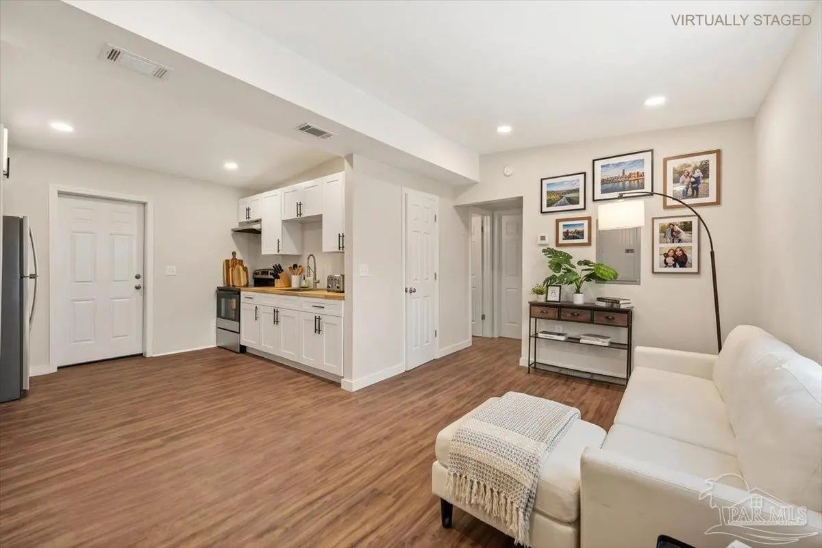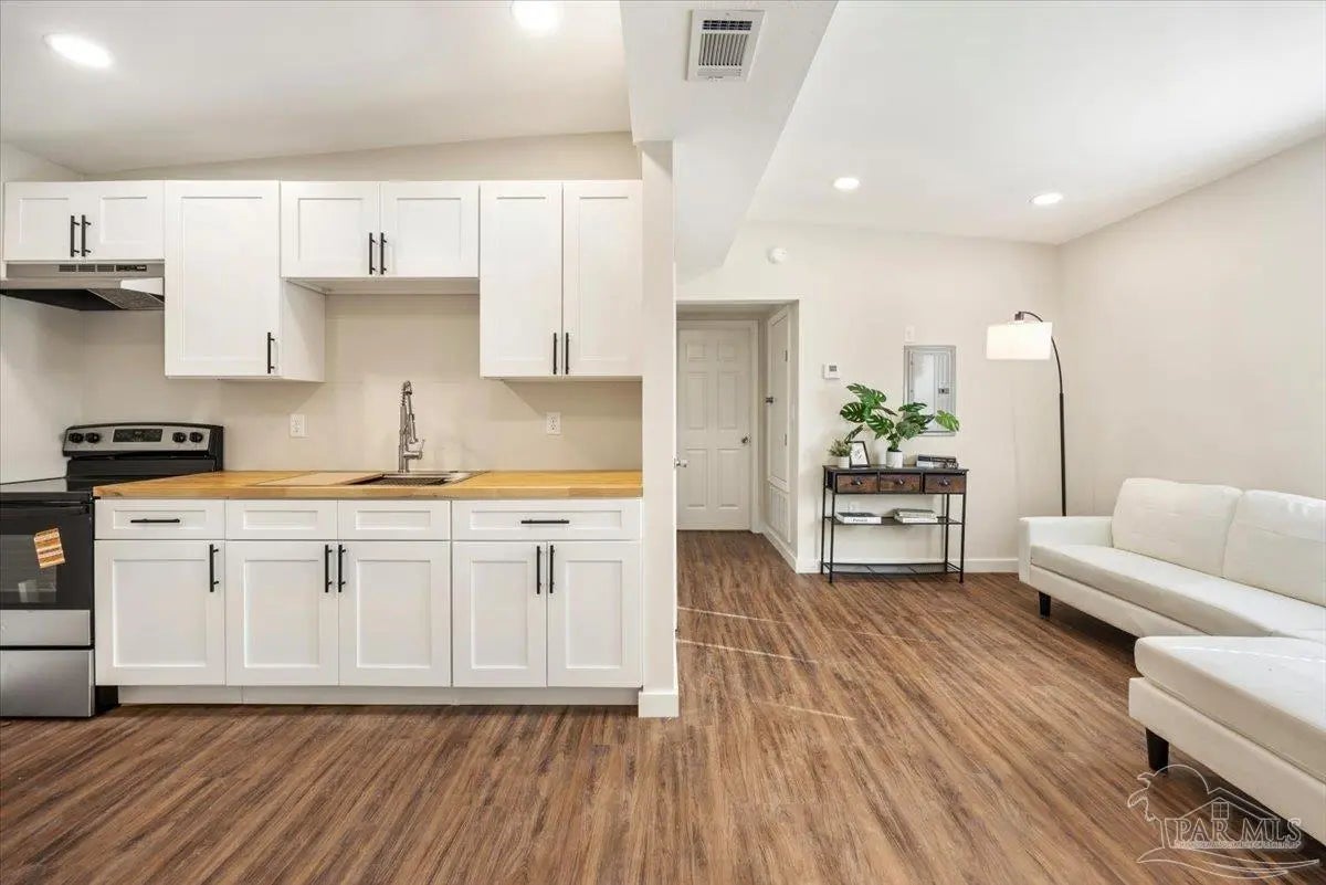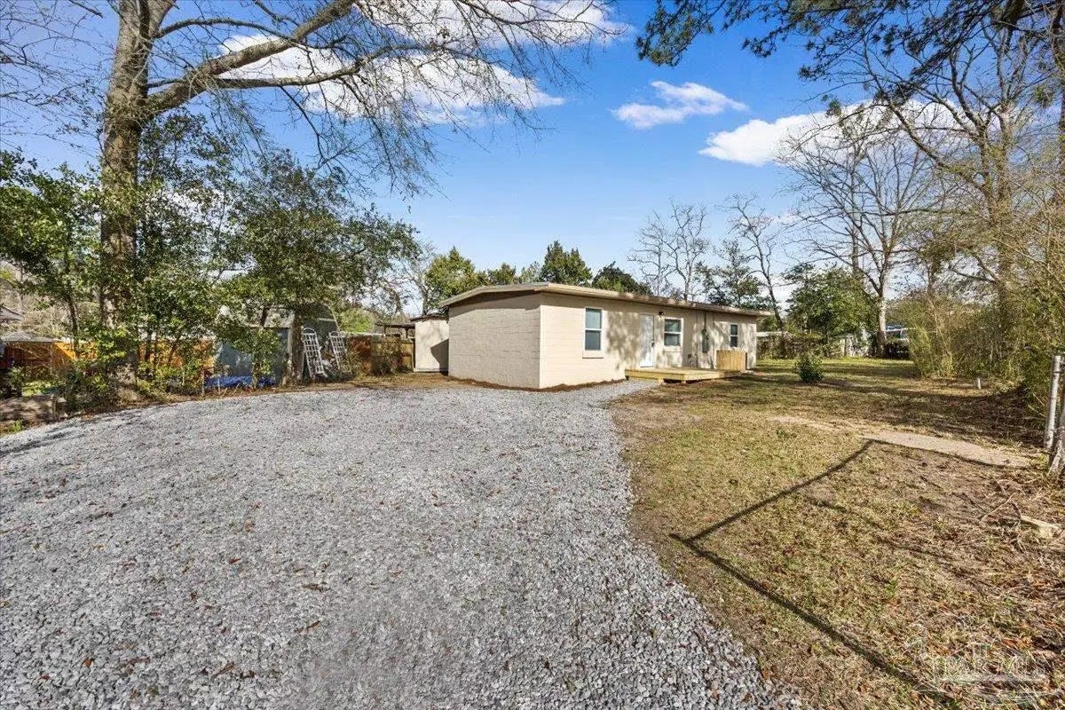Fully remodeled 3 bedroom 1 bath home on a large lot with major updates already completed. This home offers affordable ownership without the typical repair costs. The big ticket items are already done. Brand new HVAC. Brand new hot water heater. New electrical. New plumbing. New windows and doors with hurricane protection that can help lower insurance costs. Durable metal roof for long term peace of mind. Inside you will find modern finishes including butcher block counters and a tile shower. The home feels clean, updated, and move in ready. Large lot with privacy in the front and back yard. A park across the street and easy access to I-10 for those who need to commute to downtown or even Mobile. This home is perfect for your family! With no expenses spared, this is an easy decision--move in by the end of the month!
