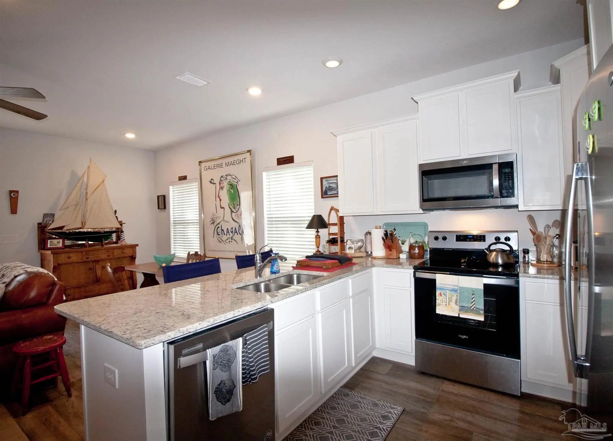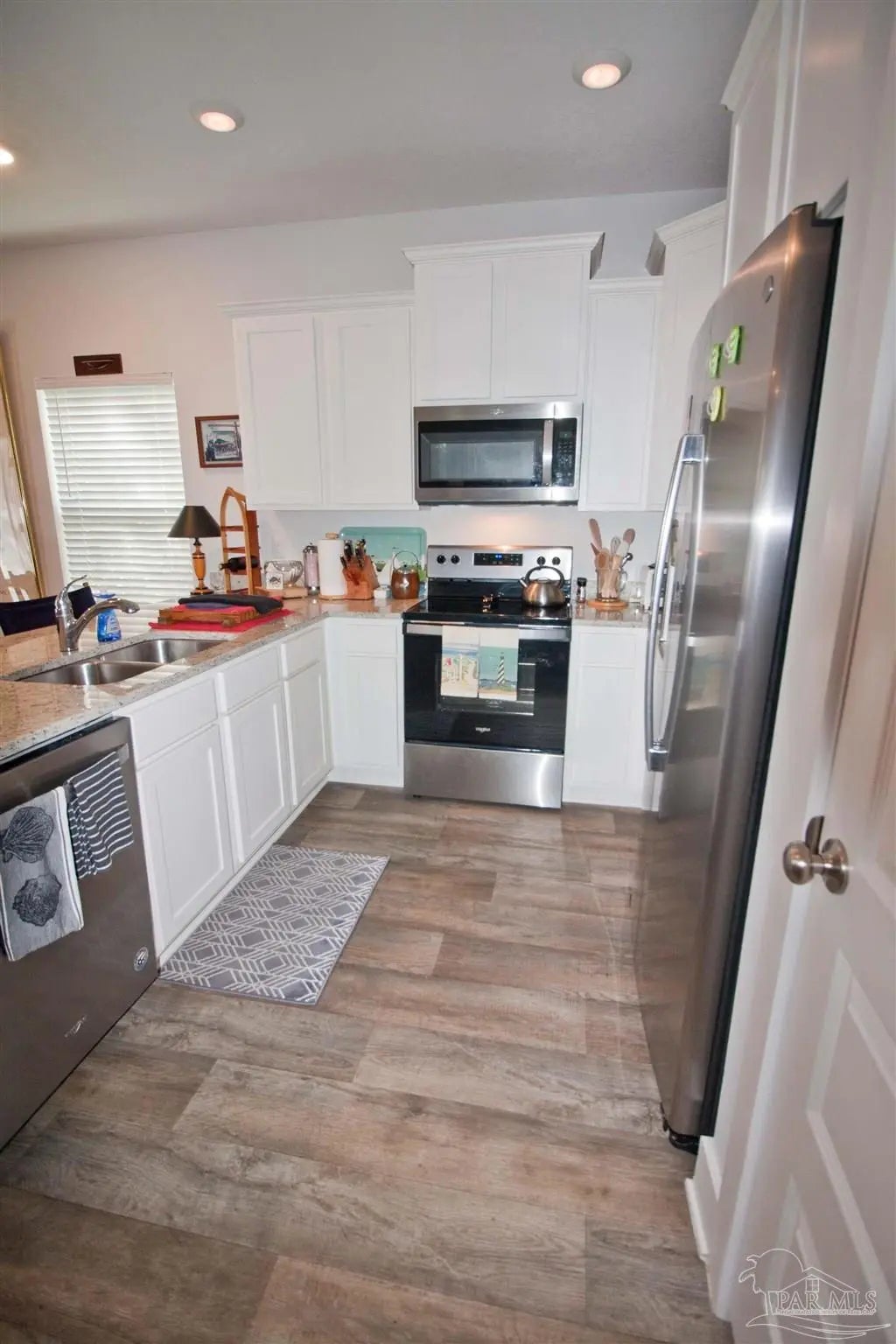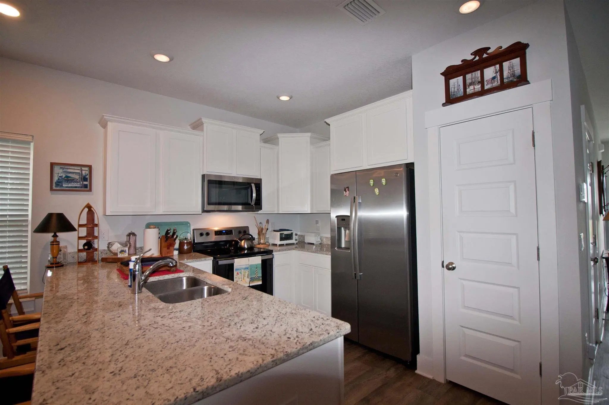 Living is effortless in this contemporary and elegant townhome tucked within the highly convenient 9 Mile Road corridor. Perfectly positioned at the cul de sac of the first street in Admiral’s Quarters, this corner residence offers enhanced privacy and a serene wooded backdrop to the west. Enjoy Florida's lifestyle without the burden of heavy exterior upkeep. Inside, the home shows like a magazine spread, lightly lived in as a second home and maintained in near new condition. The open, airy floor plan seamlessly connects the living and dining areas to a stylish kitchen featuring stainless appliances, granite countertops, a pantry, and generous cabinetry. Luxury vinyl plank flooring, plush carpeting, and soft ivory toned walls create a warm, sophisticated ambiance throughout. Upstairs, the spacious main suite accommodates a king sized bed with ease and includes an oversized walk in closet and an elegant bath with double granite vanities and shower. Two additional bedrooms—each with double closets—share a beautifully finished hall bath. A convenient upstairs laundry area, extra storage closets, a fenced backyard with sprinkler system, and a one car garage add everyday practicality. With hurricane protection, community pool access, and undeniable WOW factor, this townhome offers comfort, style, and an exceptional location all in one.