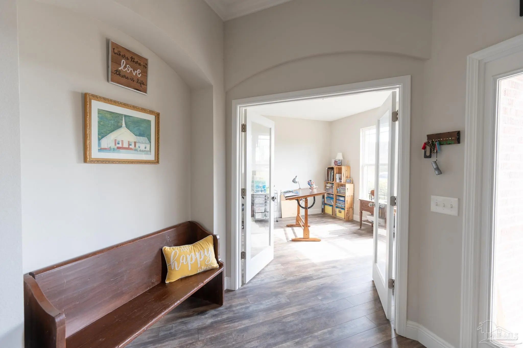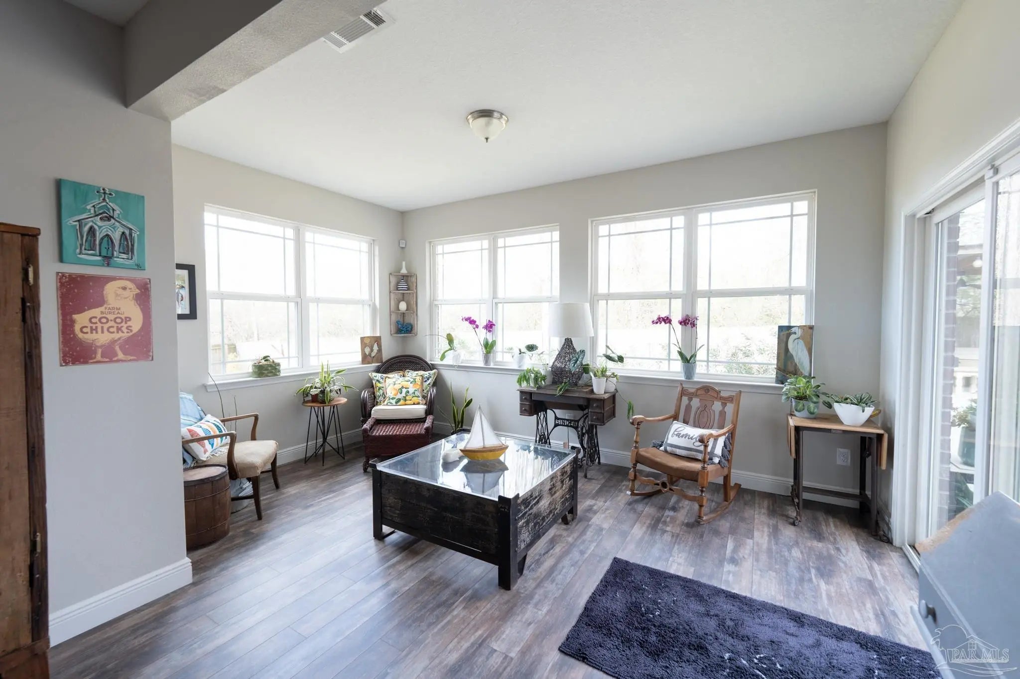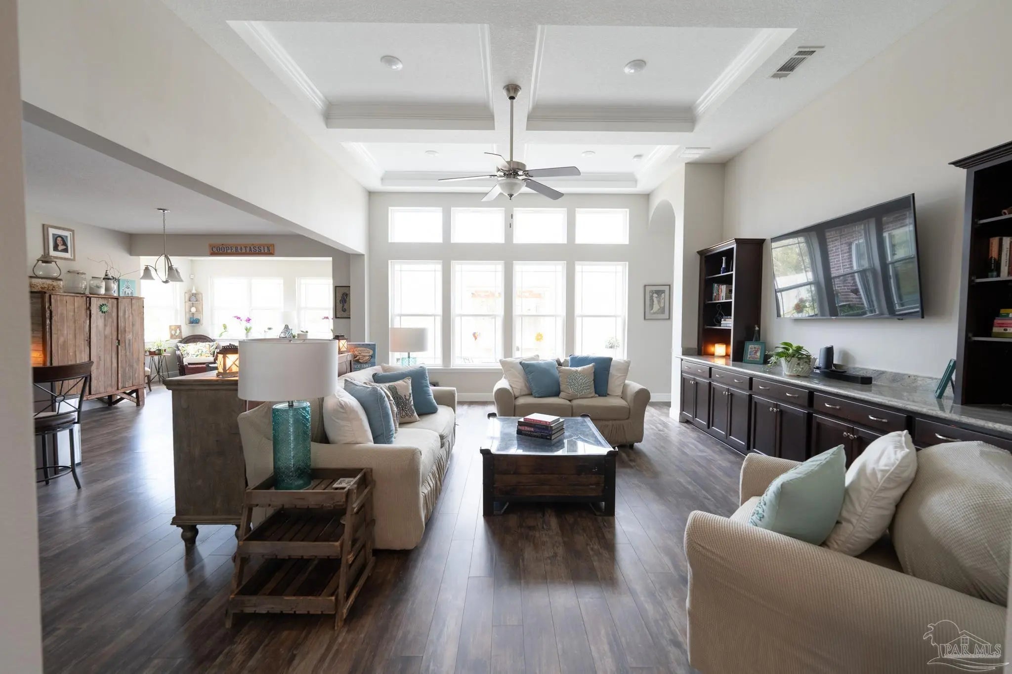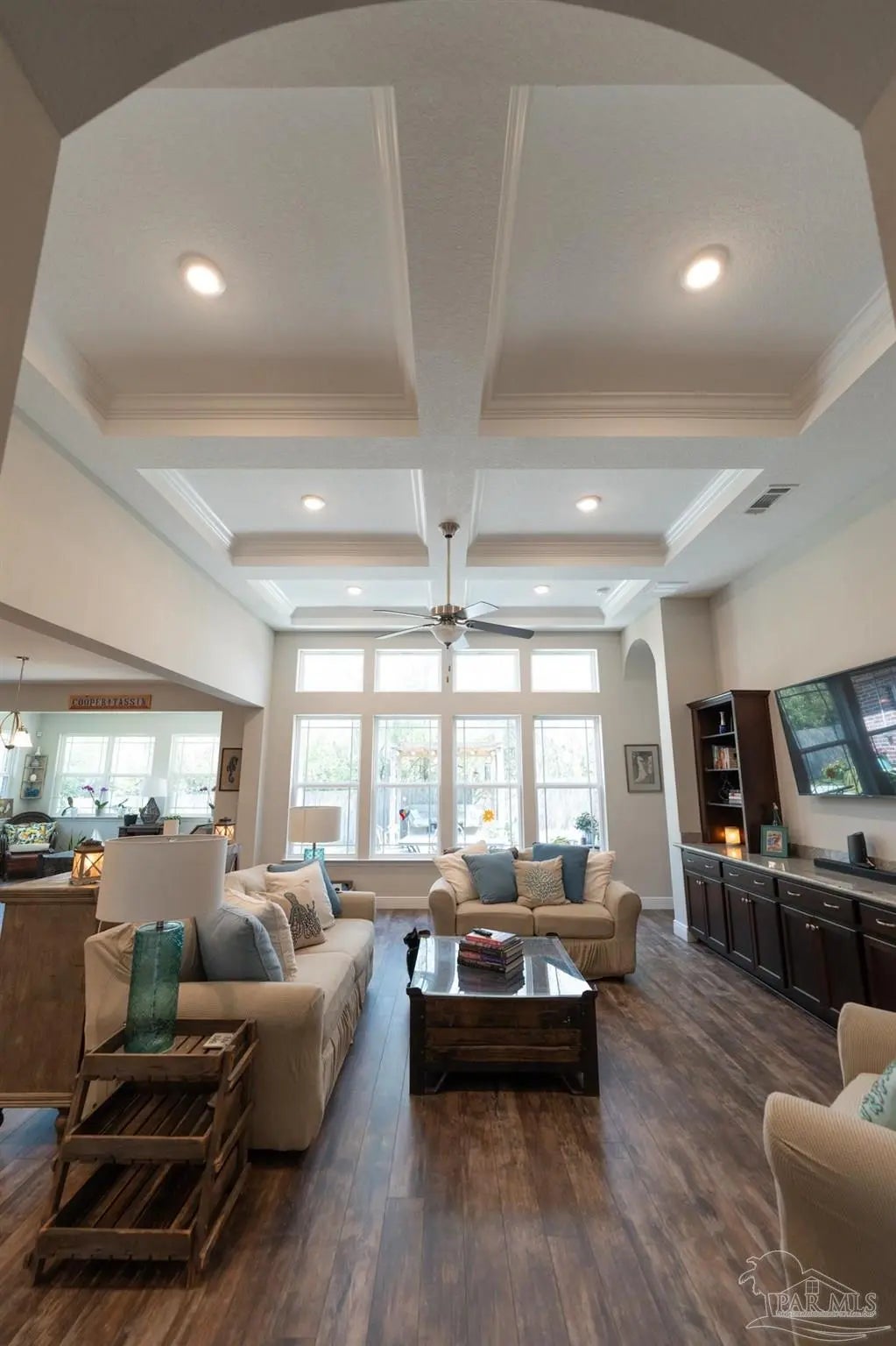 - Ceiling Fan(s), Crown Molding, High Ceilings, Sun Room