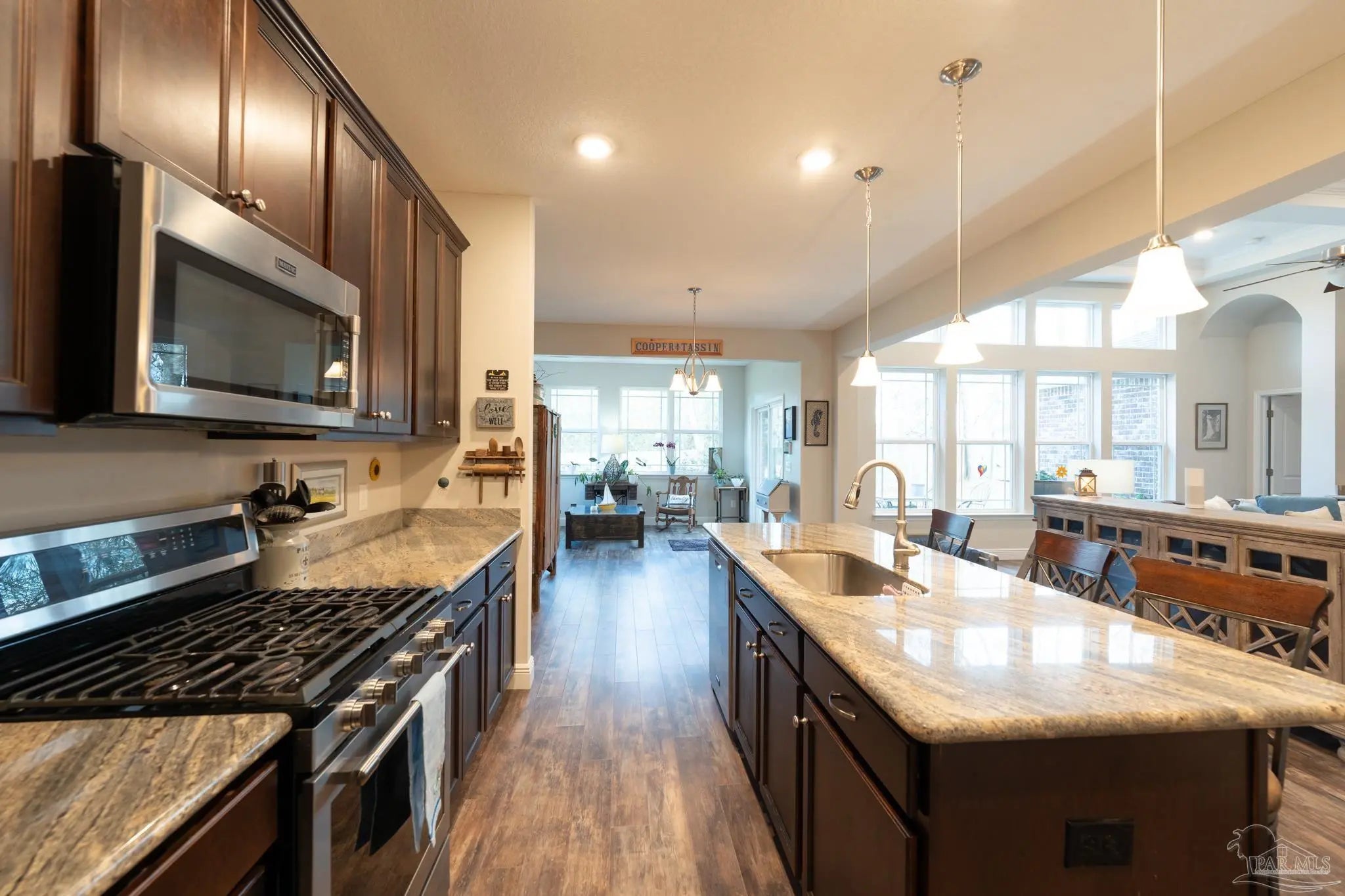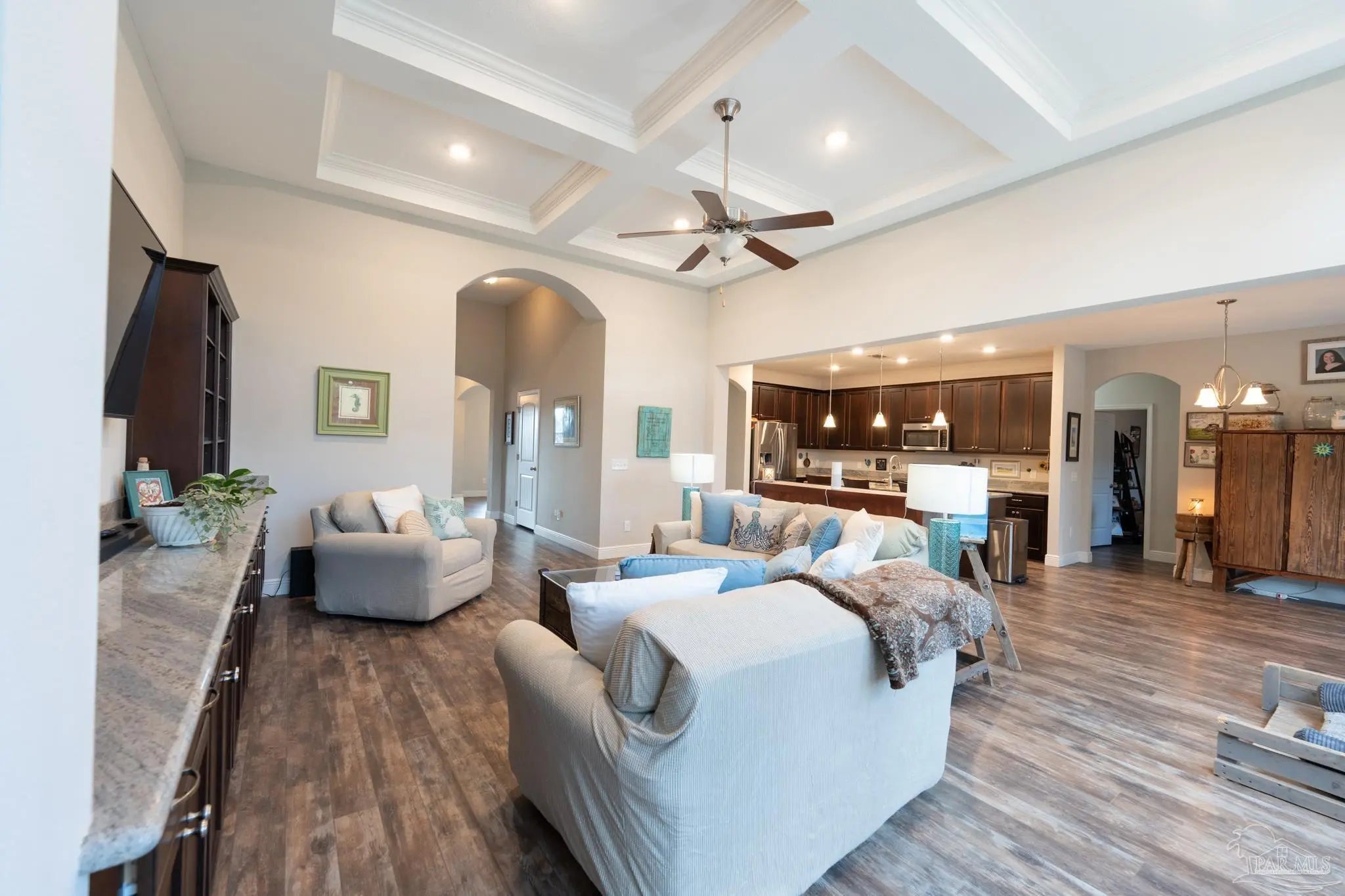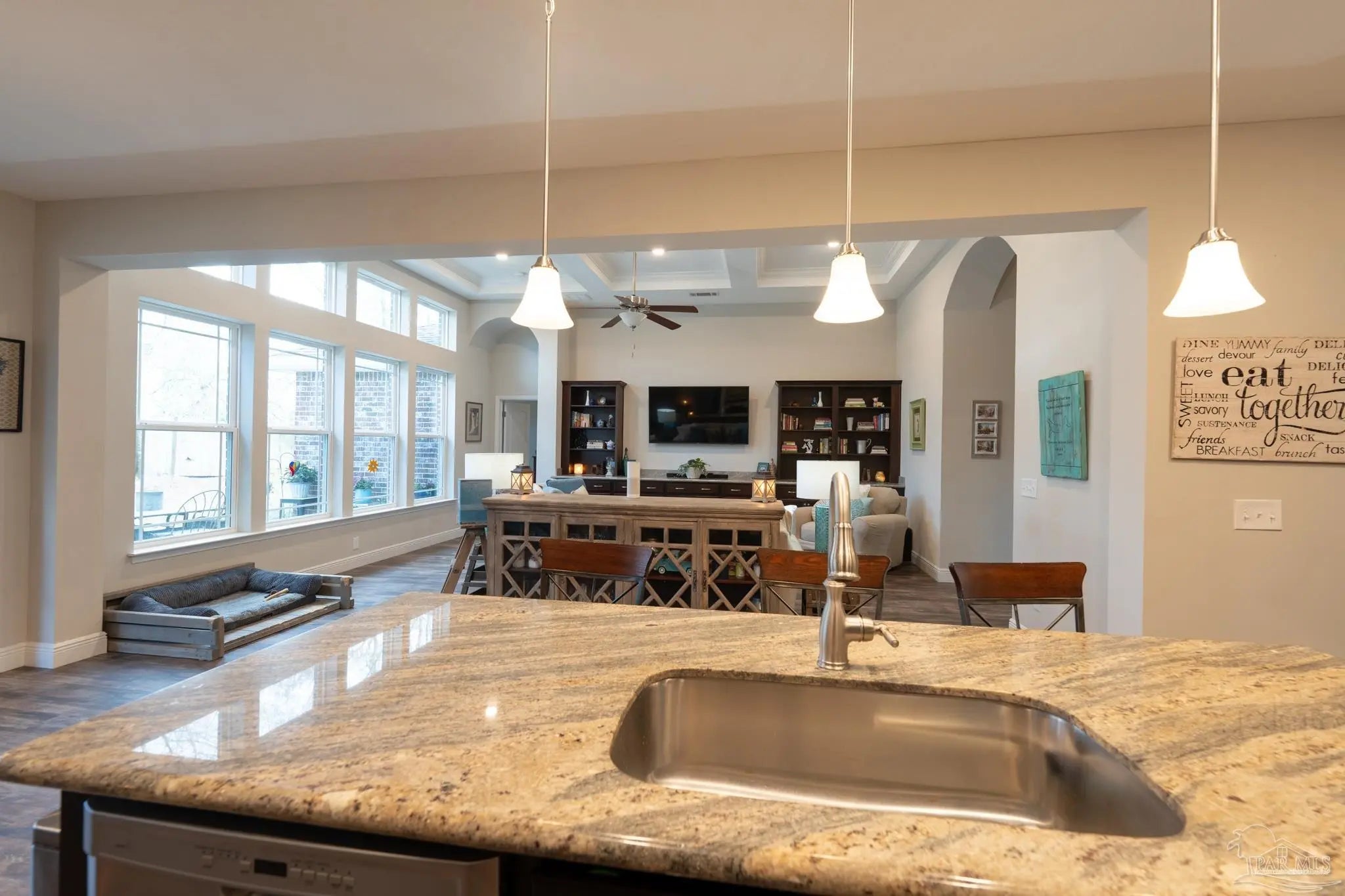Step into nearly 3,000 square feet of inviting living space in this beautifully maintained Craftsman-style home in Daniels Grove. Built in 2017, this 5 bedroom, 3 bathroom home offers an open layout that feels both spacious and connected from the moment you walk in. High ceilings and architectural details immediately stand out, including a coffered ceiling in the living room and tray ceilings in both the dining room and primary bedroom. The main living area flows effortlessly into the kitchen and dining spaces, creating a natural setting for gatherings, quiet evenings, or entertaining. The kitchen serves as a central hub, featuring a large island, breakfast bar, pantry, designated space for a butler’s pantry, and stainless appliances including a built-in microwave, electric range, dishwasher, and refrigerator. Pull-out shelves in all lower cabinets add everyday convenience and easy organization. The primary bedroom offers a comfortable retreat with a large walk-in closet and ample space to unwind. Additional bedrooms provide flexibility for guests, work-from-home needs, or hobbies. A bright sunroom creates a peaceful spot to relax while overlooking the backyard. Situated on approximately 0.30 acres at the end of a cul-de-sac, the property offers both privacy and room to enjoy the outdoors. Additional features include a two-car garage, sprinkler system, and energy-efficient elements such as double-pane windows, insulated ceilings and doors, and a heat pump system. Conveniently located in west Pensacola near Beulah and just minutes from I-10, this home provides easy access to shopping, dining, and everyday conveniences.
