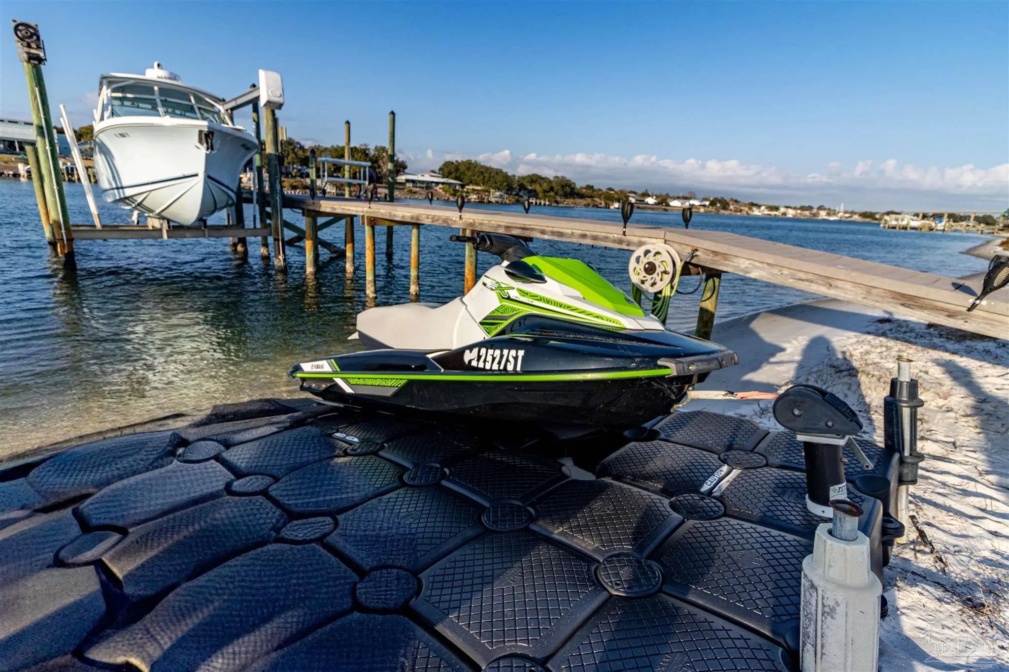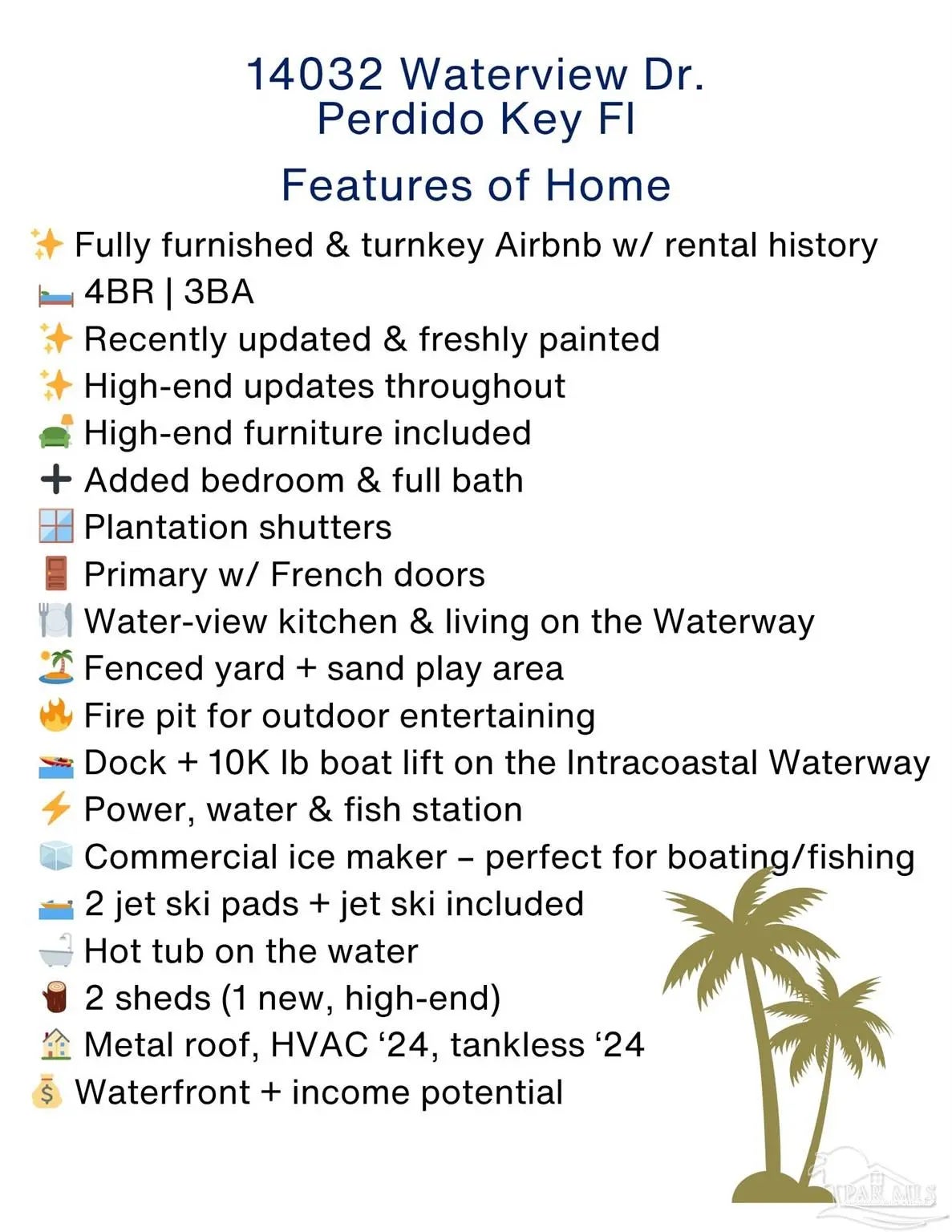 Enjoy incredible waterfront living on the Intracoastal Waterway in this beautifully updated 4-bedroom, 3-bath home offering stunning water views and exceptional indoor and outdoor living. This property is fully furnished and turnkey, ready for Airbnb or short-term rentals with established rental history, making it an excellent investment, vacation home, or full-time residence. The open living and kitchen areas showcase gorgeous water views, creating a bright and inviting space perfect for relaxing or entertaining. Large sliding doors fill the home with natural light and lead to the outdoor living areas. The home also features plantation shutters throughout. The primary suite includes French doors and a spacious bath with double vanity, soaking tub, and dual shower heads. The home has been thoughtfully updated with high-end finishes, including luxury vinyl plank flooring throughout and quartz countertops in the kitchen and bathrooms. Three additional bedrooms and two additional bathrooms provide plenty of space for guests and family. Outdoor amenities include direct Intracoastal access with a private dock, 10,000-lb boat lift, power, water, fish cleaning station, and two jet ski pads. A 2019 Yamaha 3-seater jet ski and private hot tub are included. The large fenced backyard features a sand play area and two sheds, including a brand-new high-end shed on a concrete pad. Additional updates include metal roof (2014), HVAC system updated in 2024, tankless water heater (2024), irrigation, and Ring security cameras.
