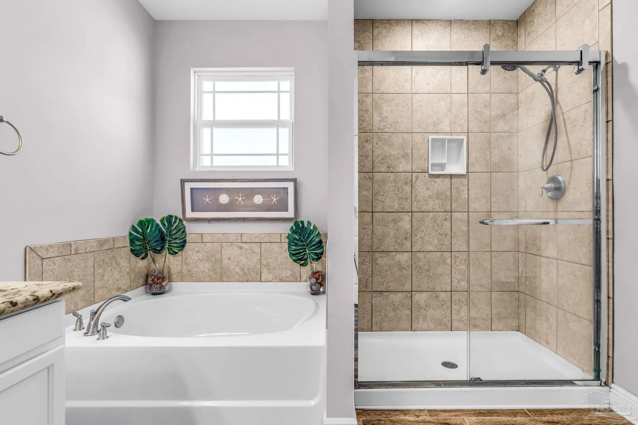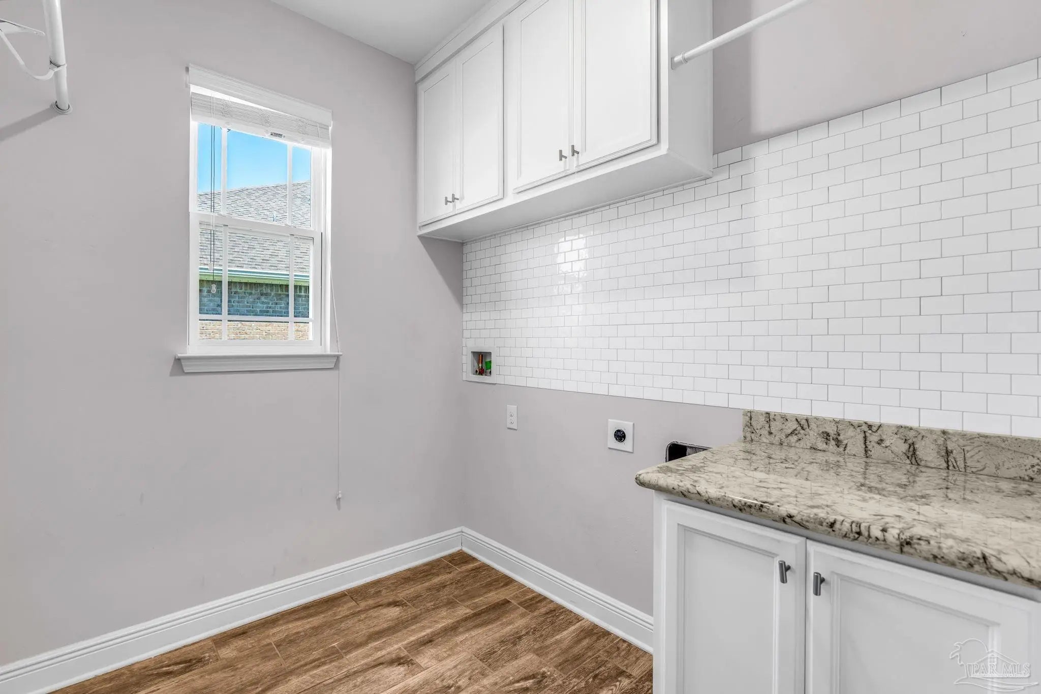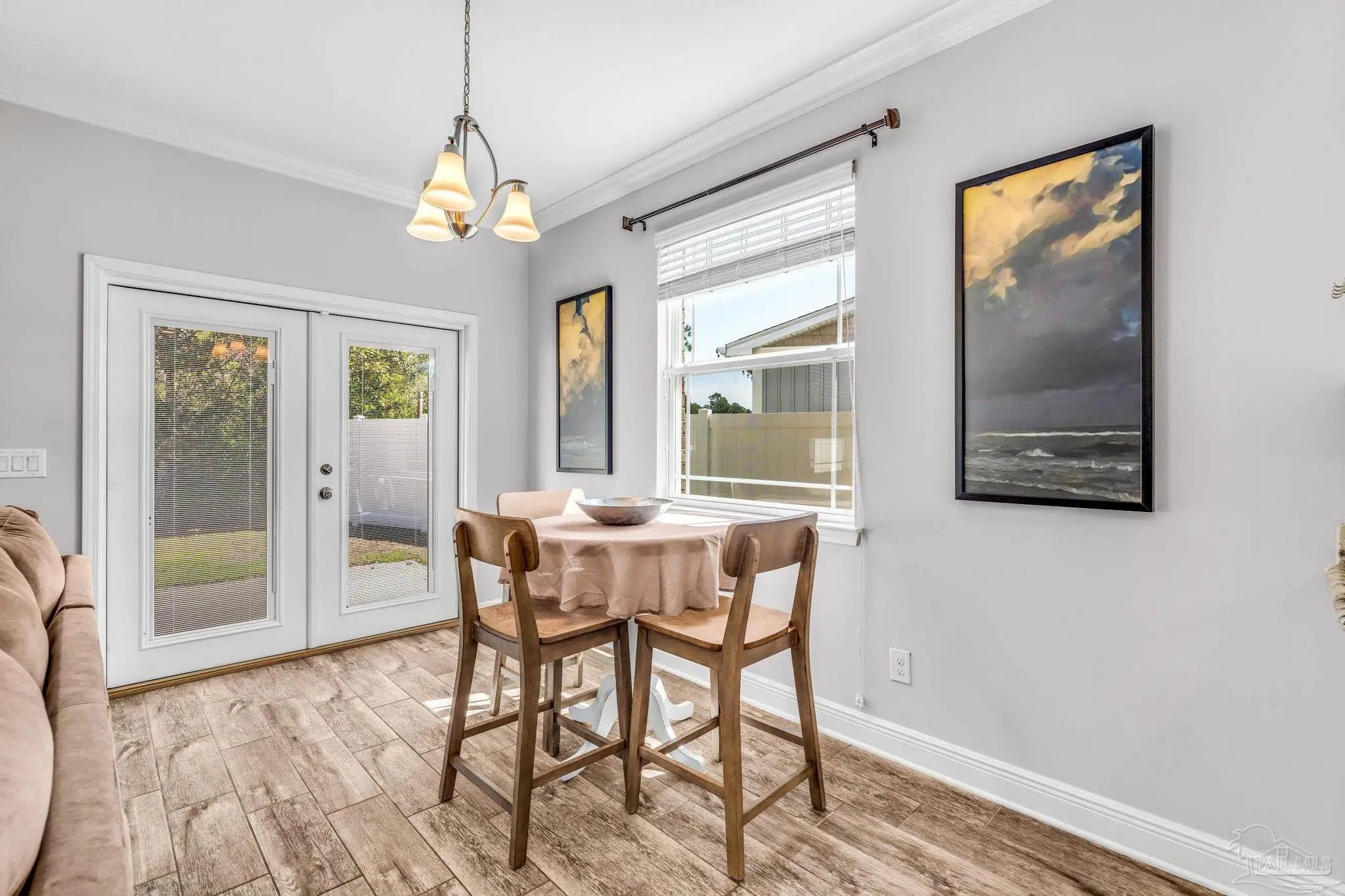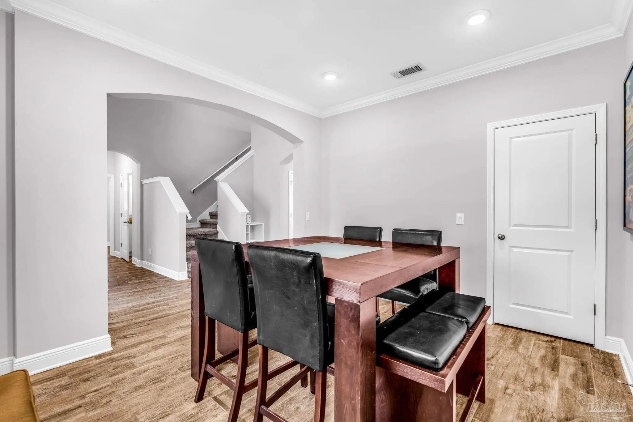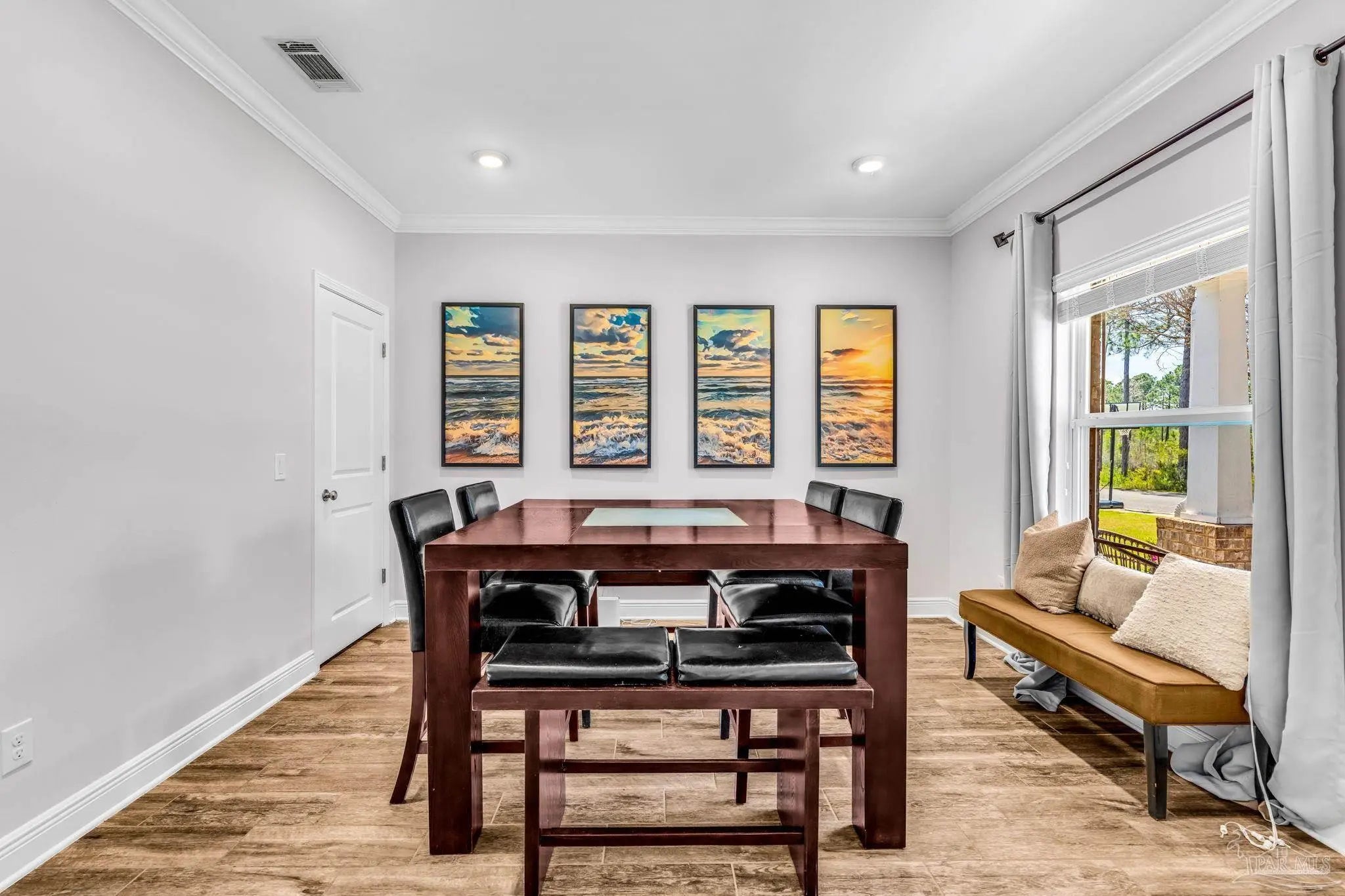 Located in the gated community of Windward Cove, this five-bedroom, 3.5-bath two-story home offers over 2,800 square feet of living space within close proximity to NAS Pensacola, Gulf Coast beaches, schools, and local dining and shopping. The main level includes a primary suite and an ensuite bathroom featuring a custom walk-in closet, garden tub, standing shower, and double vanity. Also on the main floor: a formal dining room with alternate use as a home office, powder room, dedicated laundry room, and an open-concept kitchen and living area with granite countertops, an eat-in bar, stainless steel electric appliances, and a breakfast nook. The upper level features hardwood floors throughout a second living area with a reading nook, four carpeted bedrooms, and two full bathrooms, each with a shower and tub combination. The property includes a two-car garage with driveway parking for up to three additional vehicles. The lot backs to undeveloped land, providing added privacy. Community amenities include a pool and private beach access, with HOA fees covering pool and common area maintenance. Short-term rentals are not permitted per HOA guidelines. Showings are by appointment only, but easy to accommodate. Seller is a licensed real estate agent.