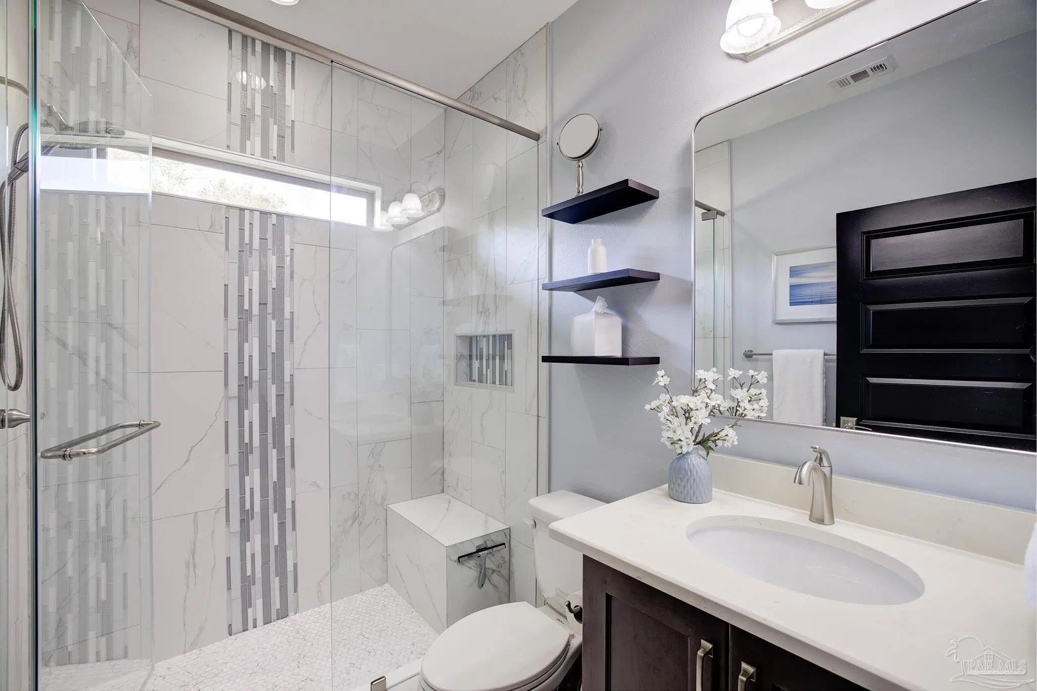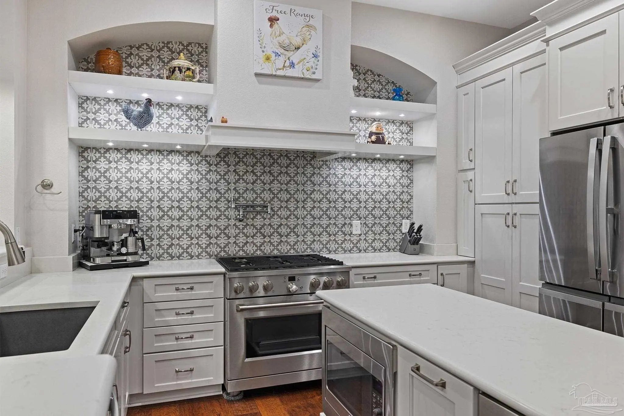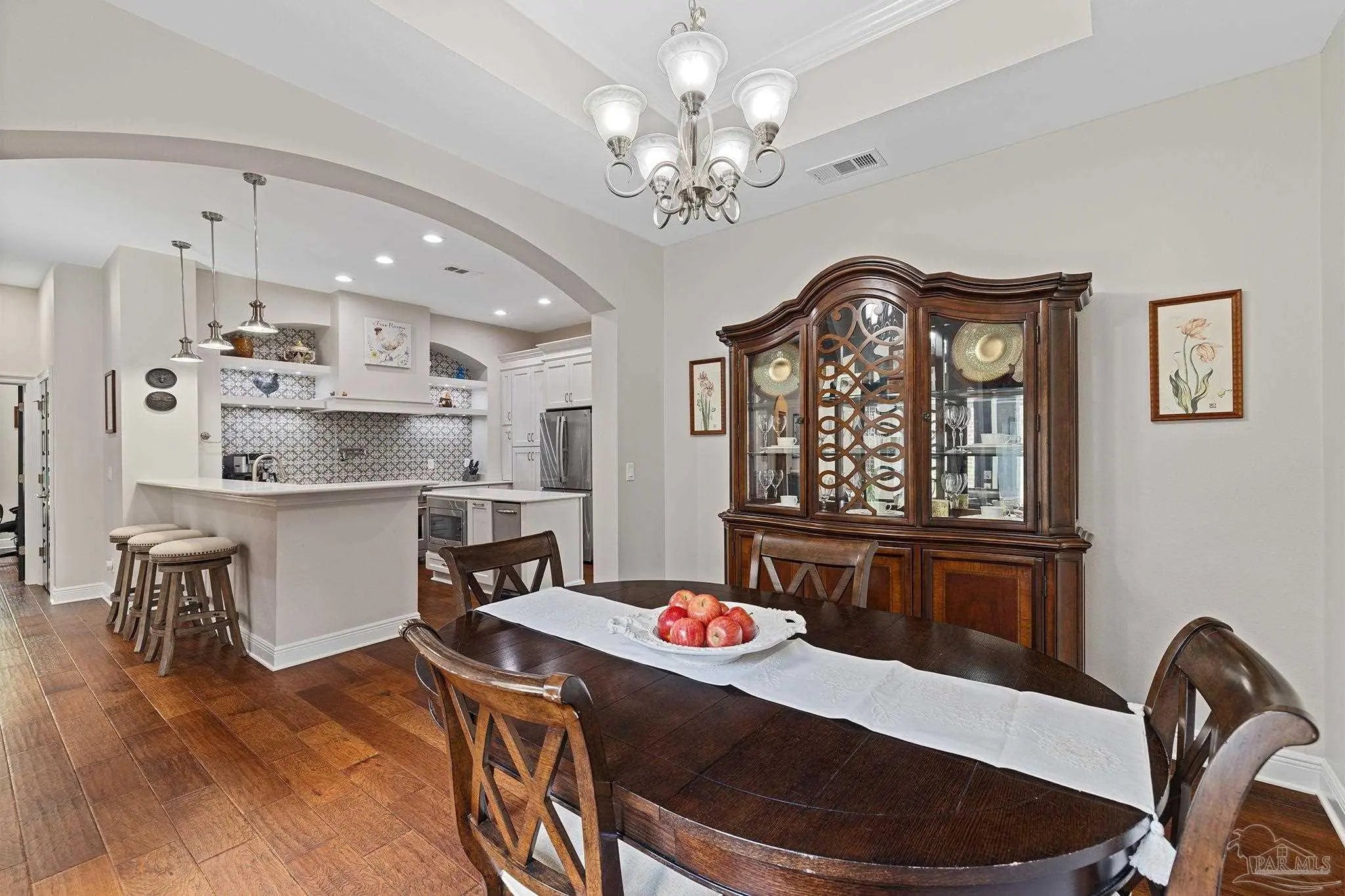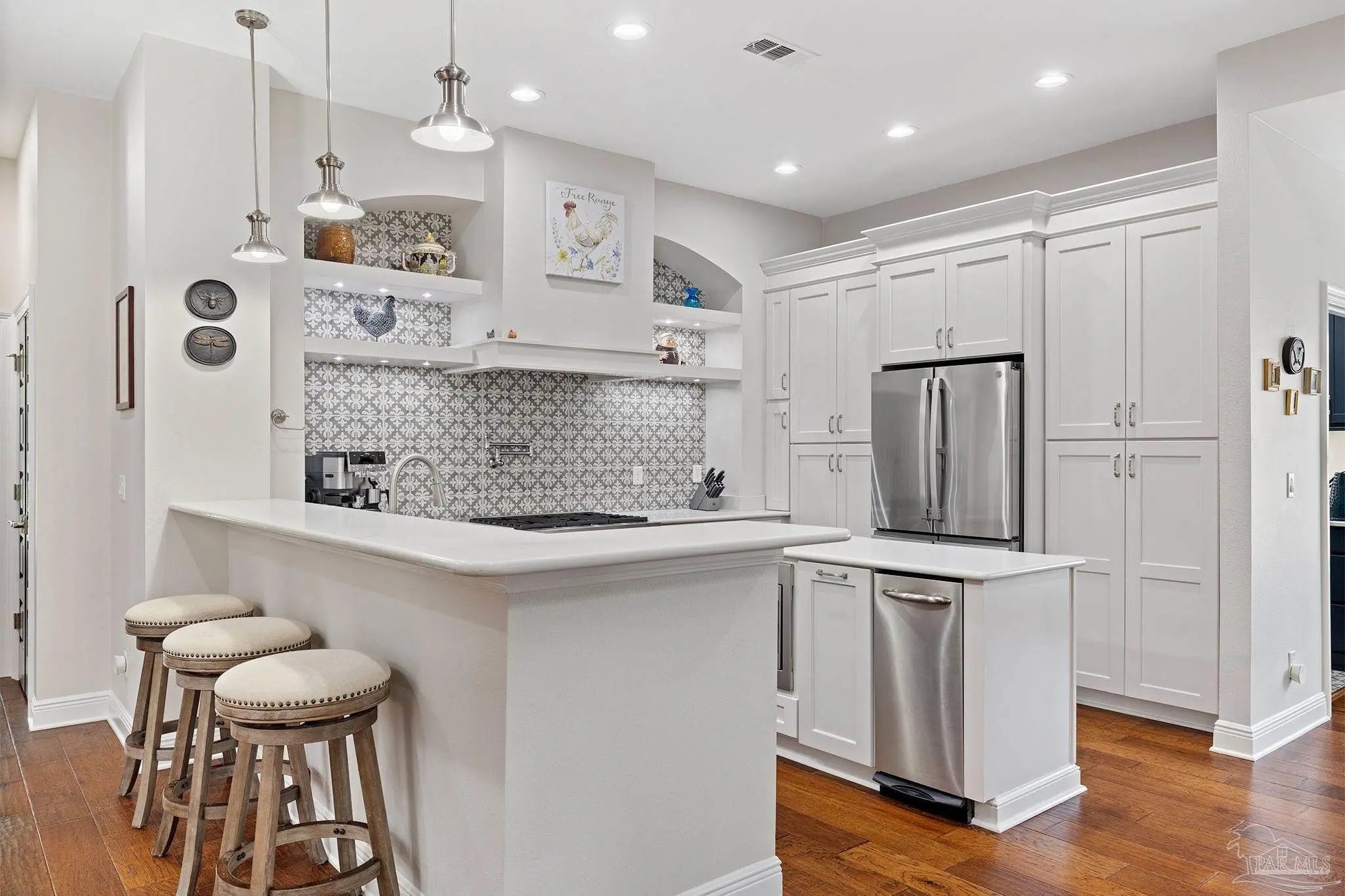 Stop the scroll! Rare opportunity to own a semi-custom masterpiece on a prime corner lot in Pensacola's premier gated community, Nature Trail. This 5-bedroom, 3-bathroom sanctuary blends high-end architectural detail with the peace of mind of a whole-house generator installed 2023 and HV/AC 2023. The Architectural Excellence of the Hardwood floors, soaring trayed ceilings, and elegant plantation shutters throughout give an interior WOW factor. The Designer Great Room features floor-to-ceiling large picture windows that frame a "park-like" view, anchored by a stunning brick accent wall and fireplace. The Chef’s Dream Kitchen is an open-concept layout featuring a massive entertaining island, NEW 2025 designer stainless appliances, formal dining, and a sunny breakfast nook. The Master Bedroom is a spacious retreat with trayed ceiling, double doors that lead out to the courtyard, while the master en-suite has heated floors and has been updated adding quartz counter tops, tile shower and custom linen cabinet. An updated Laundry Room with custom cabinetry and quartz countertops is a beautiful addition. Looking for Flex Space? A dedicated media/bonus room perfect for a home theater, gym, or executive office is sure to please. The outdoor courtyard lets you escape to a private, courtyard-style patio featuring an outdoor double-sided fireplace—the ultimate setting for coastal evenings. Situated on a manicured corner lot with a 3-car garage and a sprawling, scenic backyard gives you plenty of space and privacy. Nature Trail Lifestyle: Enjoy exclusive access to the 6,000 sq. ft. Lodge, resort-style pools, fitness center, tennis courts, and 400+ acres of hiking trails and seasonal family events. Move-in ready luxury with unmatched curb appeal. Schedule your private tour of 5917 Dahoon Dr. today!