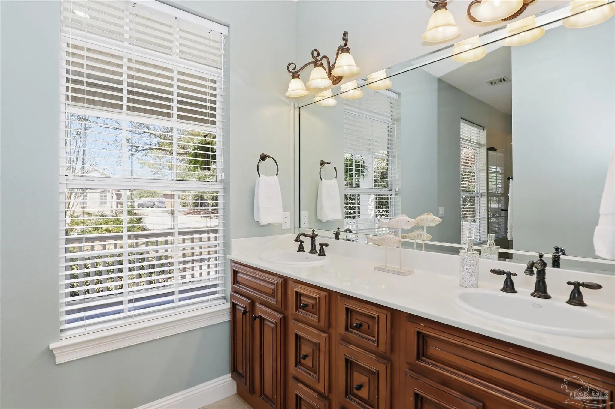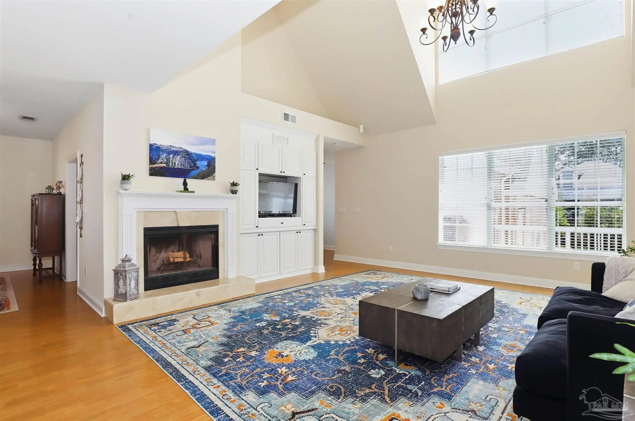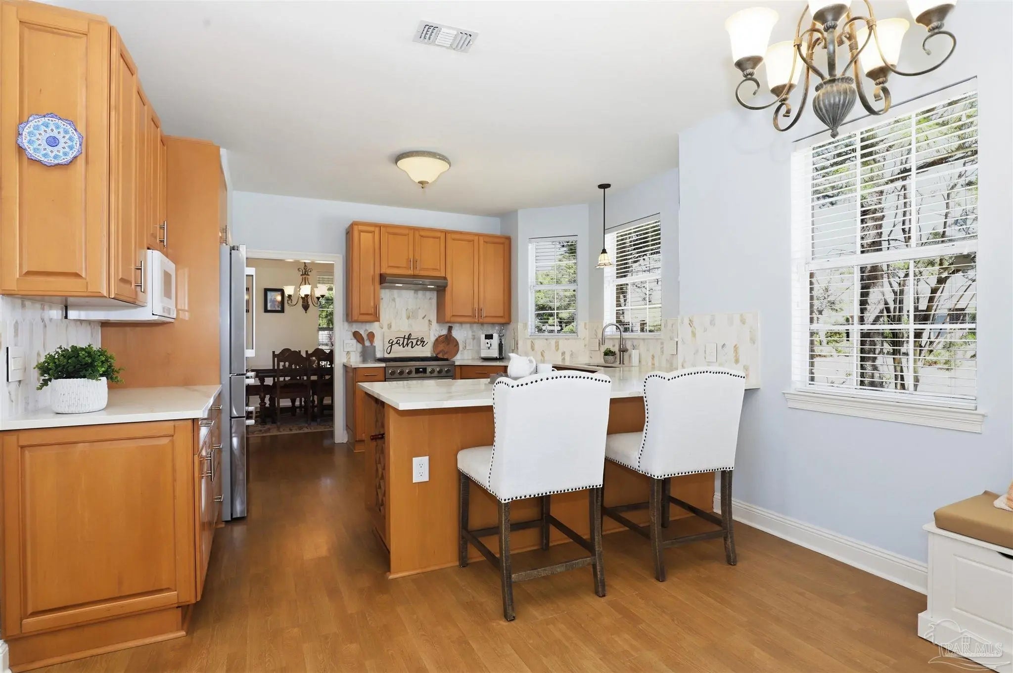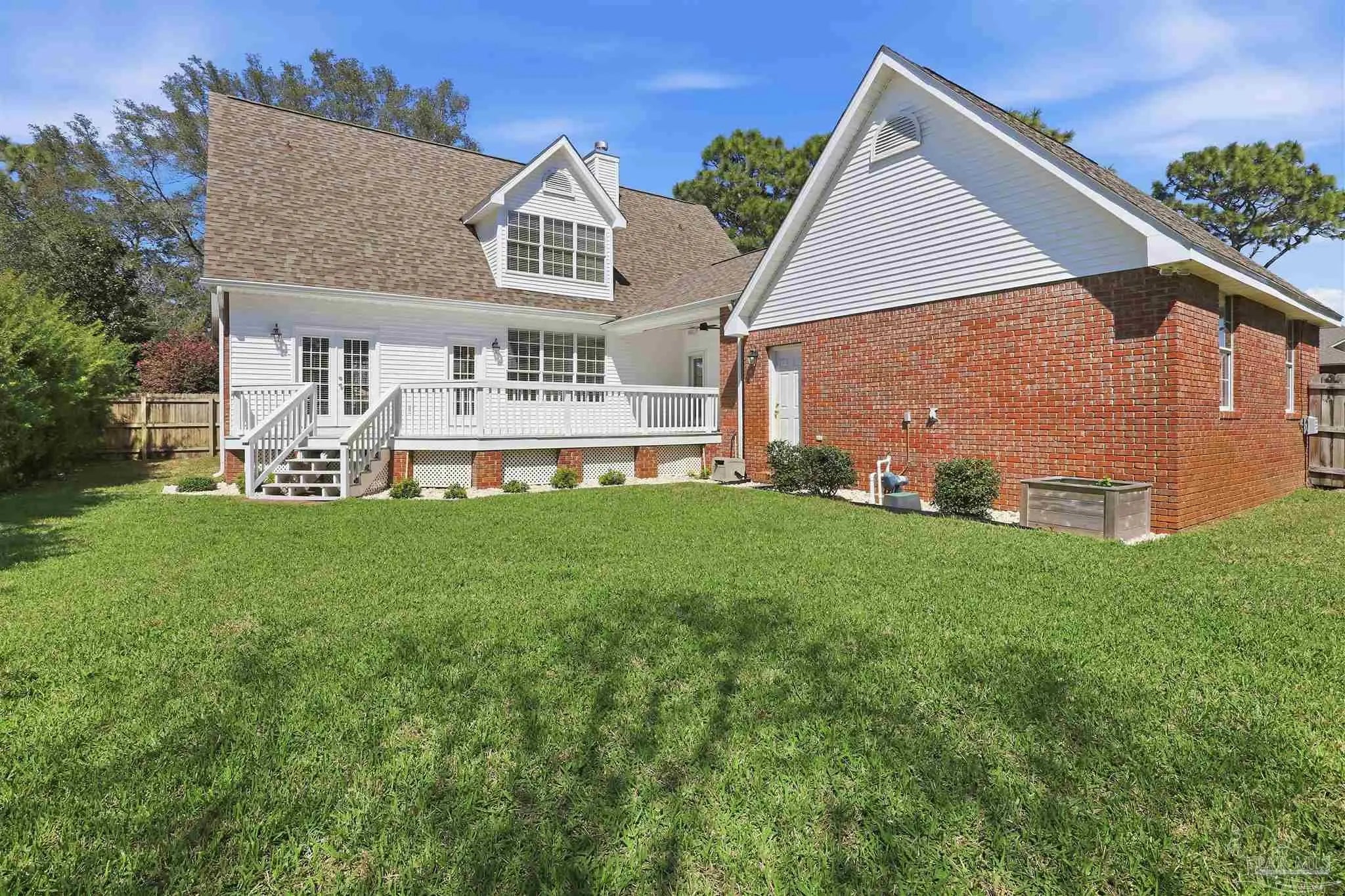 Updated Gulf Breeze Home. 3BR/3.5BA w/ gourmet kitchen, quartz countertops, pantry & gas cooktop. High ceilings, 0.32 acre lot & 2-car garage. Step into the welcoming foyer where you’ll find a convenient half bath and coat closet, ideal for guests. The dining room overlooks the covered front porch, while the living room features soaring two-story ceilings, built-in cabinetry, and a wood-burning fireplace, all overlooking the large open back deck. The beautifully updated kitchen offers a Bosch five-burner gas cooktop, farmhouse sink, stainless steel appliances including a Bosch refrigerator, built-in microwave, pantry, and a charming breakfast nook with bench seating. A hallway nearby leads to the oversized laundry room with utility sink and additional storage, as well as access to the two-car garage. The first-floor primary suite features two oversized closets and a well-appointed bath with double vanity, water closet, and custom walk-in shower. Upstairs, you’ll find two bedrooms each with ensuite bath along with a dedicated home office space. The fenced backyard includes a covered porch and open deck, perfect for relaxing. This home is located just blocks from the 55-acre Soundside Preserve with access to the Sound, offering a wonderful coastal lifestyle.