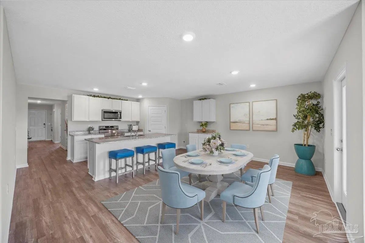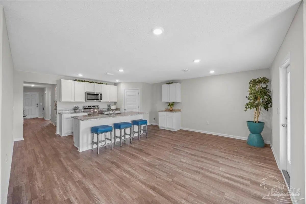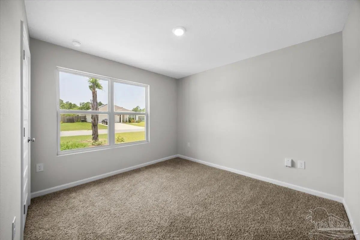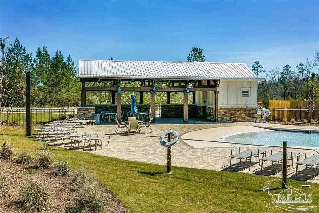 Water view, premium lot, and ask about the 4.75% assumable loan opportunity! 4-bedroom, 2-bath home offering an open-concept layout with spacious living and dining areas filled with natural light. Kitchen features granite countertops, stainless steel appliances, large island with bar seating, and corner pantry. Split bedroom layout provides added privacy. Primary suite includes double vanities, and large walk-in closet, Three additional bedrooms and a full bath offer flexibility for guests, family, or office space. Covered back patio overlooks the water, providing a peaceful outdoor setting. Additional features include luxury vinyl plank flooring in main areas, carpet in bedrooms for added comfort, Smart Home technology, and solar panels to support energy efficiency. Community amenities include pool, cabana bathhouse, grilling area, and underground utilities. Convenient location near I-10, Navy Federal, shopping, and dining. Home is vacant and ready for a quick move in! SCHEDULE YOUR SHOWING TODAY BEFORE THIS ONE SLIPS AWAY!