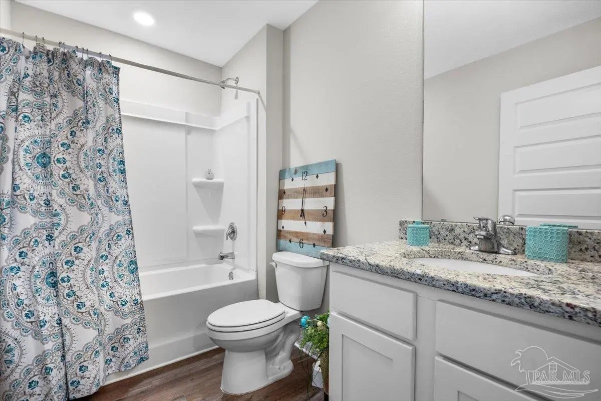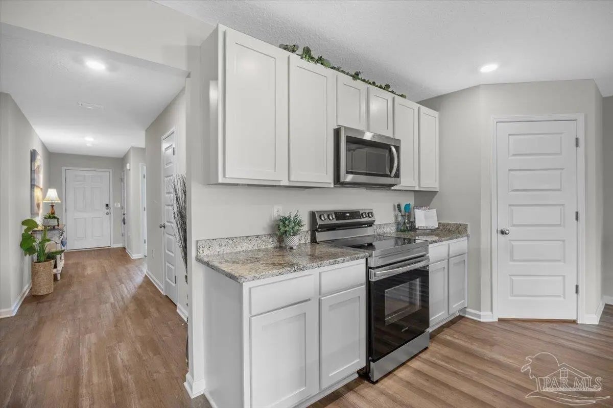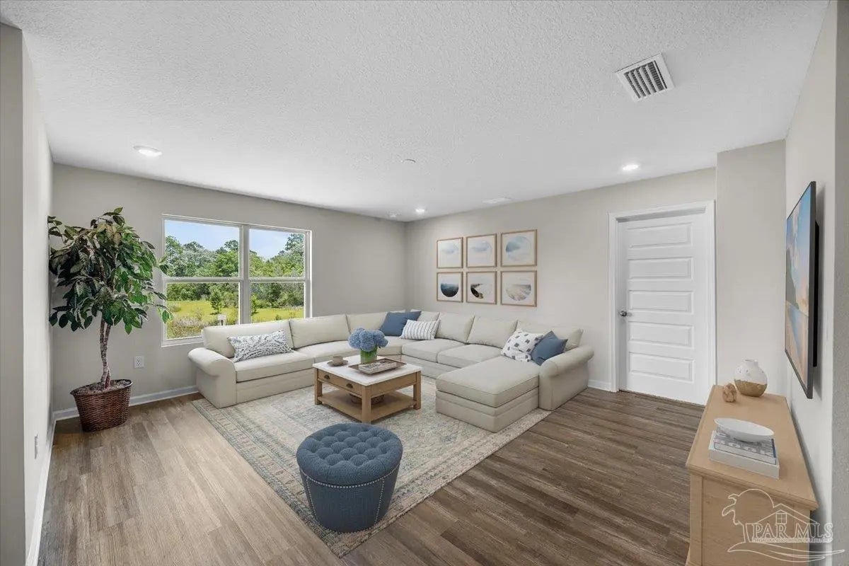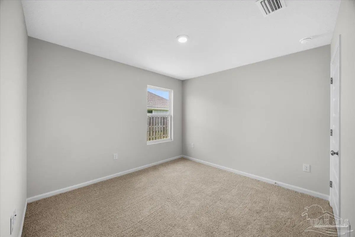 Water view, premium lot, and ask about the 4.75% assumable loan opportunity! 4-bedroom, 2-bath home offering an open-concept layout with spacious living and dining areas filled with natural light. Kitchen features granite countertops, stainless steel appliances, large island with bar seating, and corner pantry. Split bedroom layout provides added privacy. Primary suite includes double vanities, and large walk-in closet, Three additional bedrooms and a full bath offer flexibility for guests, family, or office space. Covered back patio overlooks the water, providing a peaceful outdoor setting. Additional features include luxury vinyl plank flooring in main areas, carpet in bedrooms for added comfort, Smart Home technology, and solar panels to support energy efficiency. Community amenities include pool, cabana bathhouse, grilling area, and underground utilities. Convenient location near I-10, Navy Federal, shopping, and dining. Home is vacant and ready for a quick move in! SCHEDULE YOUR SHOWING TODAY BEFORE THIS ONE SLIPS AWAY!