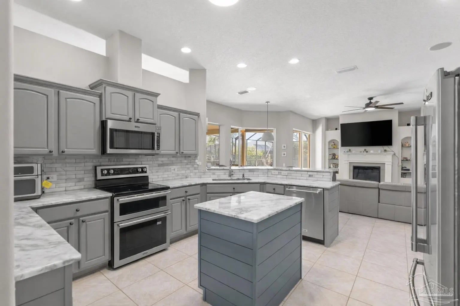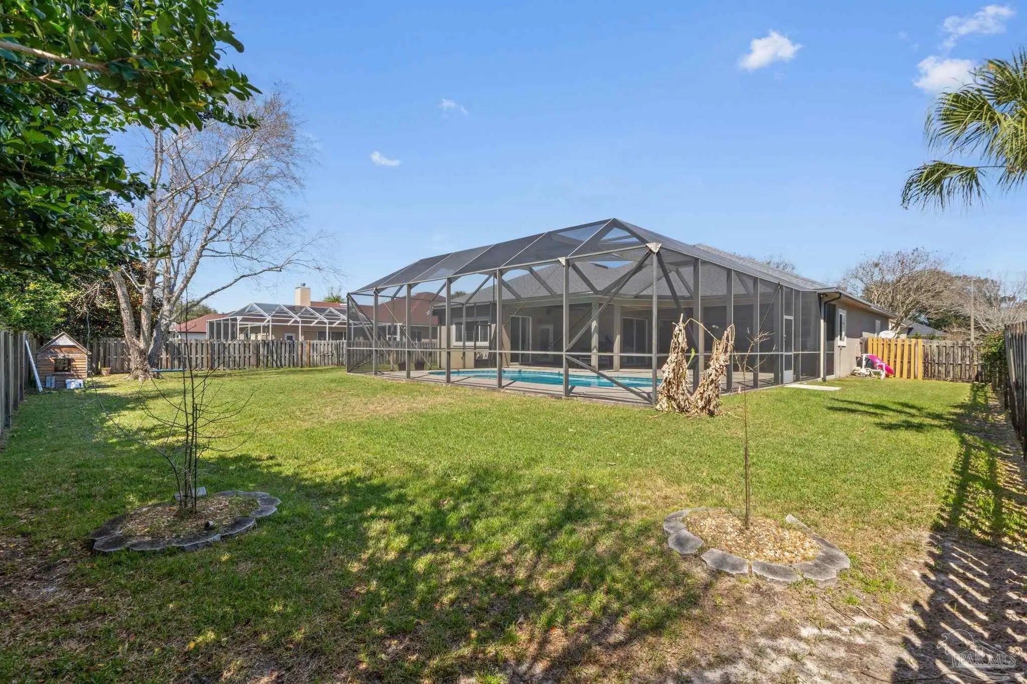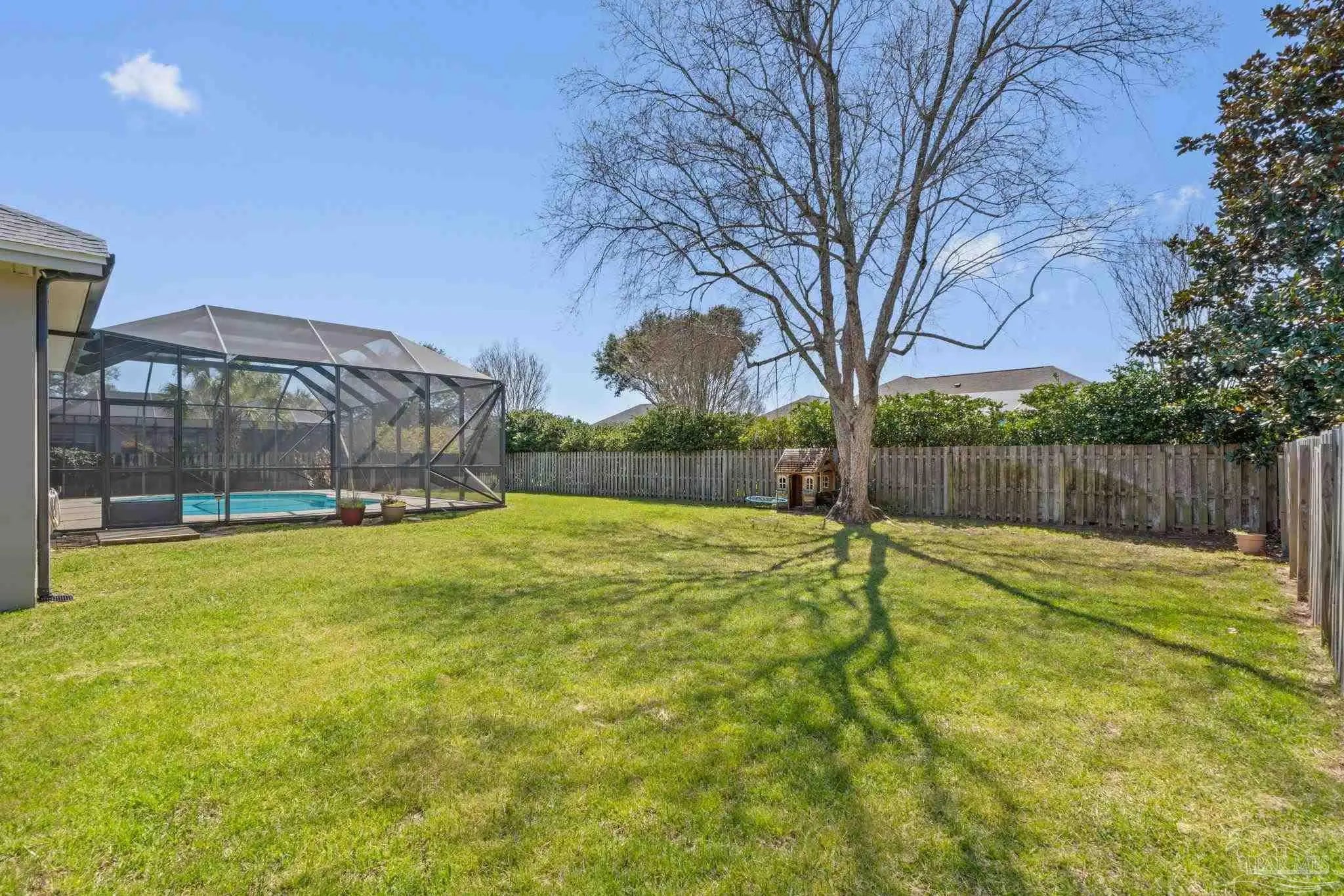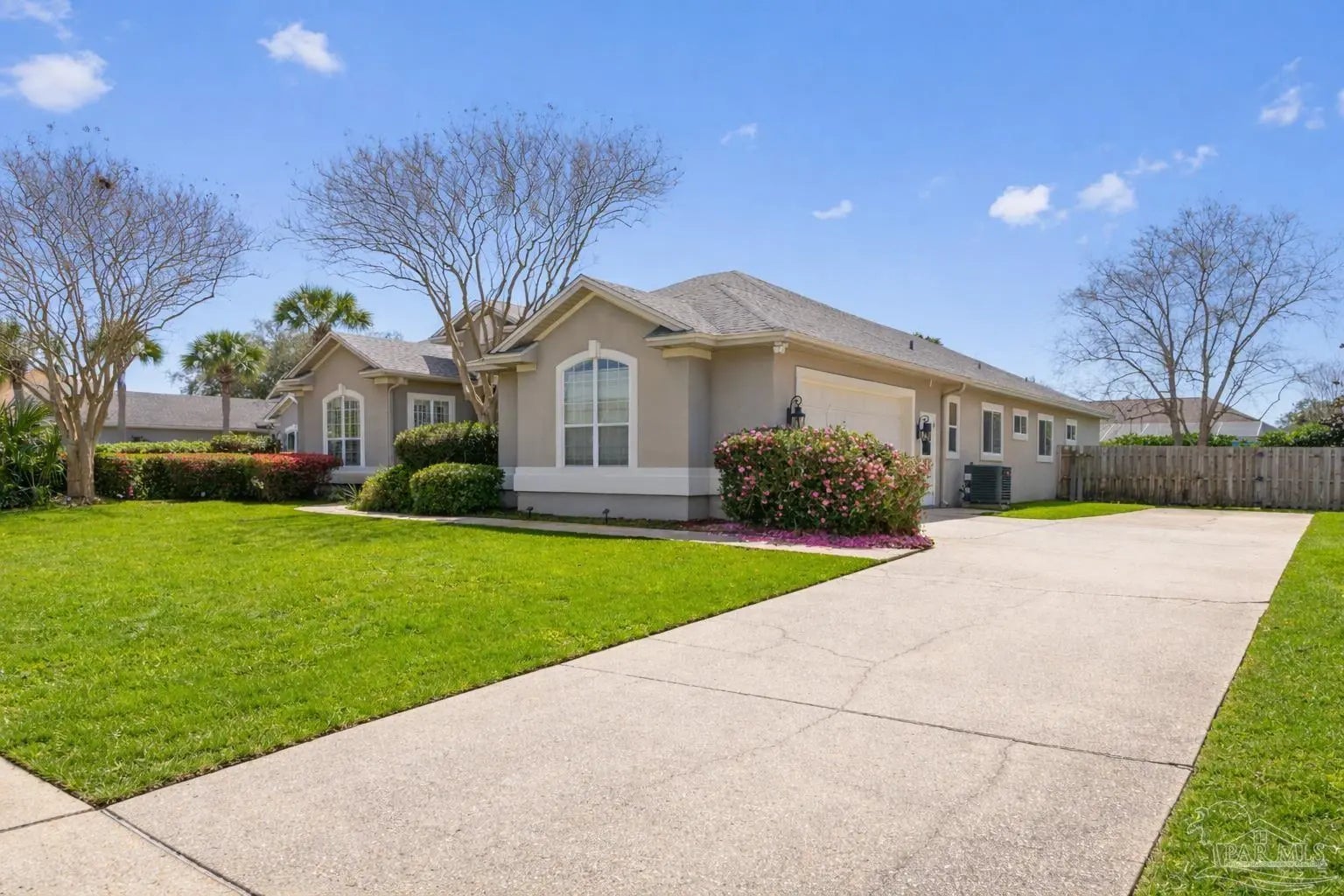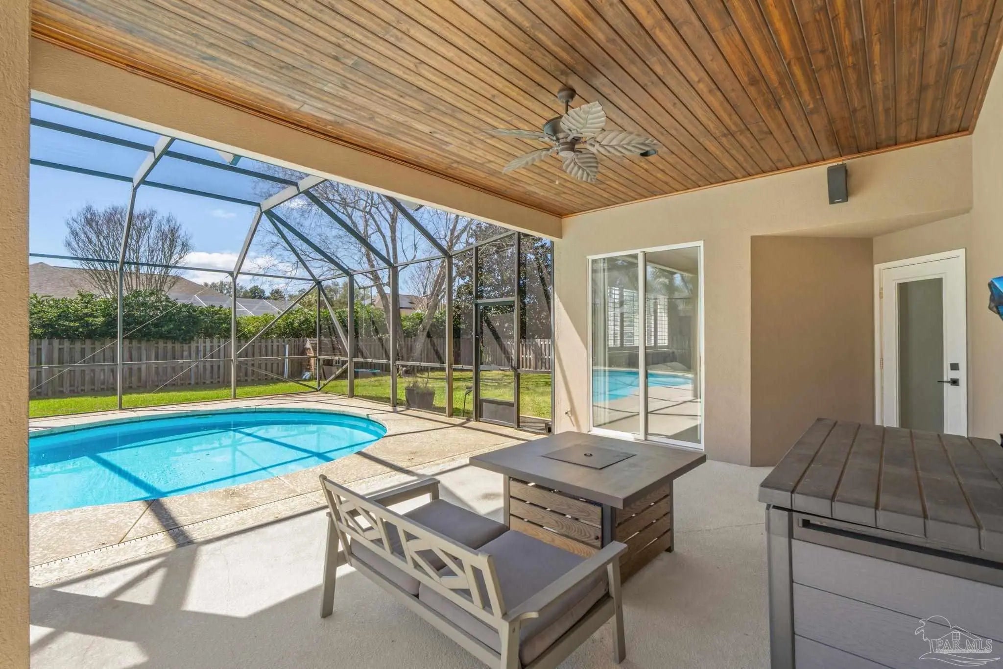 Welcome to this exceptional, fully remodeled home nestled on a quiet cul-de-sac in the highly sought-after Grand Pointe subdivision. Showcasing high-end finishes and thoughtful designer upgrades throughout, this residence offers an elevated take on Florida living! Step outside to your private, resort-style retreat featuring a spacious covered lanai with a beautifully stained tongue-and-groove ceiling, an outdoor kitchen, and a screened-in pool—perfect for effortless entertaining or year-round relaxation. Inside, the open split floor plan is enhanced by soaring ceilings and elegant tray details, creating a bright and sophisticated ambiance. Formal living and dining areas flow seamlessly into the heart of the home: a chef-inspired kitchen complete with a large island, granite countertops, premium stainless appliances, abundant prep space, and a walk-in pantry. Every detail has been thoughtfully curated, including new flooring, fresh designer paint, updated lighting, integrated surround sound, and custom built-in closets that blend style with functionality. The owner’s suite serves as a private sanctuary, offering direct pool access, high ceilings, and spacious custom walk-in closets. The spa-like en-suite bath features a soaking tub, walk-in shower, dual vanity, and an adjoining office—ideal for working from home. On the opposite wing, three additional bedrooms and two beautifully appointed bathrooms provide comfort and privacy for family and guests. The inviting family room centers around a sleek fireplace with custom built-ins, creating a warm yet refined gathering space. Additional highlights include a whole-home water filtration system, security system, and an oversized side-entry 2.5-car garage. The lush backyard offers garden space along with banana and lime trees. Located in the highly desirable Gulf Breeze School District, this home is just minutes from pristine beaches, neighborhood park, and downtown Pensacola. This is the one you don’t want to miss!