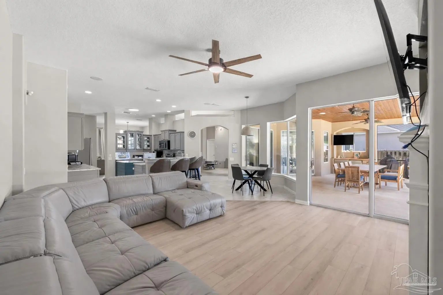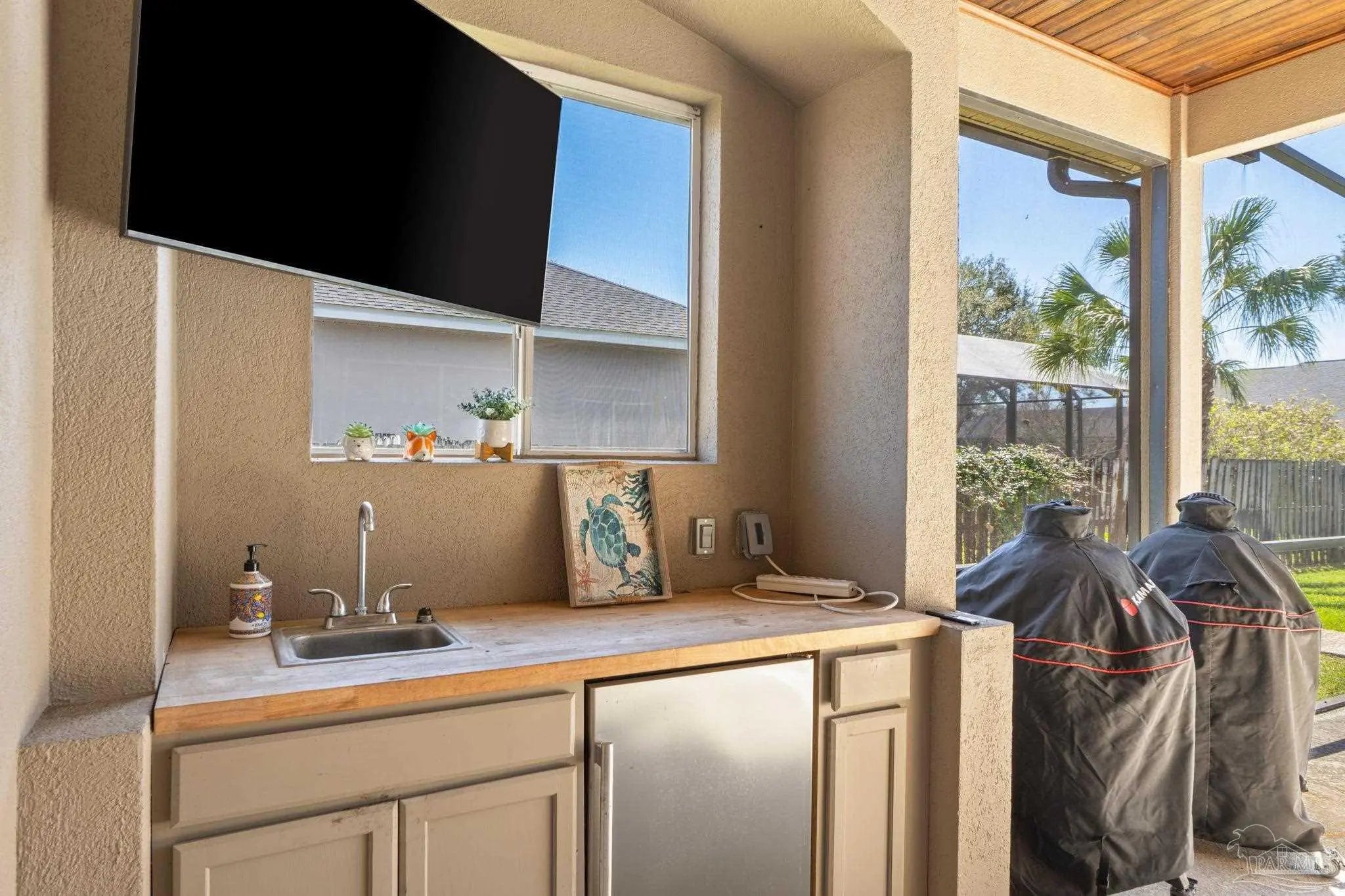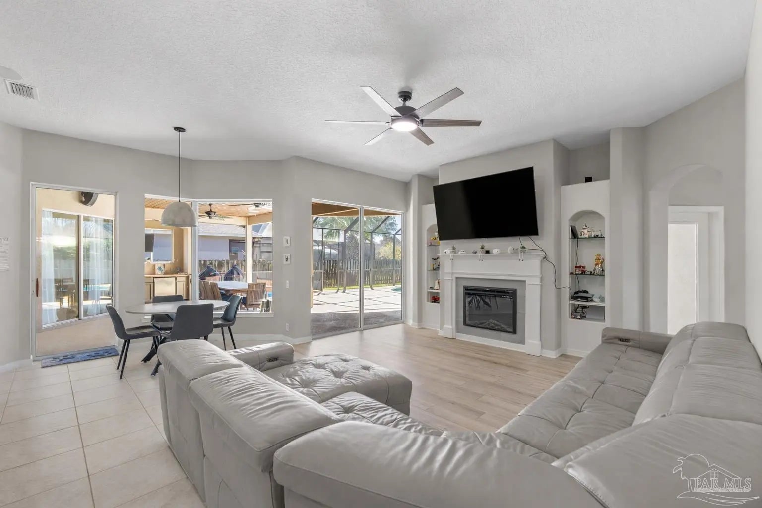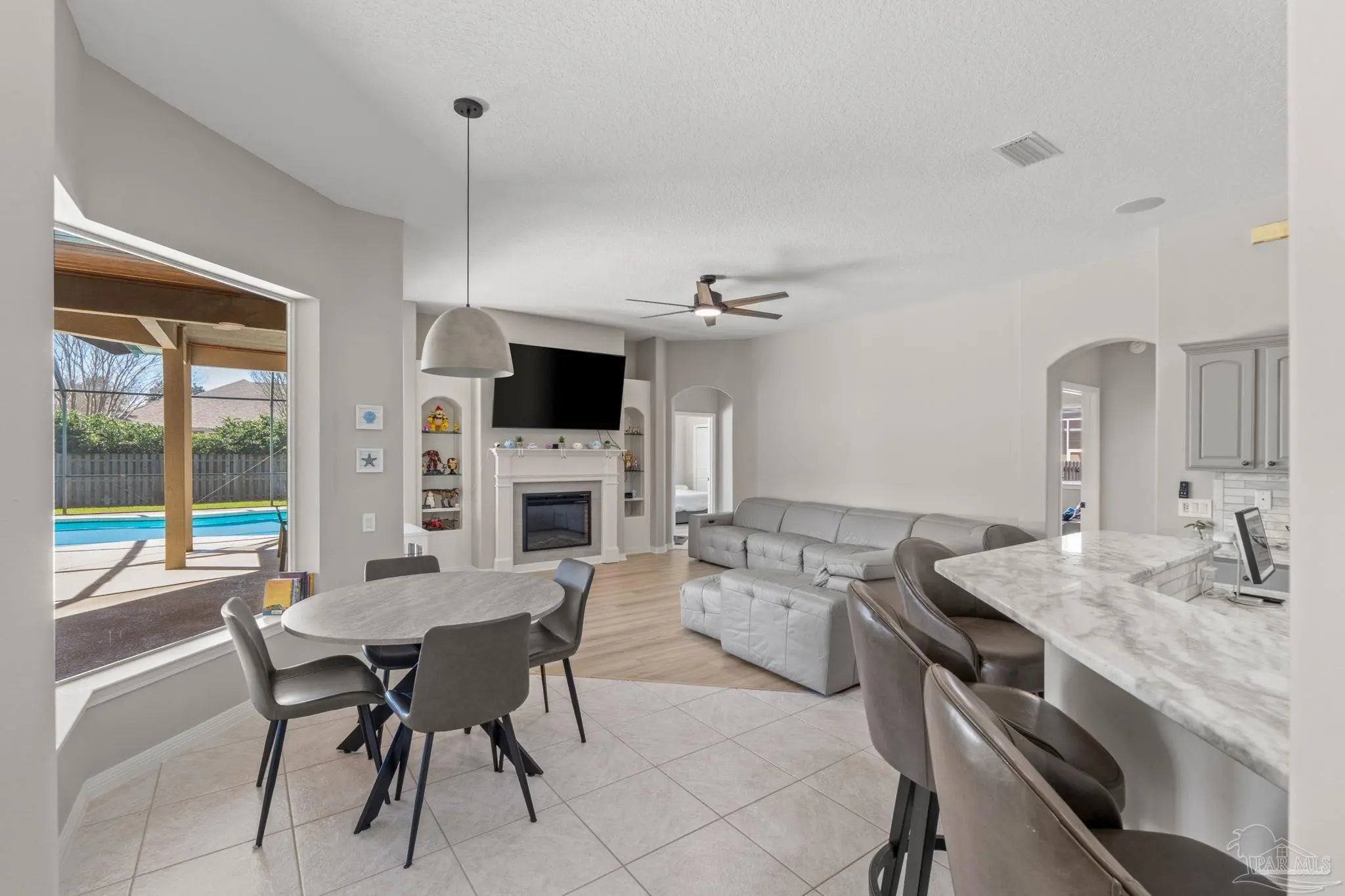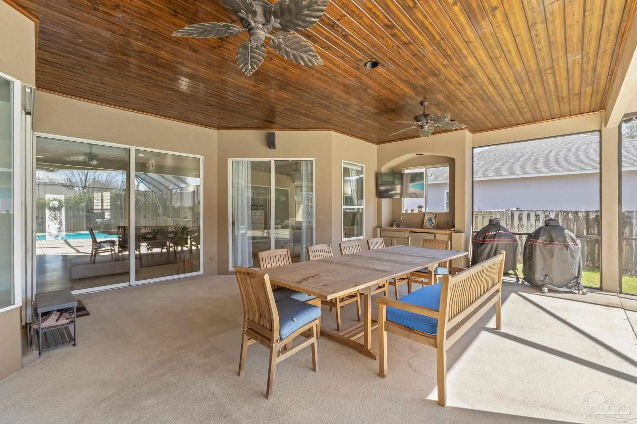 Welcome to this exceptional, fully remodeled home nestled on a quiet cul-de-sac in the highly sought-after Grand Pointe subdivision. Showcasing high-end finishes and thoughtful designer upgrades throughout, this residence offers an elevated take on Florida living! Step outside to your private, resort-style retreat featuring a spacious covered lanai with a beautifully stained tongue-and-groove ceiling, an outdoor kitchen, and a screened-in pool—perfect for effortless entertaining or year-round relaxation. Inside, the open split floor plan is enhanced by soaring ceilings and elegant tray details, creating a bright and sophisticated ambiance. Formal living and dining areas flow seamlessly into the heart of the home: a chef-inspired kitchen complete with a large island, granite countertops, premium stainless appliances, abundant prep space, and a walk-in pantry. Every detail has been thoughtfully curated, including new flooring, fresh designer paint, updated lighting, integrated surround sound, and custom built-in closets that blend style with functionality. The owner’s suite serves as a private sanctuary, offering direct pool access, high ceilings, and spacious custom walk-in closets. The spa-like en-suite bath features a soaking tub, walk-in shower, dual vanity, and an adjoining office—ideal for working from home. On the opposite wing, three additional bedrooms and two beautifully appointed bathrooms provide comfort and privacy for family and guests. The inviting family room centers around a sleek fireplace with custom built-ins, creating a warm yet refined gathering space. Additional highlights include a whole-home water filtration system, security system, and an oversized side-entry 2.5-car garage. The lush backyard offers garden space along with banana and lime trees. Located in the highly desirable Gulf Breeze School District, this home is just minutes from pristine beaches, neighborhood park, and downtown Pensacola. This is the one you don’t want to miss!