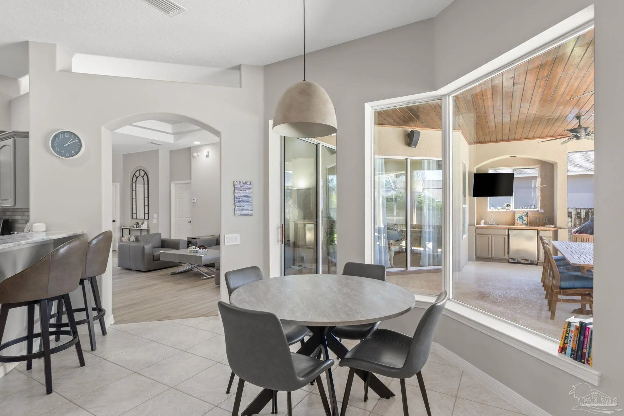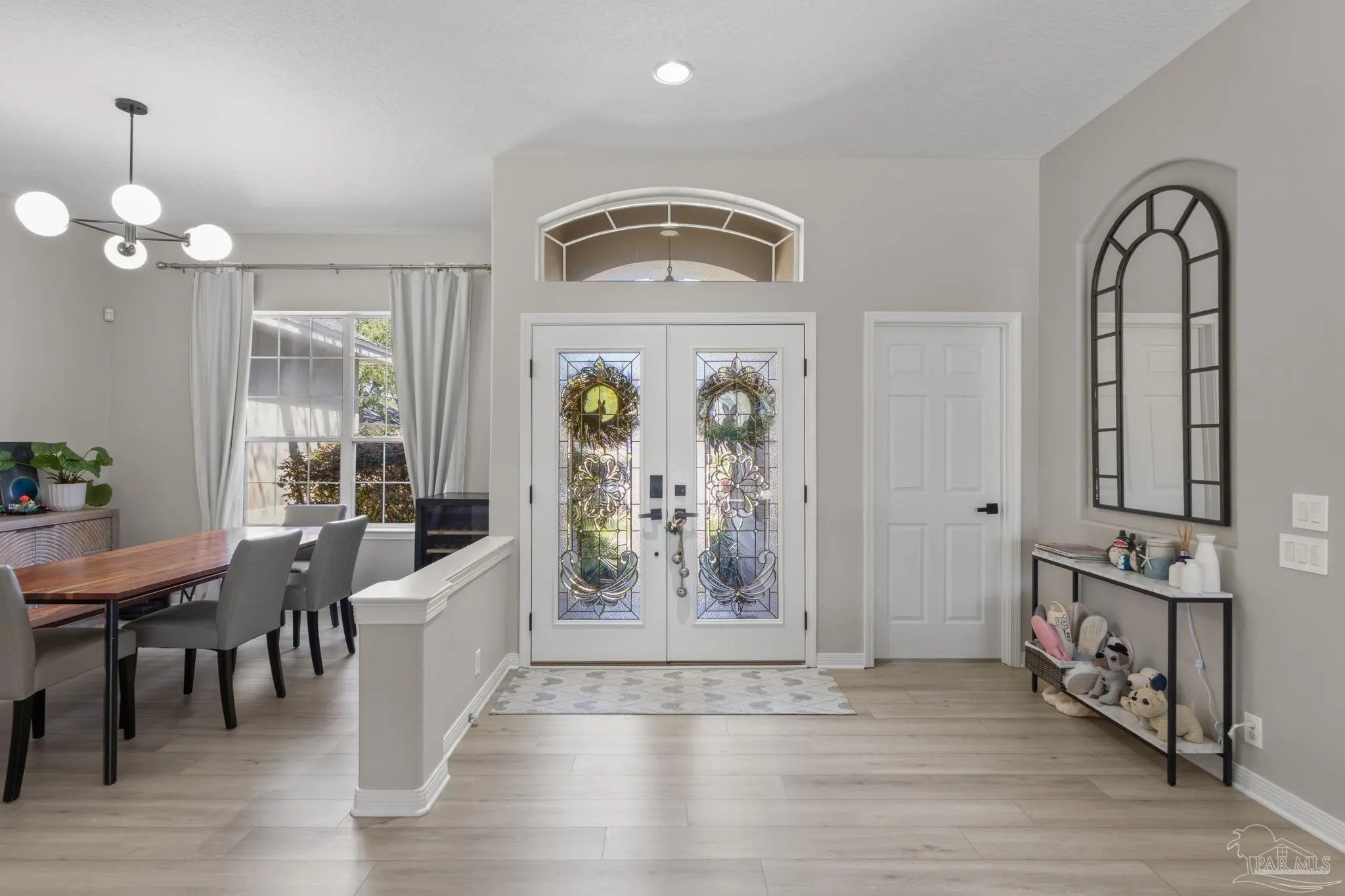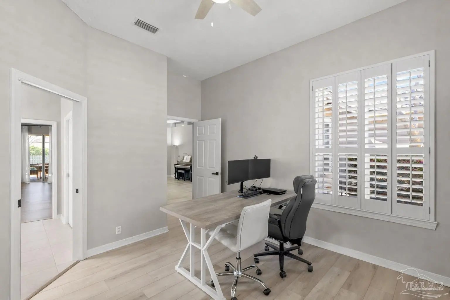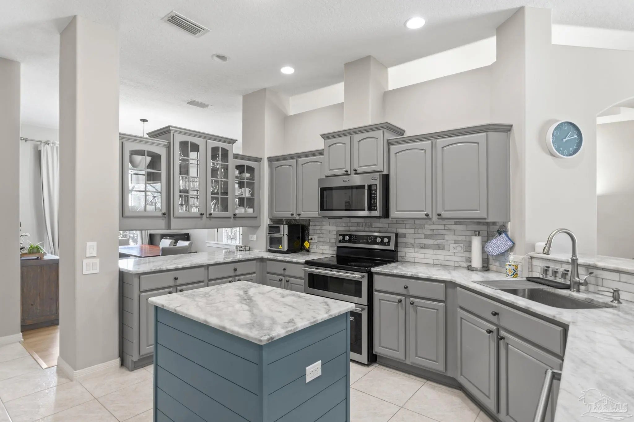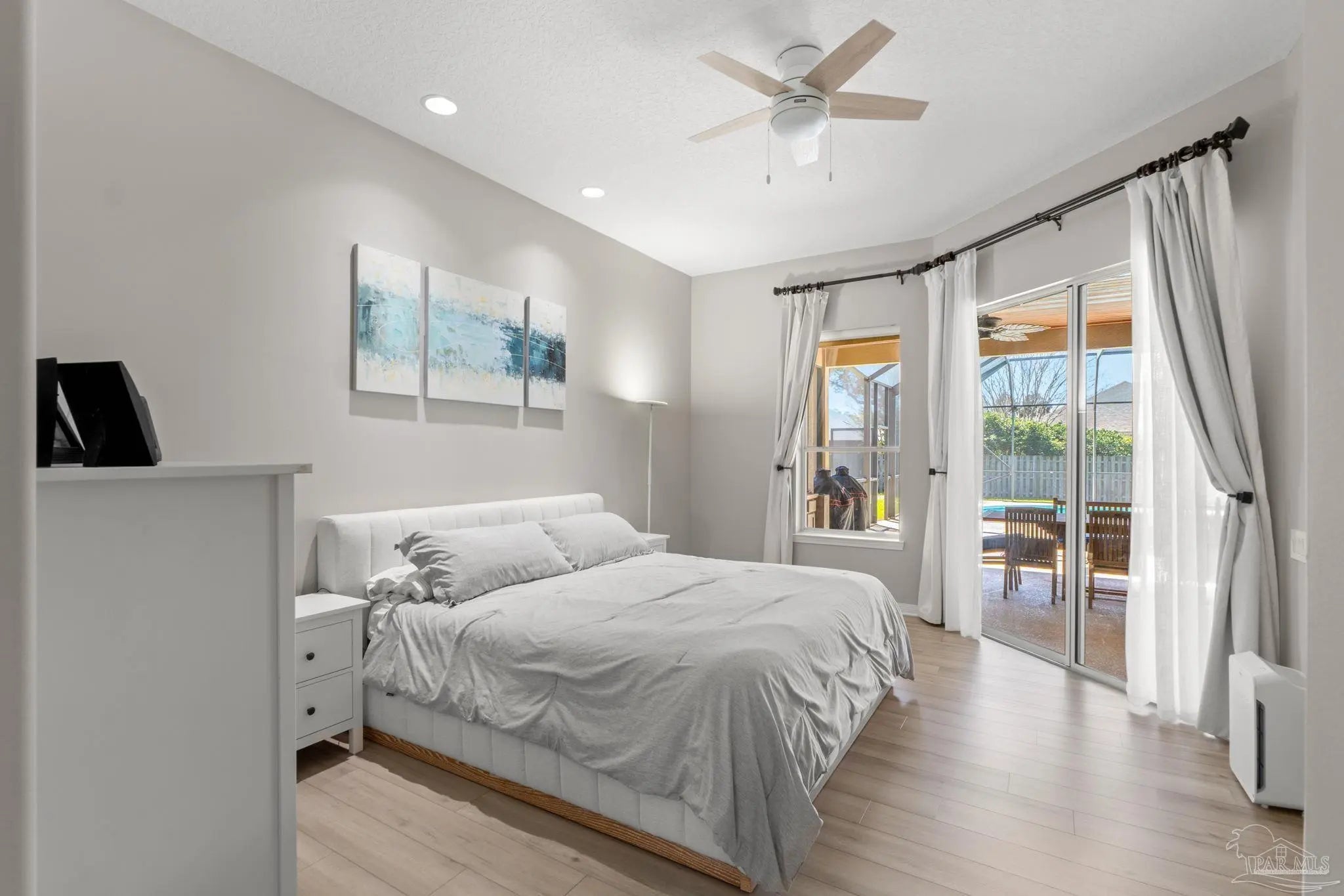 Welcome to this exceptional, fully remodeled home nestled on a quiet cul-de-sac in the highly sought-after Grand Pointe subdivision. Showcasing high-end finishes and thoughtful designer upgrades throughout, this residence offers an elevated take on Florida living! Step outside to your private, resort-style retreat featuring a spacious covered lanai with a beautifully stained tongue-and-groove ceiling, an outdoor kitchen, and a screened-in pool—perfect for effortless entertaining or year-round relaxation. Inside, the open split floor plan is enhanced by soaring ceilings and elegant tray details, creating a bright and sophisticated ambiance. Formal living and dining areas flow seamlessly into the heart of the home: a chef-inspired kitchen complete with a large island, granite countertops, premium stainless appliances, abundant prep space, and a walk-in pantry. Every detail has been thoughtfully curated, including new flooring, fresh designer paint, updated lighting, integrated surround sound, and custom built-in closets that blend style with functionality. The owner’s suite serves as a private sanctuary, offering direct pool access, high ceilings, and spacious custom walk-in closets. The spa-like en-suite bath features a soaking tub, walk-in shower, dual vanity, and an adjoining office—ideal for working from home. On the opposite wing, three additional bedrooms and two beautifully appointed bathrooms provide comfort and privacy for family and guests. The inviting family room centers around a sleek fireplace with custom built-ins, creating a warm yet refined gathering space. Additional highlights include a whole-home water filtration system, security system, and an oversized side-entry 2.5-car garage. The lush backyard offers garden space along with banana and lime trees. Located in the highly desirable Gulf Breeze School District, this home is just minutes from pristine beaches, neighborhood park, and downtown Pensacola. This is the one you don’t want to miss!
