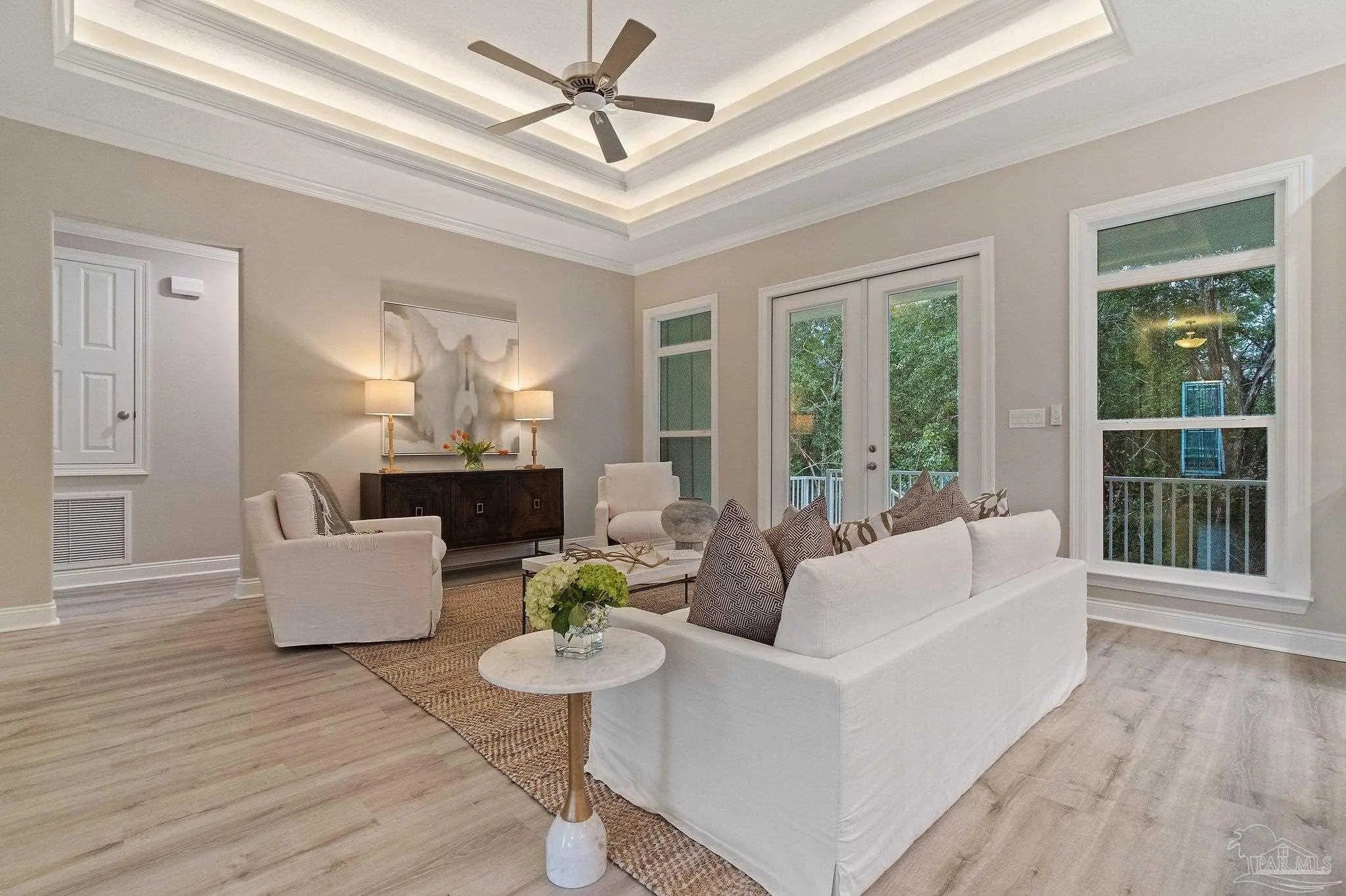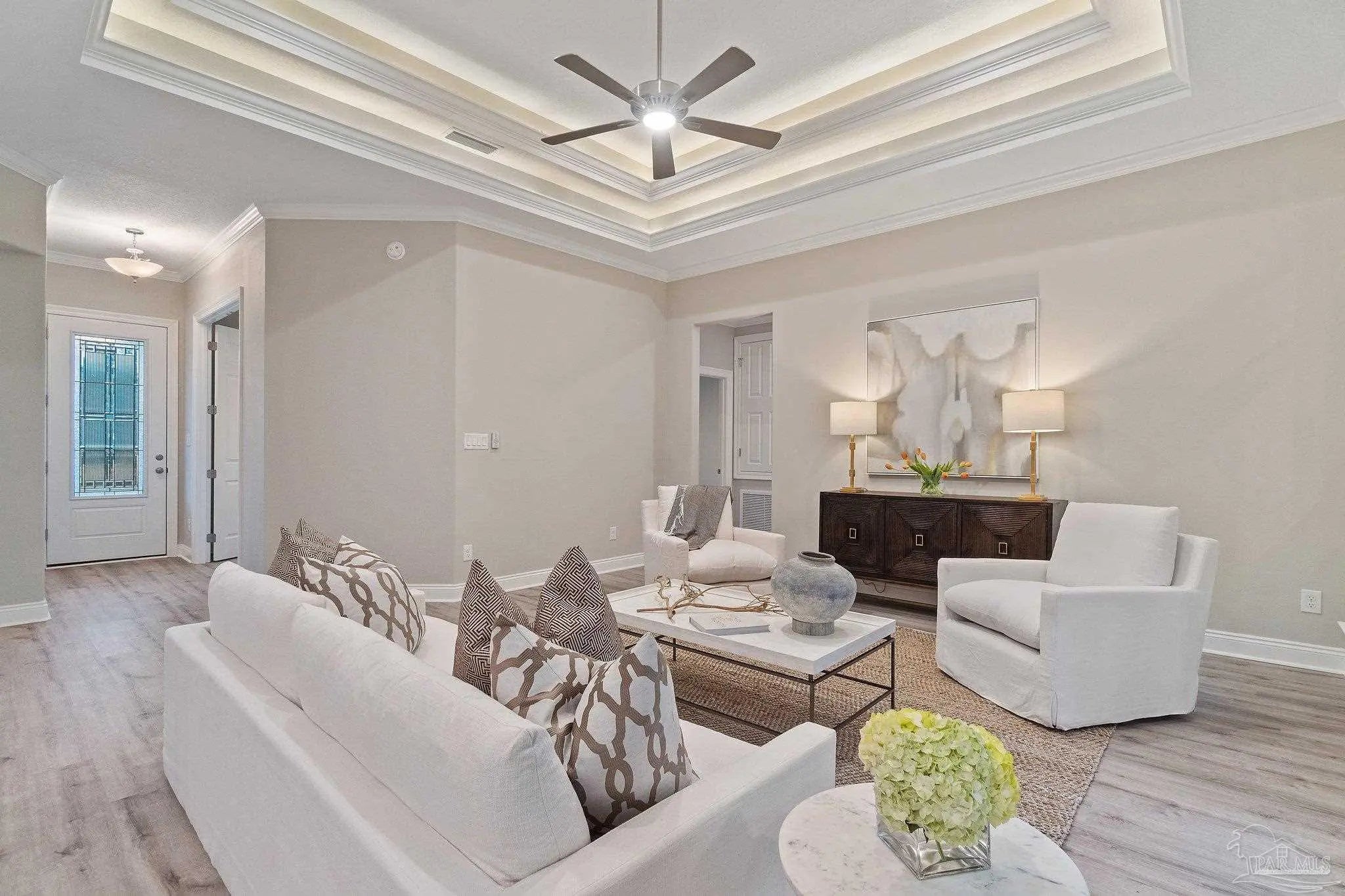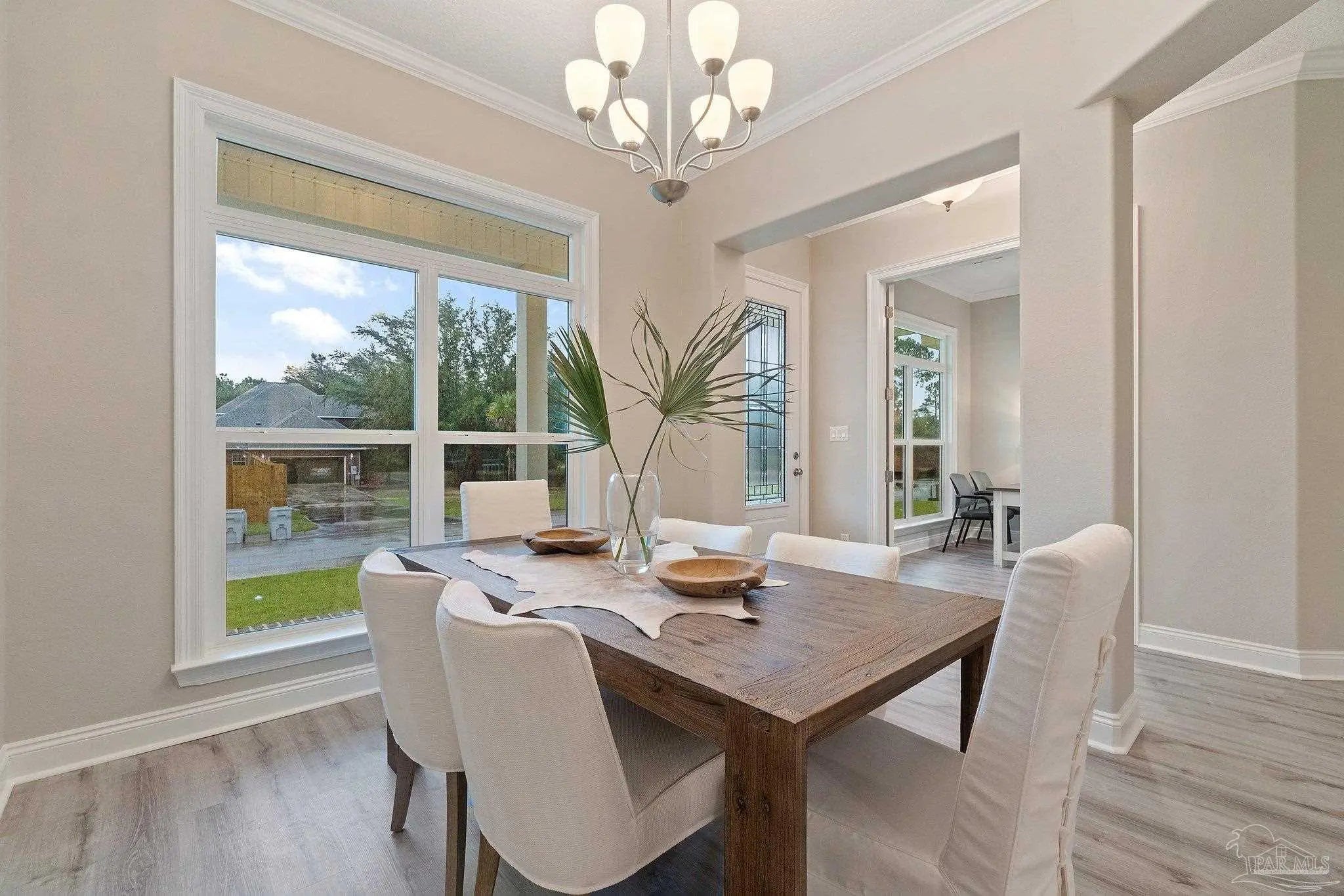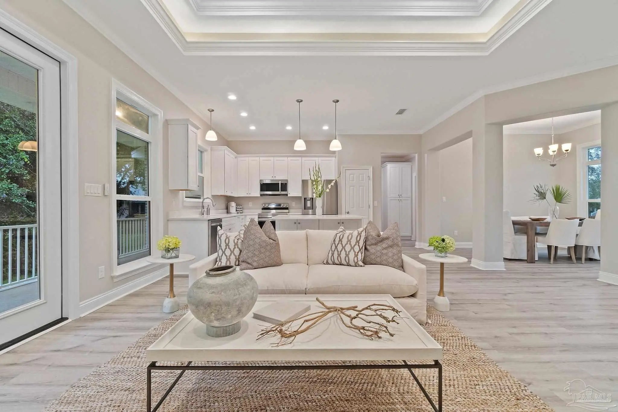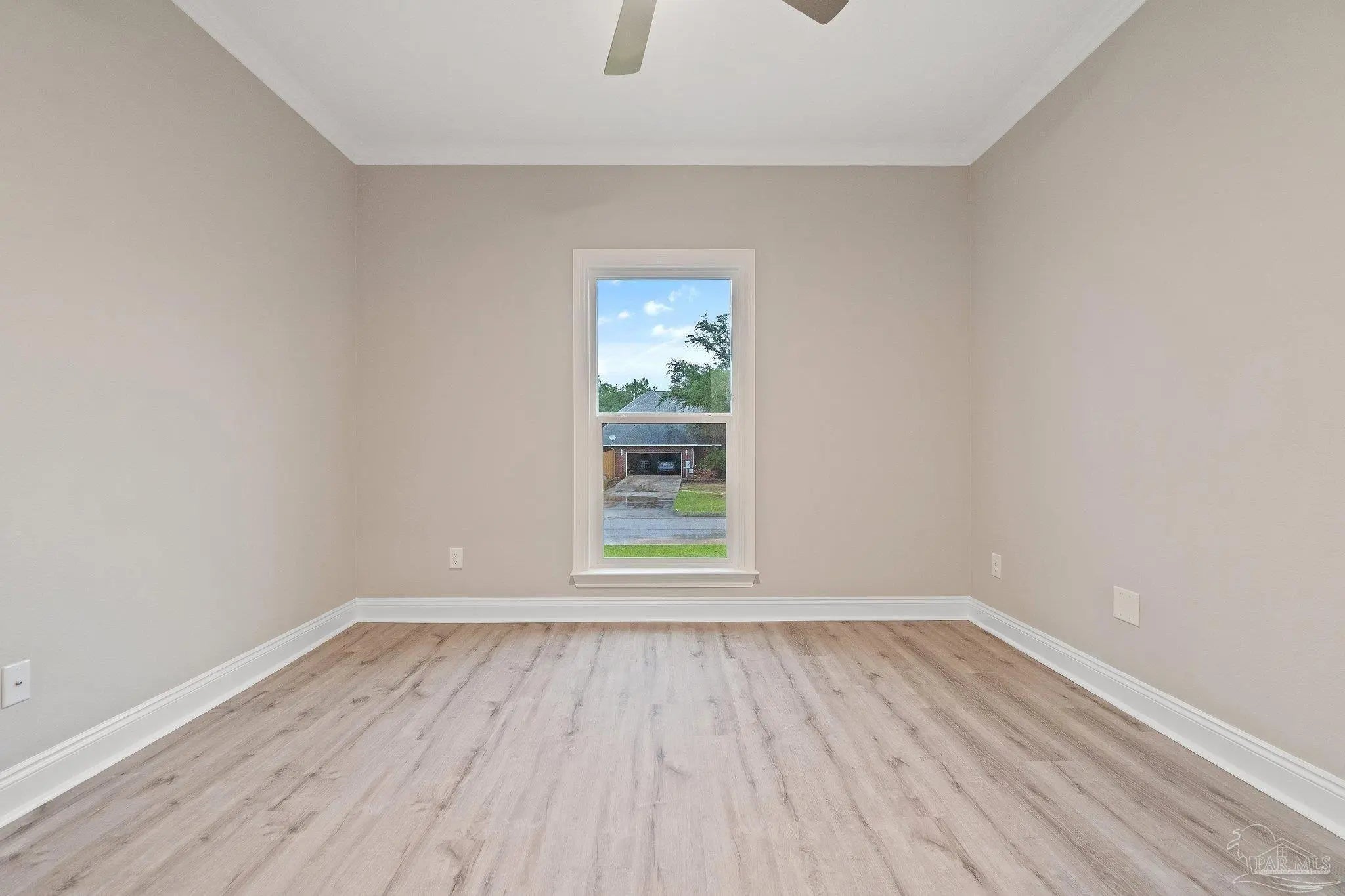Beautiful new construction home with upgrades galore! This custom craftsman home showcases floor to ceiling windows, tray ceilings in the living room and primary bedroom, sleek white ceiling fans in every room, quartz and marble counter tops throughout, as well as a floor to ceiling tile shower and free standing tub in the primary bathroom. LVP flooring through out - NO carpet! Stainless steel kitchen appliances and pendant lights over the island. A 4th bedroom that could be used as an office and a nice sized laundry room loaded with cabinets. Large french doors add plenty of natural light and lead to the over-sized back patio. The entire lot is sodded and has a sprinkler/irrigation system. Finished attached 2 car garage. Located in the heart of Navarre, close to schools, Publix shopping center and minutes from the beach. This home is a show stopper, don't miss out! *Photos are of a finished home of the same plan but not the exact house*