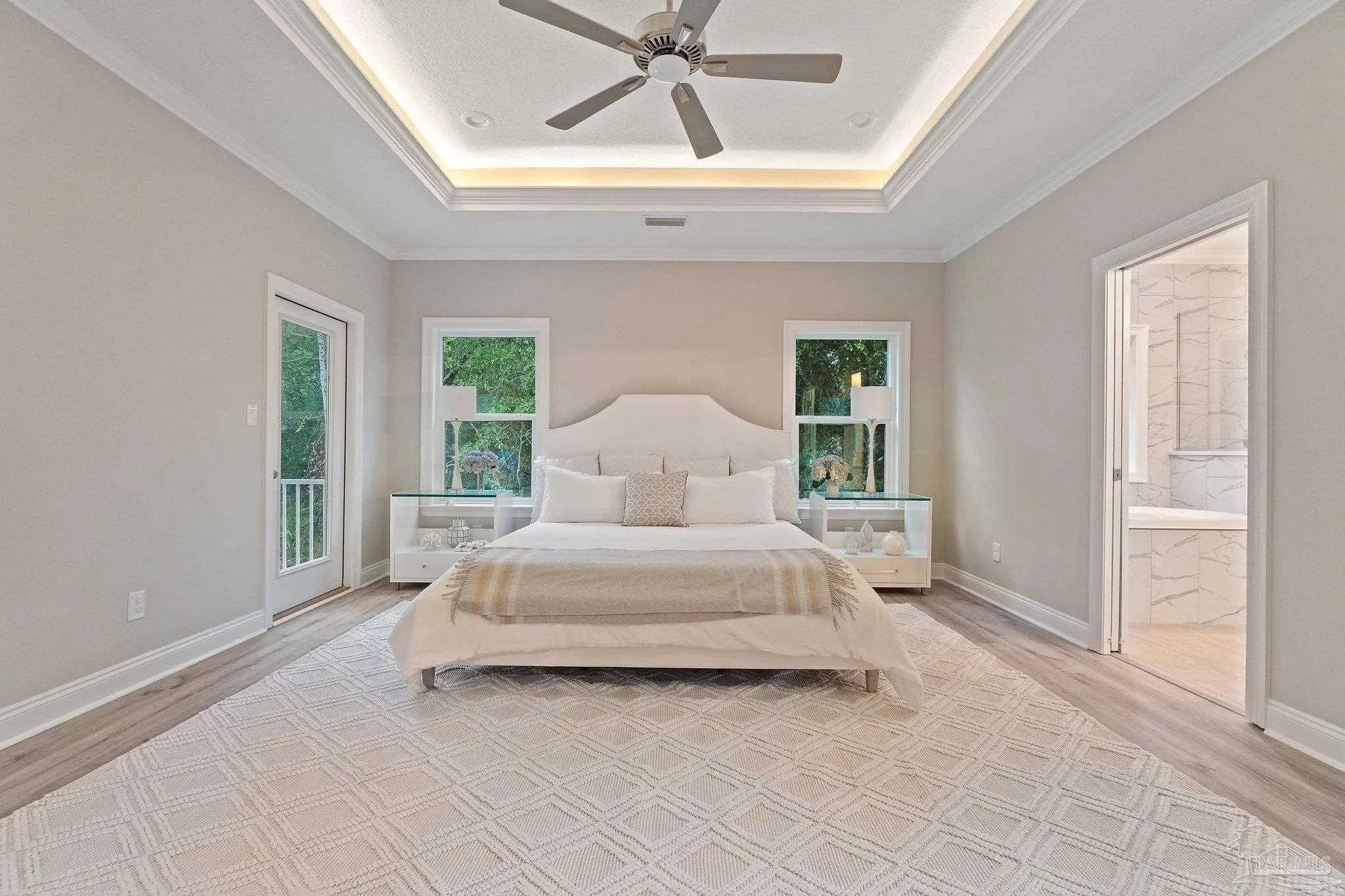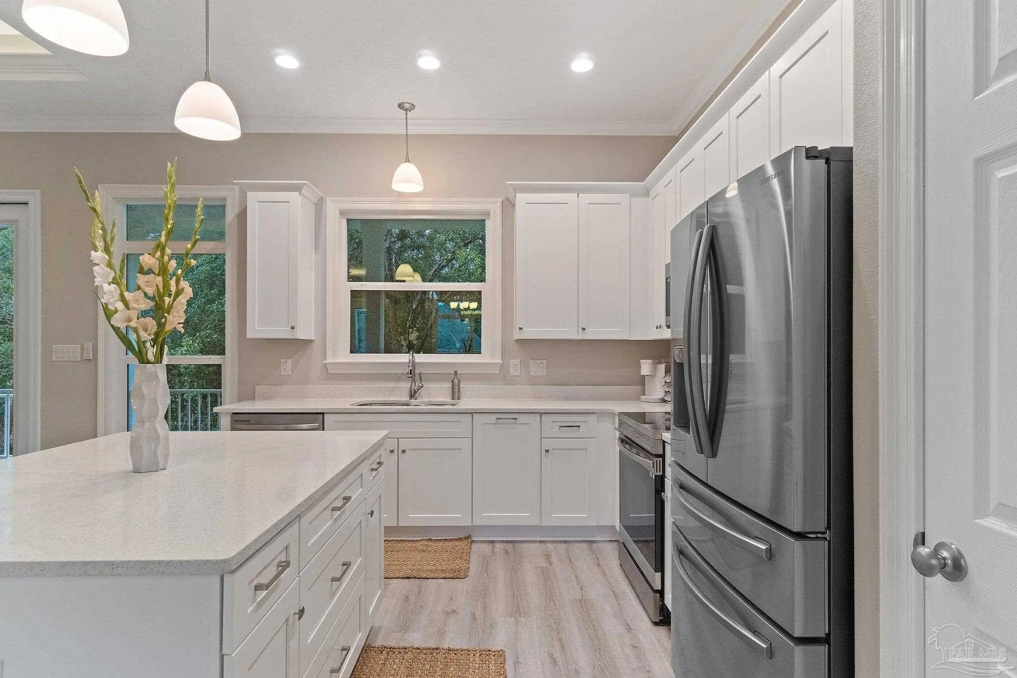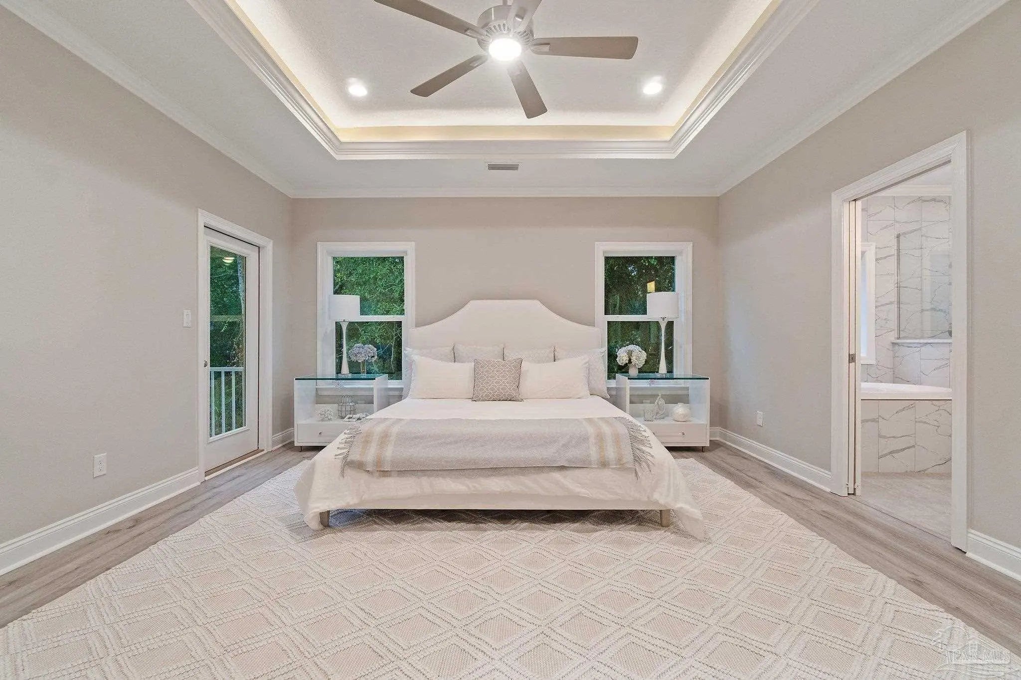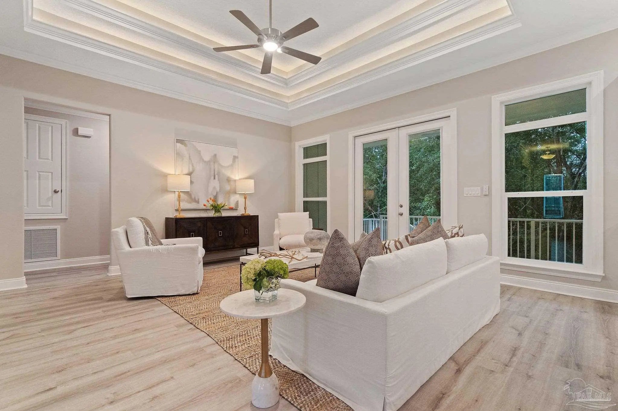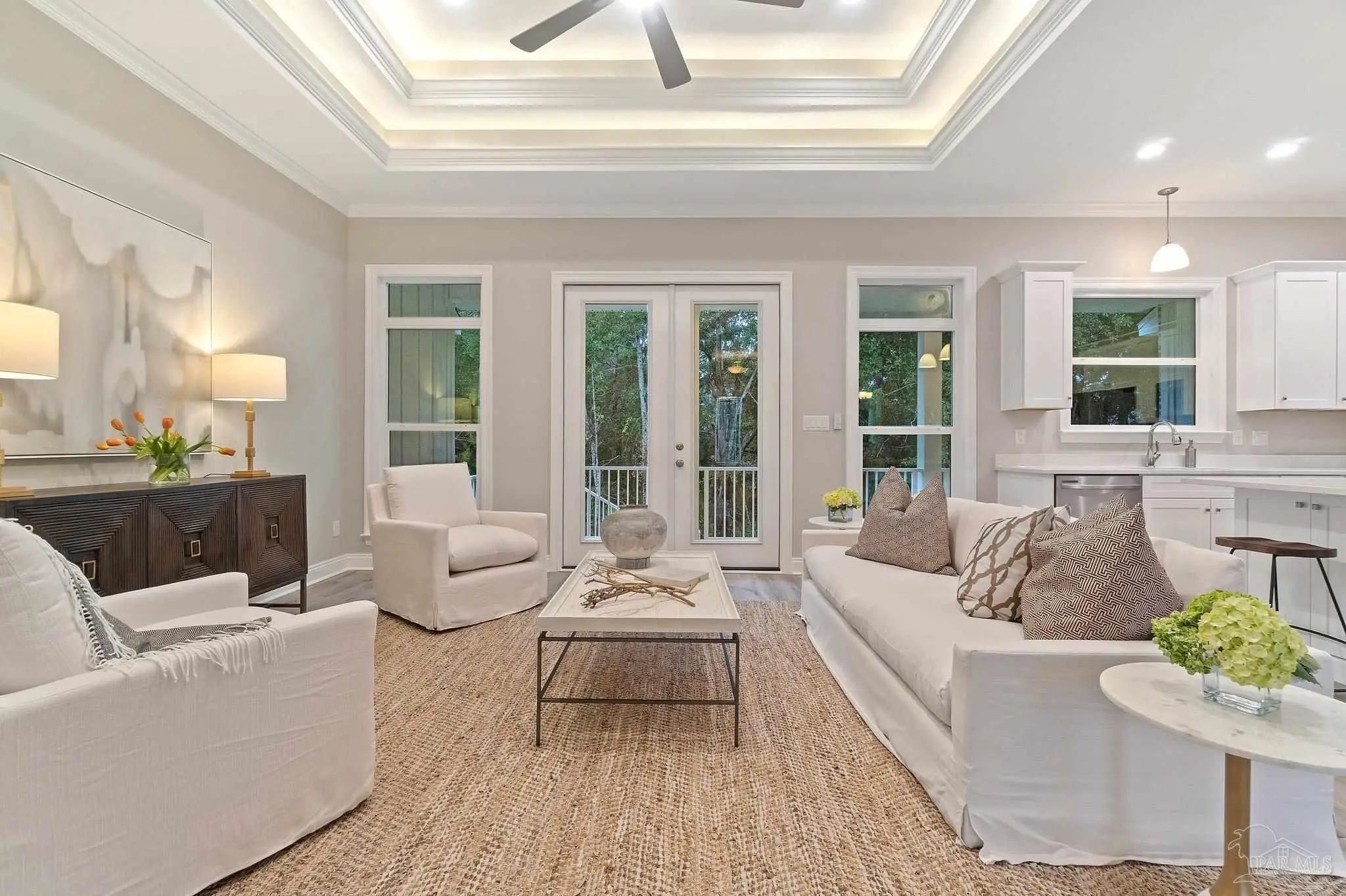 Beautiful new construction home with upgrades galore! This custom craftsman home showcases floor to ceiling windows, tray ceilings in the living room and primary bedroom, sleek white ceiling fans in every room, quartz and marble counter tops throughout, as well as a floor to ceiling tile shower and free standing tub in the primary bathroom. LVP flooring through out - NO carpet! Stainless steel kitchen appliances and pendant lights over the island. A 4th bedroom that could be used as an office and a nice sized laundry room loaded with cabinets. Large french doors add plenty of natural light and lead to the over-sized back patio. The entire lot is sodded and has a sprinkler/irrigation system. Finished attached 2 car garage. Located in the heart of Navarre, close to schools, Publix shopping center and minutes from the beach. This home is a show stopper, don't miss out! *Photos are of a finished home of the same plan but not the exact house*