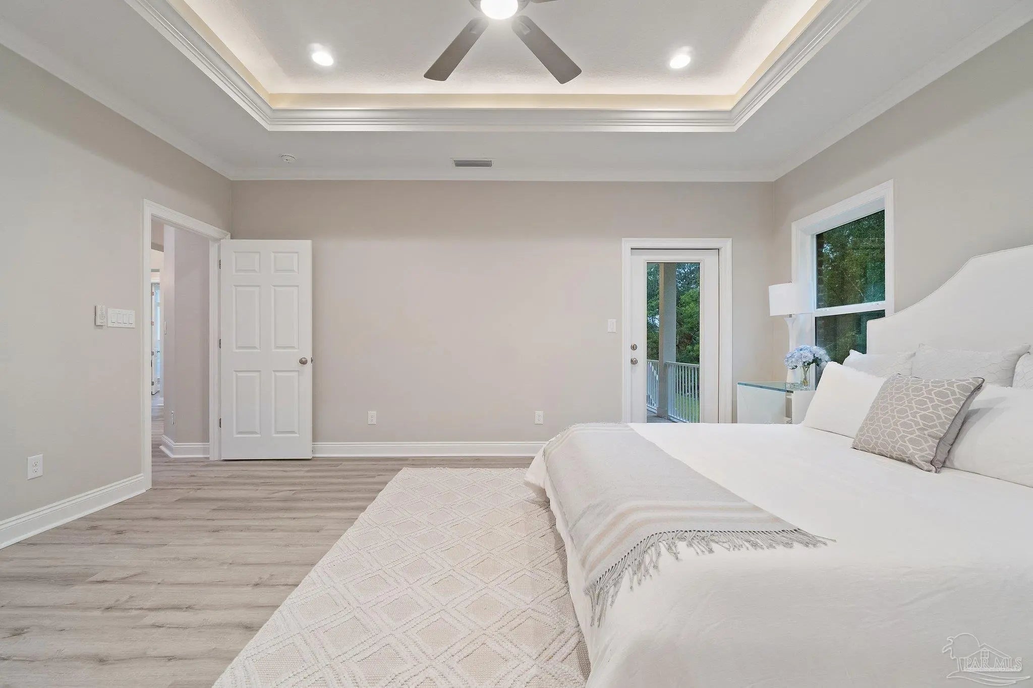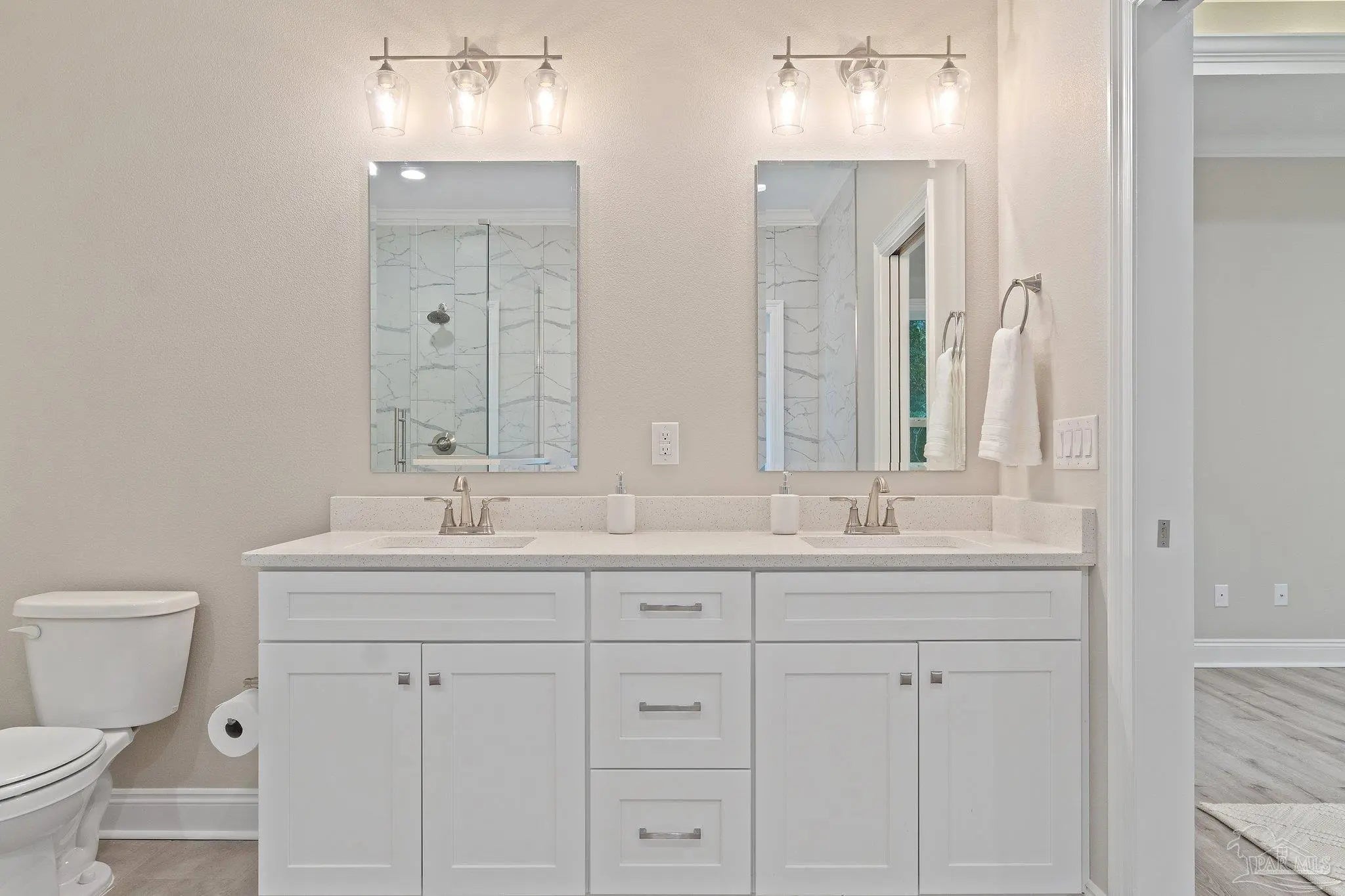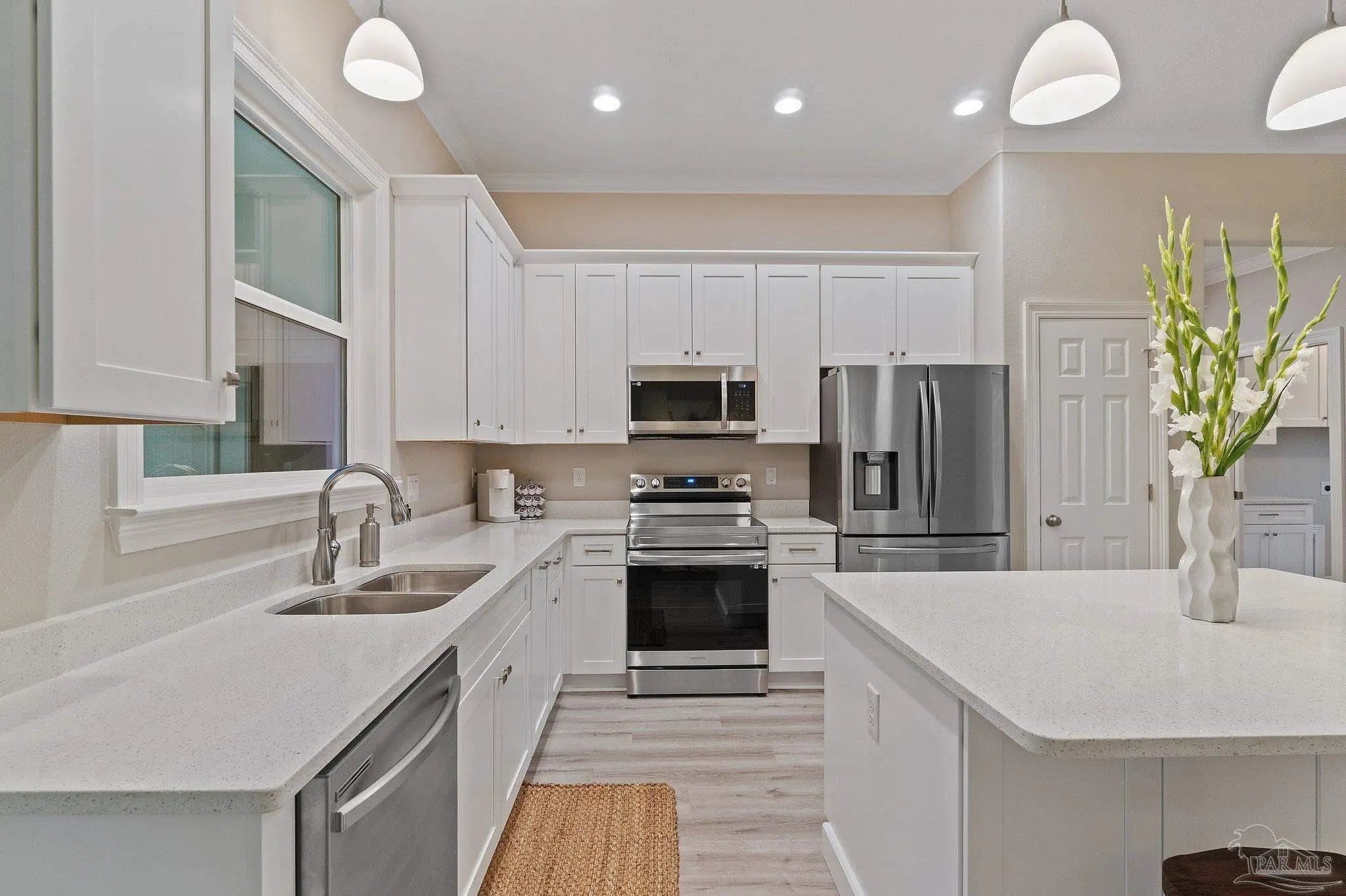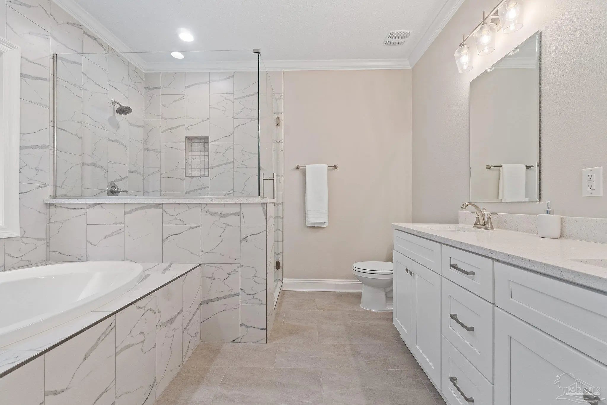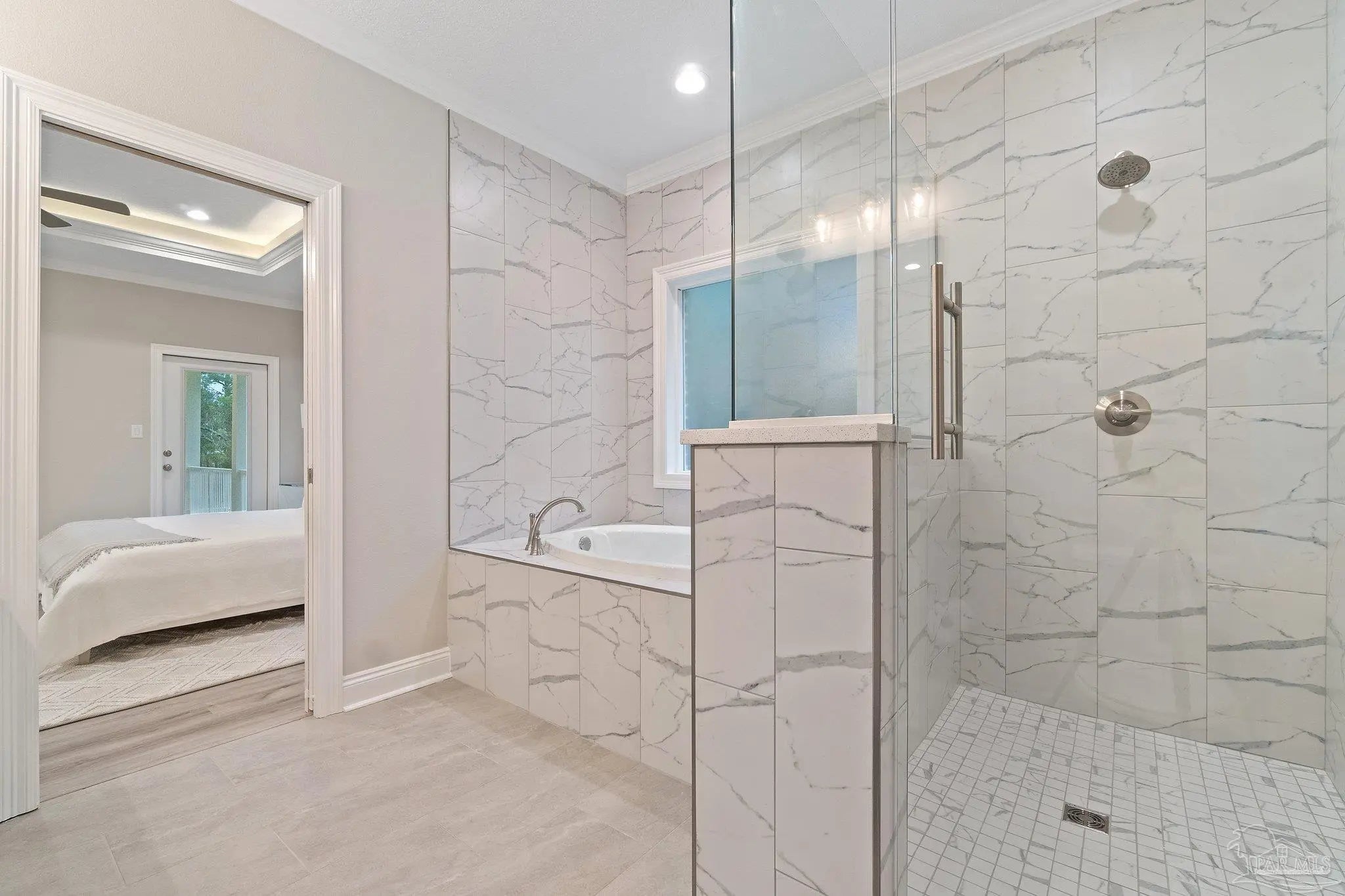 Beautiful new construction home with upgrades galore! This custom craftsman home showcases floor to ceiling windows, tray ceilings in the living room and primary bedroom, sleek white ceiling fans in every room, quartz and marble counter tops throughout, as well as a floor to ceiling tile shower and free standing tub in the primary bathroom. LVP flooring through out - NO carpet! Stainless steel kitchen appliances and pendant lights over the island. A 4th bedroom that could be used as an office and a nice sized laundry room loaded with cabinets. Large french doors add plenty of natural light and lead to the over-sized back patio. The entire lot is sodded and has a sprinkler/irrigation system. Finished attached 2 car garage. Located in the heart of Navarre, close to schools, Publix shopping center and minutes from the beach. This home is a show stopper, don't miss out! *Photos are of a finished home of the same plan but not the exact house*