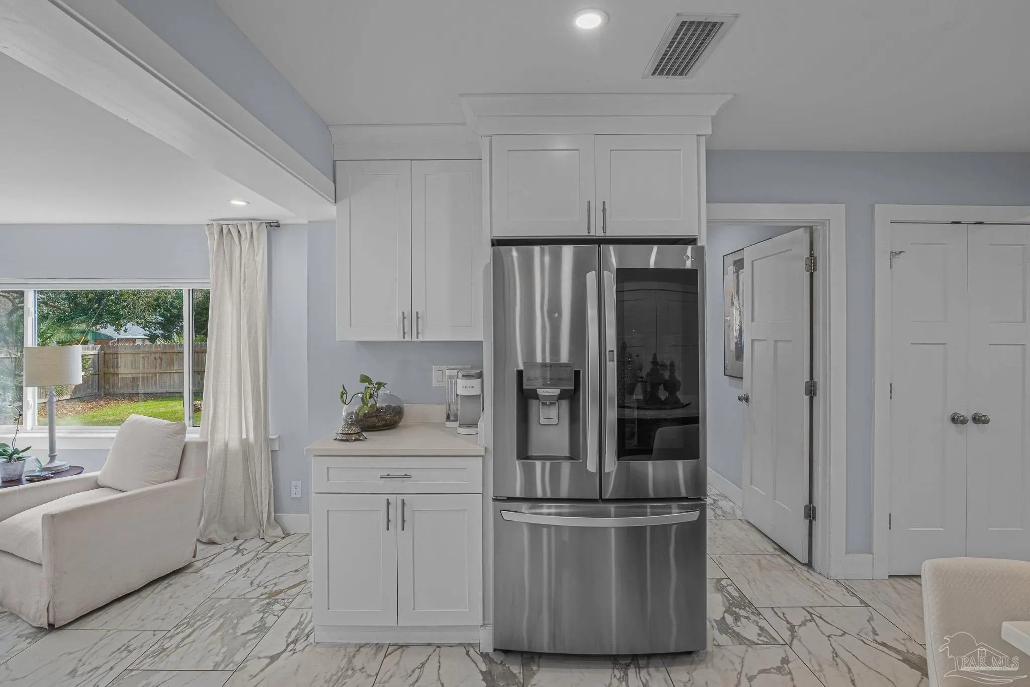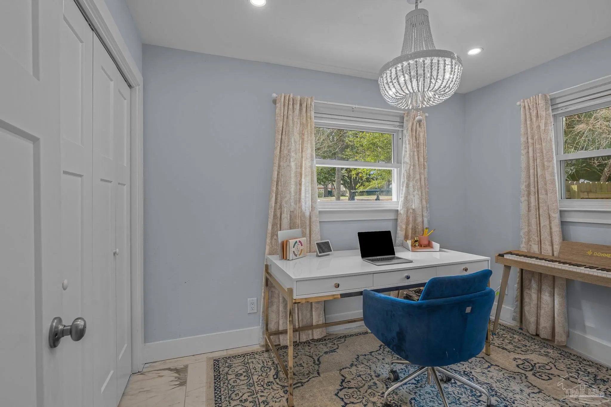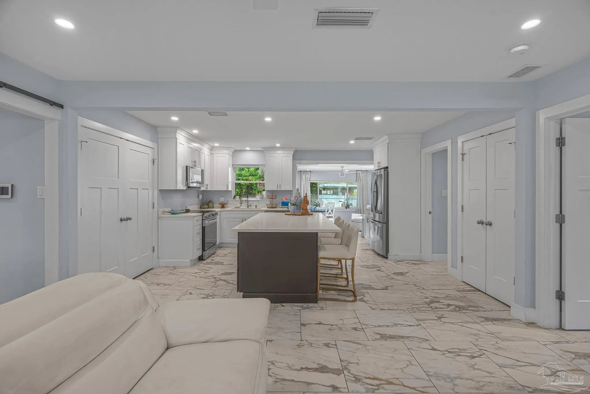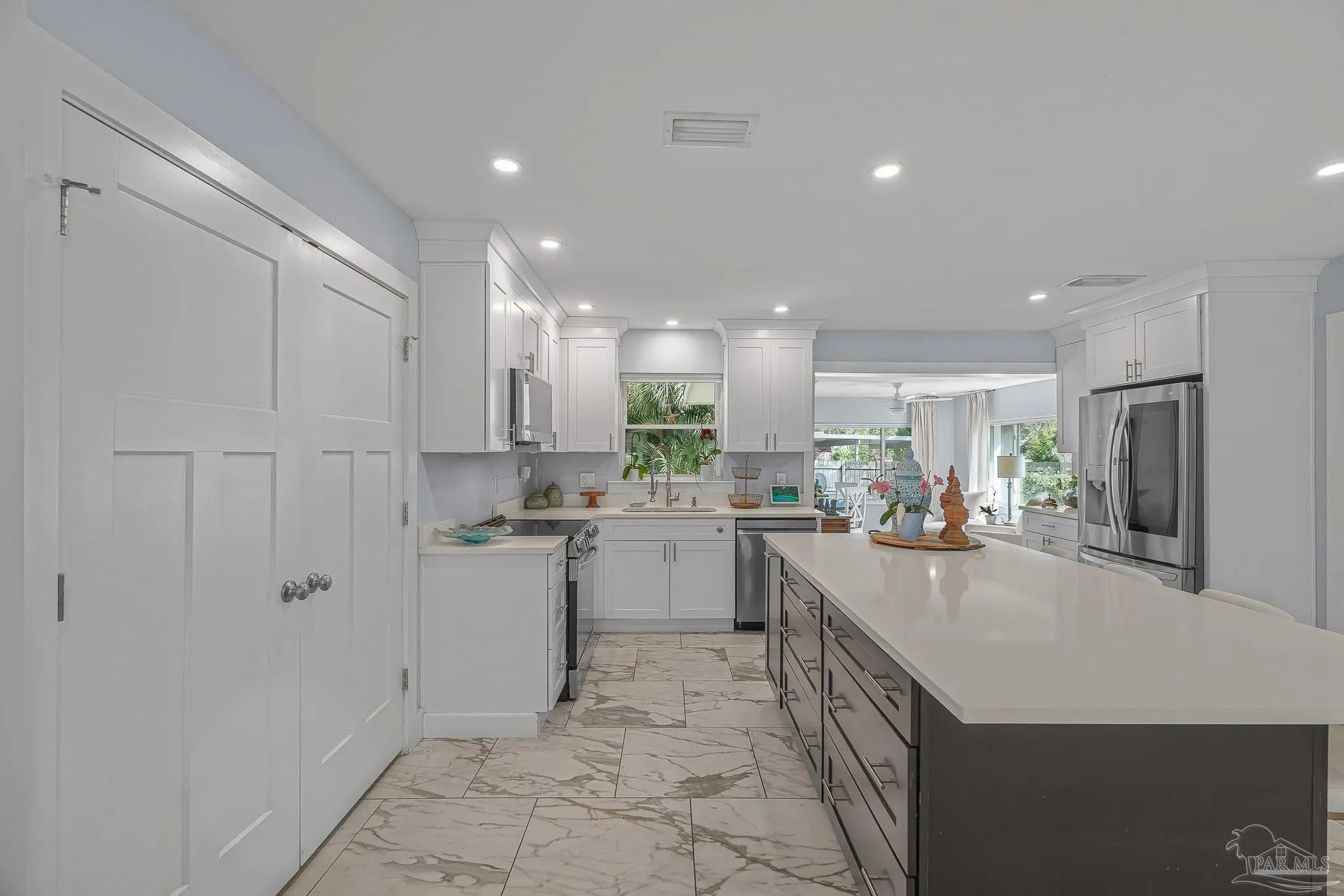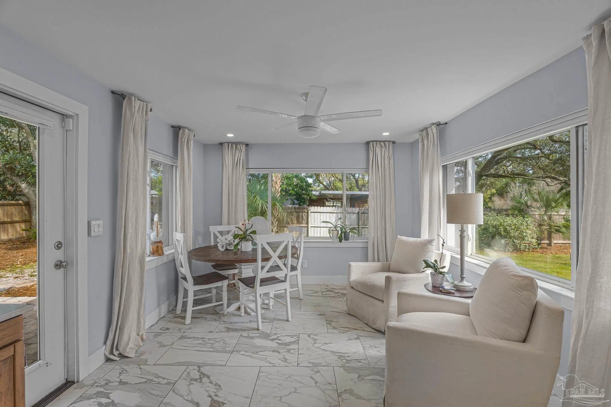 Enjoy coastal living in this well-maintained 4 bedroom, 2 bathroom ranch-style home featuring an open floor plan and tile flooring throughout for easy maintenance. The kitchen offers a center island, stainless steel appliances, and white solid wood cabinetry, flowing seamlessly into a sitting room or formal dining area filled with natural light. The primary suite includes an adjoining bathroom with a tiled walk-in shower, while the additional bedrooms provide flexibility for guests or office space. Step outside to a private patio and fully fenced backyard with extra lot space perfect for boat parking or additional storage. Conveniently located in Gulf Breeze, this property offers quick access to the white sand beaches of Pensacola Beach, nearby parks like Shoreline Park, top-rated schools, shopping, and dining, making it an ideal opportunity for full-time living or a coastal retreat.