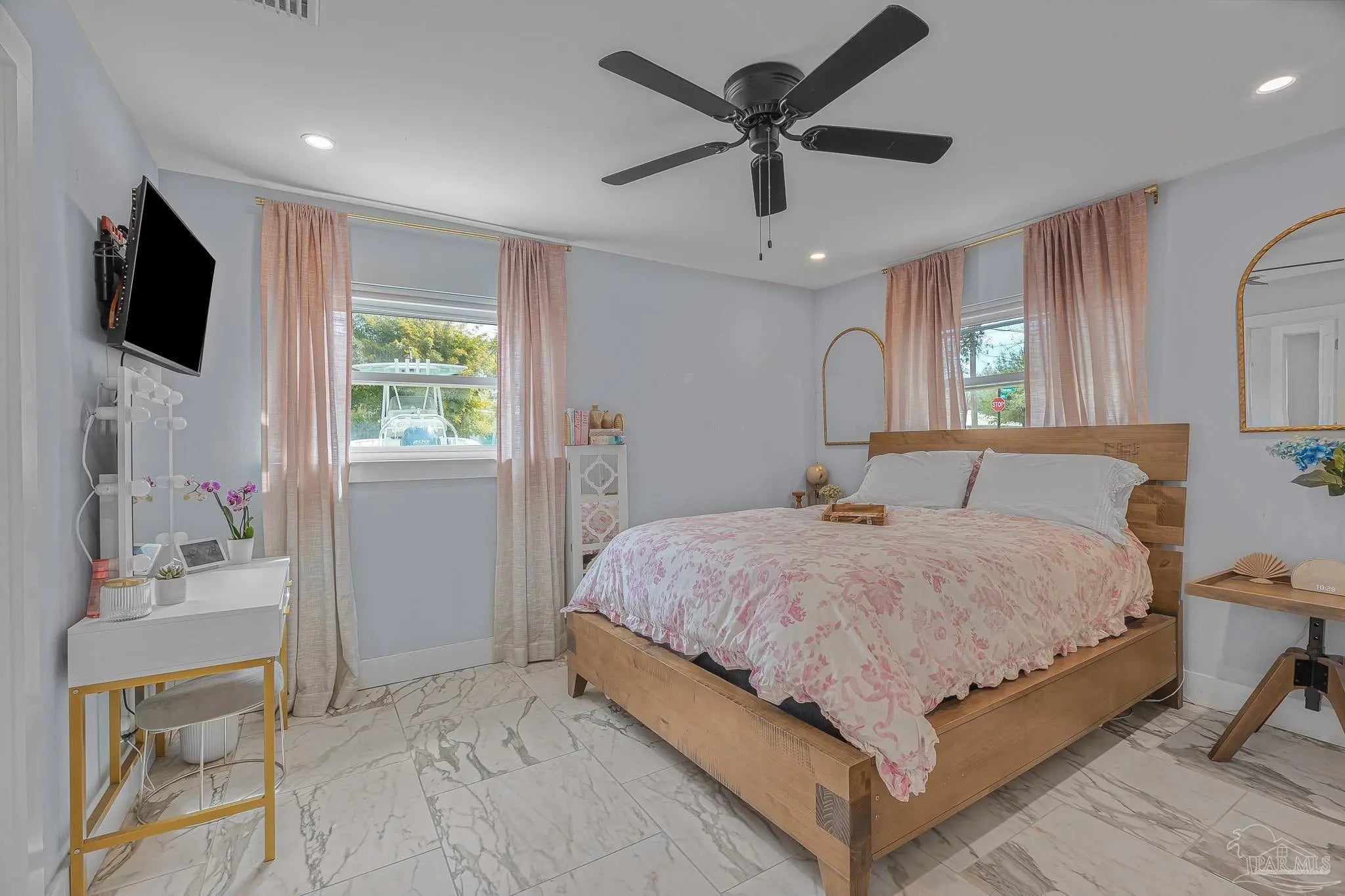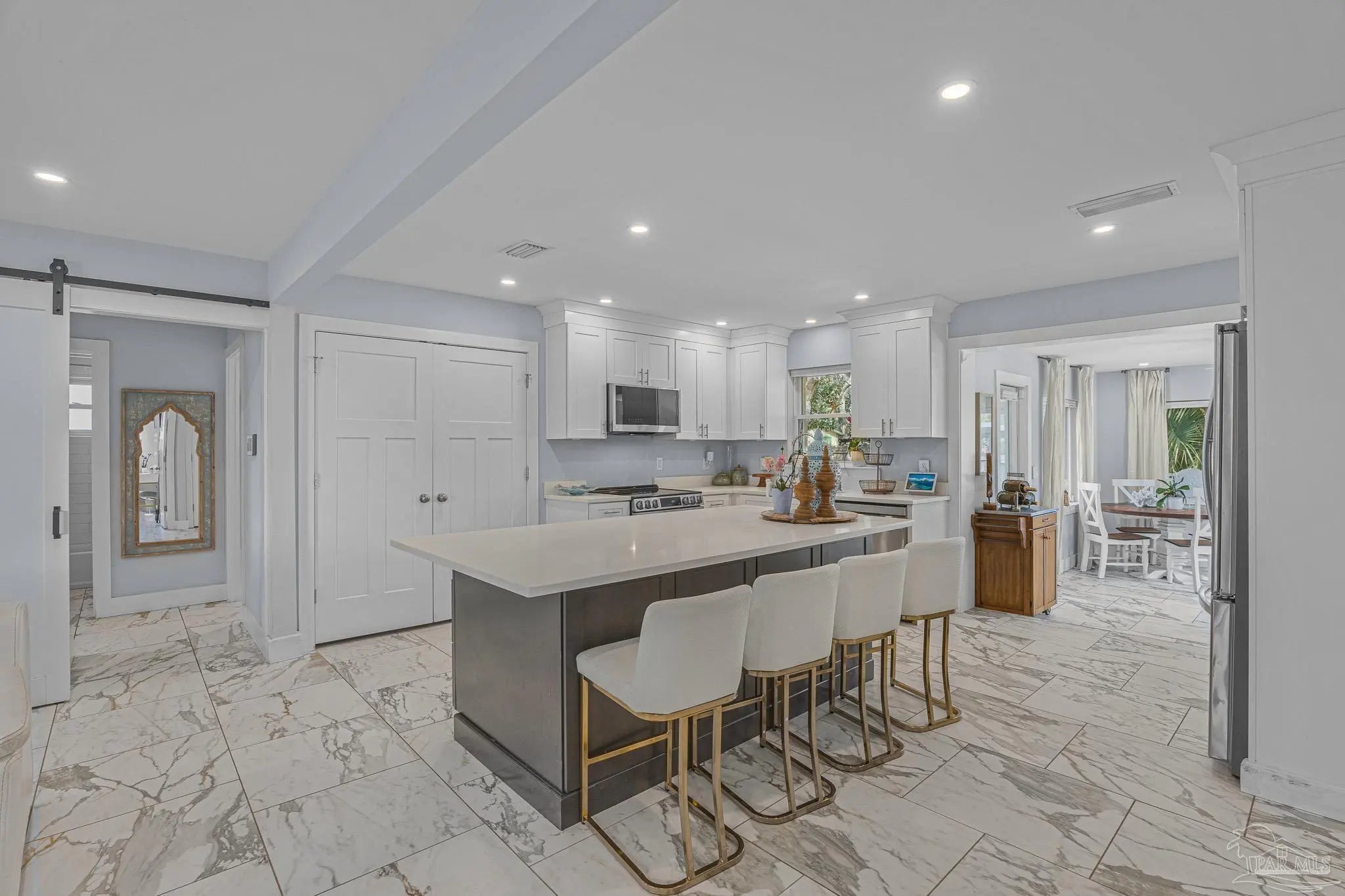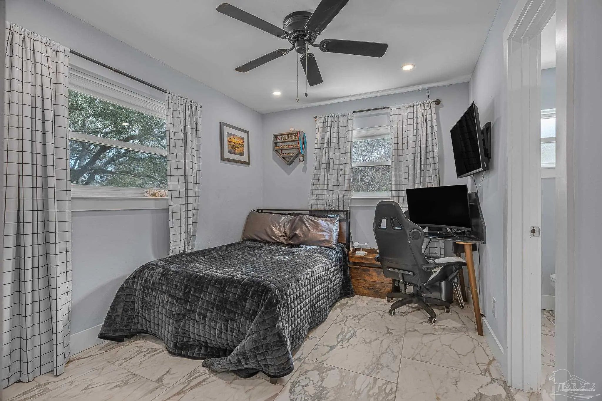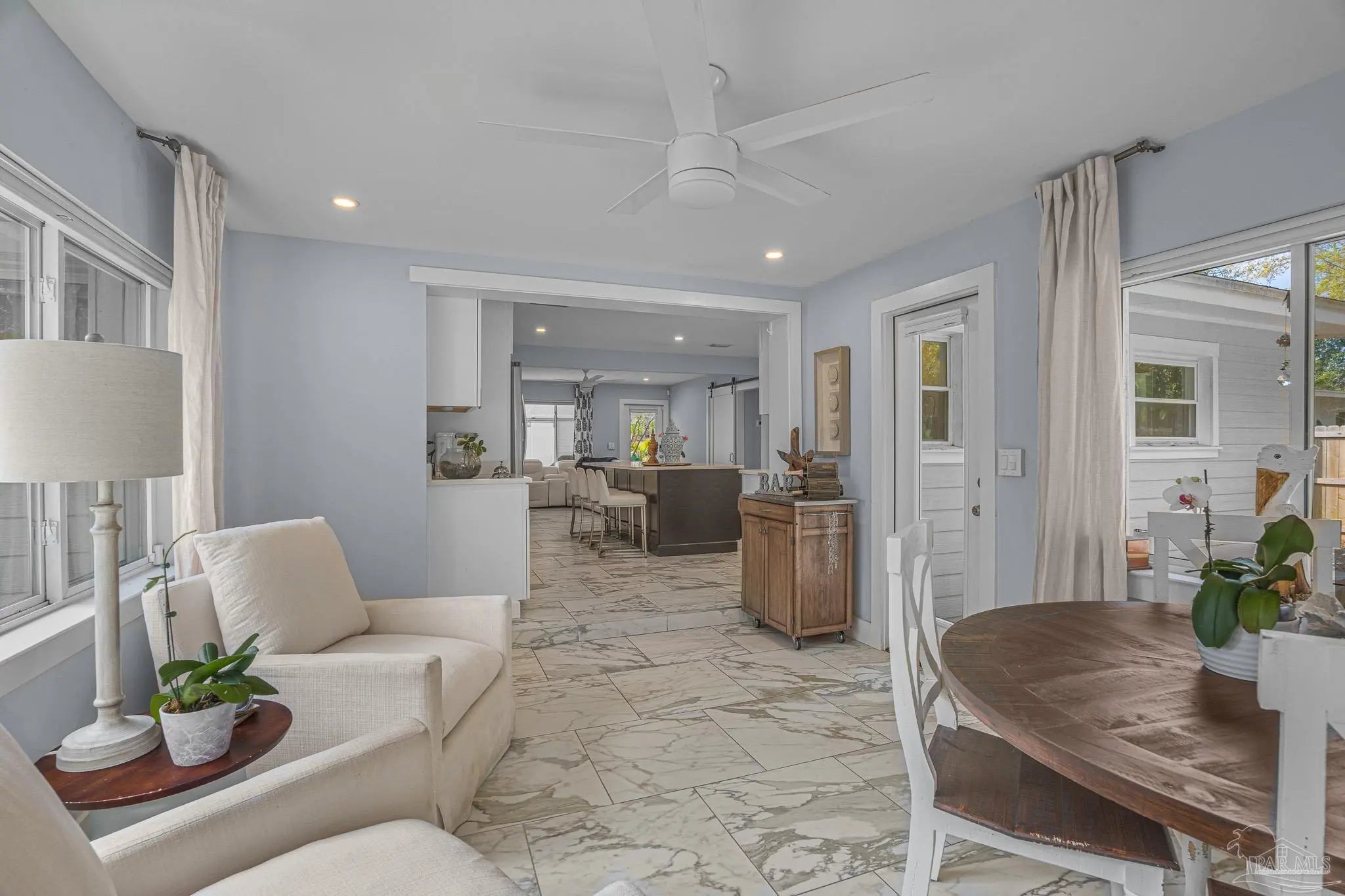 Enjoy coastal living in this well-maintained 4 bedroom, 2 bathroom ranch-style home featuring an open floor plan and tile flooring throughout for easy maintenance. The kitchen offers a center island, stainless steel appliances, and white solid wood cabinetry, flowing seamlessly into a sitting room or formal dining area filled with natural light. The primary suite includes an adjoining bathroom with a tiled walk-in shower, while the additional bedrooms provide flexibility for guests or office space. Step outside to a private patio and fully fenced backyard with extra lot space perfect for boat parking or additional storage. Conveniently located in Gulf Breeze, this property offers quick access to the white sand beaches of Pensacola Beach, nearby parks like Shoreline Park, top-rated schools, shopping, and dining, making it an ideal opportunity for full-time living or a coastal retreat.