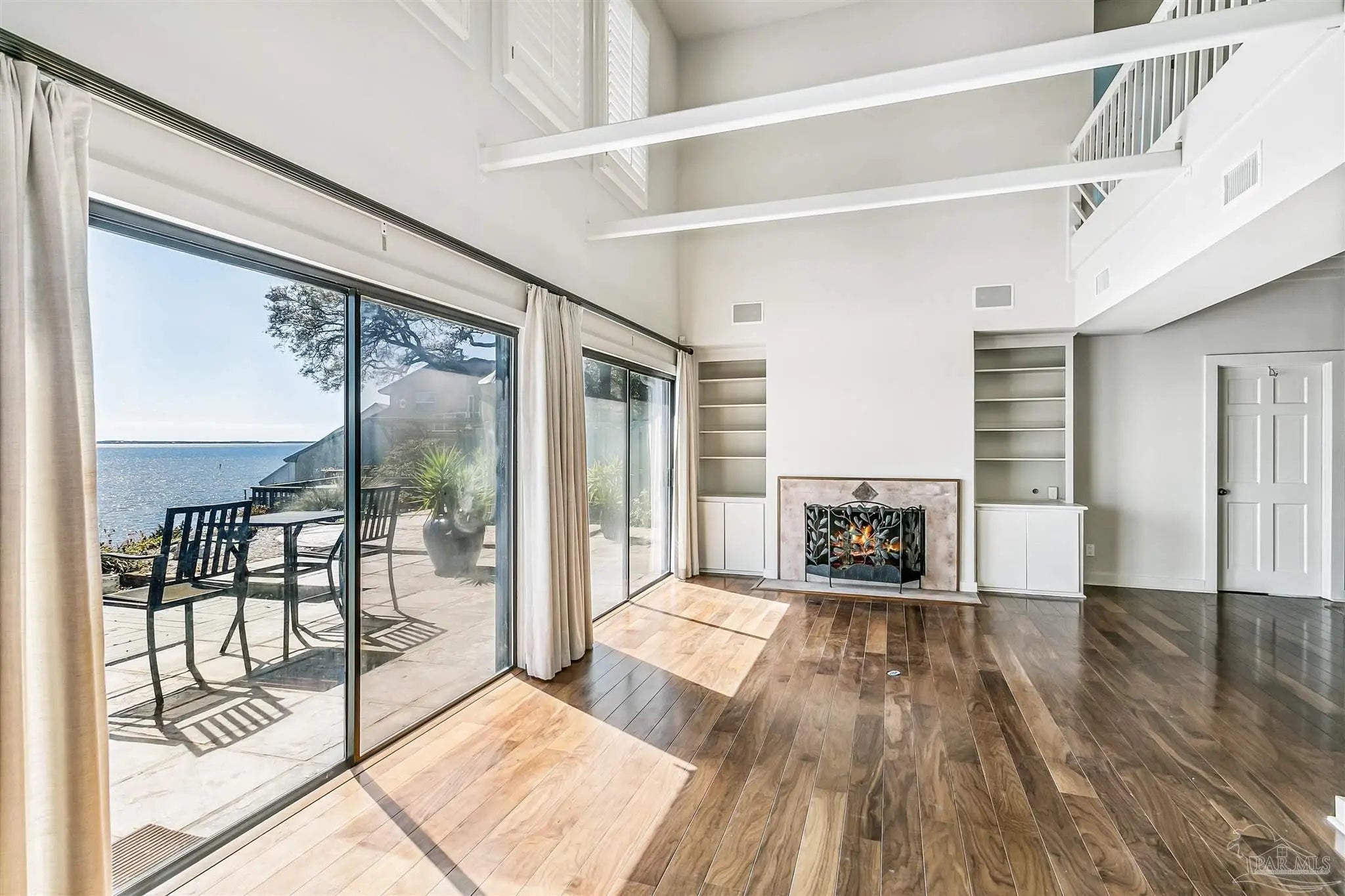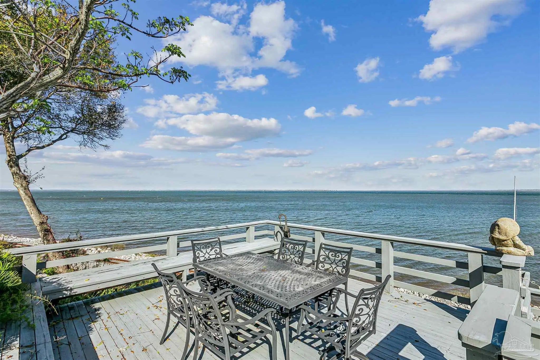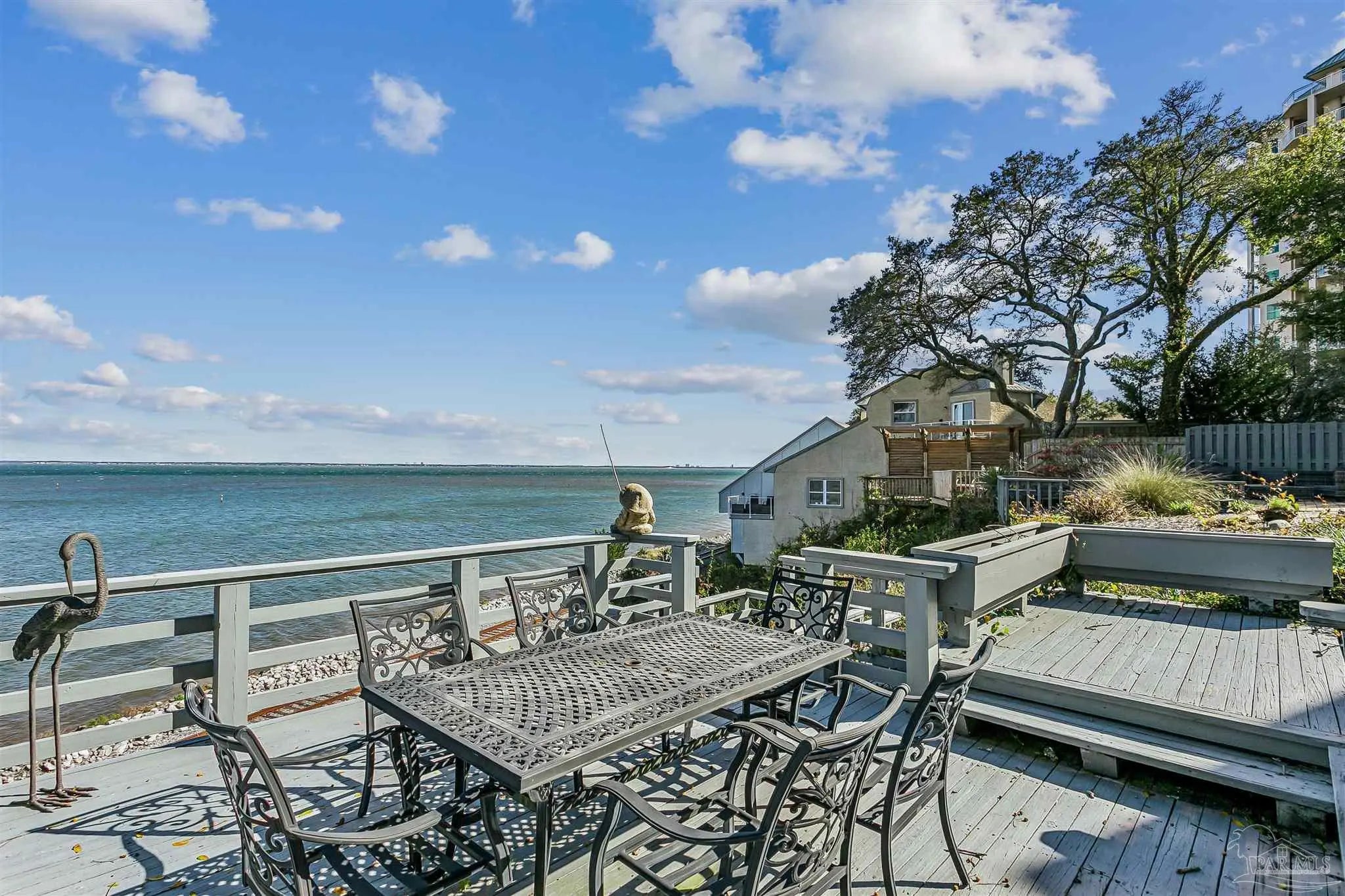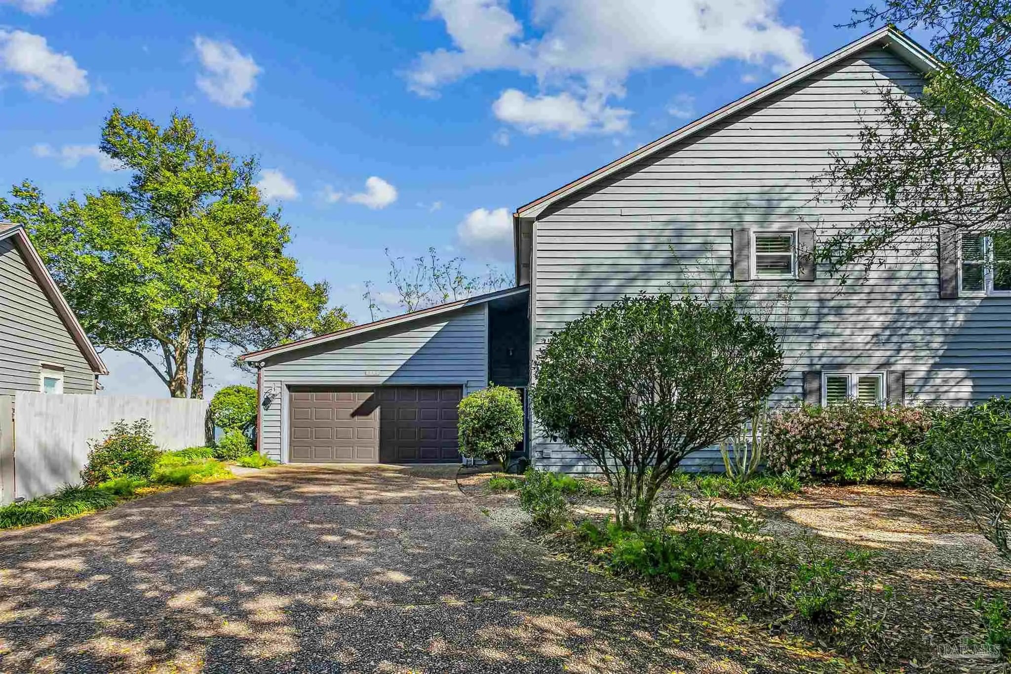 Perched high on Scenic bluff overlooking the sparkling waters of Escambia Bay, this exceptional waterfront townhome offers breathtaking, unobstructed east-facing views and unforgettable sunrises right from your own backyard. Step outside into a private outdoor retreat designed for both relaxation and entertaining. A beautifully crafted stone patio flows seamlessly into a multi-level, tiered deck, creating the perfect setting for morning coffee, sunset cocktails, or gatherings with a stunning coastal backdrop. The elevated position provides both privacy and panoramic vistas—delivering true waterfront living without compromise. Inside, the home blends comfort and flexibility with thoughtful design. Rich hardwood floors span the main level, where a spacious primary suite offers convenience and a beautifully updated bath. The open-concept upper level overlooks the main living area and connects two additional bedrooms along with a versatile flex space—ideal for a home office, studio, or guest accommodations. Additional highlights include two full bathrooms, a welcoming wet bar near the entry (with potential to convert back to a half bath), a two-car garage, and an attached workshop with windows—perfect for hobbies or extra storage. With its smart layout, low-maintenance lifestyle, and unmatched waterfront setting, this home is a rare opportunity to enjoy elevated coastal living on Escambia Bay. Your private waterfront escape awaits.