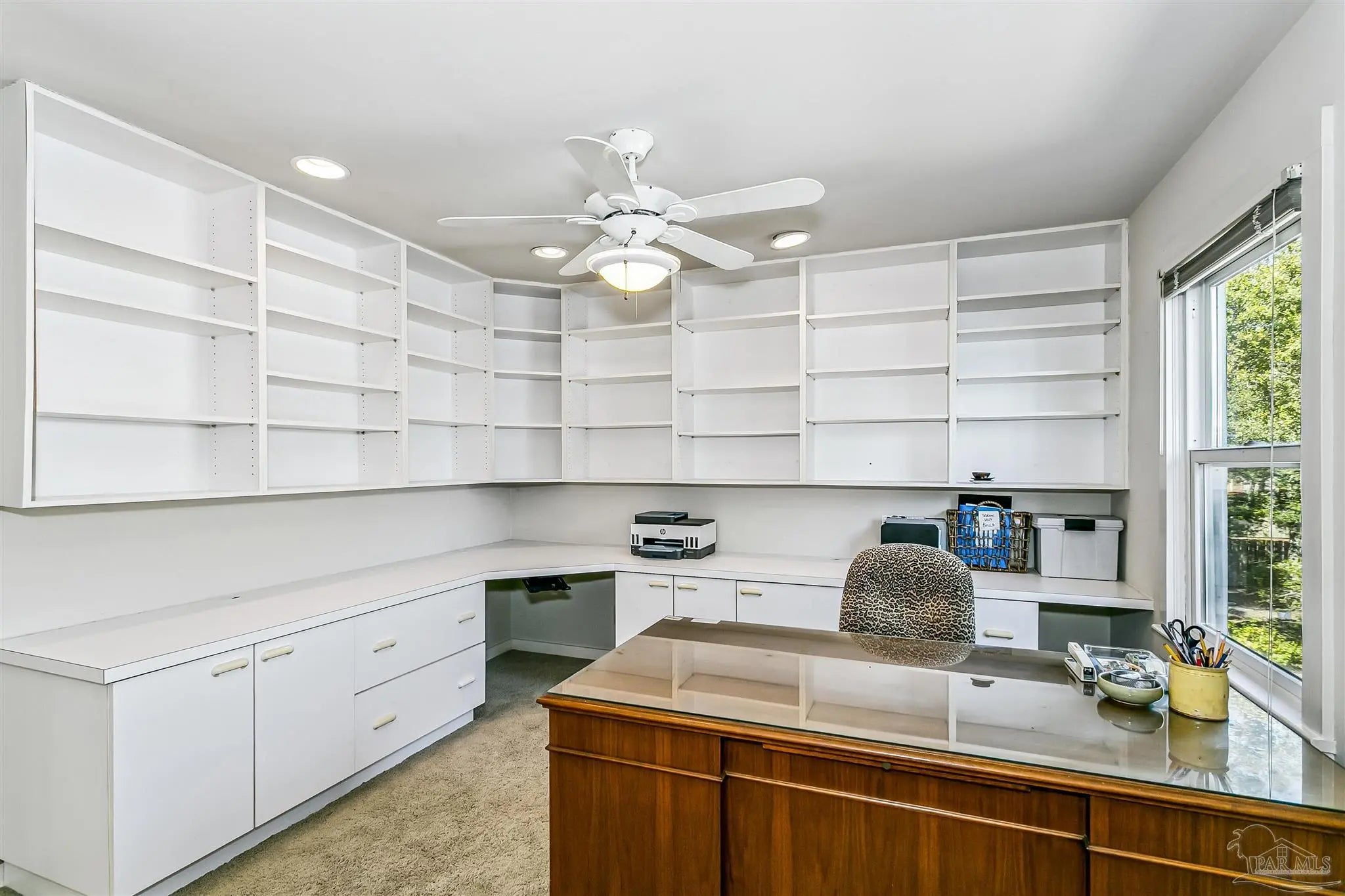 - Baseboards, Bookcases, Ceiling Fan(s), High Ceilings, Recessed Lighting, Office/Study