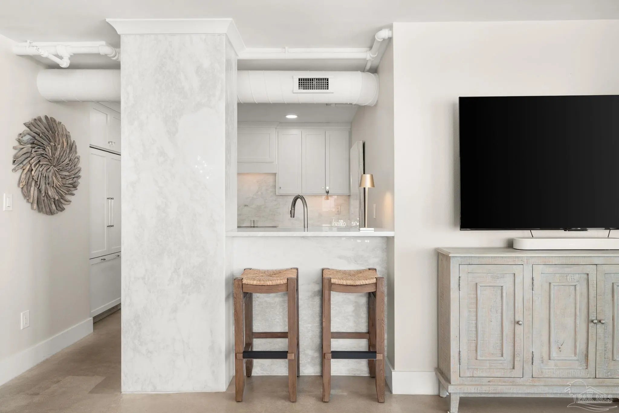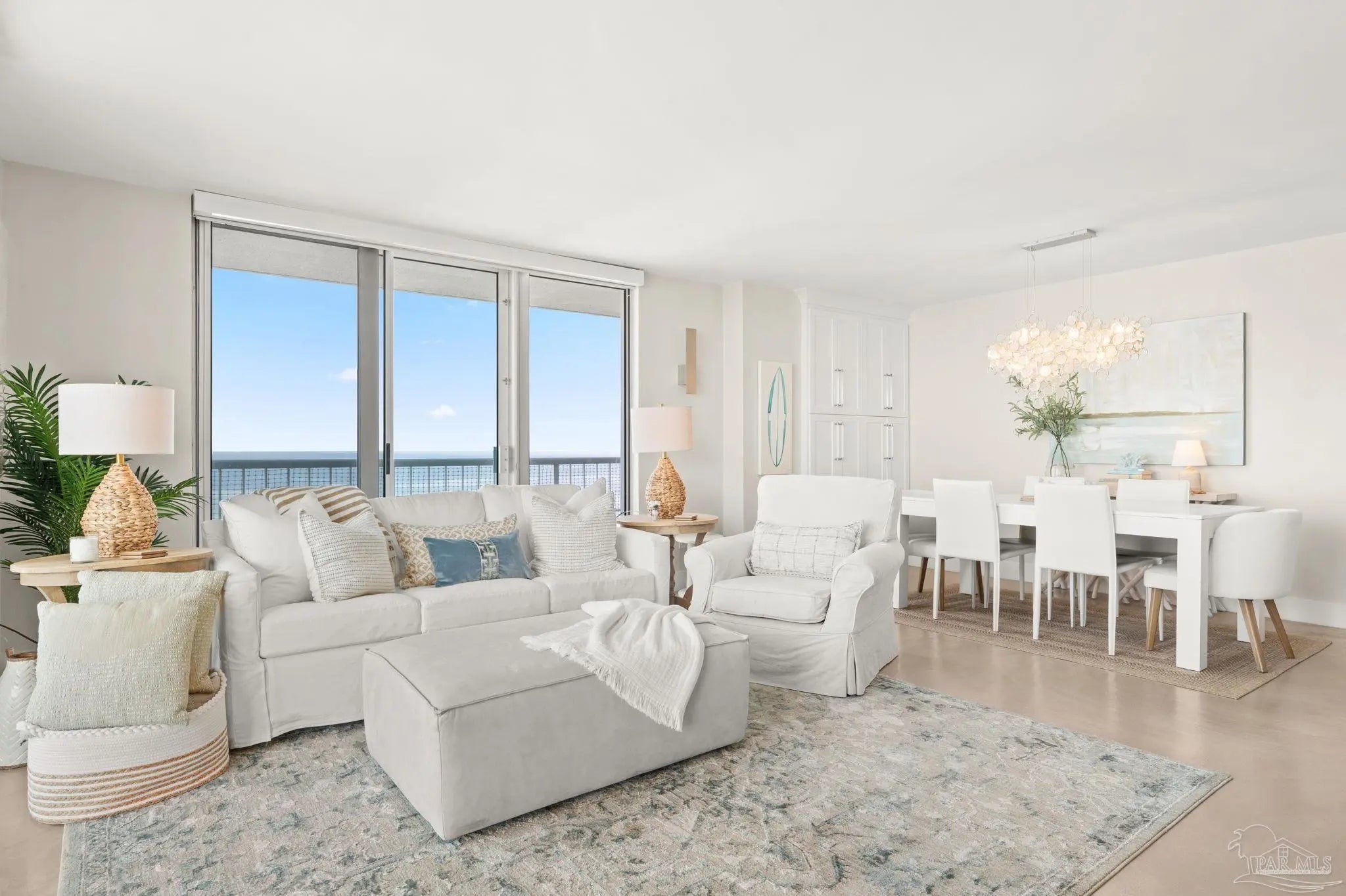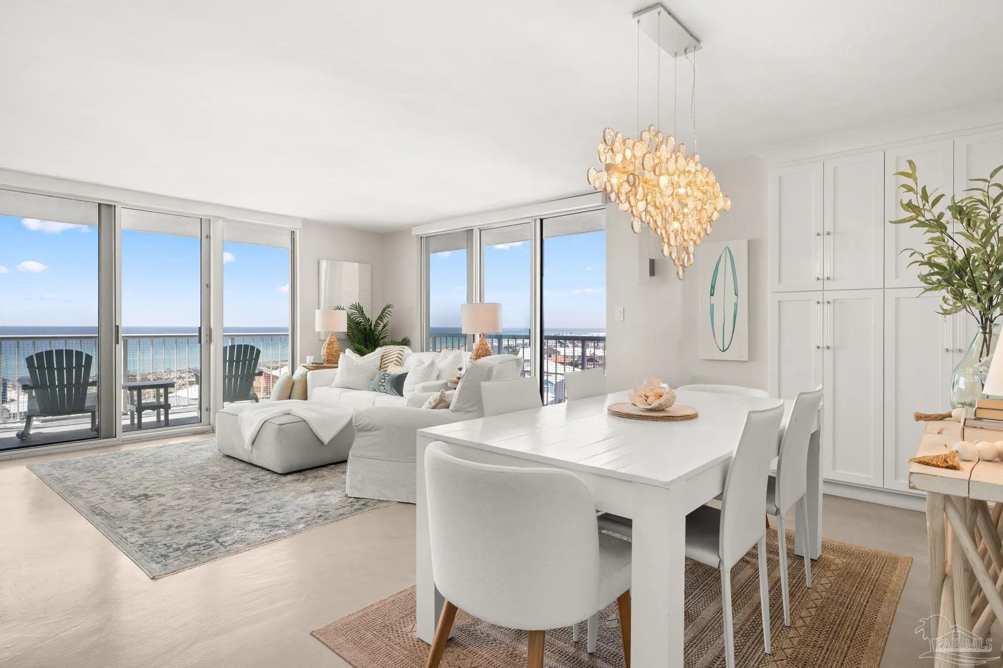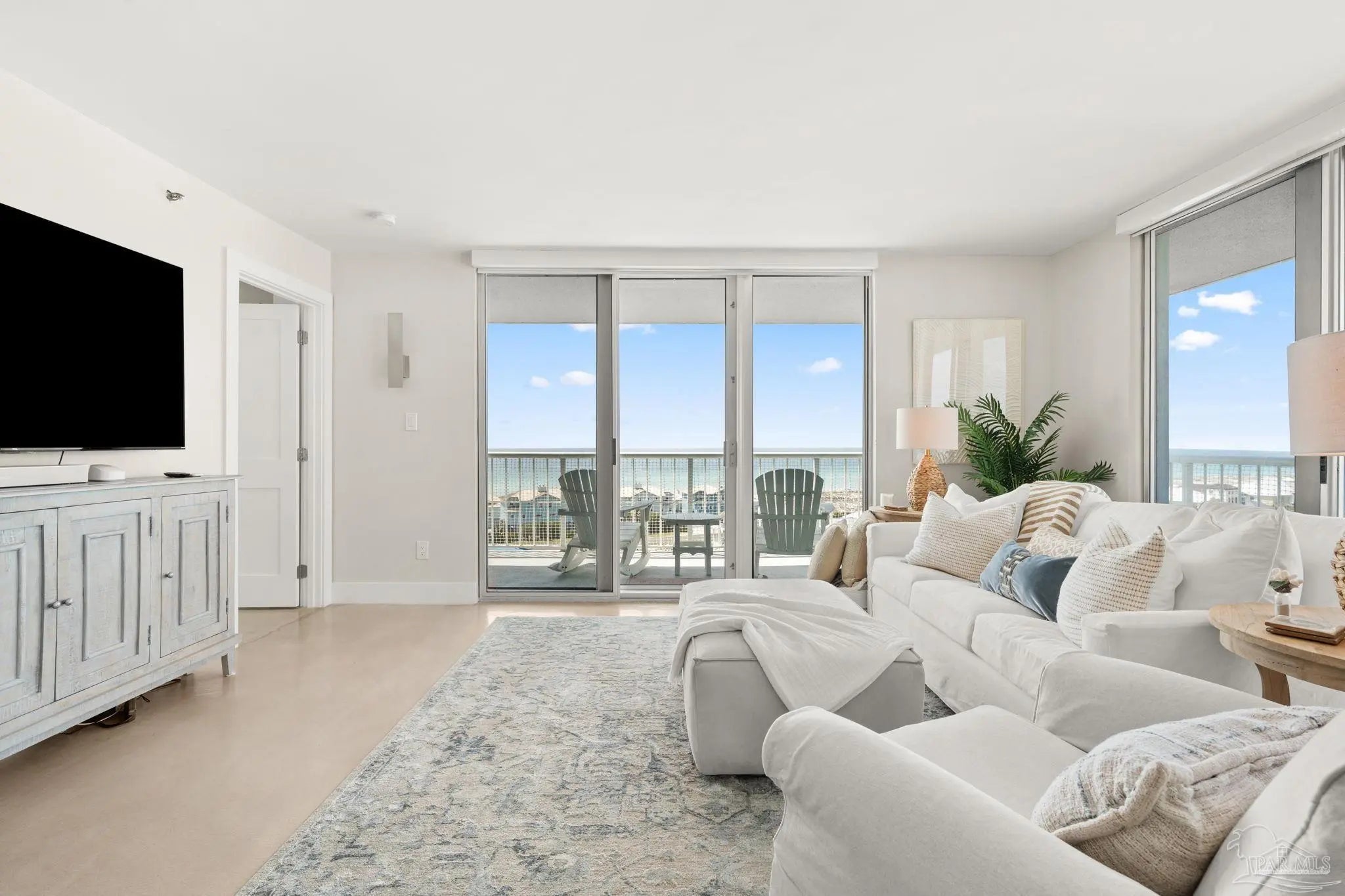 Perched high above Pensacola Beach, this fully renovated west-facing residence captures sweeping, unobstructed views of the Gulf, Intracoastal Waterway, and Santa Rosa Sound—delivering true sunrise-to-sunset water panoramas from every room. Extensively remodeled in 2021, the interior features a clean coastal design with custom shaker cabinetry, marble countertops and accents, and seamless concrete flooring throughout. The kitchen has been thoughtfully reconfigured to maximize sightlines to the water, creating a strong visual connection between living space and exterior views. Both bathrooms are updated with custom cabinetry and marble finishes, including a walk-in shower in the primary suite and a tub/shower combination in the guest bath. The primary suite offers dual closets and direct balcony access, while expansive glass sliders in multiple rooms frame the water views and enhance natural light. A spacious private balcony serves as an outdoor living extension—ideal for capturing Gulf breezes, overlooking the sound-side docks, and enjoying year-round sunsets. Located within a gated waterfront community, amenities include an Olympic-sized pool, tennis courts, sound-front beach access, and proximity to Gulf beaches just across the street. Additional features include impact-resistant windows, in-unit laundry, and dedicated storage. A rare opportunity to acquire a fully updated, view-driven residence in one of Pensacola Beach’s most established condominium communities.