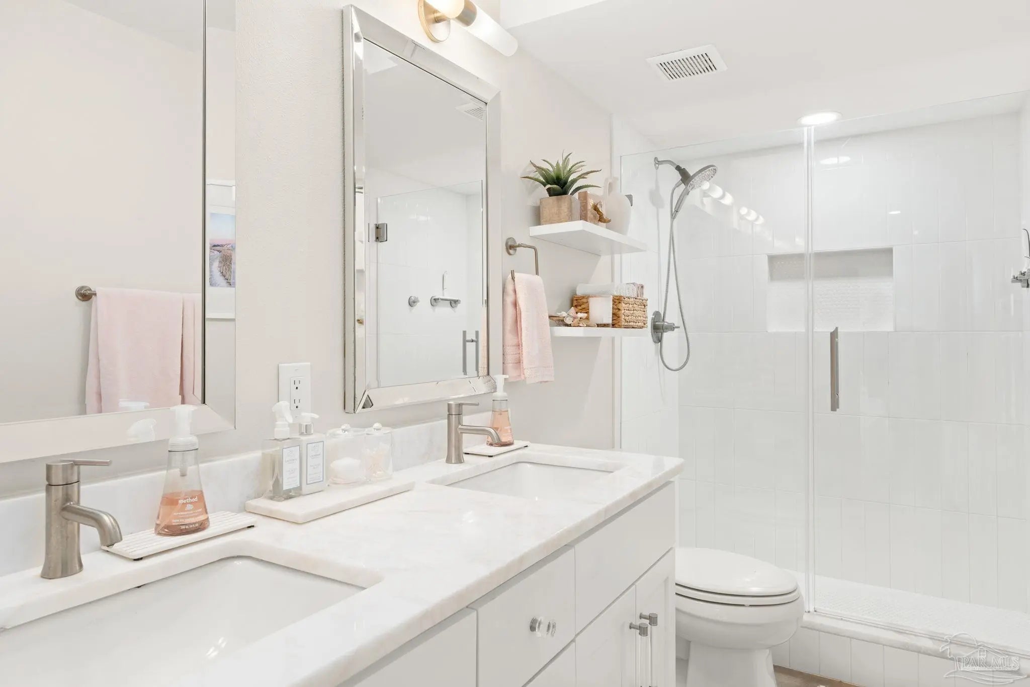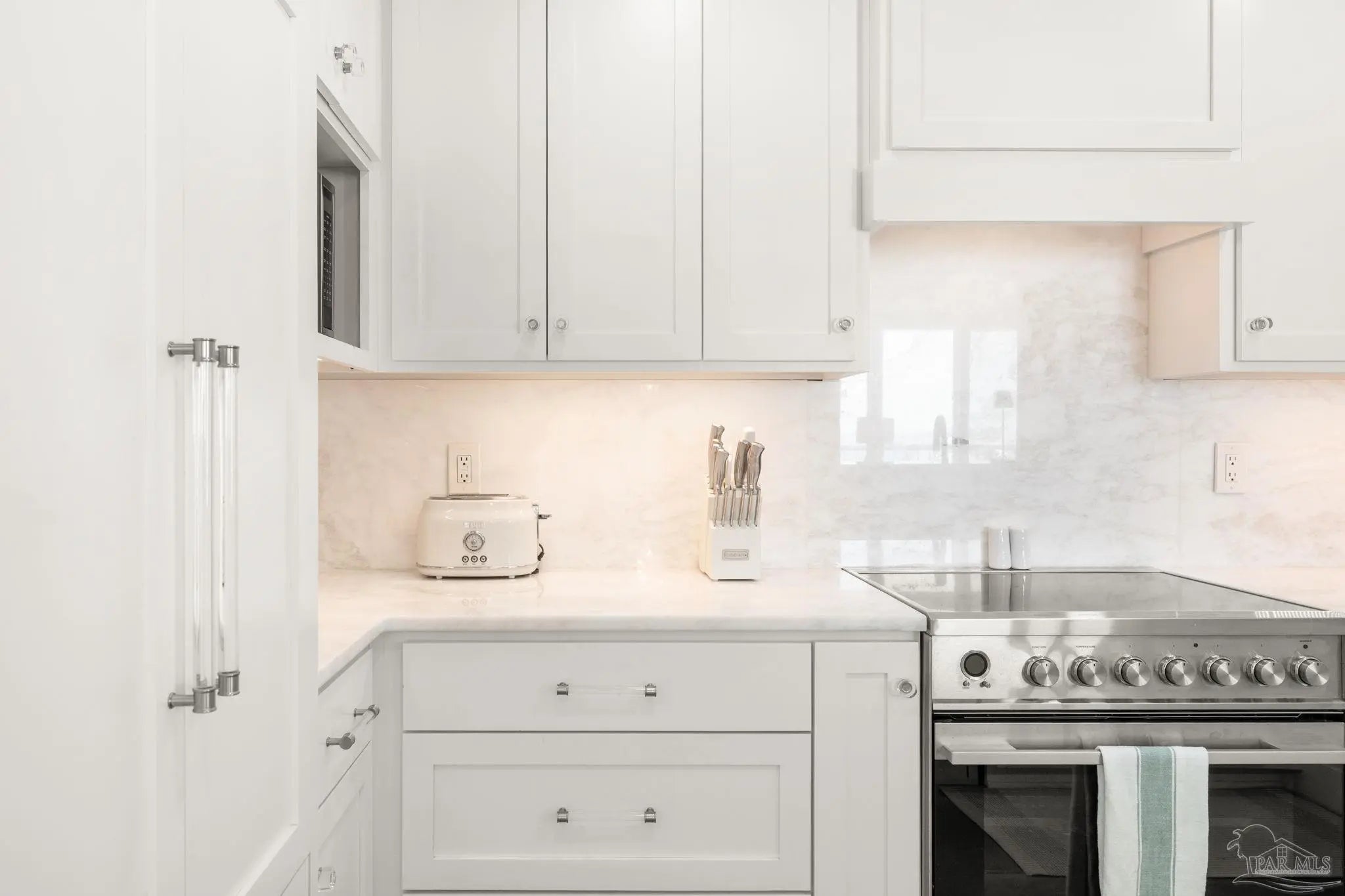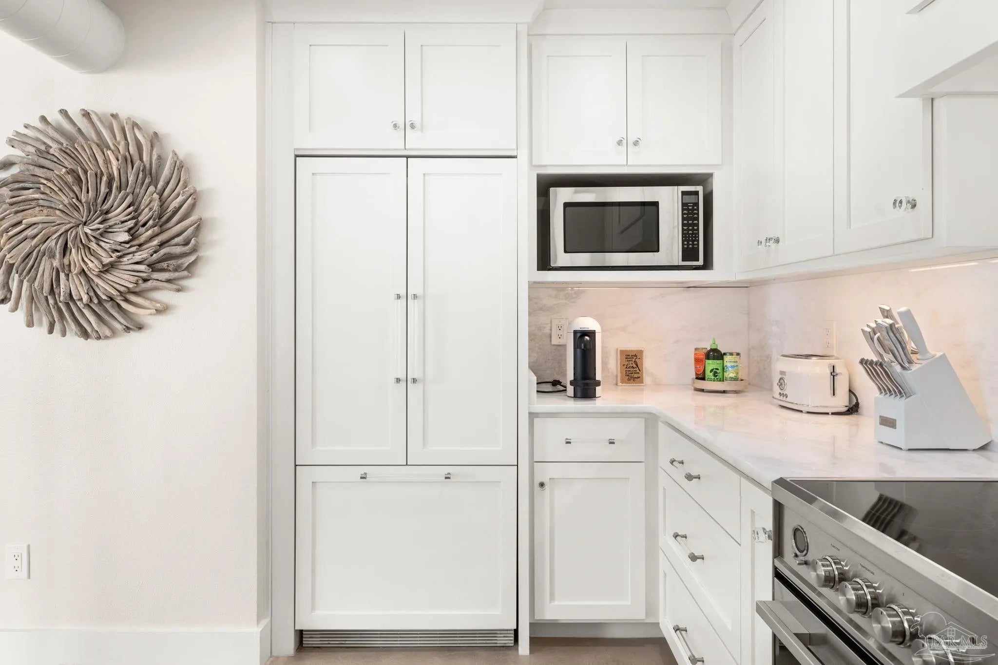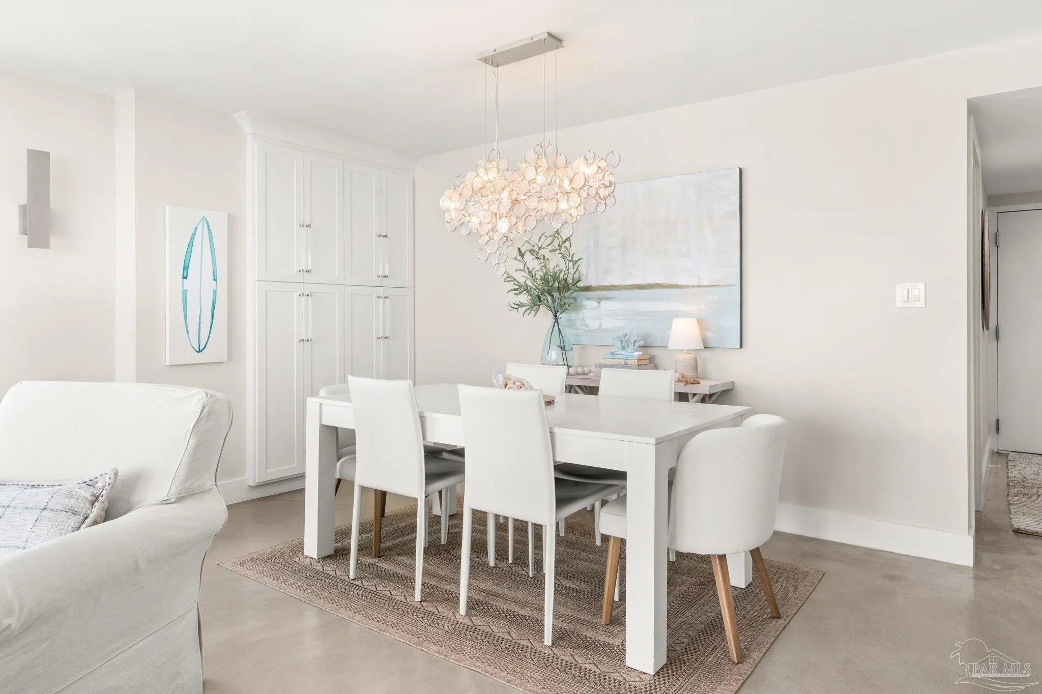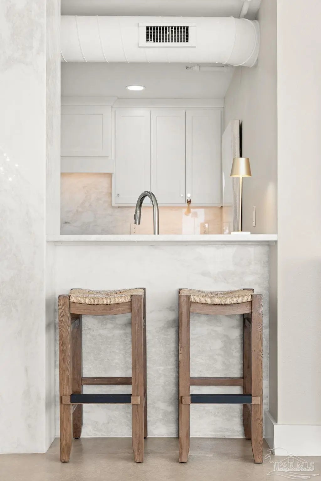 Perched high above Pensacola Beach, this fully renovated west-facing residence captures sweeping, unobstructed views of the Gulf, Intracoastal Waterway, and Santa Rosa Sound—delivering true sunrise-to-sunset water panoramas from every room. Extensively remodeled in 2021, the interior features a clean coastal design with custom shaker cabinetry, marble countertops and accents, and seamless concrete flooring throughout. The kitchen has been thoughtfully reconfigured to maximize sightlines to the water, creating a strong visual connection between living space and exterior views. Both bathrooms are updated with custom cabinetry and marble finishes, including a walk-in shower in the primary suite and a tub/shower combination in the guest bath. The primary suite offers dual closets and direct balcony access, while expansive glass sliders in multiple rooms frame the water views and enhance natural light. A spacious private balcony serves as an outdoor living extension—ideal for capturing Gulf breezes, overlooking the sound-side docks, and enjoying year-round sunsets. Located within a gated waterfront community, amenities include an Olympic-sized pool, tennis courts, sound-front beach access, and proximity to Gulf beaches just across the street. Additional features include impact-resistant windows, in-unit laundry, and dedicated storage. A rare opportunity to acquire a fully updated, view-driven residence in one of Pensacola Beach’s most established condominium communities.