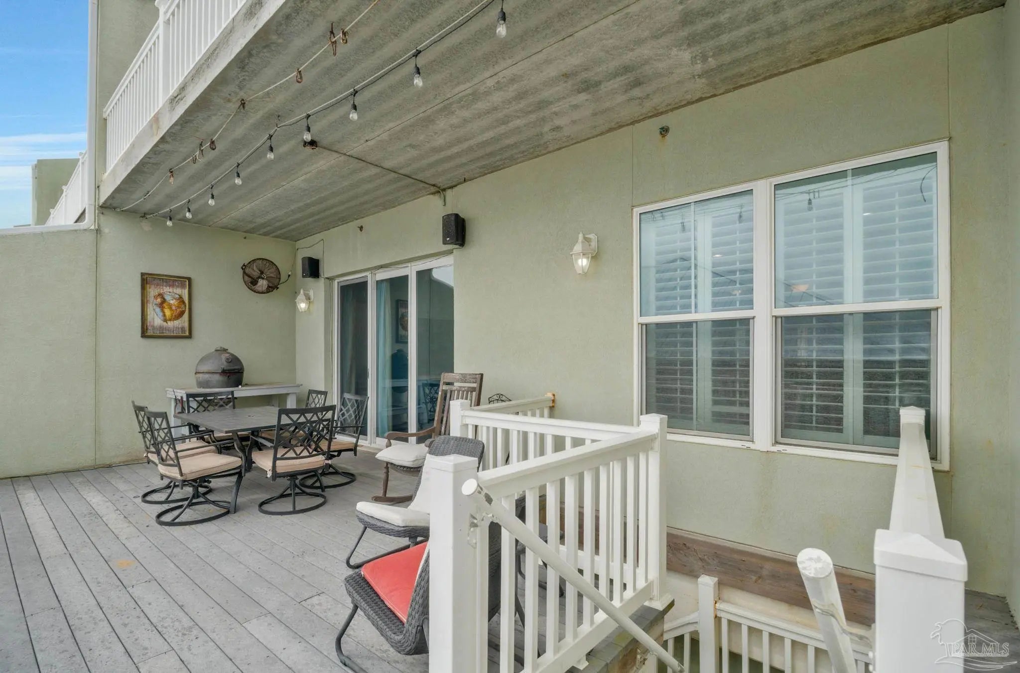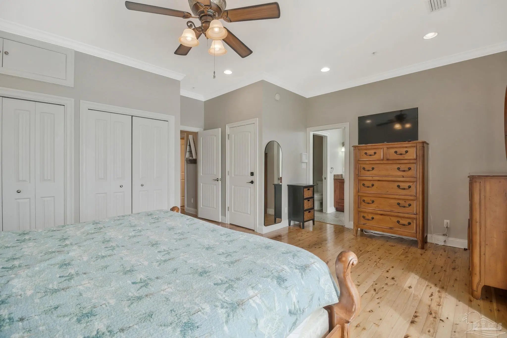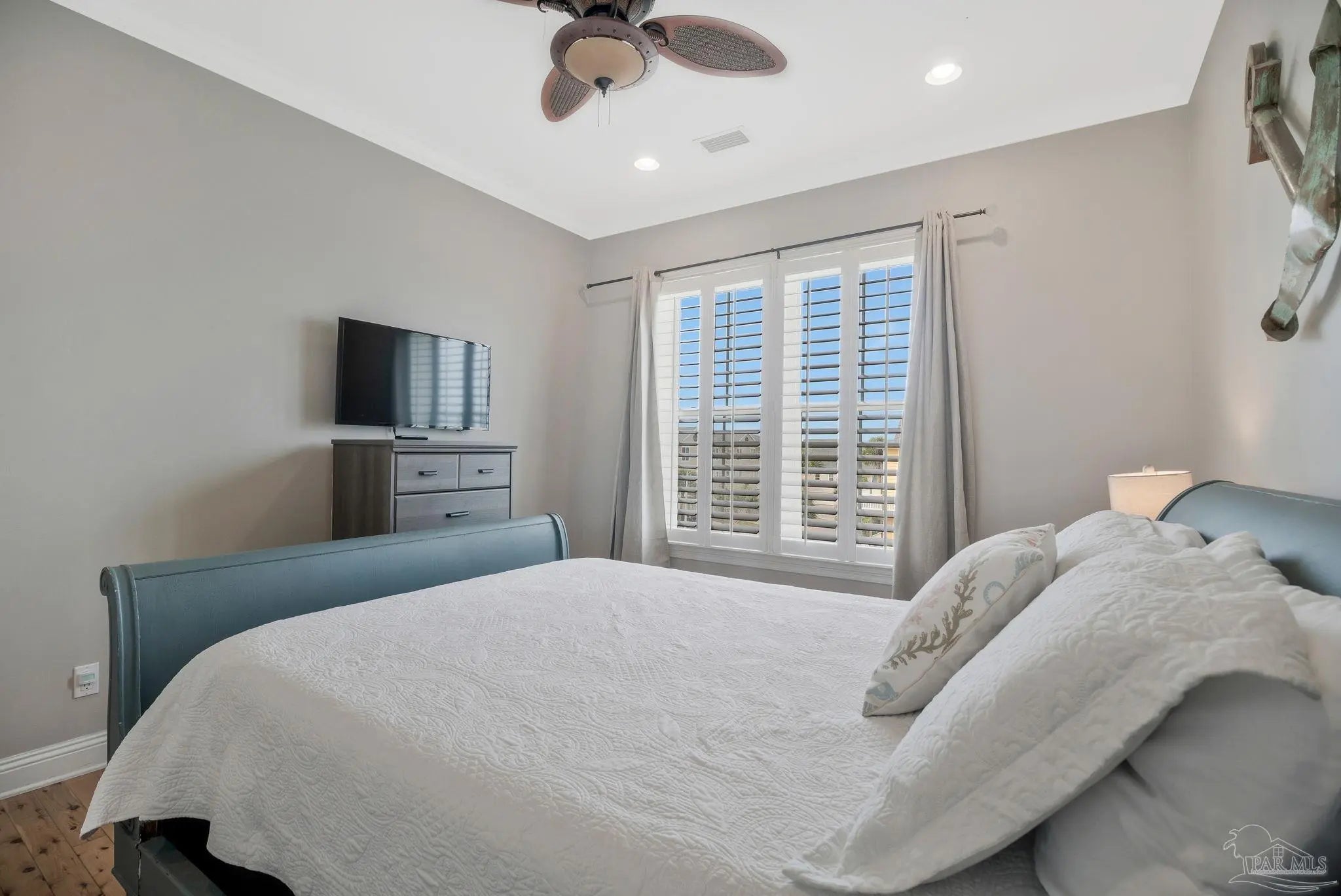 Just steps away from the white sandy beaches of the Gulf, this rare 3-story end-unit townhome on Pensacola Beach offers exceptional space, views, and coastal living. Featuring 4 bedrooms, 3 bathrooms, and an oversized 4+ car garage, this property provides ample room for vehicles, jet skis, golf carts, and beach gear. The main living level includes a spacious guest bedroom, full bathroom, large laundry room, and an open-concept kitchen/living/dining area. The kitchen features mahogany-tone cabinetry, granite countertops, tile backsplash, and stainless steel appliances. A triple-sliding storm door opens to a private balcony with beautiful water views. Australian Cypress hardwood floors and abundant natural light create a warm, inviting atmosphere. The top floor is home to the private master suite with recessed lighting, crown molding, ceiling fan, and its own balcony perfect for sunrise and moonrise views. The master bathroom includes a double vanity, separate shower, and soaking tub. Two additional guest bedrooms on this level feature crown molding, ceiling fans, and plantation shutters, along with a well-appointed guest bathroom with a private commode and shower/tub area. This spacious, well-designed townhome offers comfort, style, and an unbeatable beachside location.