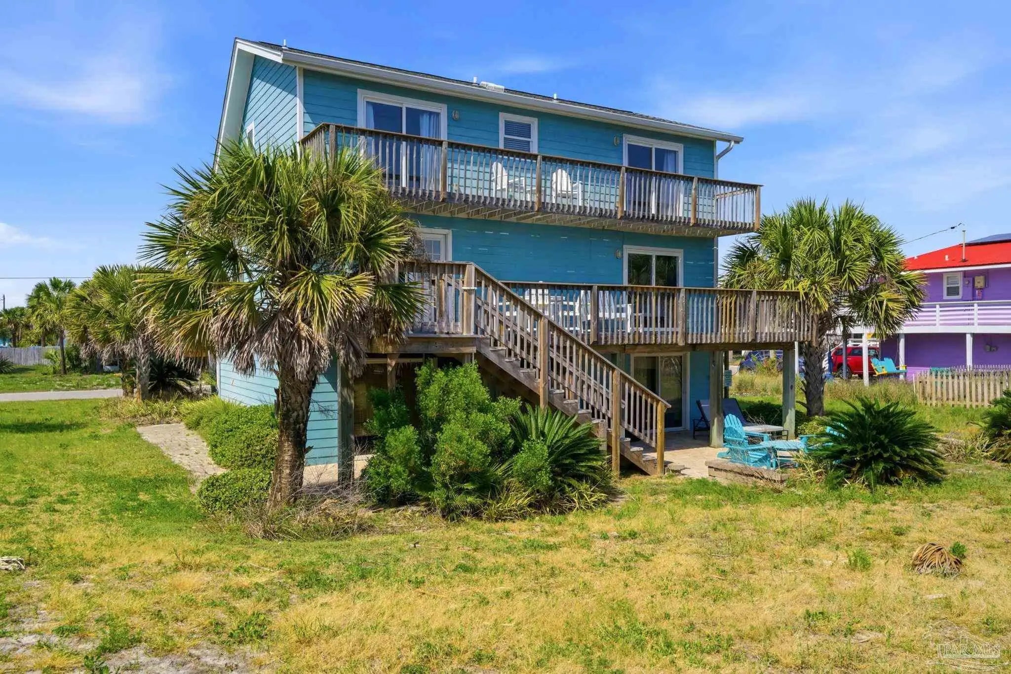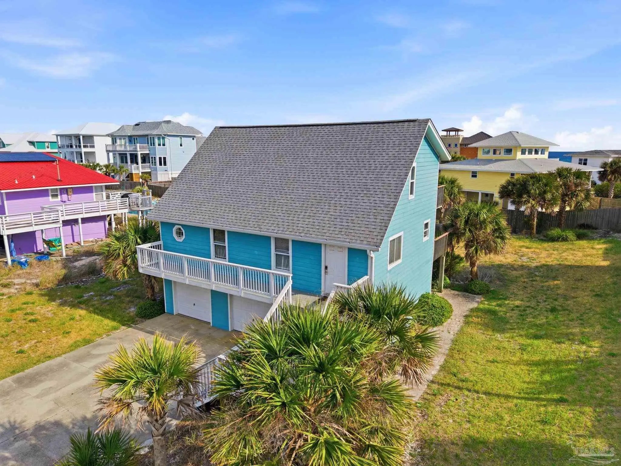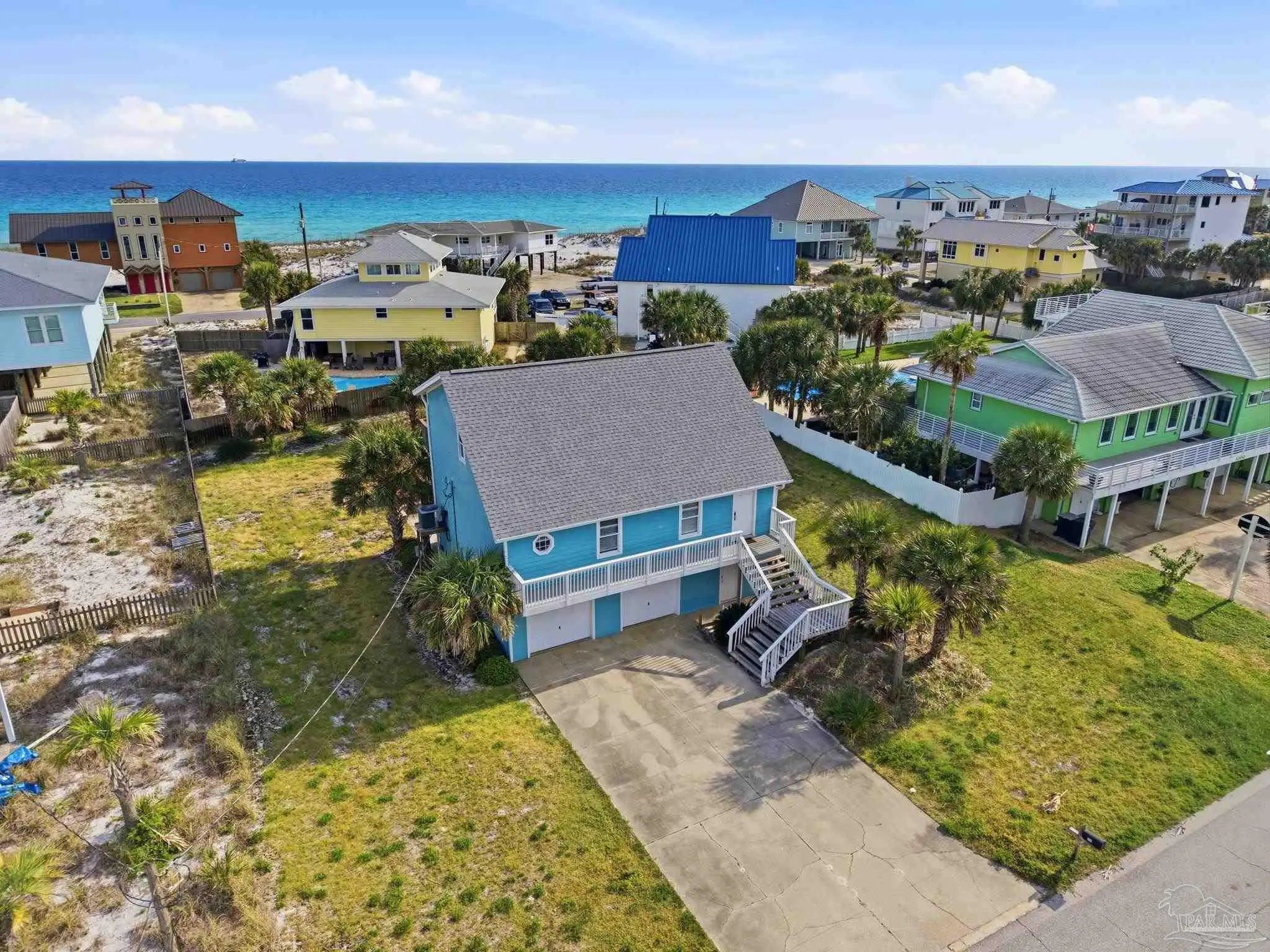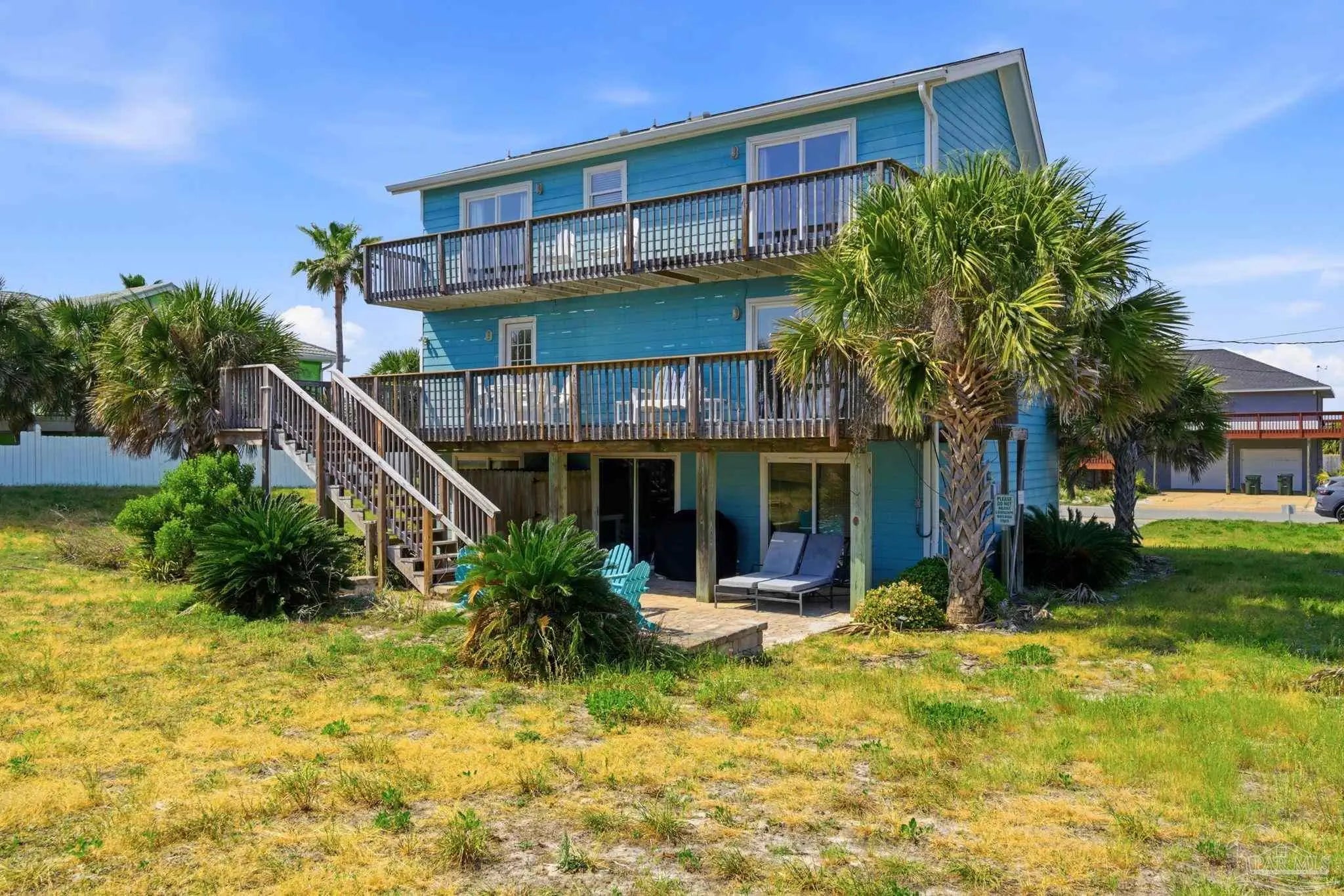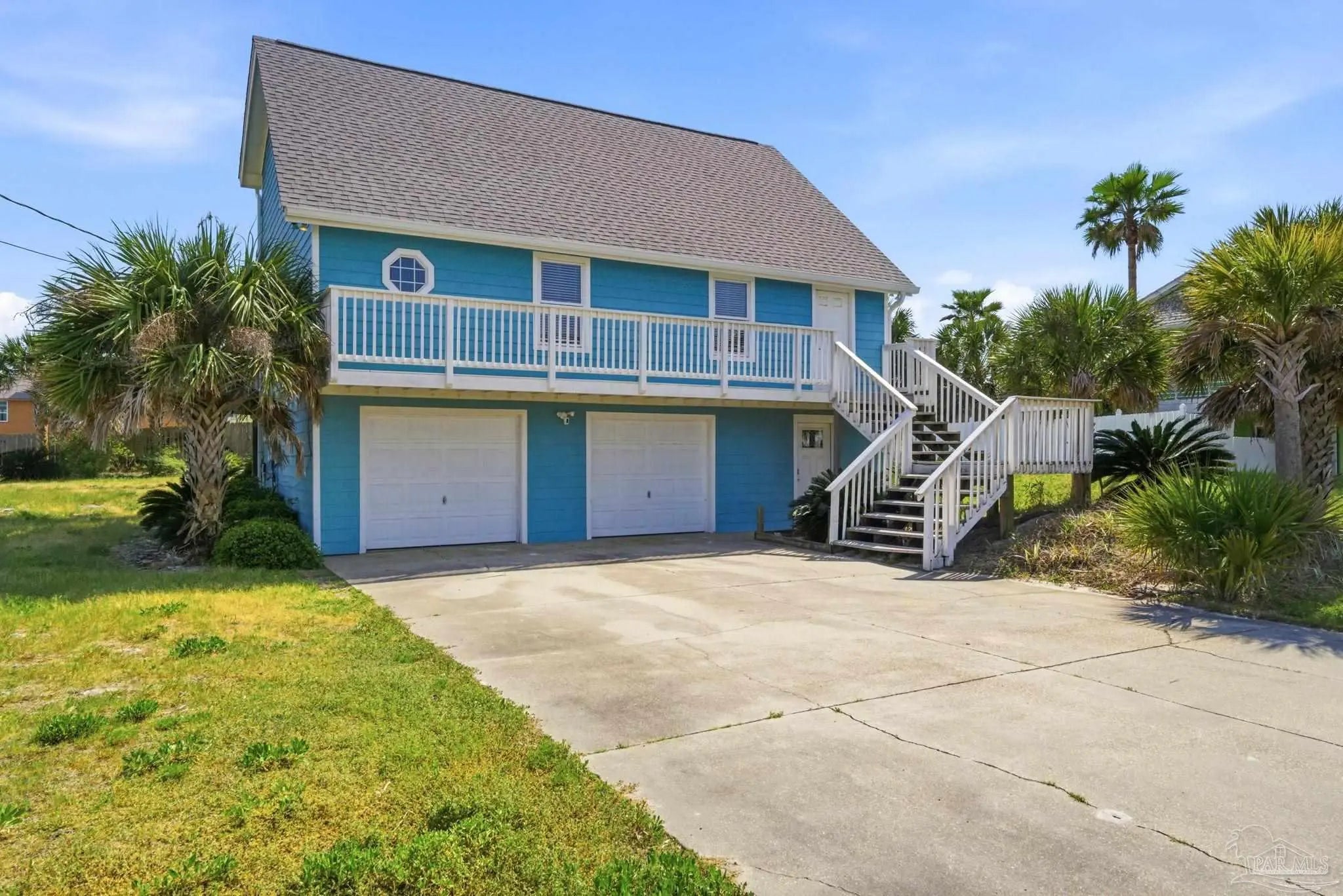 Coastal living at its best on Pensacola Beach, Gulf views, and just one block to the sand set the tone for this relaxed, beachside retreat. Full of classic coastal character, this home offers an easy, open layout designed for both everyday living and laid-back entertaining. The main level features a bright open-concept living, dining, and kitchen area with tile flooring throughout and a modern kitchen with stainless steel appliances. The primary suite is conveniently located on the main floor, complete with a private bath and direct access to the balcony, perfect for enjoying morning coffee with a coastal breeze. Upstairs, two additional bedrooms are connected by a Jack-and-Jill bathroom, and each opens onto a private upper deck, creating the perfect space to unwind after a day at the beach. Outdoor living truly shines with full-length balconies on both levels, offering inviting spaces to take in the views and coastal air. The oversized lot provides room for a future pool, while the backyard is ideal for gatherings, cookouts, and easy beach living. Additional highlights include an oversized two-car garage with plenty of space for beach gear, bikes, and extra storage, or the potential to create additional recreational space. Centrally located on Pensacola Beach with convenient access to dining, shopping, and local attractions, this property is well-suited as a primary residence, second home, or investment opportunity.