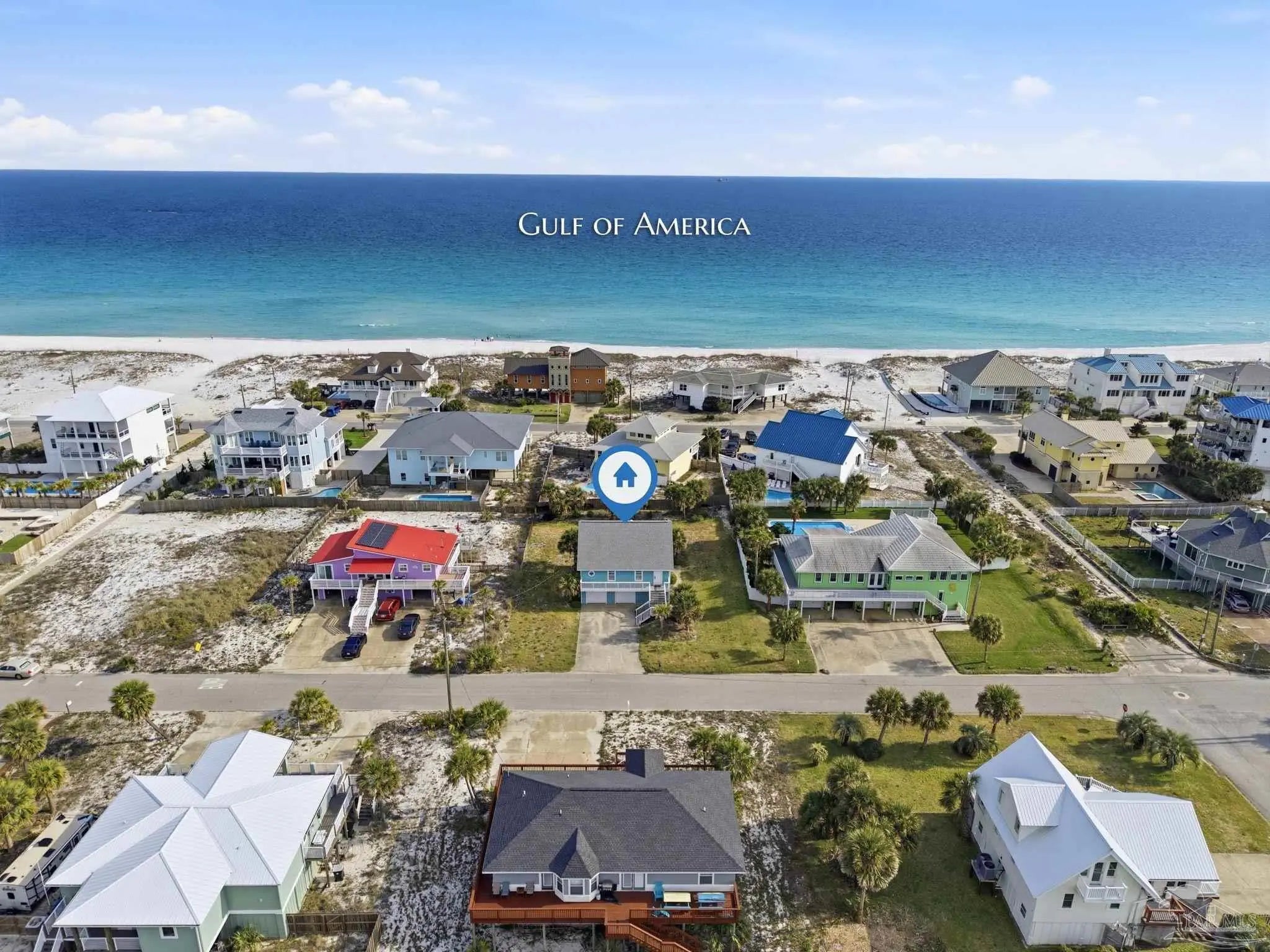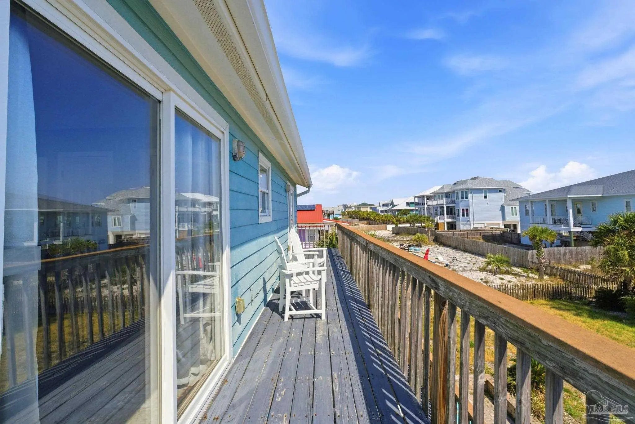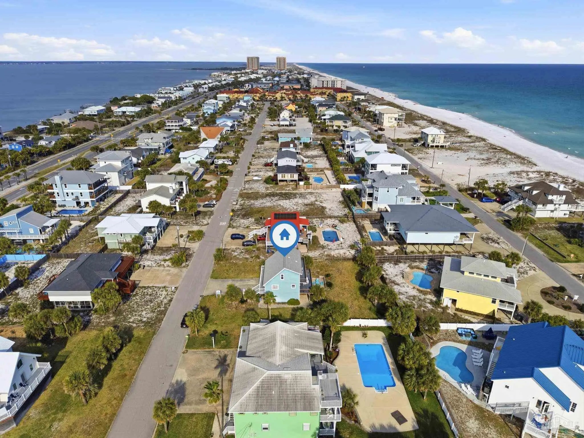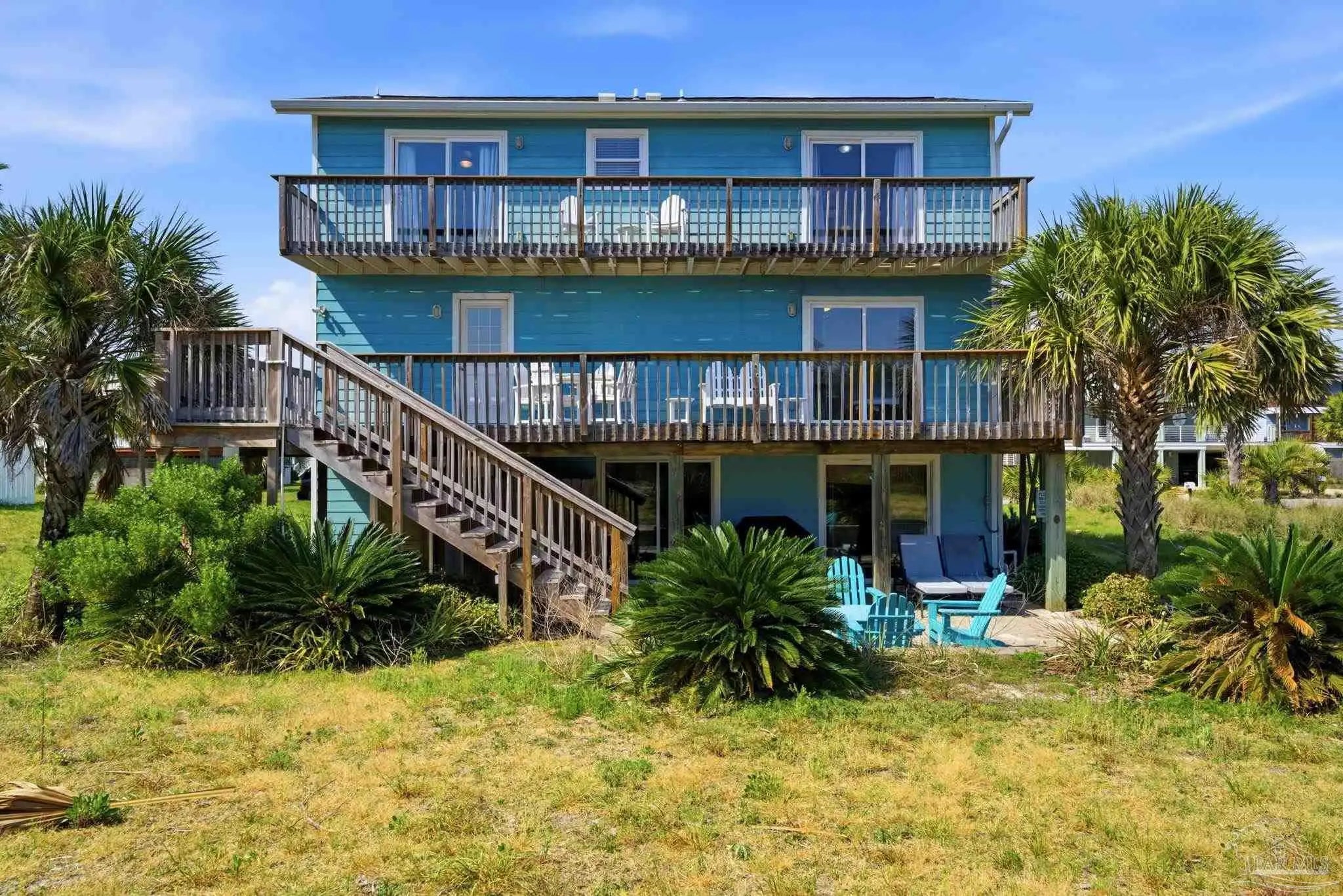 Coastal living at its best on Pensacola Beach, Gulf views, and just one block to the sand set the tone for this relaxed, beachside retreat. Full of classic coastal character, this home offers an easy, open layout designed for both everyday living and laid-back entertaining. The main level features a bright open-concept living, dining, and kitchen area with tile flooring throughout and a modern kitchen with stainless steel appliances. The primary suite is conveniently located on the main floor, complete with a private bath and direct access to the balcony, perfect for enjoying morning coffee with a coastal breeze. Upstairs, two additional bedrooms are connected by a Jack-and-Jill bathroom, and each opens onto a private upper deck, creating the perfect space to unwind after a day at the beach. Outdoor living truly shines with full-length balconies on both levels, offering inviting spaces to take in the views and coastal air. The oversized lot provides room for a future pool, while the backyard is ideal for gatherings, cookouts, and easy beach living. Additional highlights include an oversized two-car garage with plenty of space for beach gear, bikes, and extra storage, or the potential to create additional recreational space. Centrally located on Pensacola Beach with convenient access to dining, shopping, and local attractions, this property is well-suited as a primary residence, second home, or investment opportunity.