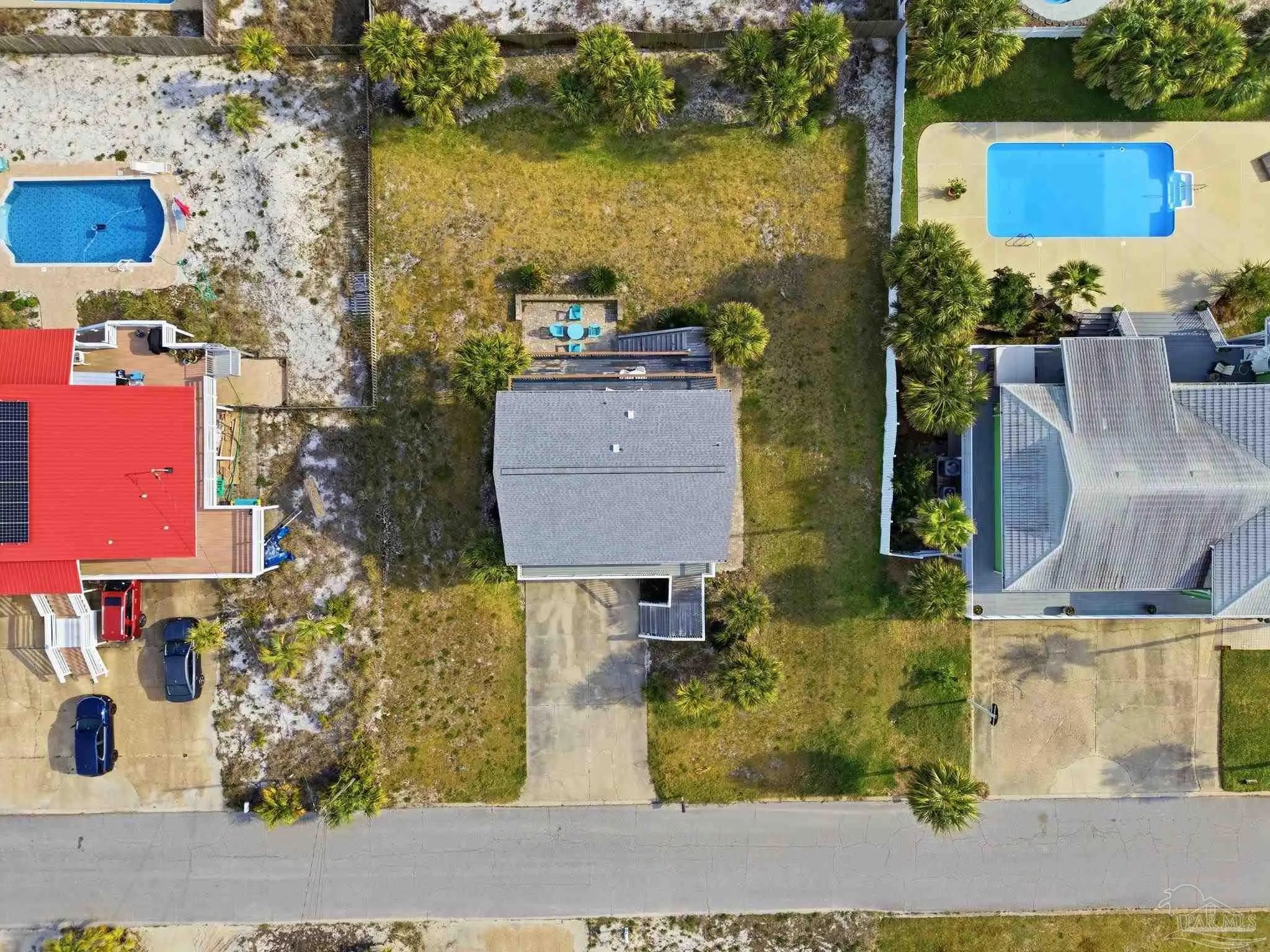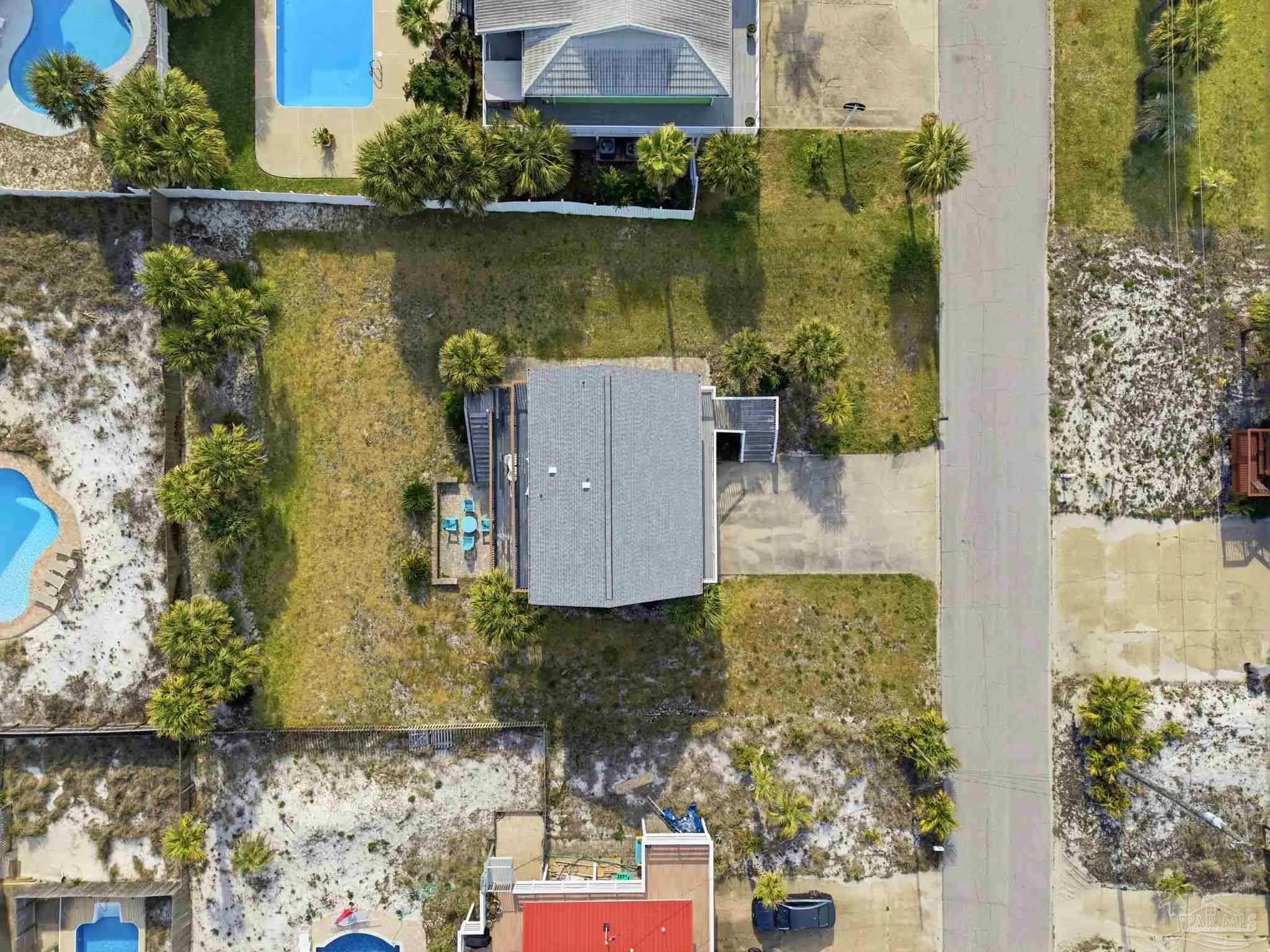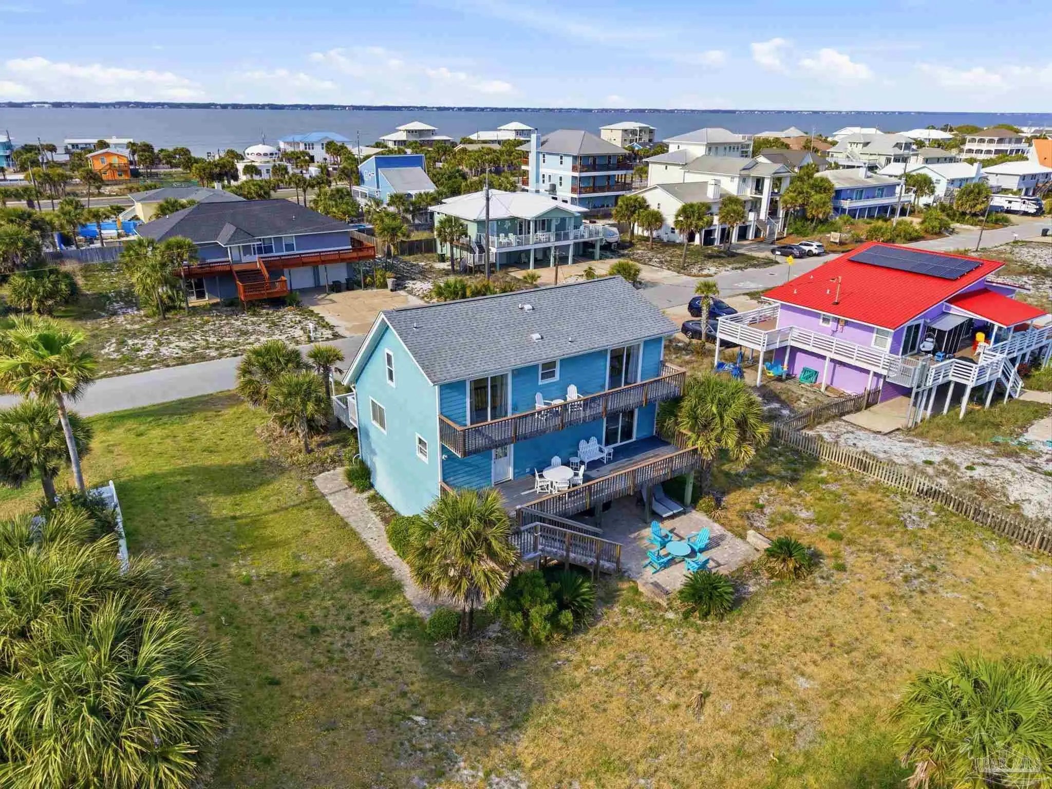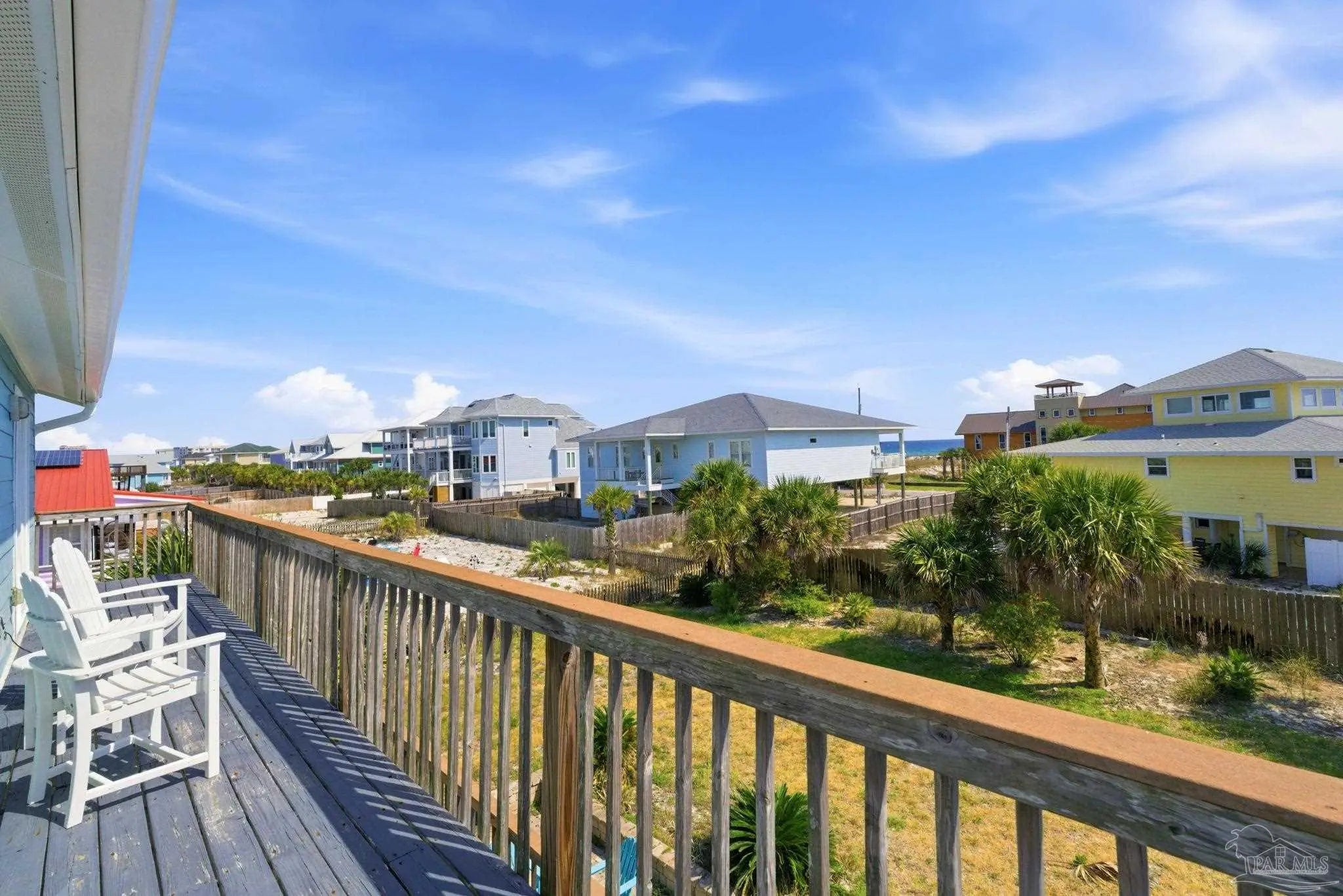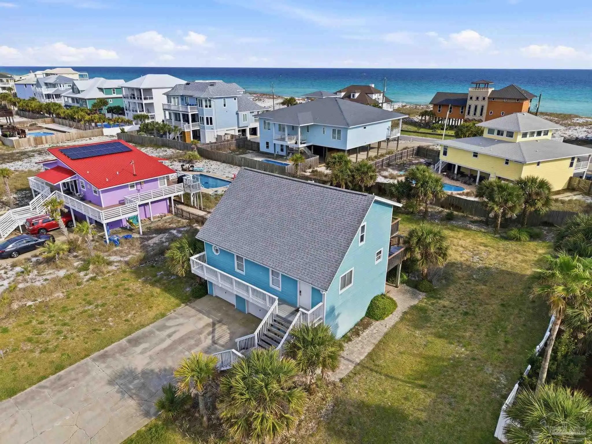Coastal living at its best on Pensacola Beach, Gulf views, and just one block to the sand set the tone for this relaxed, beachside retreat. Full of classic coastal character, this home offers an easy, open layout designed for both everyday living and laid-back entertaining. The main level features a bright open-concept living, dining, and kitchen area with tile flooring throughout and a modern kitchen with stainless steel appliances. The primary suite is conveniently located on the main floor, complete with a private bath and direct access to the balcony, perfect for enjoying morning coffee with a coastal breeze. Upstairs, two additional bedrooms are connected by a Jack-and-Jill bathroom, and each opens onto a private upper deck, creating the perfect space to unwind after a day at the beach. Outdoor living truly shines with full-length balconies on both levels, offering inviting spaces to take in the views and coastal air. The oversized lot provides room for a future pool, while the backyard is ideal for gatherings, cookouts, and easy beach living. Additional highlights include an oversized two-car garage with plenty of space for beach gear, bikes, and extra storage, or the potential to create additional recreational space. Centrally located on Pensacola Beach with convenient access to dining, shopping, and local attractions, this property is well-suited as a primary residence, second home, or investment opportunity.