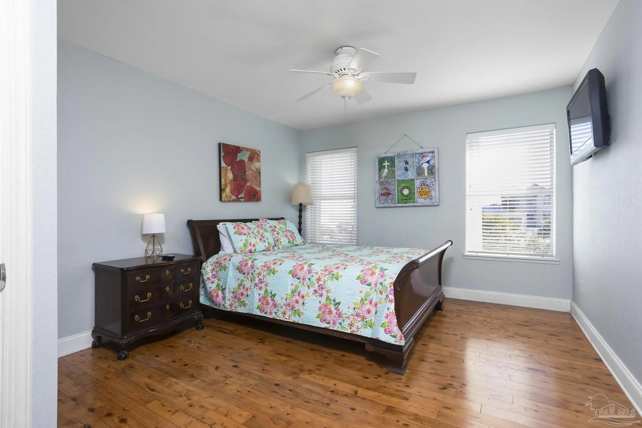 This beautiful five-bedroom home sits just one short block from the beach, on an adjacent easement. The main level includes the living room, kitchen, breakfast bar that seats seven, an eat-in kitchen area that seats eight, a half bath, a bedroom with double bunks and full bath and primary suite with primary bath. Also on the main level - a deck on the south side facing the Gulf, with comfortable outdoor seating and an umbrella. The upper level of the home has three bedrooms and a full bath. Plenty of space for family or vacationers. The driveway offers parking that would accommodate up to eight vehicles. The home also features a TV in every bedroom plus one in the great room, a fully stocked kitchen, an outside shower, a gas grill and a fenced-in yard. Come see this home and make it reflect your own personality.
