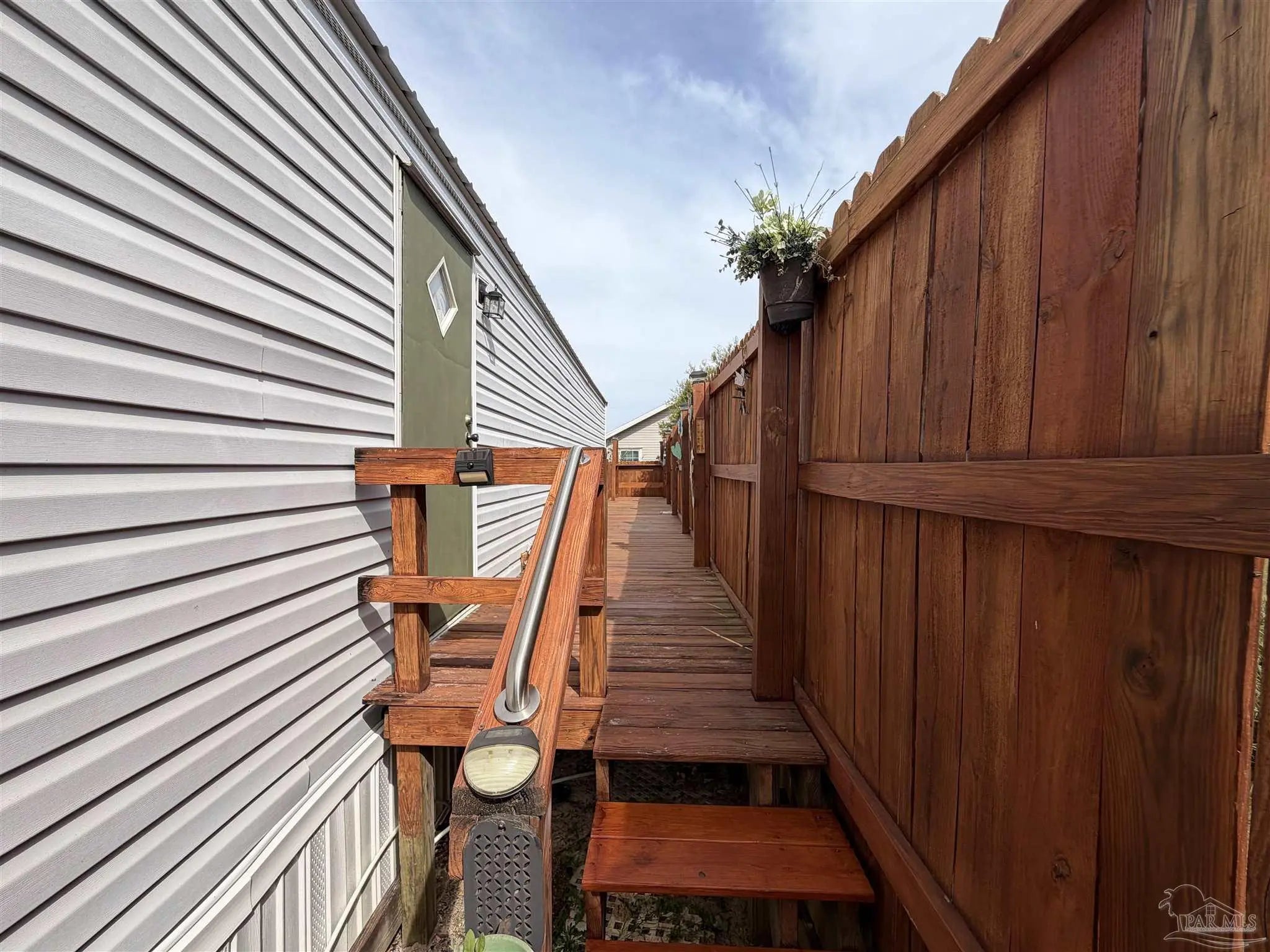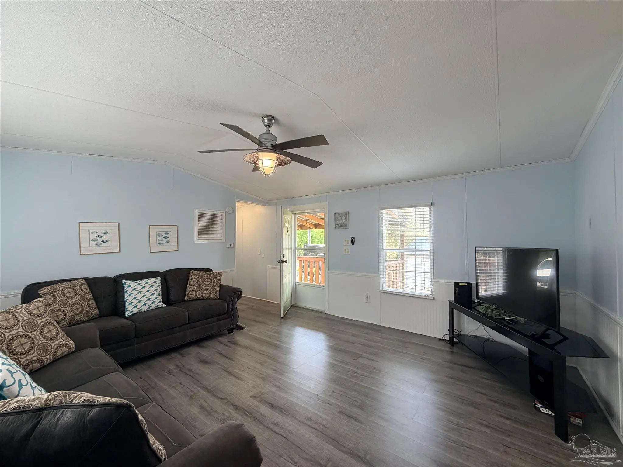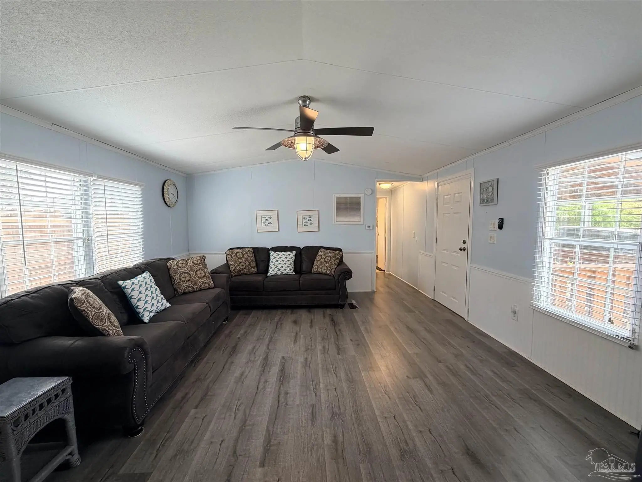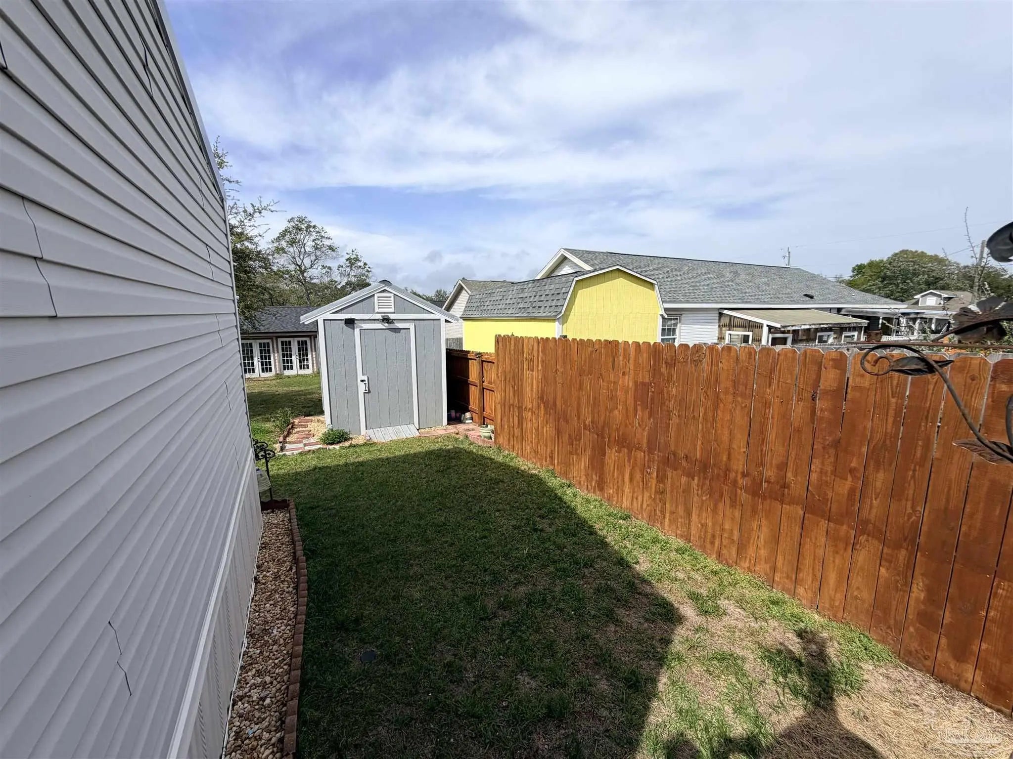 This charming home is just a short drive to Perdido Key and the white sandy beaches and beautiful GULF. It is close to the shopping centers, parks, tennis courts and more. The home has ample amount of parking and is located at the end of a cul-de-sac. The home has a large covered front deck perfect for relaxing after a long day at the beach. As you enter the home you will notice the vaulted ceilings and open floor plan plus lots of natural light through the storm door. The home has luxury tile flooring in the main rooms plus the additional bedroom. This home can easily sleep 6 plus people. The additional bedroom has lots of privacy down a hallway with a full bathroom and granite vanity. The spacious kitchen has nice flow through with a large island with flat stovetop. There is a reach in pantry plus lots of counterspace and cabinets. The kitchen countertops are a beautiful coastal looking granite. The dining room is off the kitchen perfect for family and friends to gather. The laundry room is inside the home with lots of shelving plenty of space for utility brooms and more. The oversized primary bedroom has nice closet space. There is a large soaking bathtub plus a walk in shower. The primary bathroom has beautiful double vanity with granite and plenty of drawers. The home has a back deck area off the laundry room with an 8ft. privacy fence plus an outdoor shower area and small gate to access the front yard. The front parking area can be closed off with the main gate. This home has a shed in the back of the lot great for storing yard tools or beach toys. Call today for your showing.