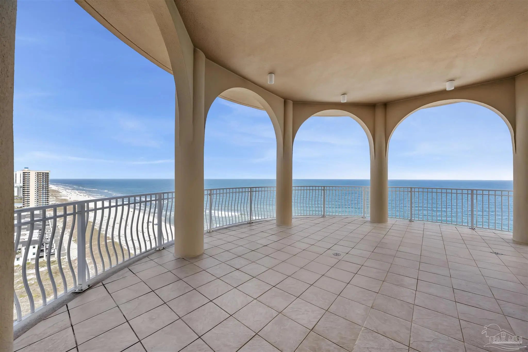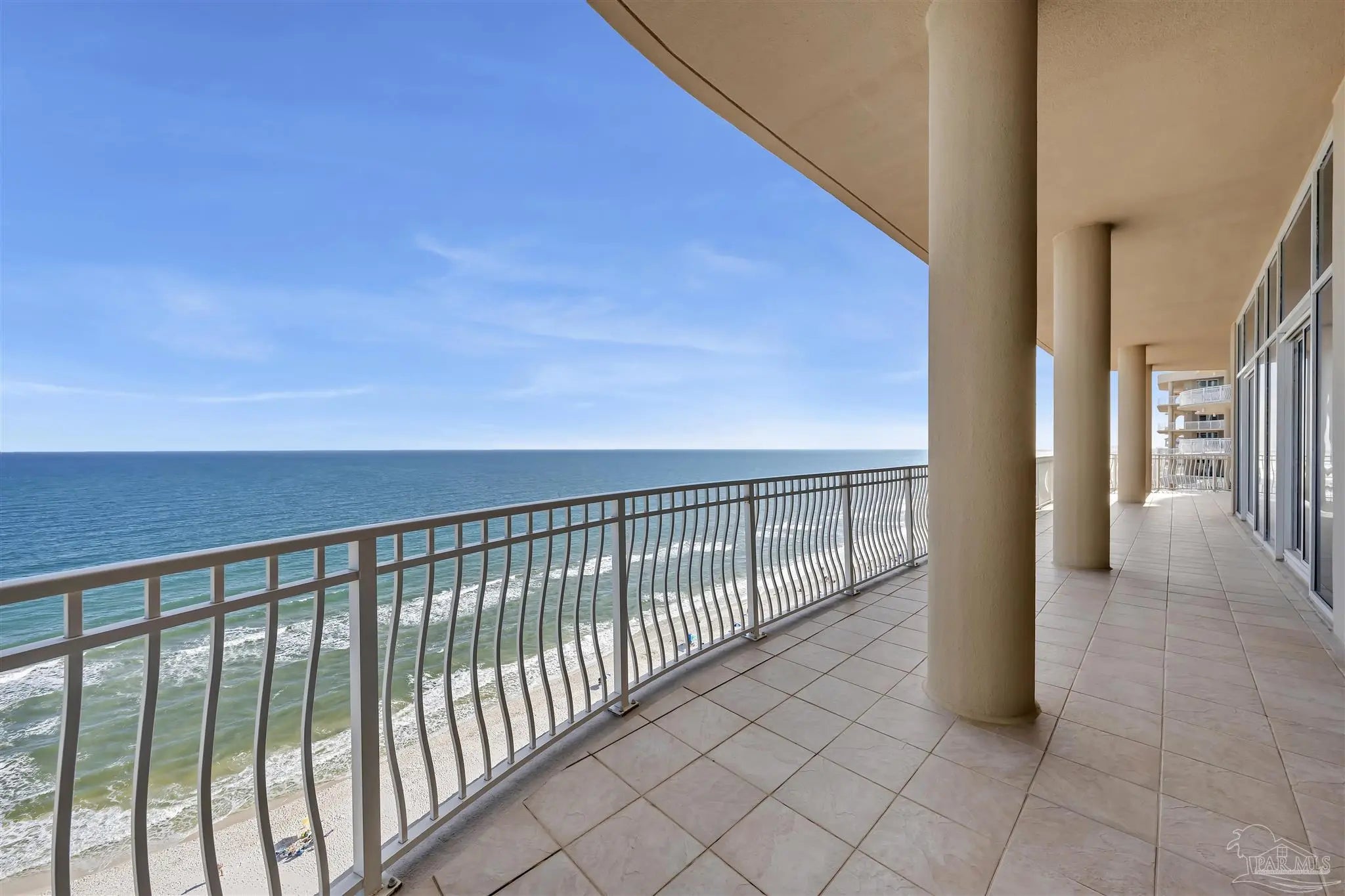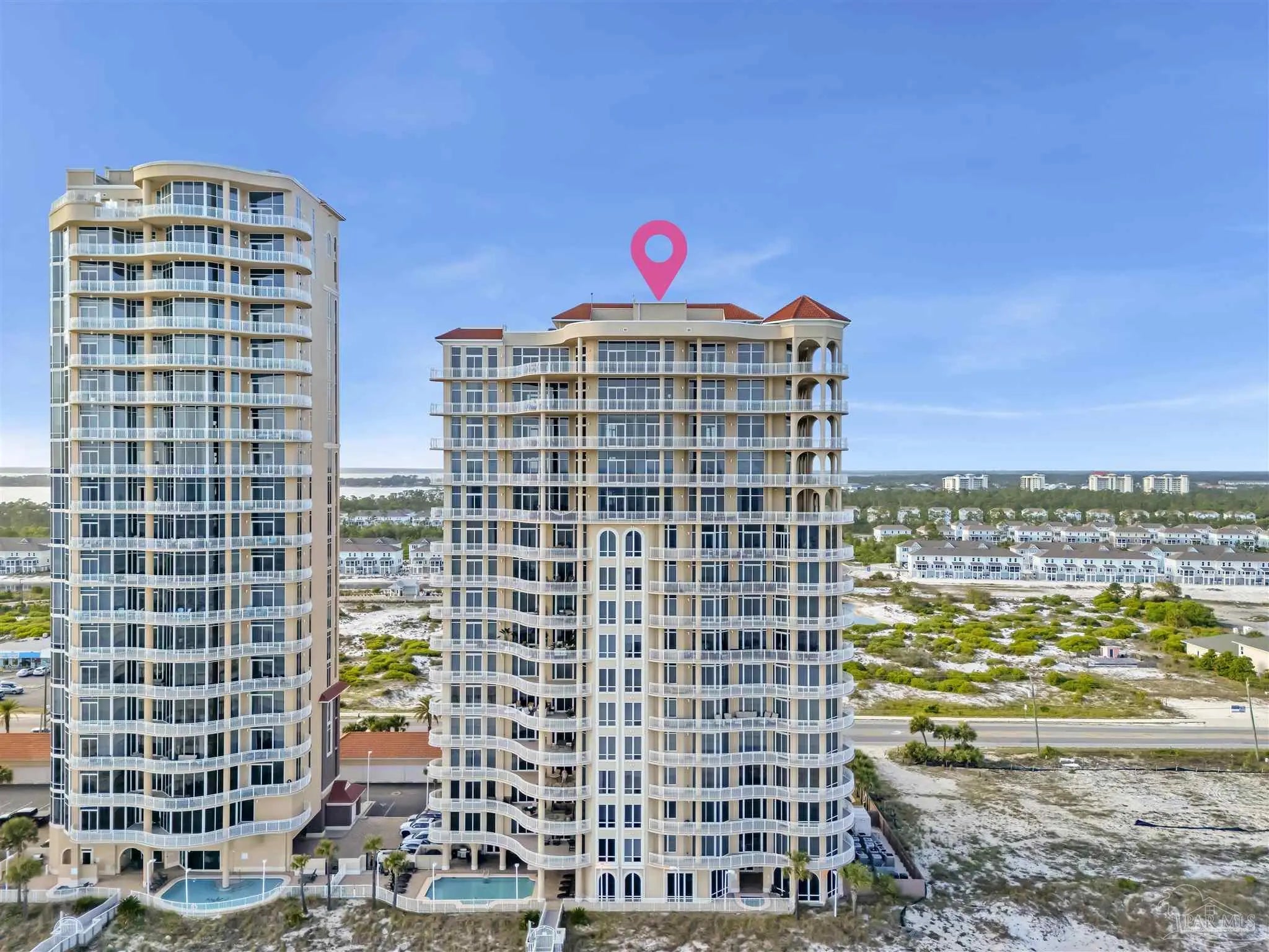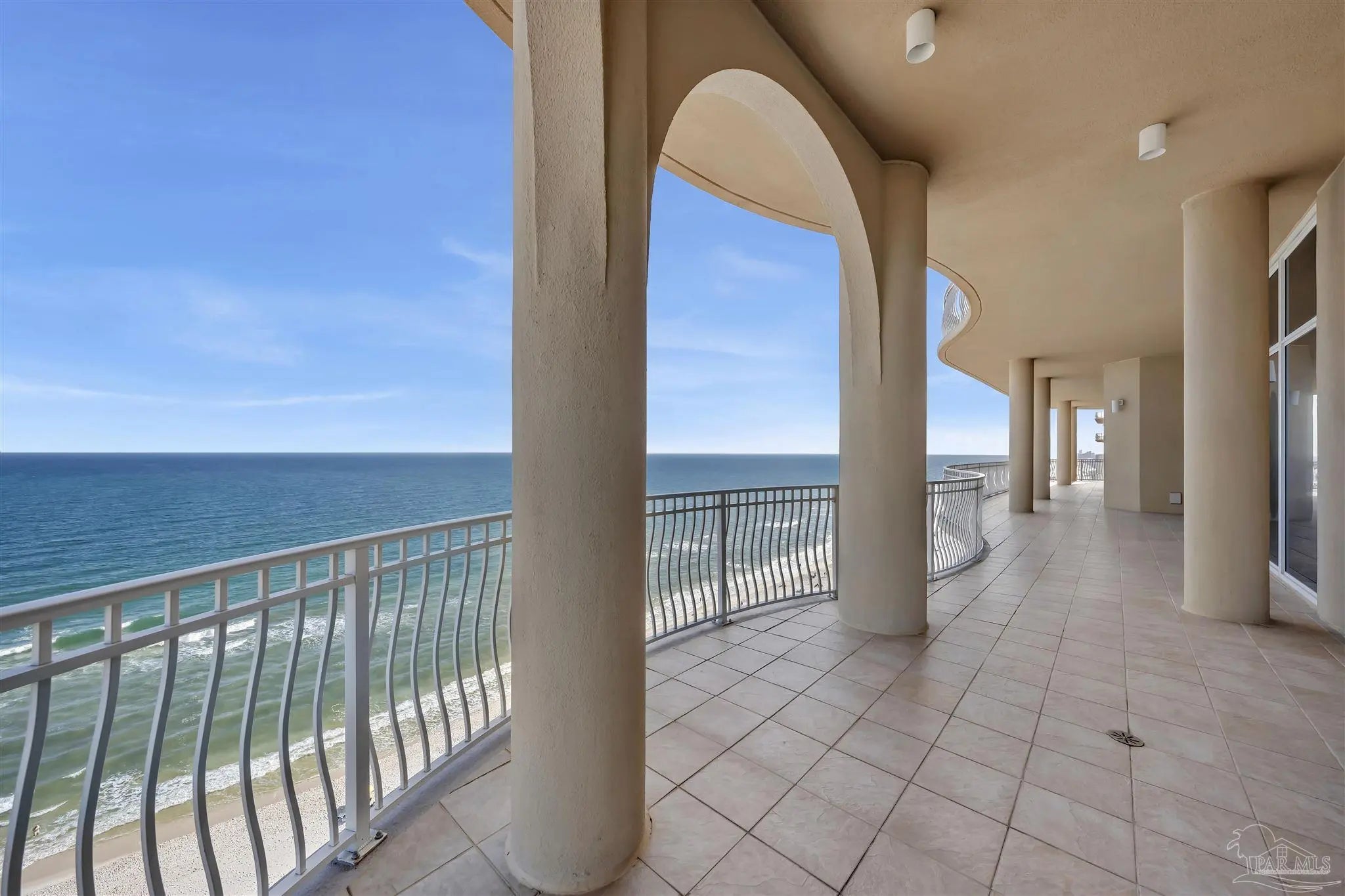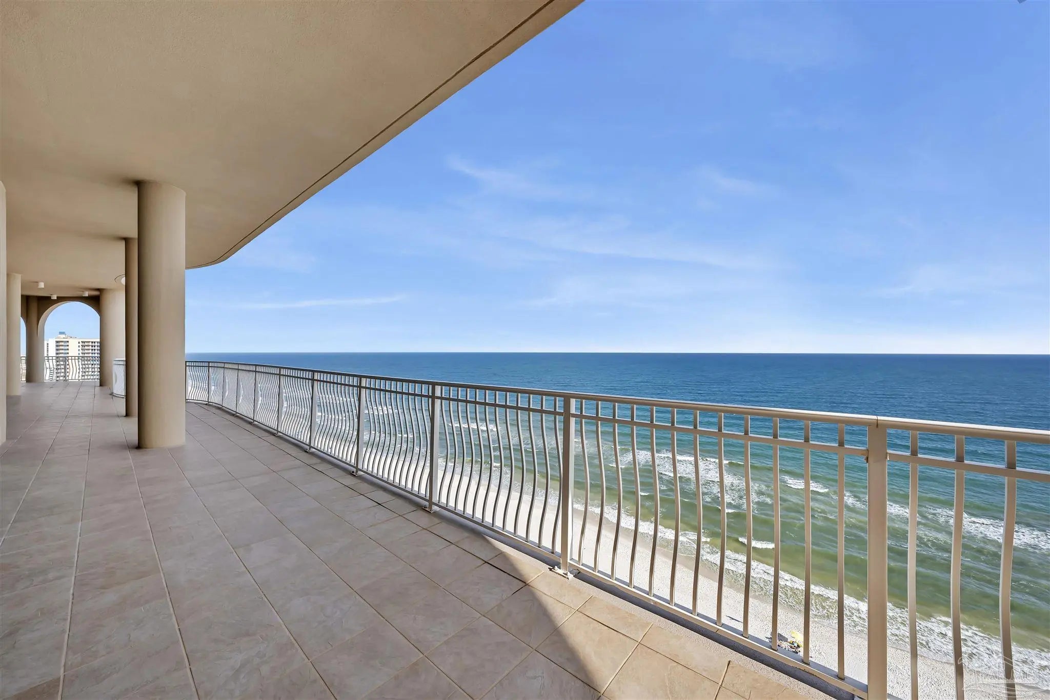 Experience unparalleled luxury in this extraordinary penthouse residence at La Riva East in Perdido Key, encompassing the entire 14th floor. Offering an impressive 4,868 sq. ft. of interior living space and an additional 2,982 sq. ft. of expansive balcony, this one-of-a-kind unit showcases breathtaking, panoramic view of the Gulf of Mexico and the pristine coastline. Designed for both elegance and privacy, the residence features five generously sized bedrooms, including a stunning Gulf-front primary suite and a secondary Gulf-front suite positioned on opposite ends. A private elevator opens directly into the residence, while abundant storage solutions are thoughtfully generated throughout. The gourmet kitchen is exquisitely designed with an expansive island, generous breakfast bar, premium finishes, and an elegant wet bar, ideal for sophisticated entertaining. Light-filled living and dining spaces are wrapped in floor-to-ceiling glass, enhanced by motorized window treatments for seamless comfort. The primary suite is a serene sanctuary, offering breathtaking sunrise views, dual walk-in closets, and a spa caliber bath with a jetted soaking tub and oversized walk-in shower. Four additional guest suite feature private ensuite baths with three capturing sweeping island vistas as private balcony access. A premium deeded parking space under the portico provides effortless access, while a private double garage with additional storage is available for purchase. With only 66 residences, La Riva offers a rare sense of privacy along 520 feet of pristine, sugar-white shoreline. Residents enjoy world-class amenities, including a Gulf-front heated indoor pool, outdoor pool and spa, a state-of -the-art fitness center with sauna and steam room, gathering room and an exclusive theater. A one-year minimum rental policy preserves the tranquil, residential ambiance.