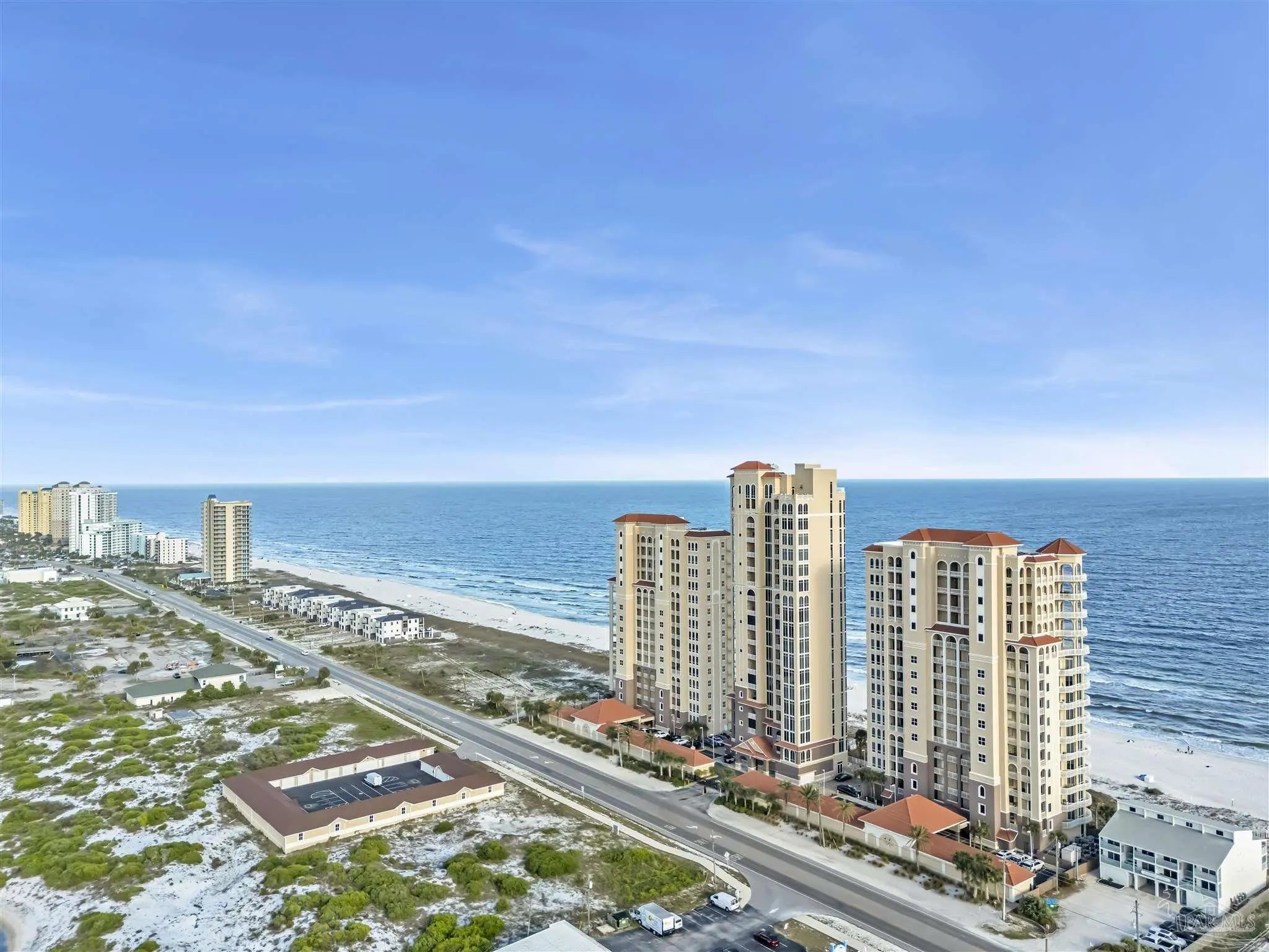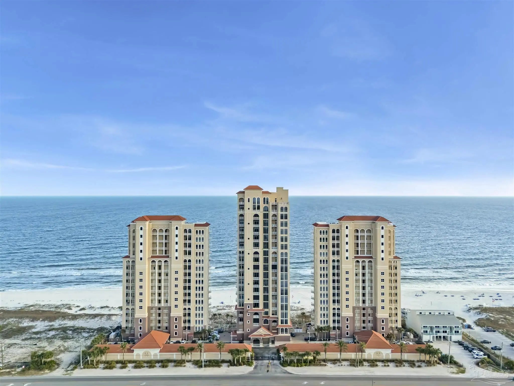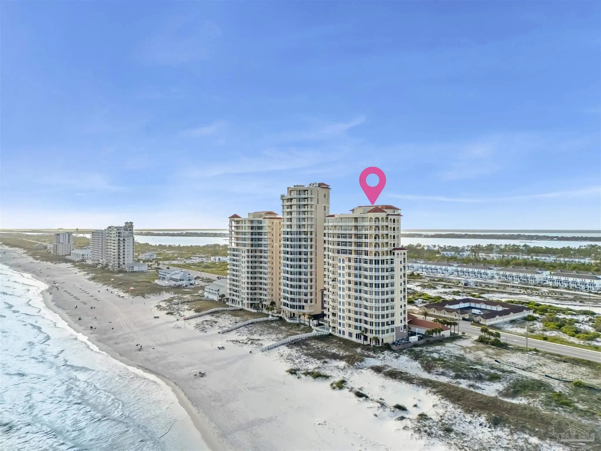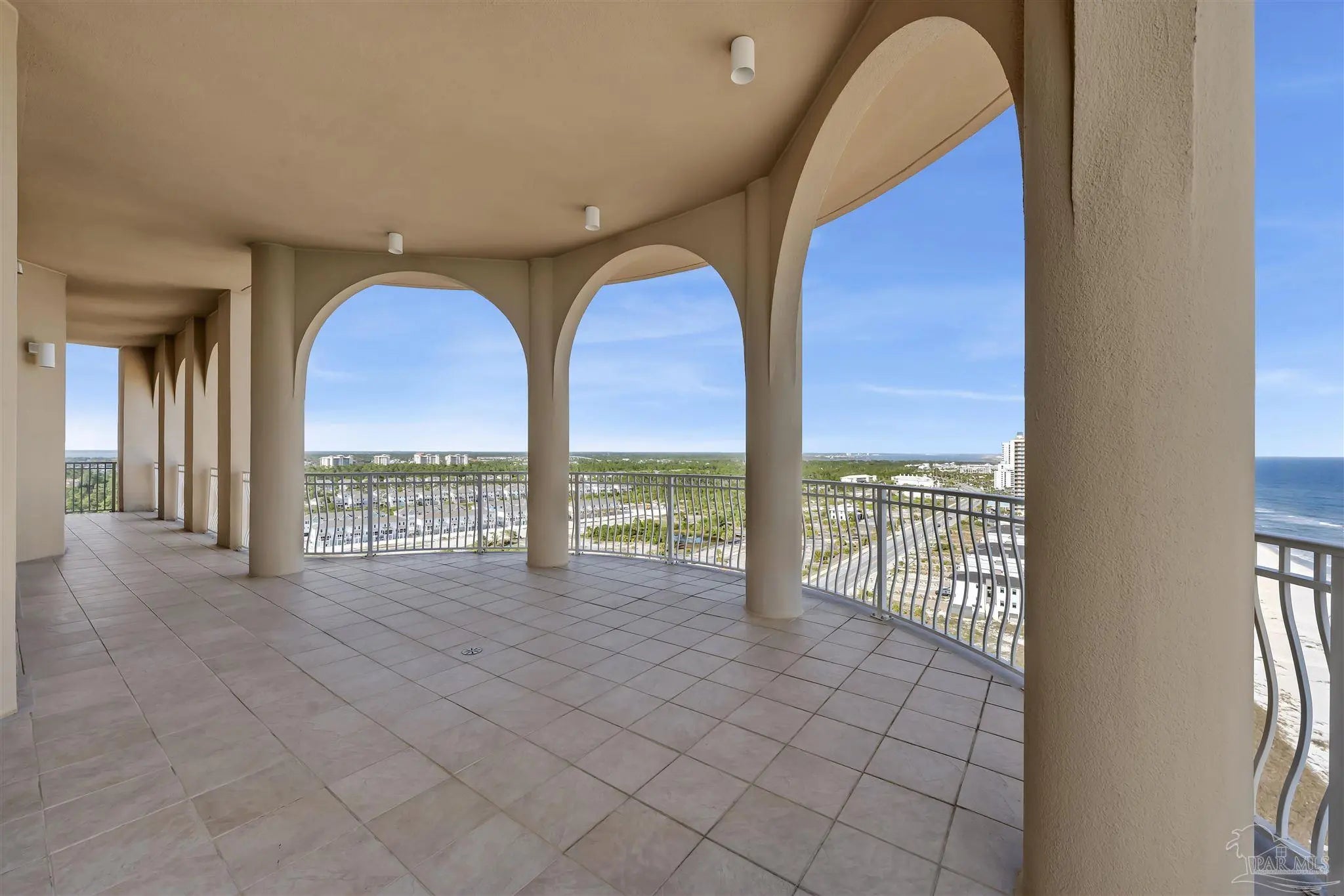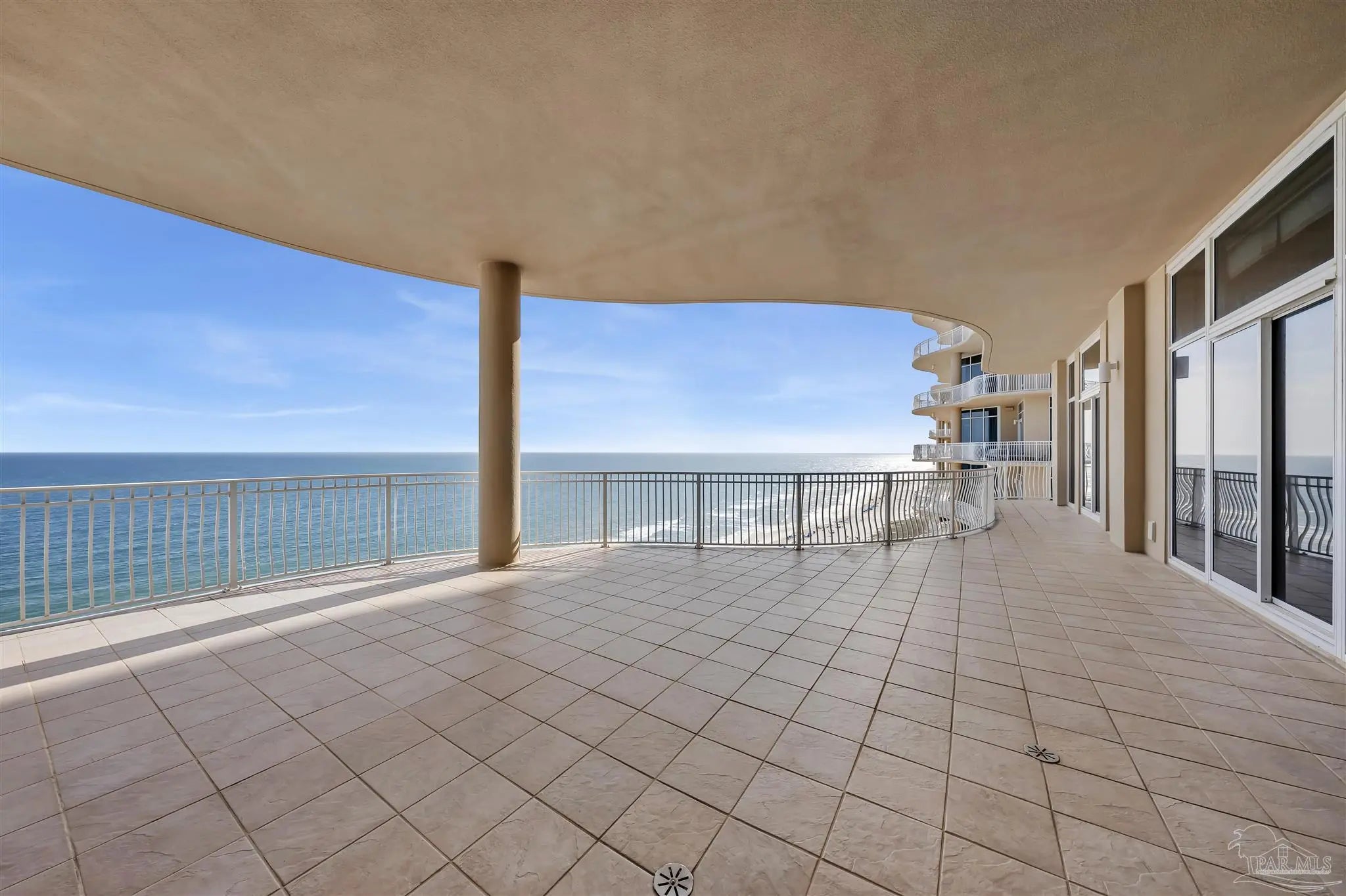 Experience unparalleled luxury in this extraordinary penthouse residence at La Riva East in Perdido Key, encompassing the entire 14th floor. Offering an impressive 4,868 sq. ft. of interior living space and an additional 2,982 sq. ft. of expansive balcony, this one-of-a-kind unit showcases breathtaking, panoramic view of the Gulf of Mexico and the pristine coastline. Designed for both elegance and privacy, the residence features five generously sized bedrooms, including a stunning Gulf-front primary suite and a secondary Gulf-front suite positioned on opposite ends. A private elevator opens directly into the residence, while abundant storage solutions are thoughtfully generated throughout. The gourmet kitchen is exquisitely designed with an expansive island, generous breakfast bar, premium finishes, and an elegant wet bar, ideal for sophisticated entertaining. Light-filled living and dining spaces are wrapped in floor-to-ceiling glass, enhanced by motorized window treatments for seamless comfort. The primary suite is a serene sanctuary, offering breathtaking sunrise views, dual walk-in closets, and a spa caliber bath with a jetted soaking tub and oversized walk-in shower. Four additional guest suite feature private ensuite baths with three capturing sweeping island vistas as private balcony access. A premium deeded parking space under the portico provides effortless access, while a private double garage with additional storage is available for purchase. With only 66 residences, La Riva offers a rare sense of privacy along 520 feet of pristine, sugar-white shoreline. Residents enjoy world-class amenities, including a Gulf-front heated indoor pool, outdoor pool and spa, a state-of -the-art fitness center with sauna and steam room, gathering room and an exclusive theater. A one-year minimum rental policy preserves the tranquil, residential ambiance.