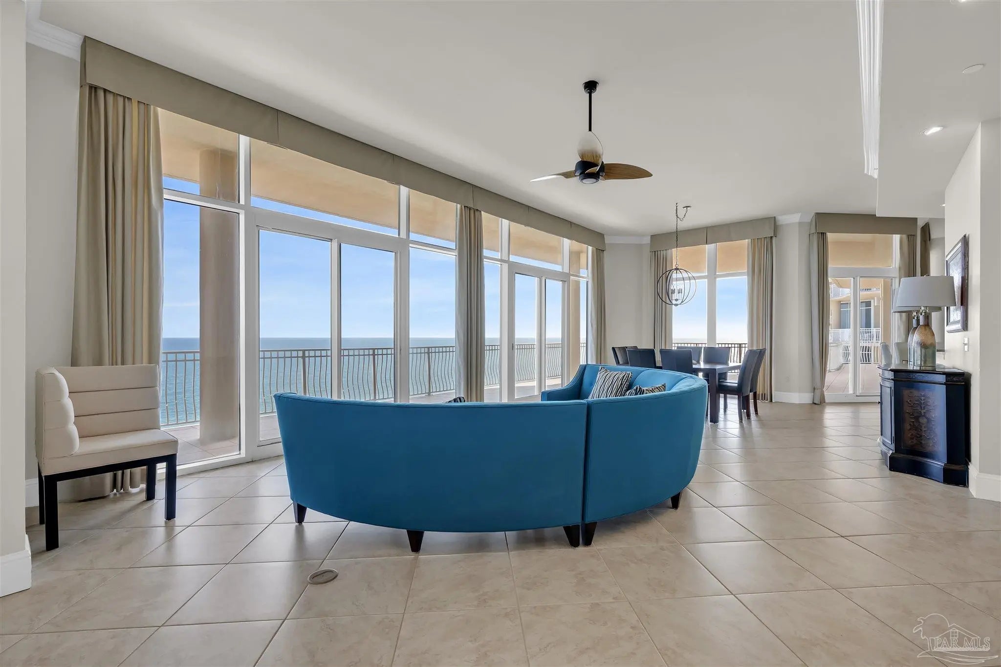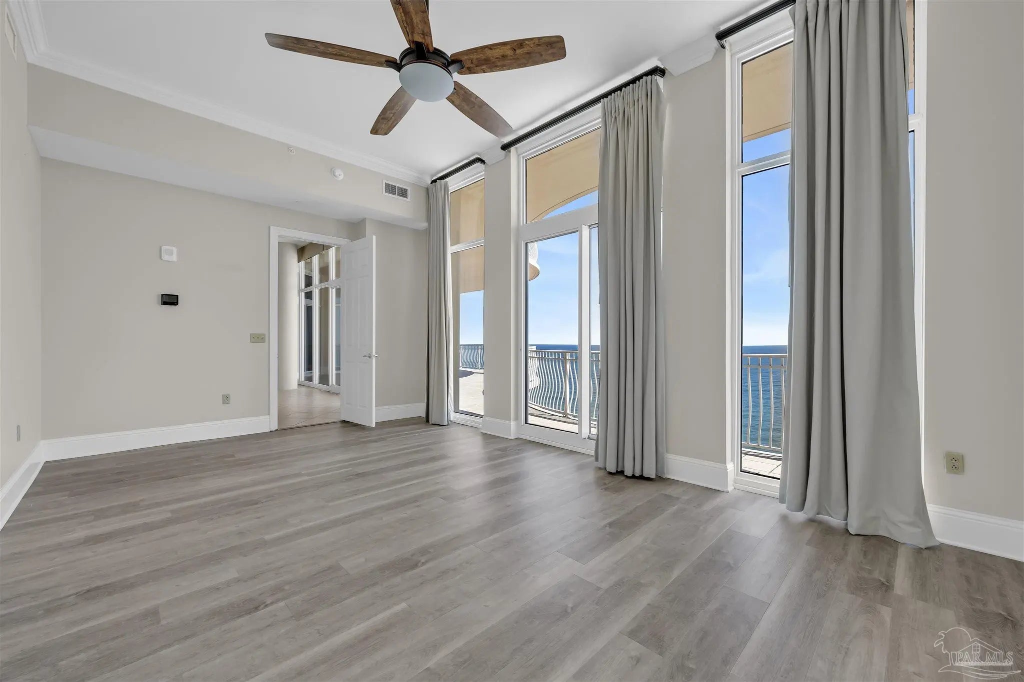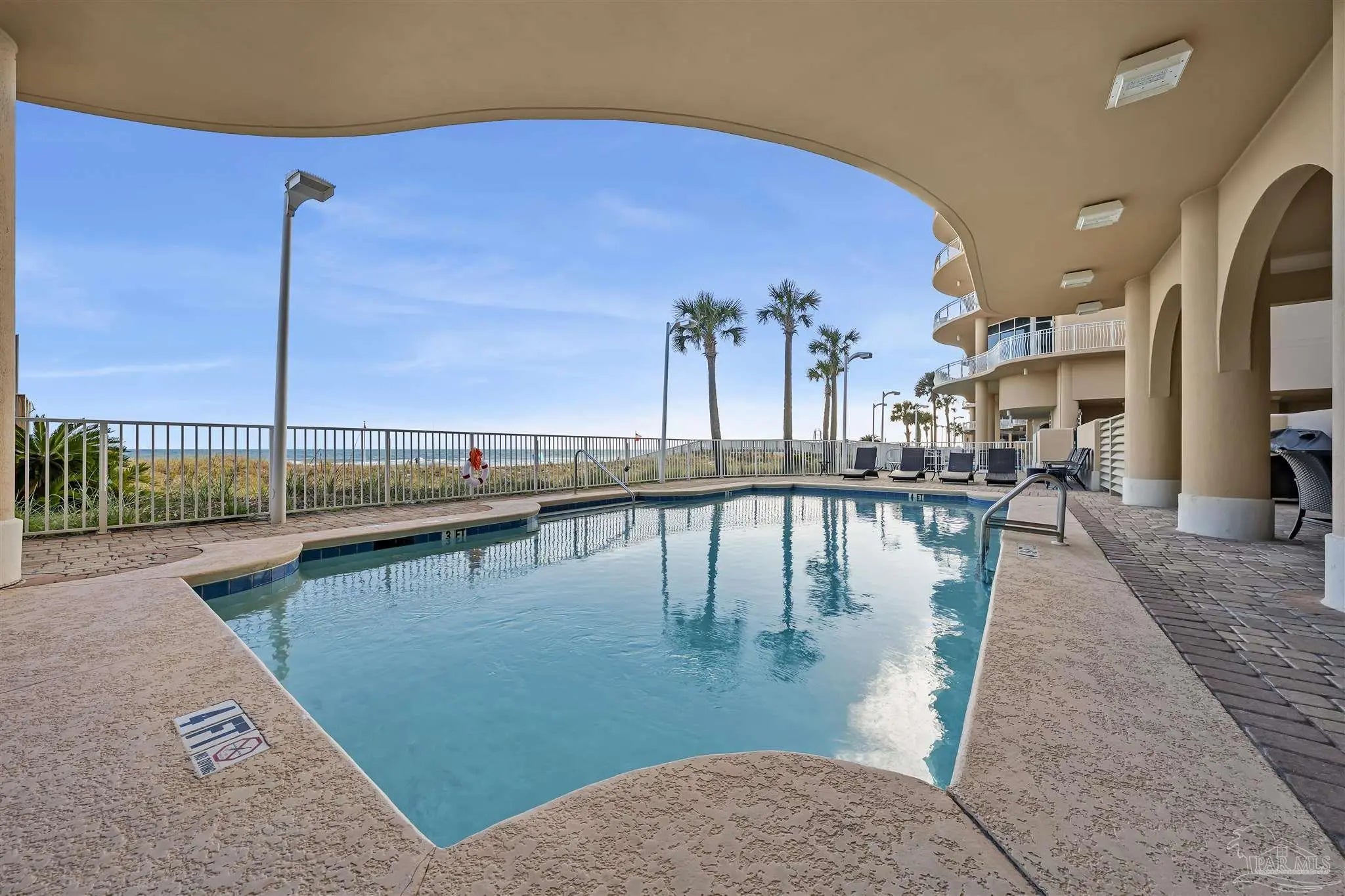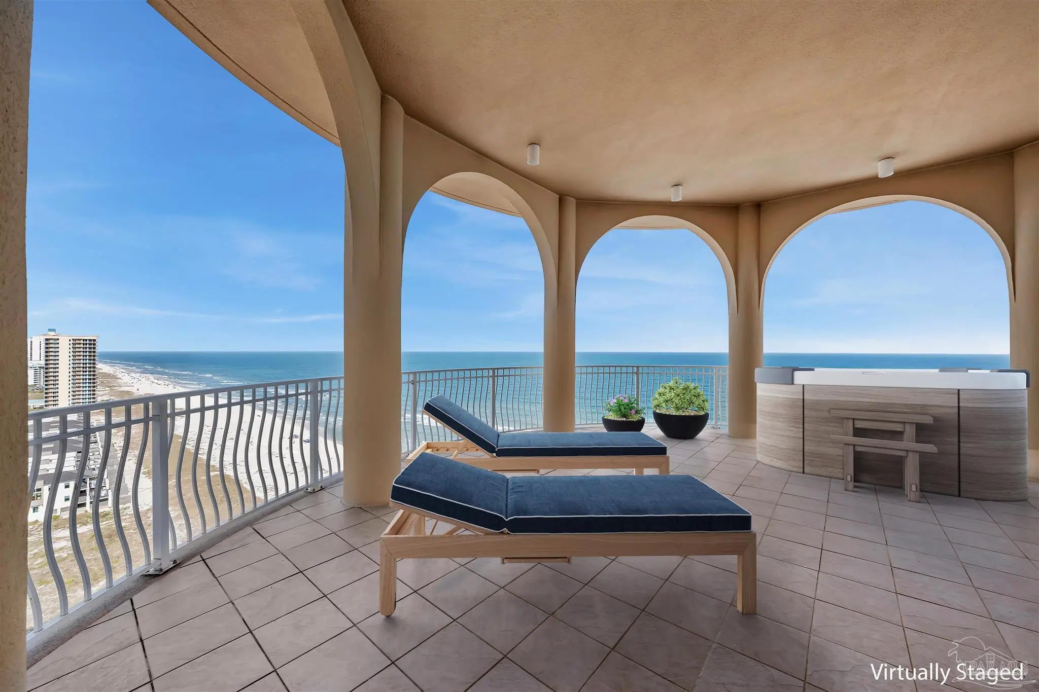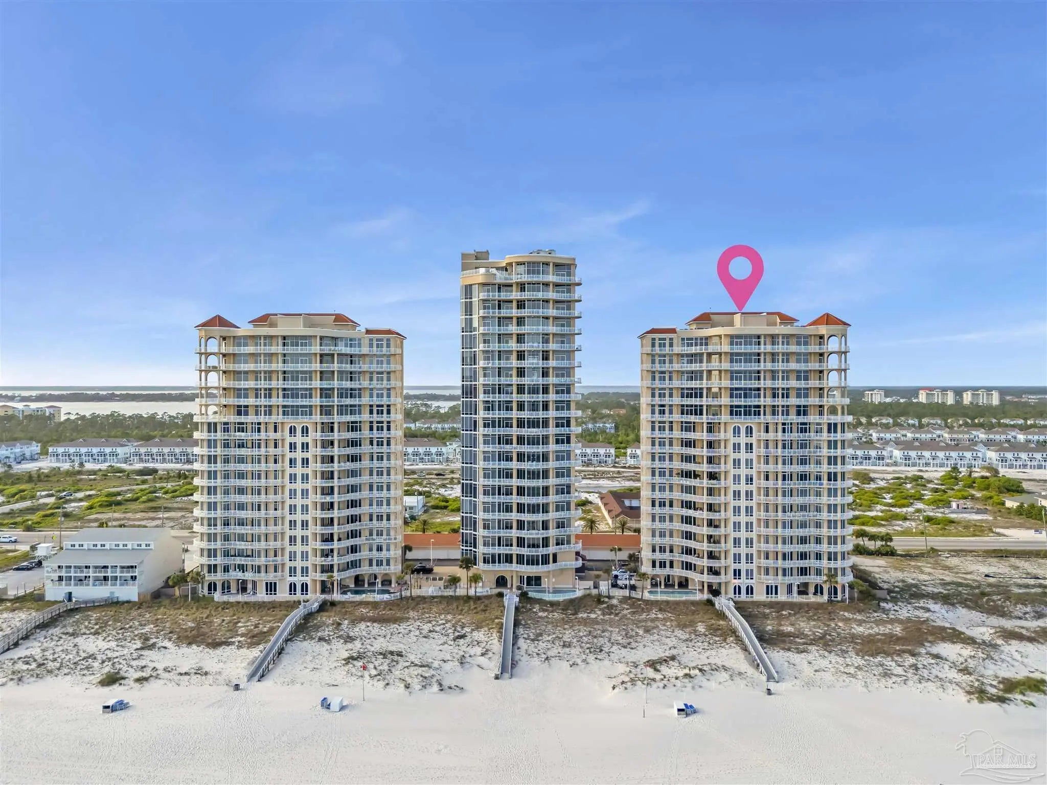 Experience unparalleled luxury in this extraordinary penthouse residence at La Riva East in Perdido Key, encompassing the entire 14th floor. Offering an impressive 4,868 sq. ft. of interior living space and an additional 2,982 sq. ft. of expansive balcony, this one-of-a-kind unit showcases breathtaking, panoramic view of the Gulf of Mexico and the pristine coastline. Designed for both elegance and privacy, the residence features five generously sized bedrooms, including a stunning Gulf-front primary suite and a secondary Gulf-front suite positioned on opposite ends. A private elevator opens directly into the residence, while abundant storage solutions are thoughtfully generated throughout. The gourmet kitchen is exquisitely designed with an expansive island, generous breakfast bar, premium finishes, and an elegant wet bar, ideal for sophisticated entertaining. Light-filled living and dining spaces are wrapped in floor-to-ceiling glass, enhanced by motorized window treatments for seamless comfort. The primary suite is a serene sanctuary, offering breathtaking sunrise views, dual walk-in closets, and a spa caliber bath with a jetted soaking tub and oversized walk-in shower. Four additional guest suite feature private ensuite baths with three capturing sweeping island vistas as private balcony access. A premium deeded parking space under the portico provides effortless access, while a private double garage with additional storage is available for purchase. With only 66 residences, La Riva offers a rare sense of privacy along 520 feet of pristine, sugar-white shoreline. Residents enjoy world-class amenities, including a Gulf-front heated indoor pool, outdoor pool and spa, a state-of -the-art fitness center with sauna and steam room, gathering room and an exclusive theater. A one-year minimum rental policy preserves the tranquil, residential ambiance.