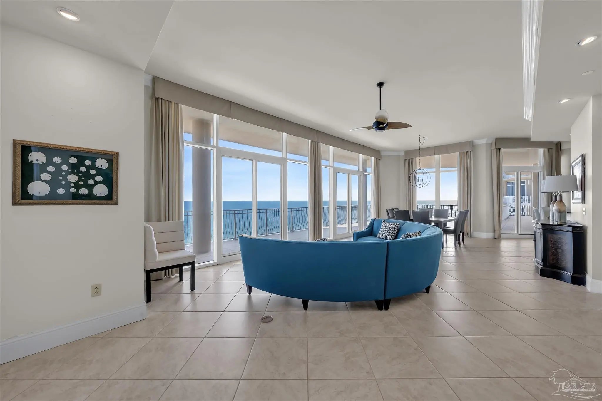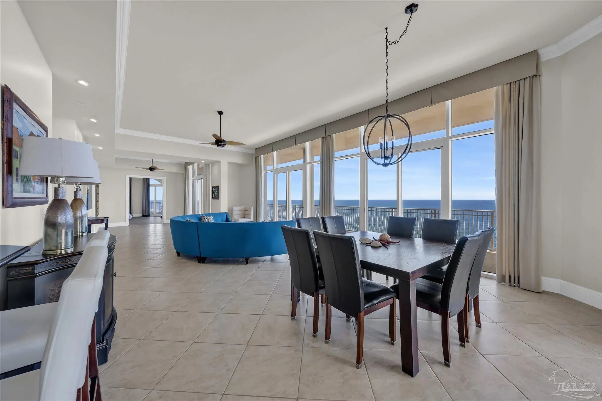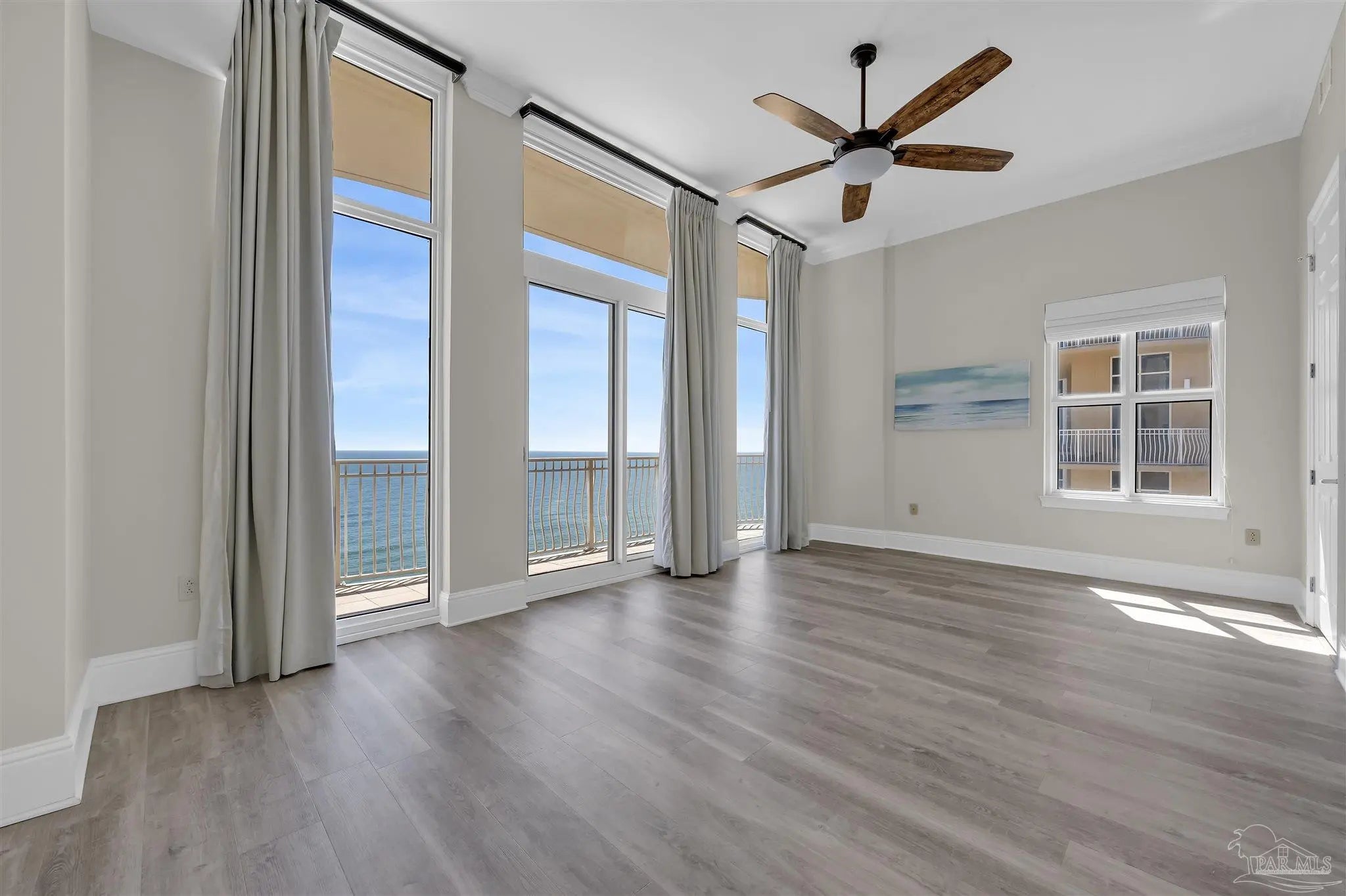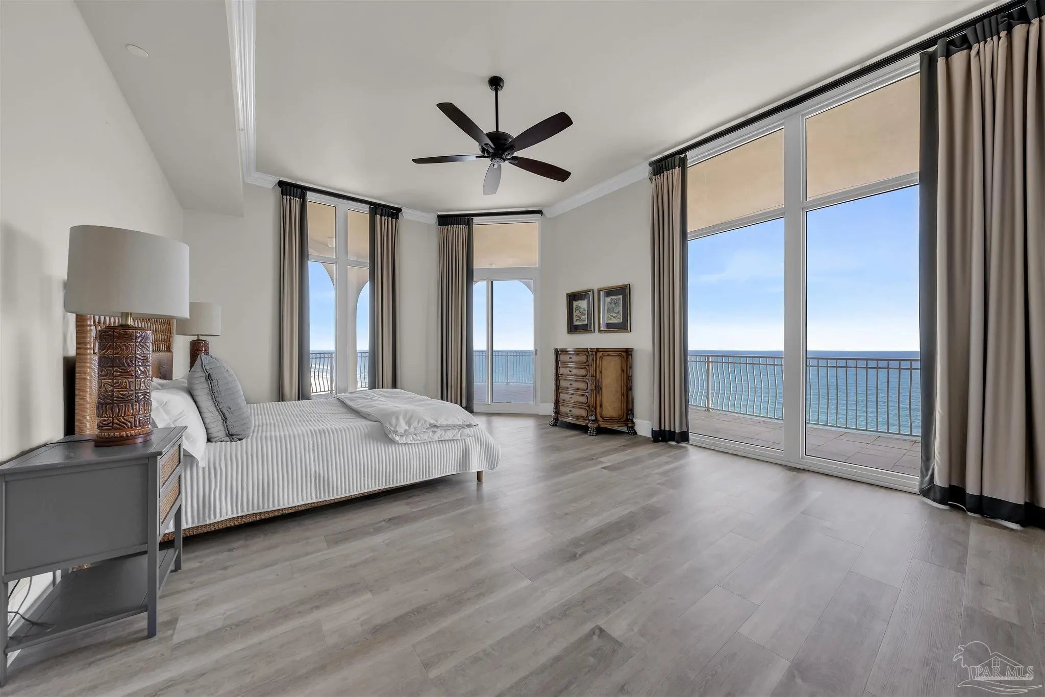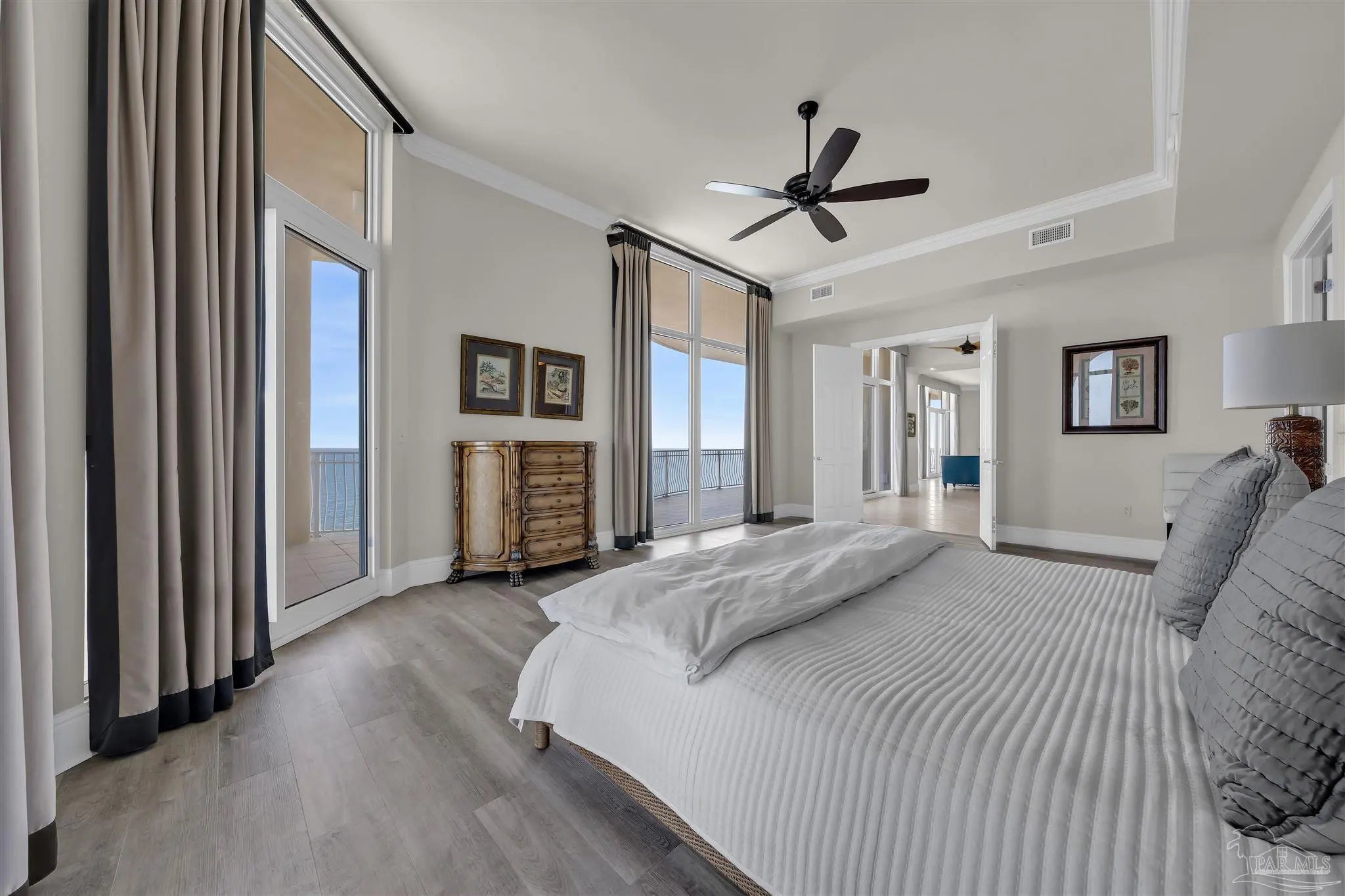 Experience unparalleled luxury in this extraordinary penthouse residence at La Riva East in Perdido Key, encompassing the entire 14th floor. Offering an impressive 4,868 sq. ft. of interior living space and an additional 2,982 sq. ft. of expansive balcony, this one-of-a-kind unit showcases breathtaking, panoramic view of the Gulf of Mexico and the pristine coastline. Designed for both elegance and privacy, the residence features five generously sized bedrooms, including a stunning Gulf-front primary suite and a secondary Gulf-front suite positioned on opposite ends. A private elevator opens directly into the residence, while abundant storage solutions are thoughtfully generated throughout. The gourmet kitchen is exquisitely designed with an expansive island, generous breakfast bar, premium finishes, and an elegant wet bar, ideal for sophisticated entertaining. Light-filled living and dining spaces are wrapped in floor-to-ceiling glass, enhanced by motorized window treatments for seamless comfort. The primary suite is a serene sanctuary, offering breathtaking sunrise views, dual walk-in closets, and a spa caliber bath with a jetted soaking tub and oversized walk-in shower. Four additional guest suite feature private ensuite baths with three capturing sweeping island vistas as private balcony access. A premium deeded parking space under the portico provides effortless access, while a private double garage with additional storage is available for purchase. With only 66 residences, La Riva offers a rare sense of privacy along 520 feet of pristine, sugar-white shoreline. Residents enjoy world-class amenities, including a Gulf-front heated indoor pool, outdoor pool and spa, a state-of -the-art fitness center with sauna and steam room, gathering room and an exclusive theater. A one-year minimum rental policy preserves the tranquil, residential ambiance.