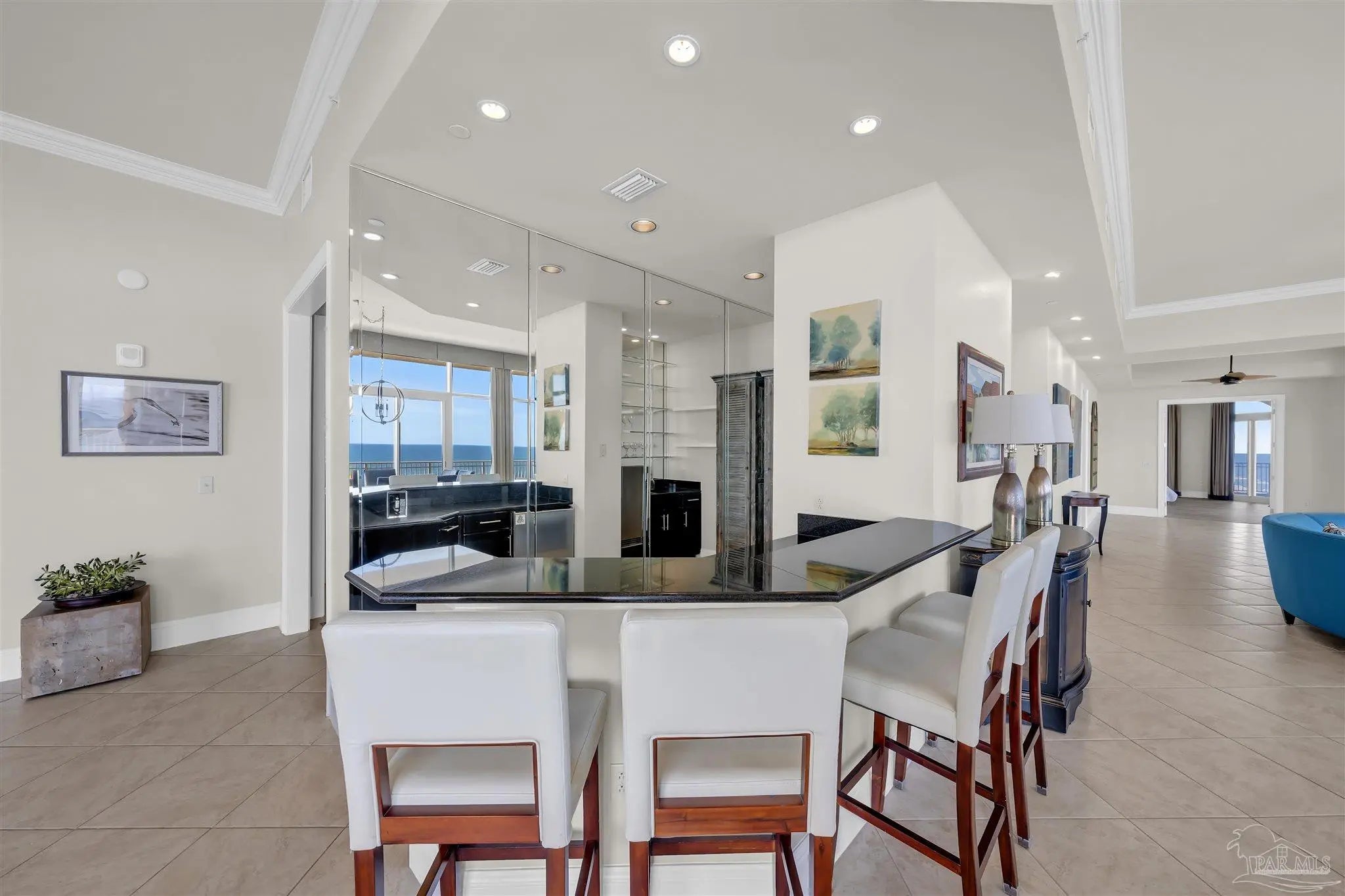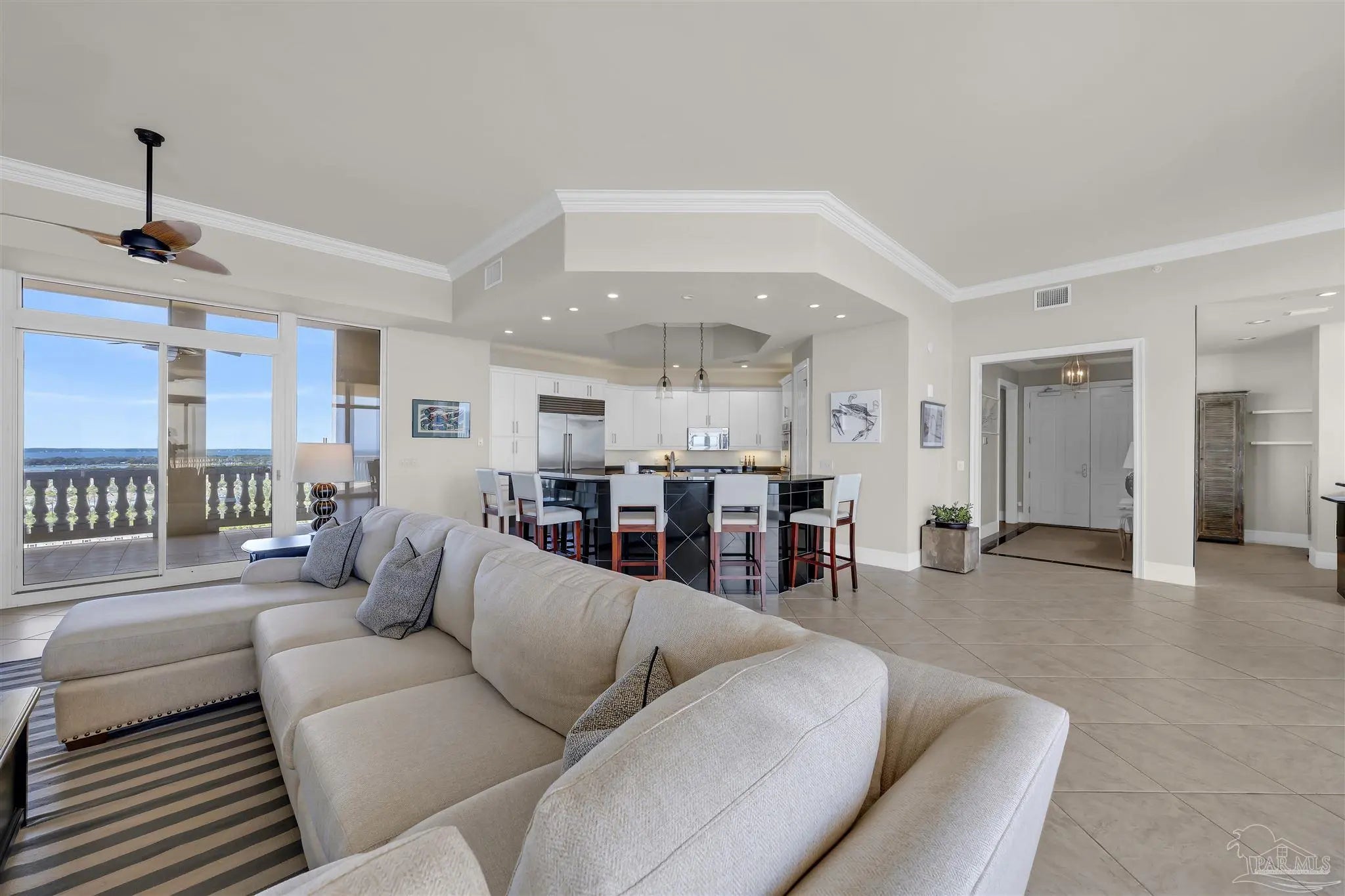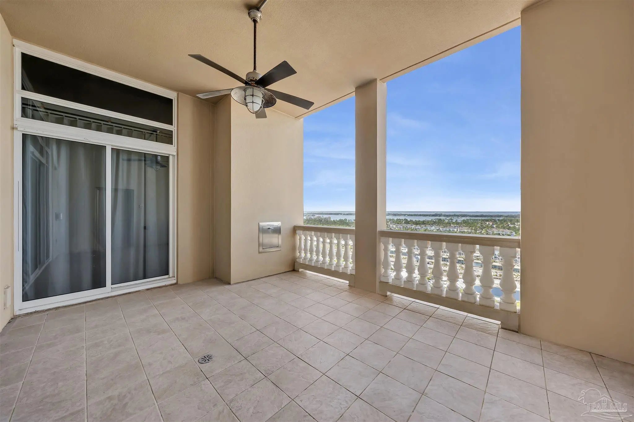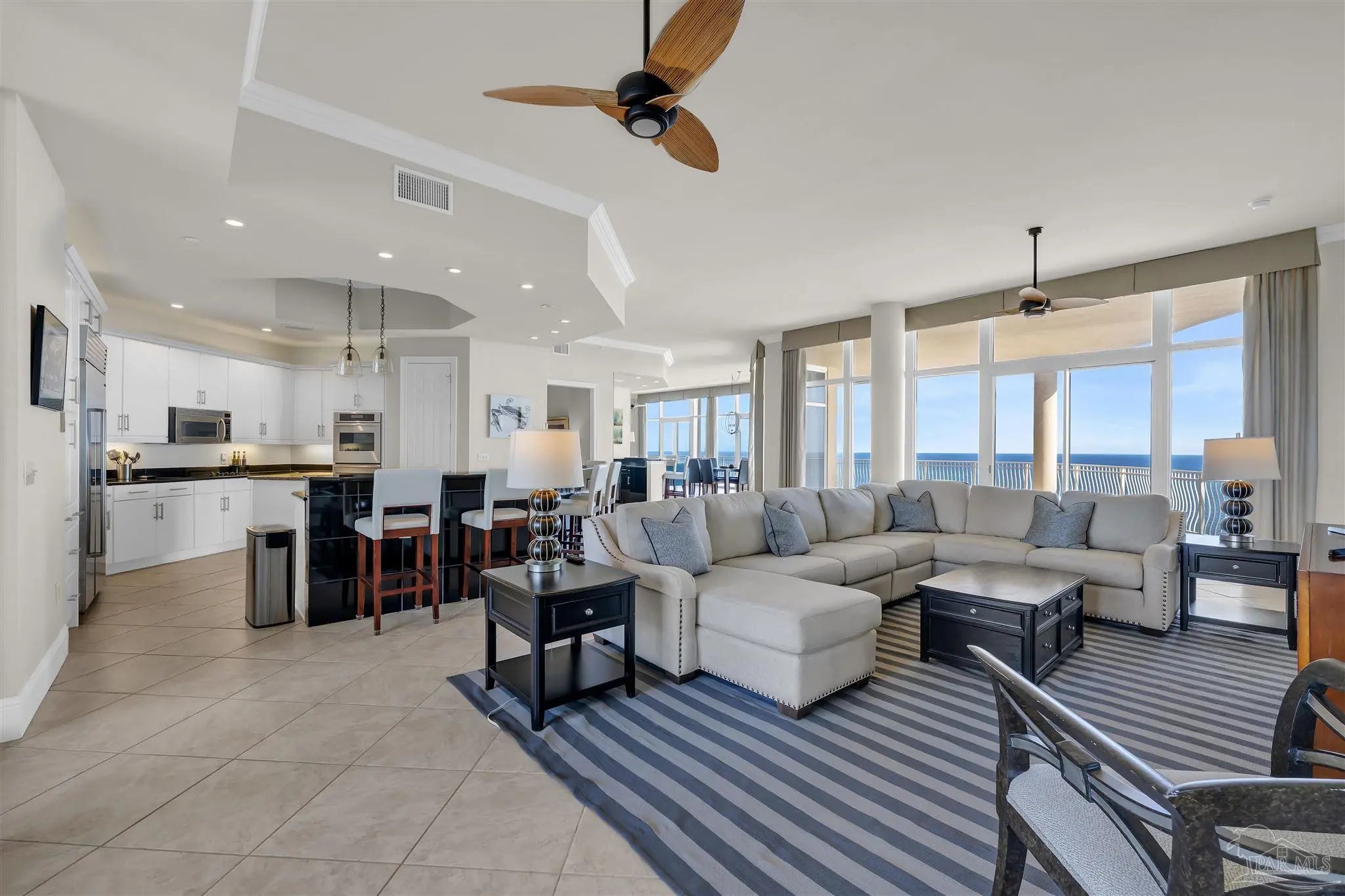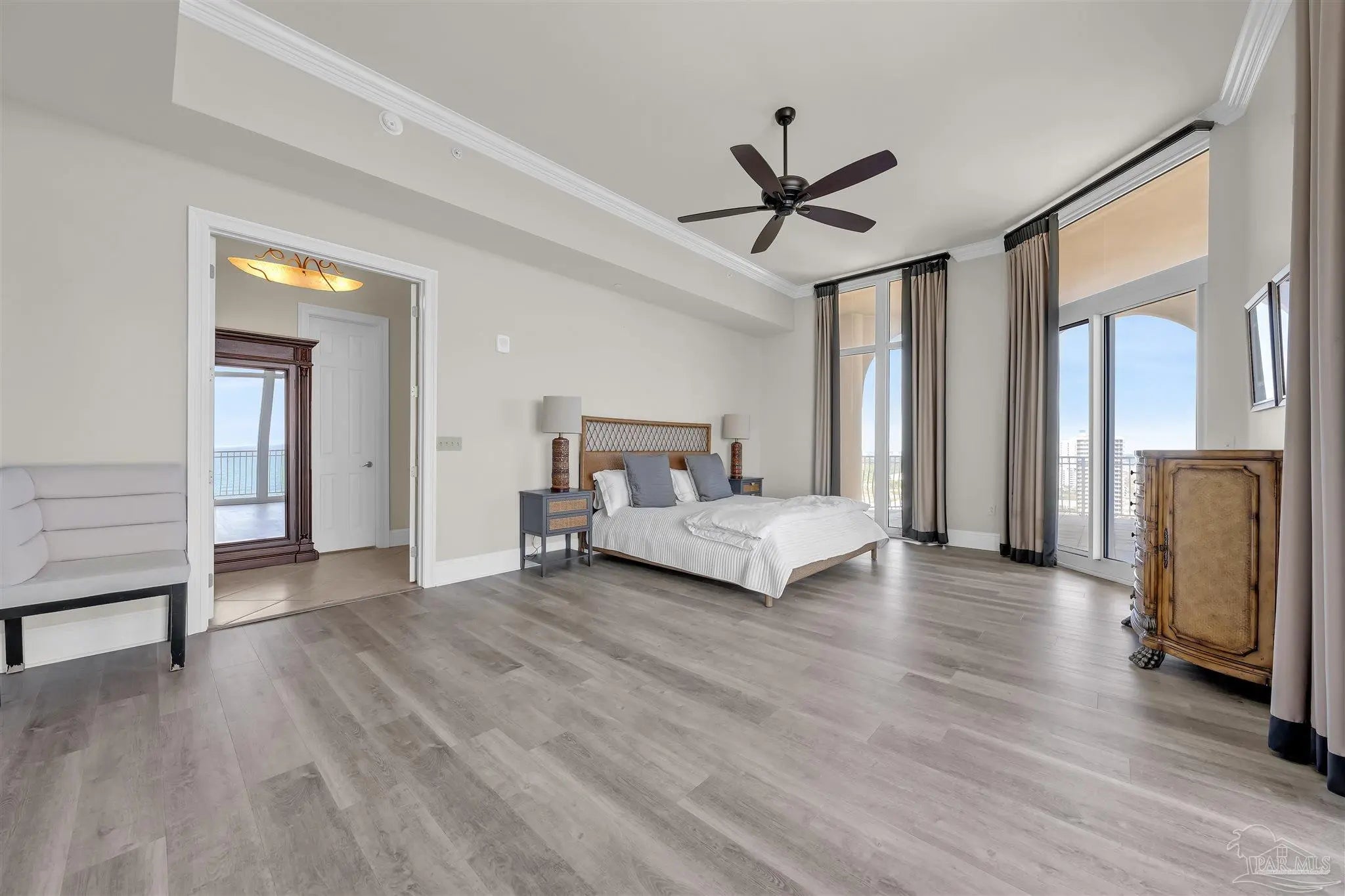 Experience unparalleled luxury in this extraordinary penthouse residence at La Riva East in Perdido Key, encompassing the entire 14th floor. Offering an impressive 4,868 sq. ft. of interior living space and an additional 2,982 sq. ft. of expansive balcony, this one-of-a-kind unit showcases breathtaking, panoramic view of the Gulf of Mexico and the pristine coastline. Designed for both elegance and privacy, the residence features five generously sized bedrooms, including a stunning Gulf-front primary suite and a secondary Gulf-front suite positioned on opposite ends. A private elevator opens directly into the residence, while abundant storage solutions are thoughtfully generated throughout. The gourmet kitchen is exquisitely designed with an expansive island, generous breakfast bar, premium finishes, and an elegant wet bar, ideal for sophisticated entertaining. Light-filled living and dining spaces are wrapped in floor-to-ceiling glass, enhanced by motorized window treatments for seamless comfort. The primary suite is a serene sanctuary, offering breathtaking sunrise views, dual walk-in closets, and a spa caliber bath with a jetted soaking tub and oversized walk-in shower. Four additional guest suite feature private ensuite baths with three capturing sweeping island vistas as private balcony access. A premium deeded parking space under the portico provides effortless access, while a private double garage with additional storage is available for purchase. With only 66 residences, La Riva offers a rare sense of privacy along 520 feet of pristine, sugar-white shoreline. Residents enjoy world-class amenities, including a Gulf-front heated indoor pool, outdoor pool and spa, a state-of -the-art fitness center with sauna and steam room, gathering room and an exclusive theater. A one-year minimum rental policy preserves the tranquil, residential ambiance.
