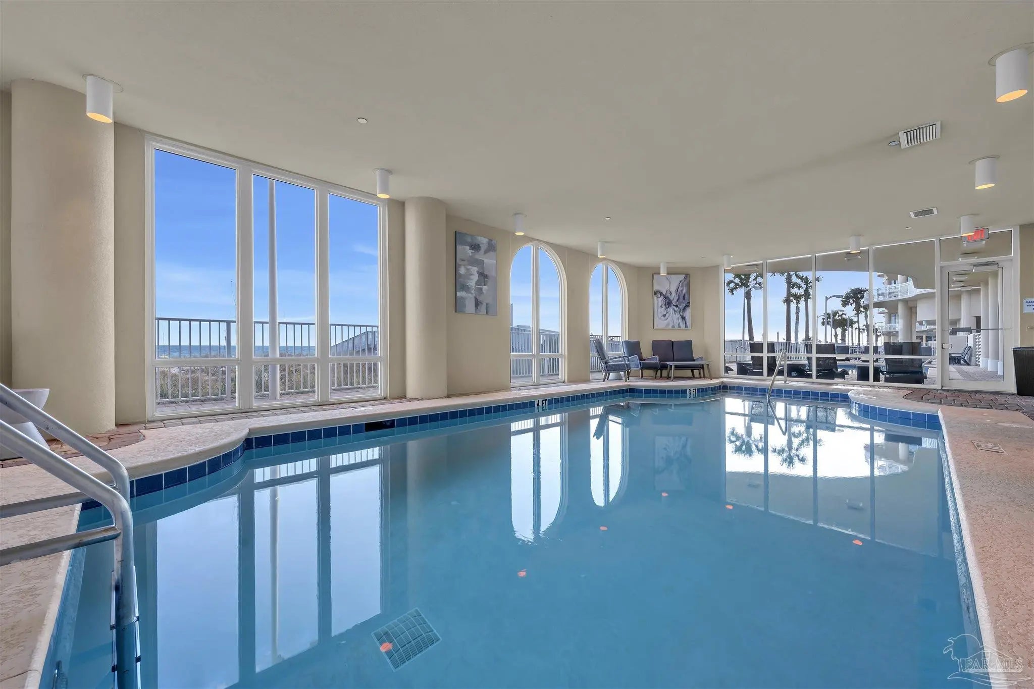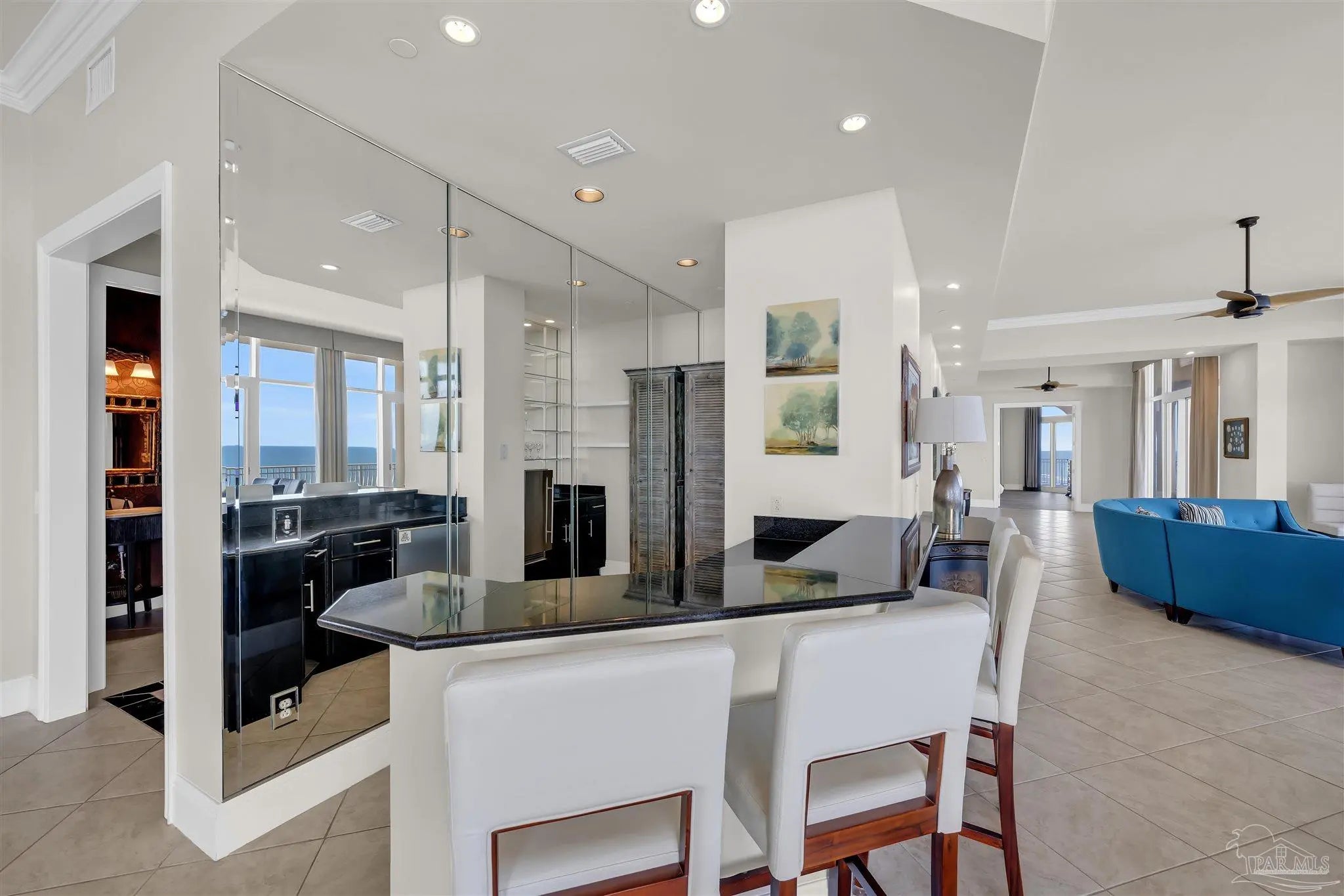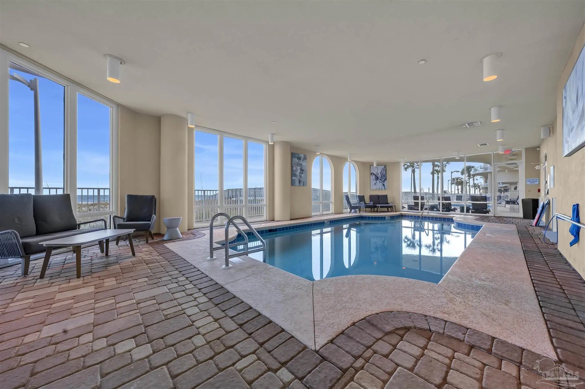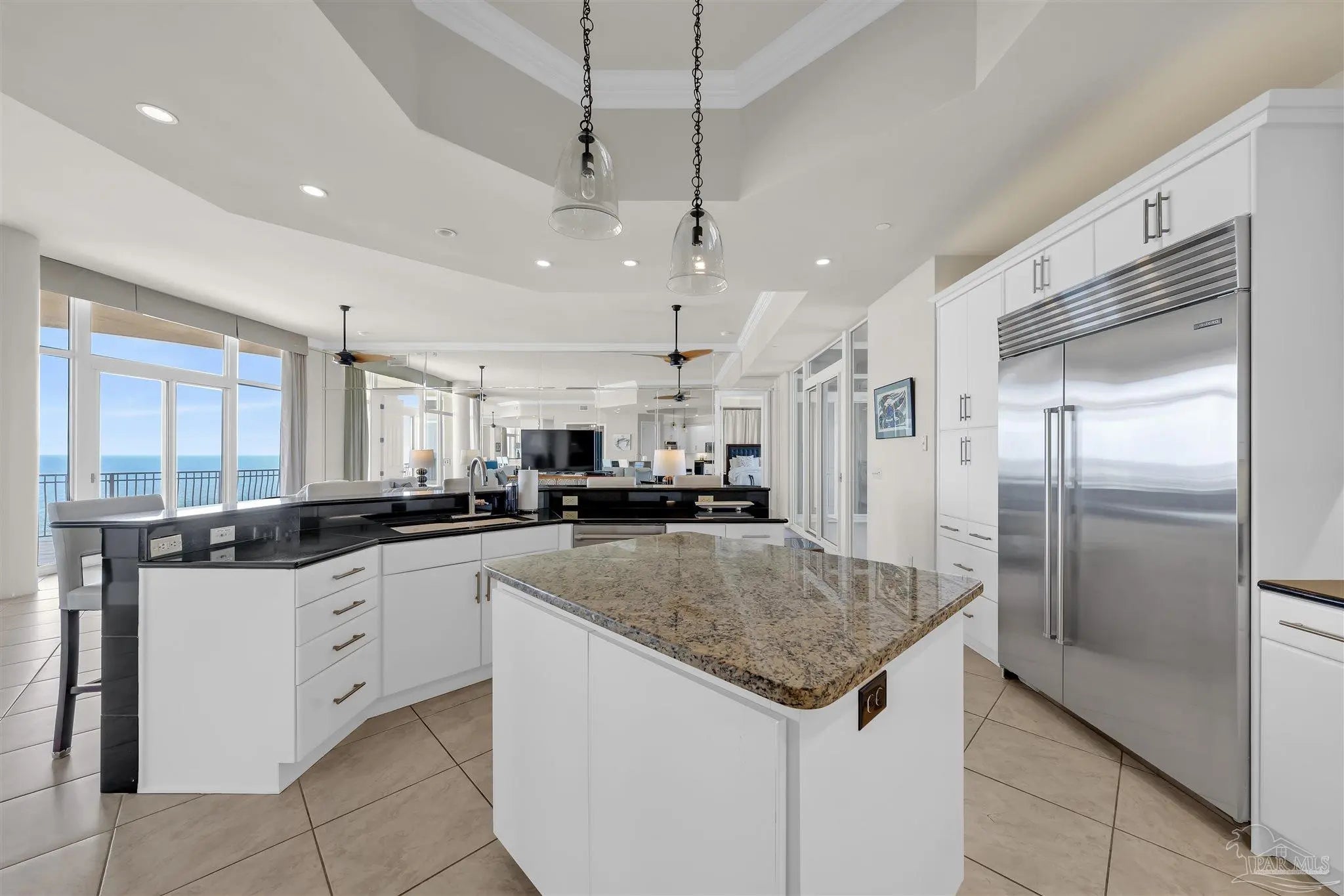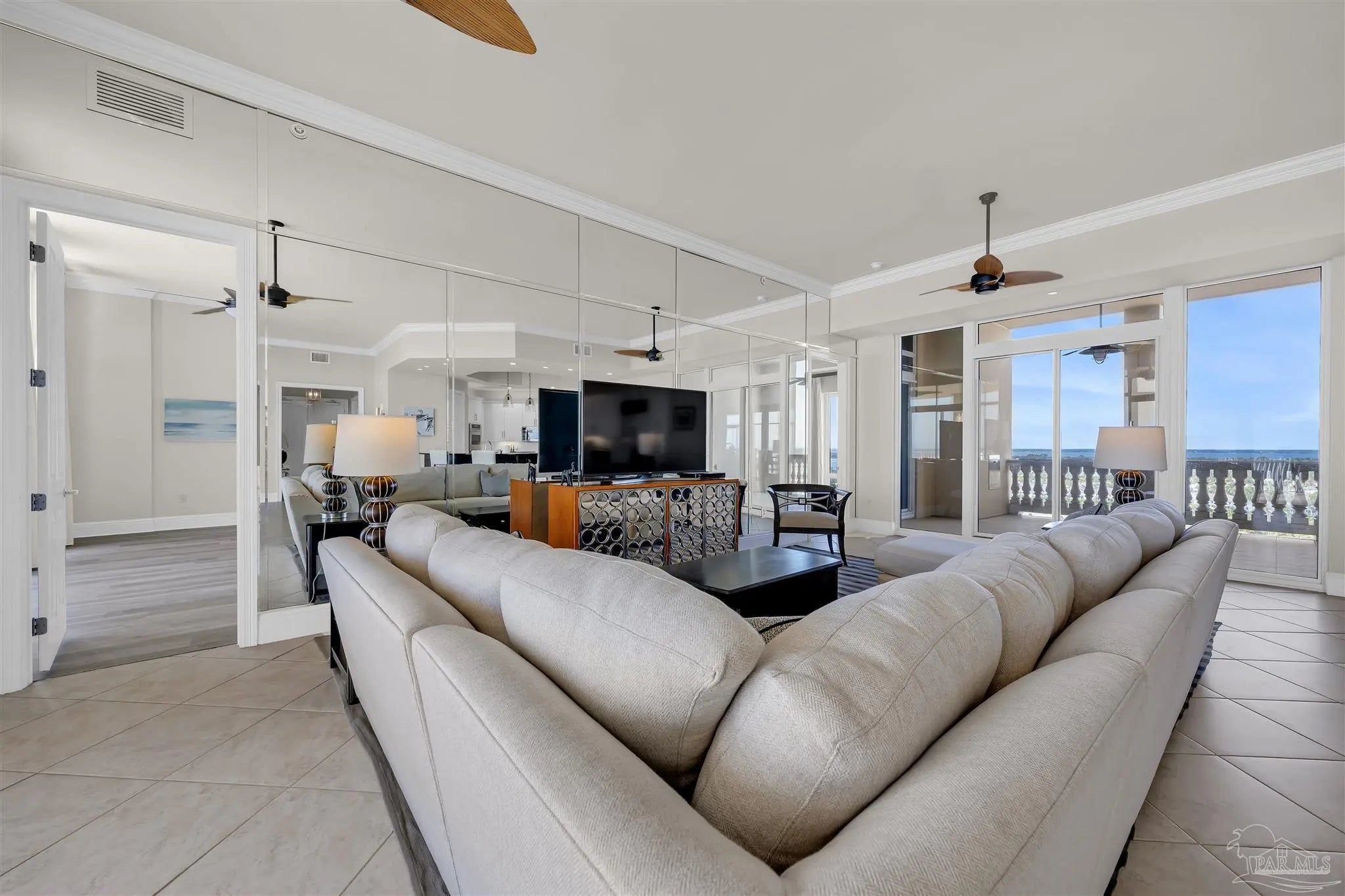 Experience unparalleled luxury in this extraordinary penthouse residence at La Riva East in Perdido Key, encompassing the entire 14th floor. Offering an impressive 4,868 sq. ft. of interior living space and an additional 2,982 sq. ft. of expansive balcony, this one-of-a-kind unit showcases breathtaking, panoramic view of the Gulf of Mexico and the pristine coastline. Designed for both elegance and privacy, the residence features five generously sized bedrooms, including a stunning Gulf-front primary suite and a secondary Gulf-front suite positioned on opposite ends. A private elevator opens directly into the residence, while abundant storage solutions are thoughtfully generated throughout. The gourmet kitchen is exquisitely designed with an expansive island, generous breakfast bar, premium finishes, and an elegant wet bar, ideal for sophisticated entertaining. Light-filled living and dining spaces are wrapped in floor-to-ceiling glass, enhanced by motorized window treatments for seamless comfort. The primary suite is a serene sanctuary, offering breathtaking sunrise views, dual walk-in closets, and a spa caliber bath with a jetted soaking tub and oversized walk-in shower. Four additional guest suite feature private ensuite baths with three capturing sweeping island vistas as private balcony access. A premium deeded parking space under the portico provides effortless access, while a private double garage with additional storage is available for purchase. With only 66 residences, La Riva offers a rare sense of privacy along 520 feet of pristine, sugar-white shoreline. Residents enjoy world-class amenities, including a Gulf-front heated indoor pool, outdoor pool and spa, a state-of -the-art fitness center with sauna and steam room, gathering room and an exclusive theater. A one-year minimum rental policy preserves the tranquil, residential ambiance.
