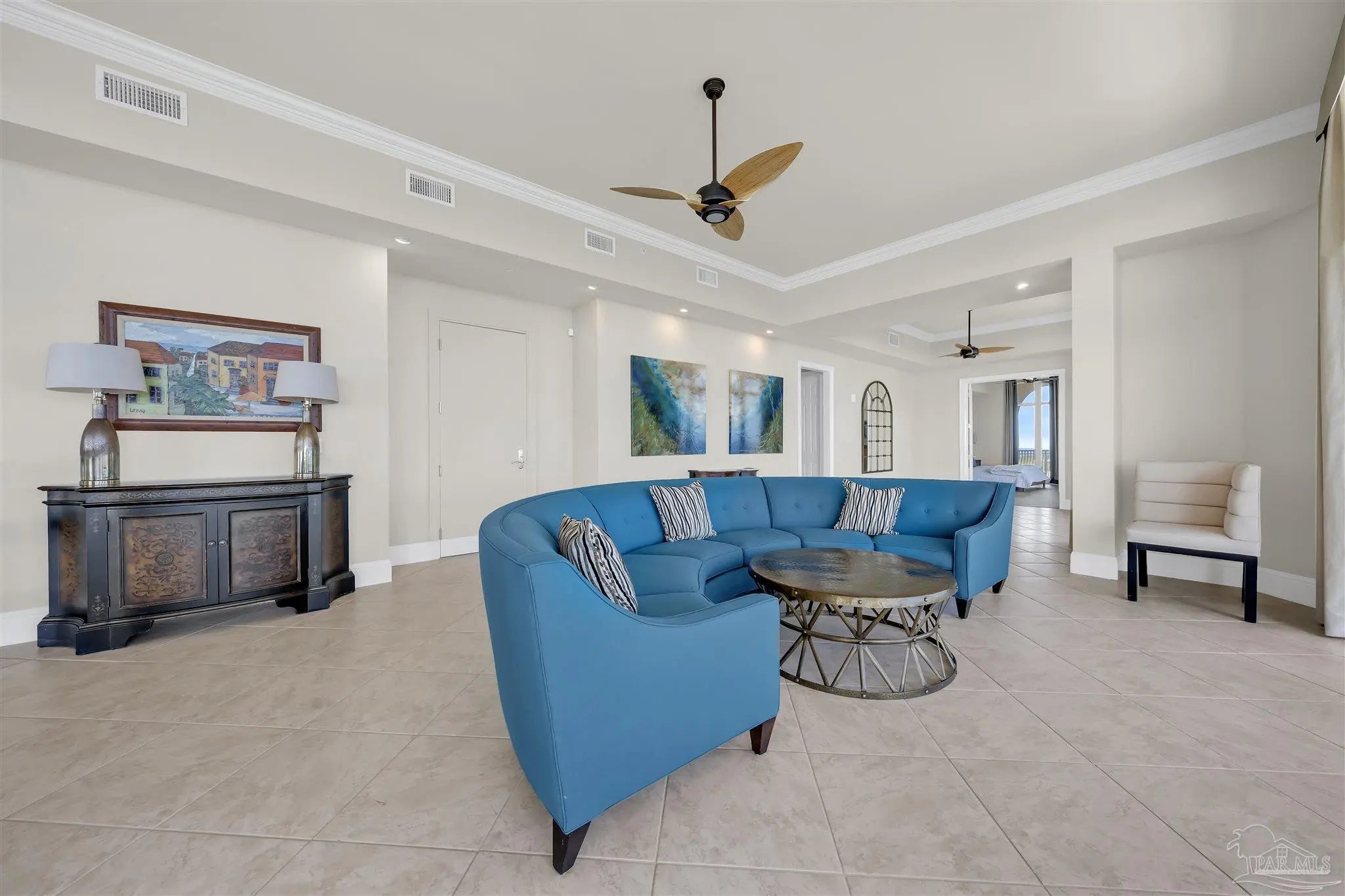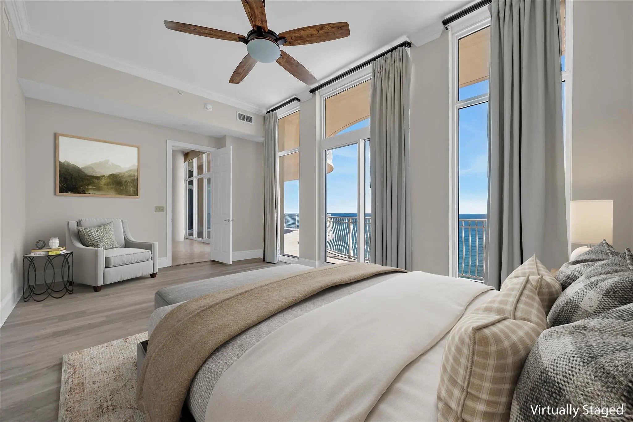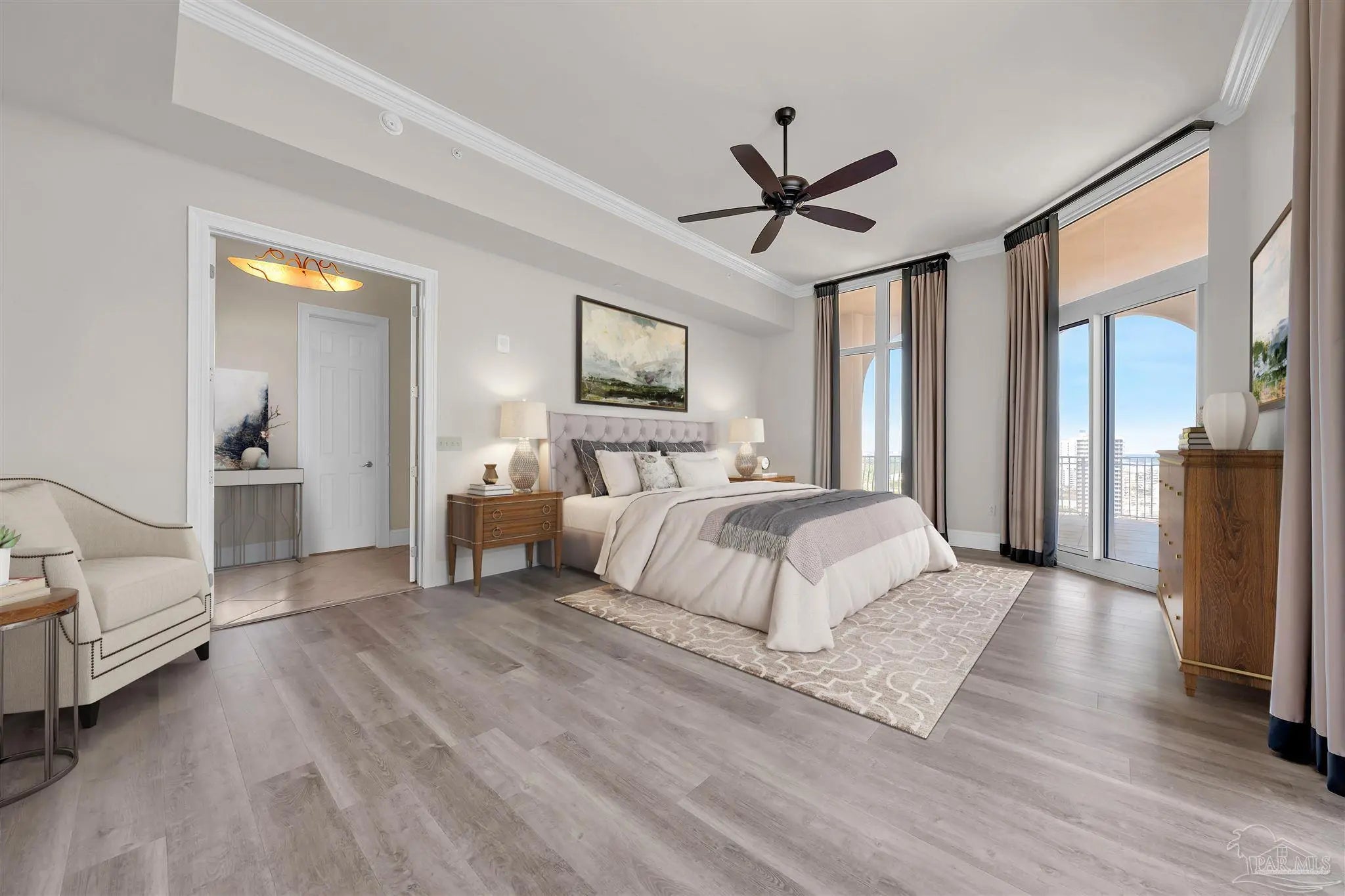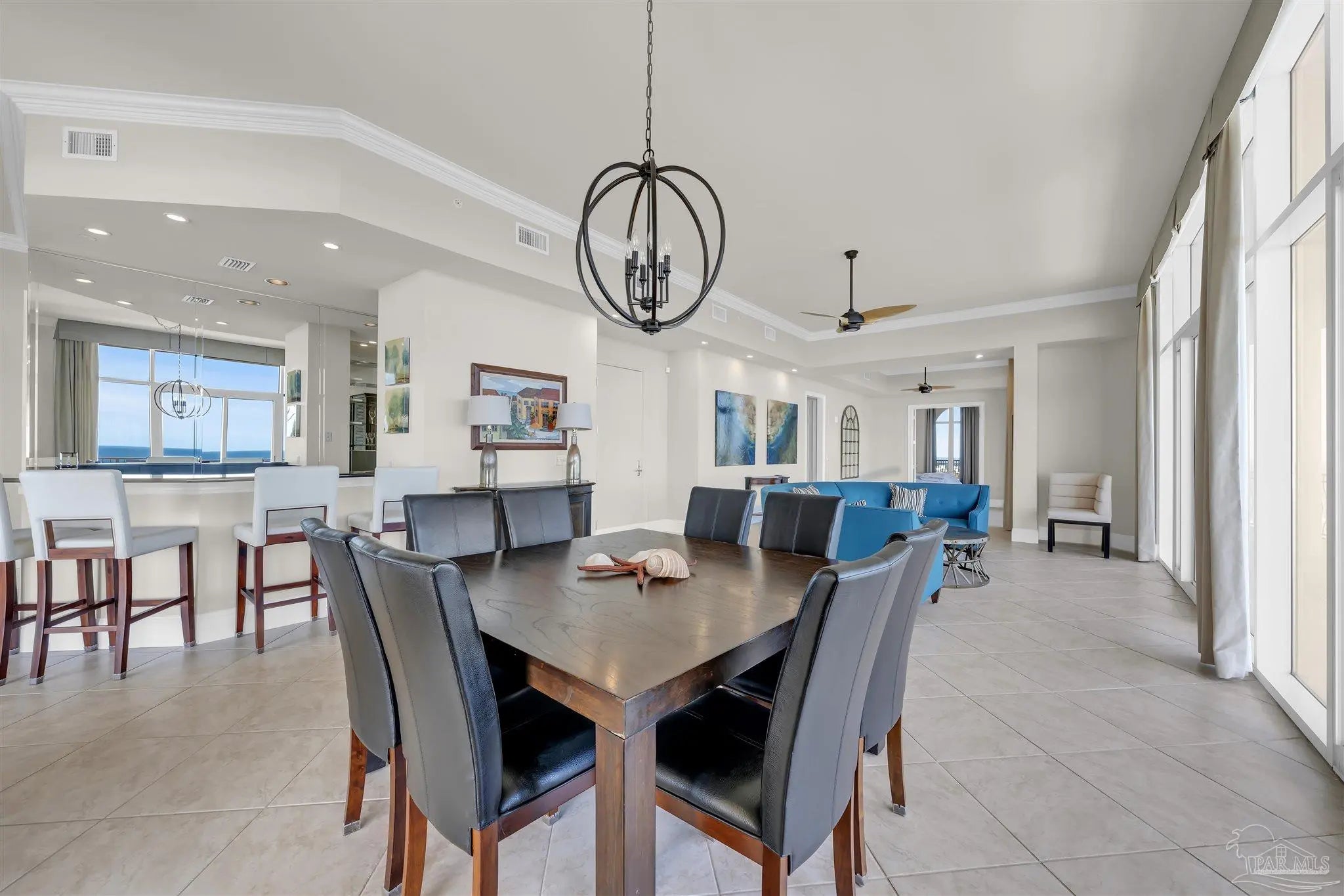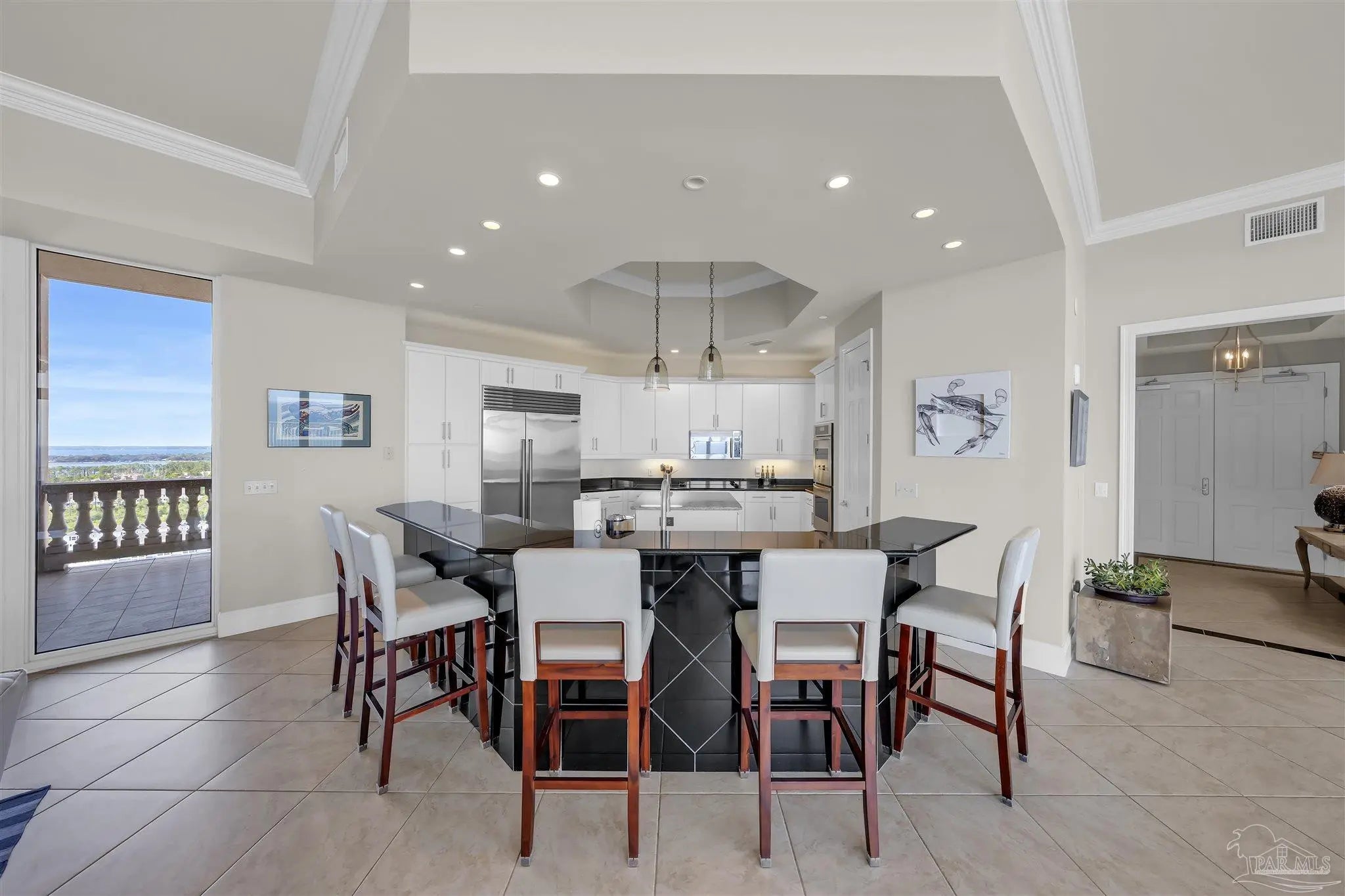 Experience unparalleled luxury in this extraordinary penthouse residence at La Riva East in Perdido Key, encompassing the entire 14th floor. Offering an impressive 4,868 sq. ft. of interior living space and an additional 2,982 sq. ft. of expansive balcony, this one-of-a-kind unit showcases breathtaking, panoramic view of the Gulf of Mexico and the pristine coastline. Designed for both elegance and privacy, the residence features five generously sized bedrooms, including a stunning Gulf-front primary suite and a secondary Gulf-front suite positioned on opposite ends. A private elevator opens directly into the residence, while abundant storage solutions are thoughtfully generated throughout. The gourmet kitchen is exquisitely designed with an expansive island, generous breakfast bar, premium finishes, and an elegant wet bar, ideal for sophisticated entertaining. Light-filled living and dining spaces are wrapped in floor-to-ceiling glass, enhanced by motorized window treatments for seamless comfort. The primary suite is a serene sanctuary, offering breathtaking sunrise views, dual walk-in closets, and a spa caliber bath with a jetted soaking tub and oversized walk-in shower. Four additional guest suite feature private ensuite baths with three capturing sweeping island vistas as private balcony access. A premium deeded parking space under the portico provides effortless access, while a private double garage with additional storage is available for purchase. With only 66 residences, La Riva offers a rare sense of privacy along 520 feet of pristine, sugar-white shoreline. Residents enjoy world-class amenities, including a Gulf-front heated indoor pool, outdoor pool and spa, a state-of -the-art fitness center with sauna and steam room, gathering room and an exclusive theater. A one-year minimum rental policy preserves the tranquil, residential ambiance.