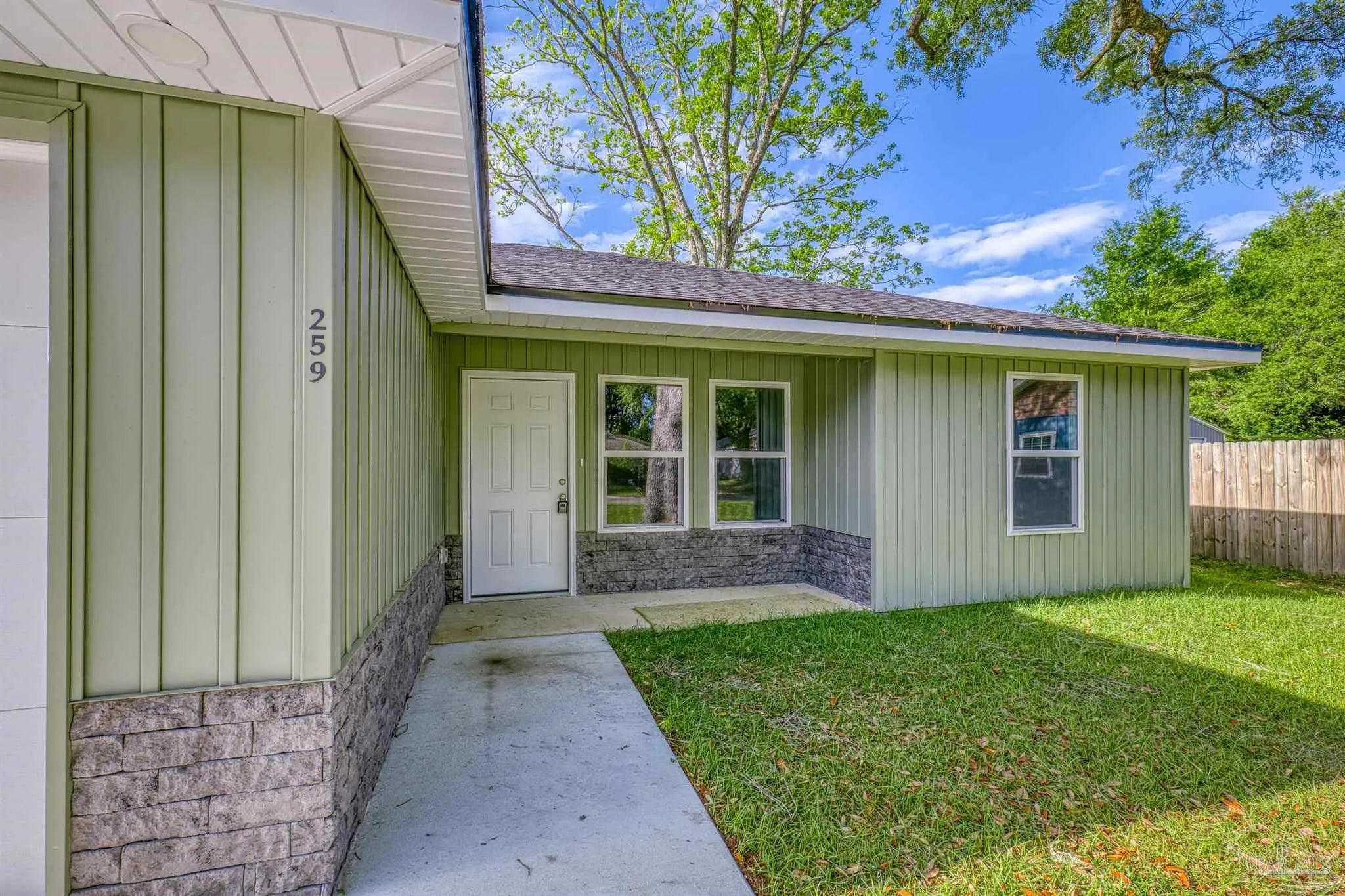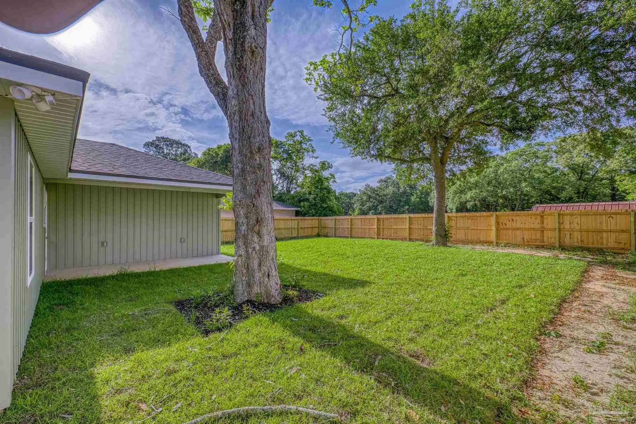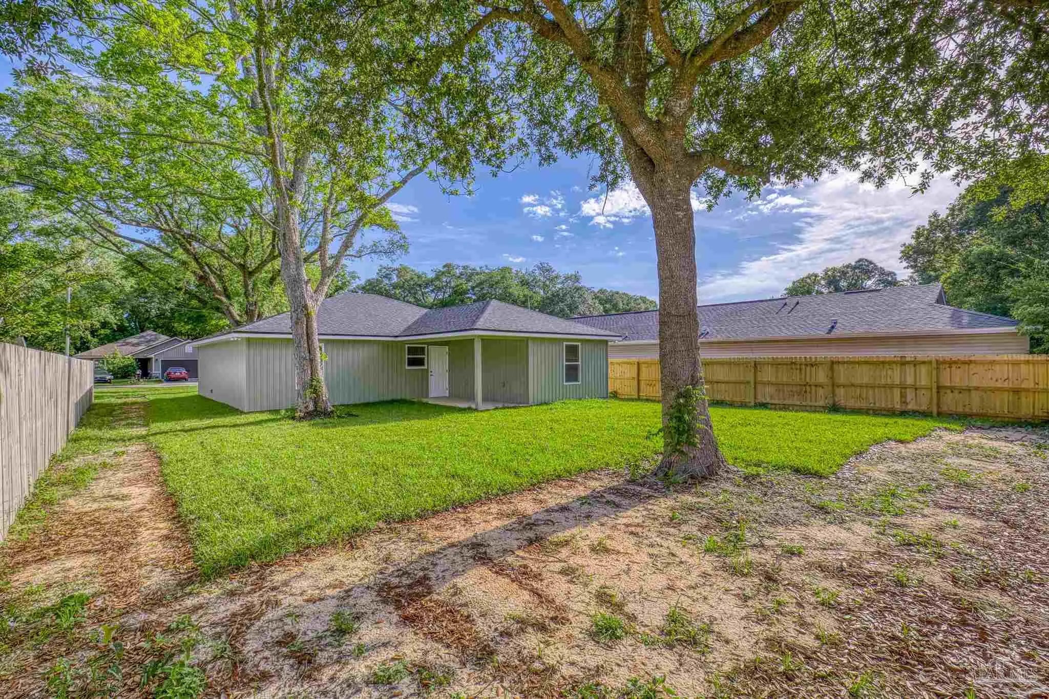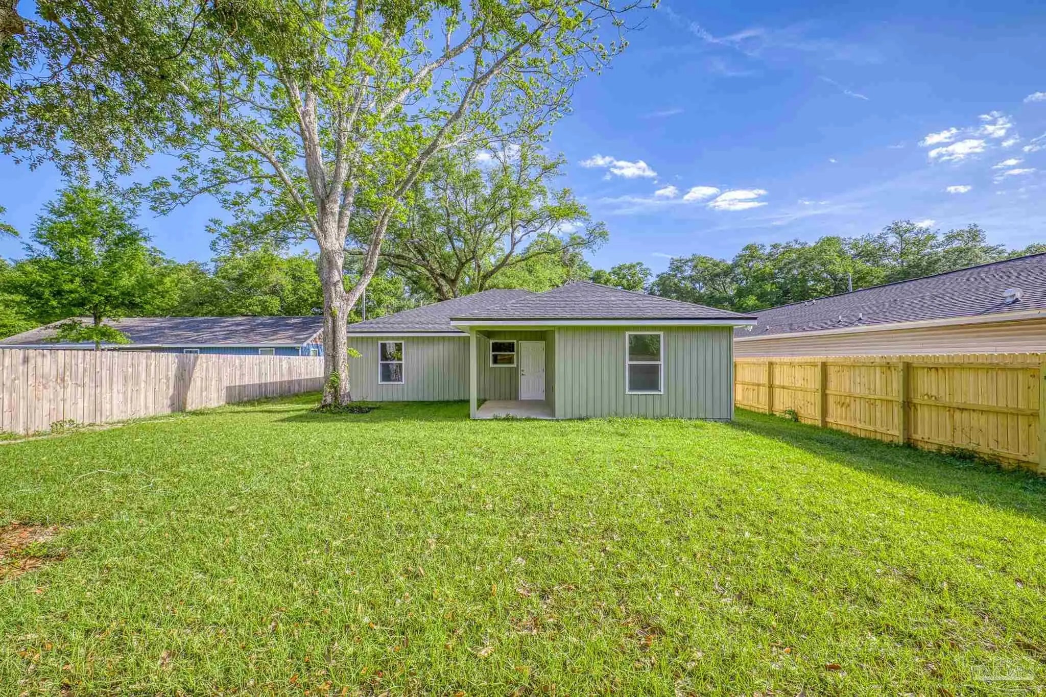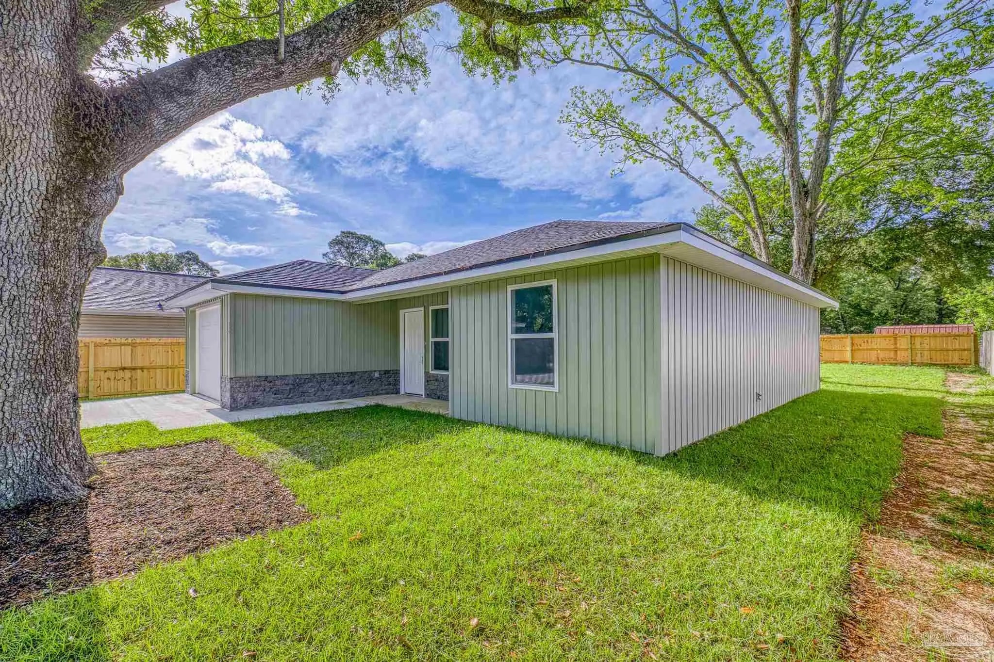 Brand New Home with Premium Finishes and Custom Features on Dead End Street with NO HOA! Minutes from Olive Rd and Davis Hwy, not only is the home Stunning, but convenient as well with less than 10 minutes to malls, shopping, restaurants, Hospitals and the Airport! Just under 1250 Sq Ft of living space with 3 Bedrooms and 2 Full Bathrooms. High Ceilings greet you in the living space, with LED lighting for energy efficiency and waterproof ceramic wood look flooring throughout the kitchen and bathrooms makes cleaning effortless. The kitchen is fitted with elegant Granite counters and a service window/breakfast bar. Painted cabinets with stainless appliances and a double door fridge. The master bedroom features a tray ceiling with ensuite bathroom and custom tile shower. The home is fitted with a privacy fence at the seller's expense and the one car garage has an additional back yard access. Hurricane Impact Windows! No shutters necessary. Spacious backyard with covered back porch for tons of outdoor possibilities!