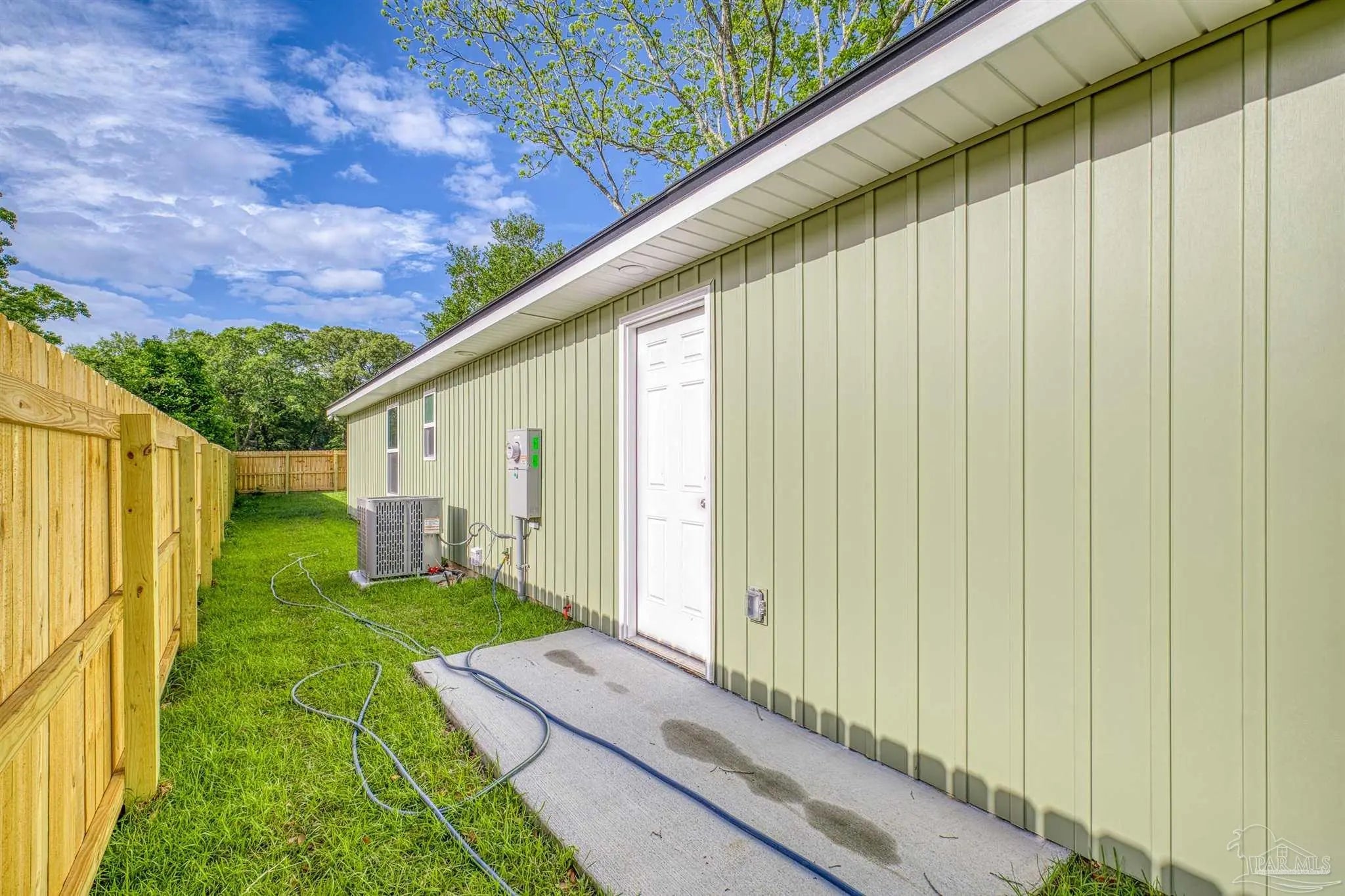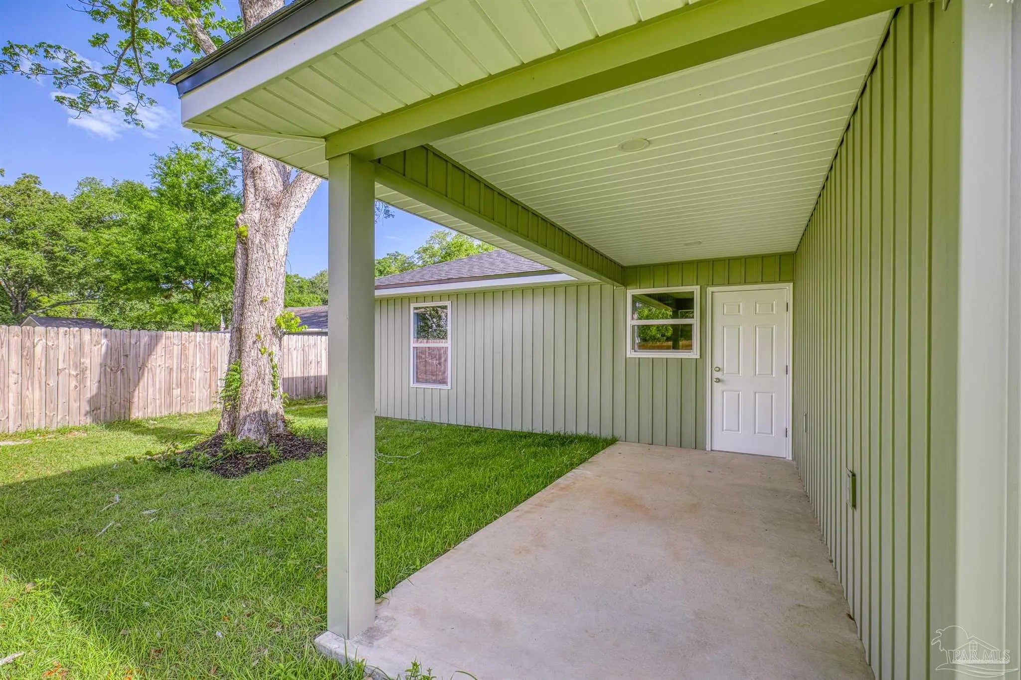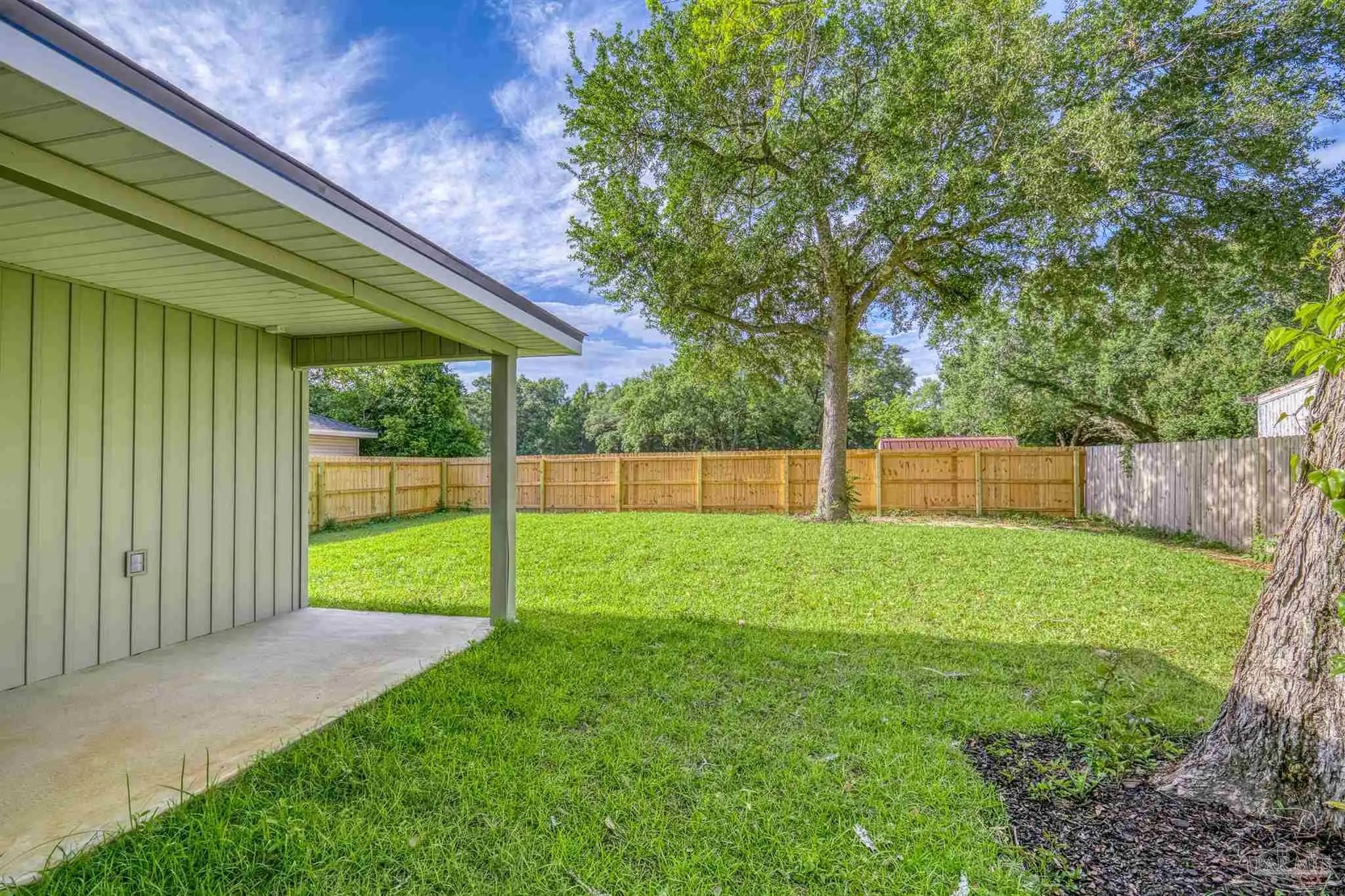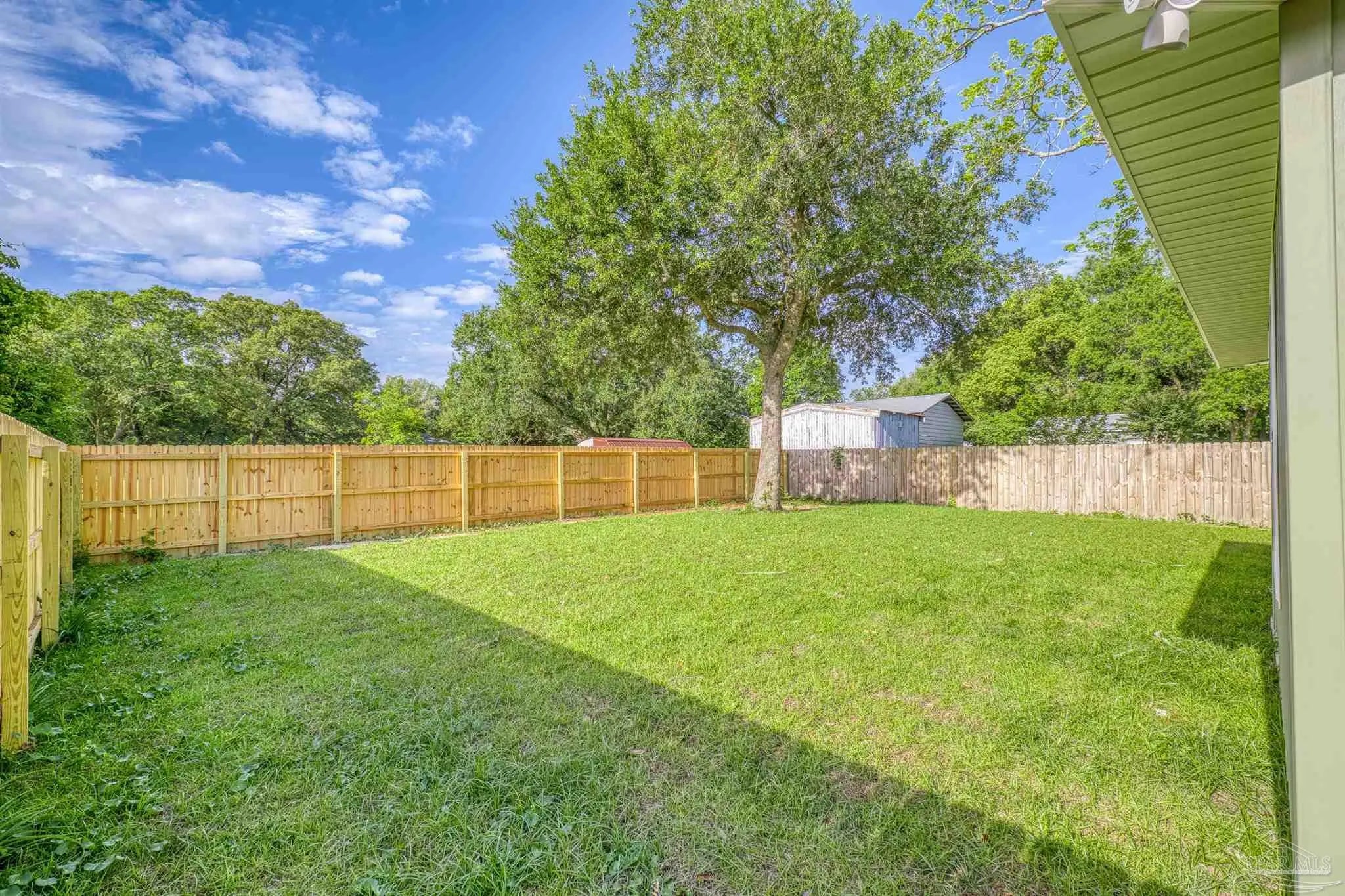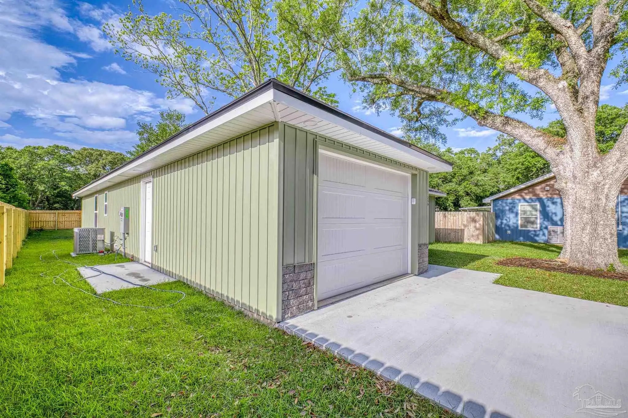 Brand New Home with Premium Finishes and Custom Features on Dead End Street with NO HOA! Minutes from Olive Rd and Davis Hwy, not only is the home Stunning, but convenient as well with less than 10 minutes to malls, shopping, restaurants, Hospitals and the Airport! Just under 1250 Sq Ft of living space with 3 Bedrooms and 2 Full Bathrooms. High Ceilings greet you in the living space, with LED lighting for energy efficiency and waterproof ceramic wood look flooring throughout the kitchen and bathrooms makes cleaning effortless. The kitchen is fitted with elegant Granite counters and a service window/breakfast bar. Painted cabinets with stainless appliances and a double door fridge. The master bedroom features a tray ceiling with ensuite bathroom and custom tile shower. The home is fitted with a privacy fence at the seller's expense and the one car garage has an additional back yard access. Hurricane Impact Windows! No shutters necessary. Spacious backyard with covered back porch for tons of outdoor possibilities!
