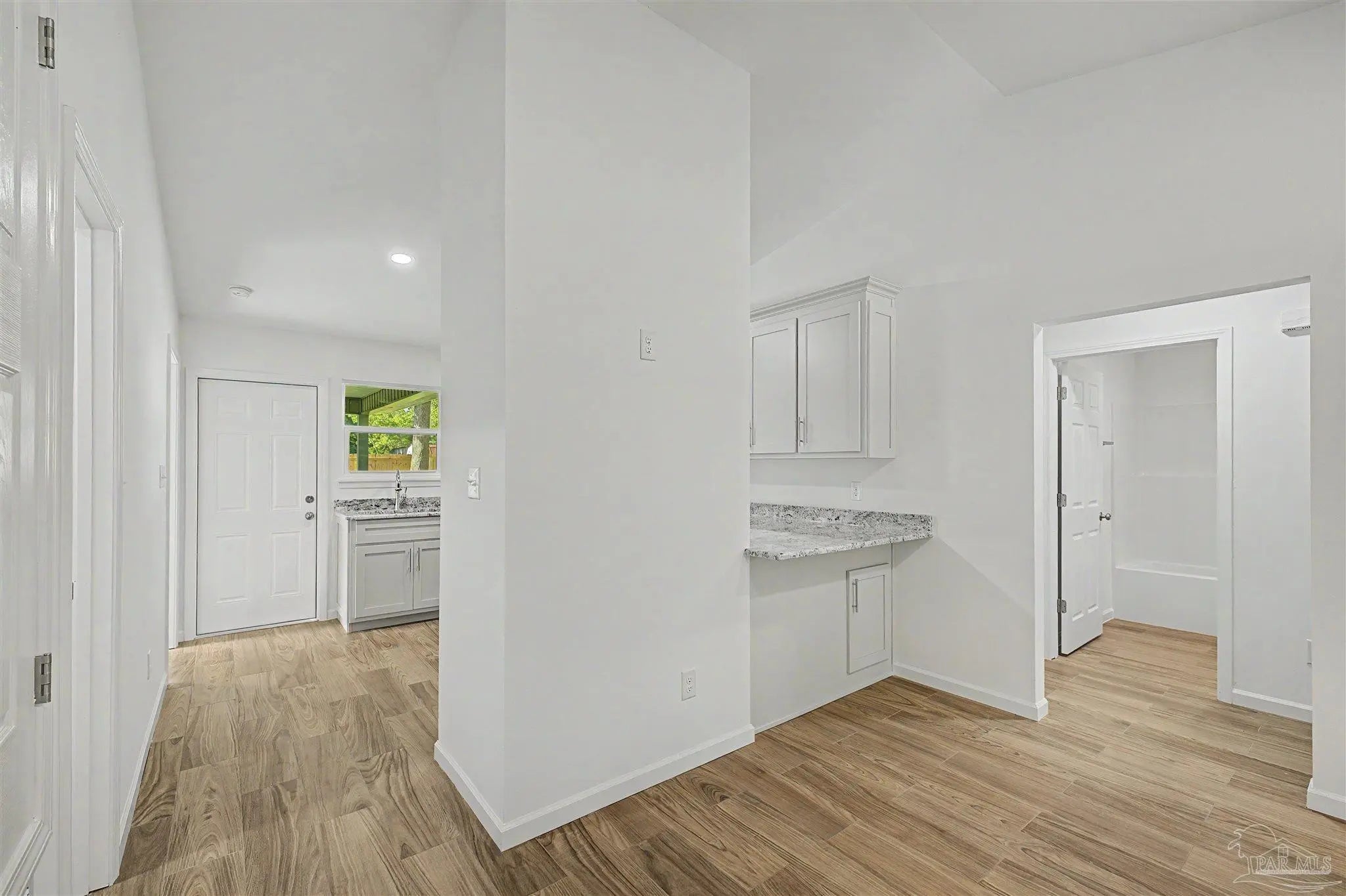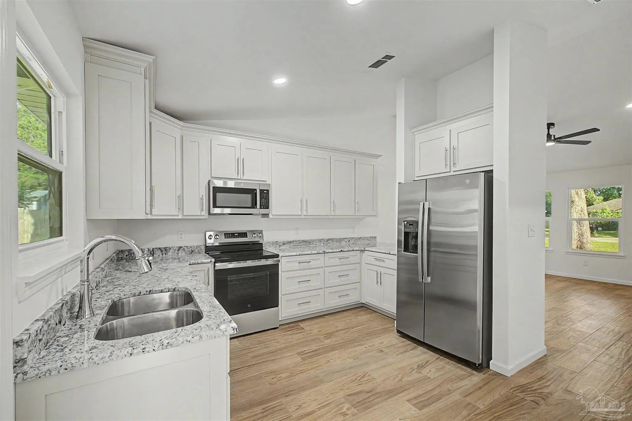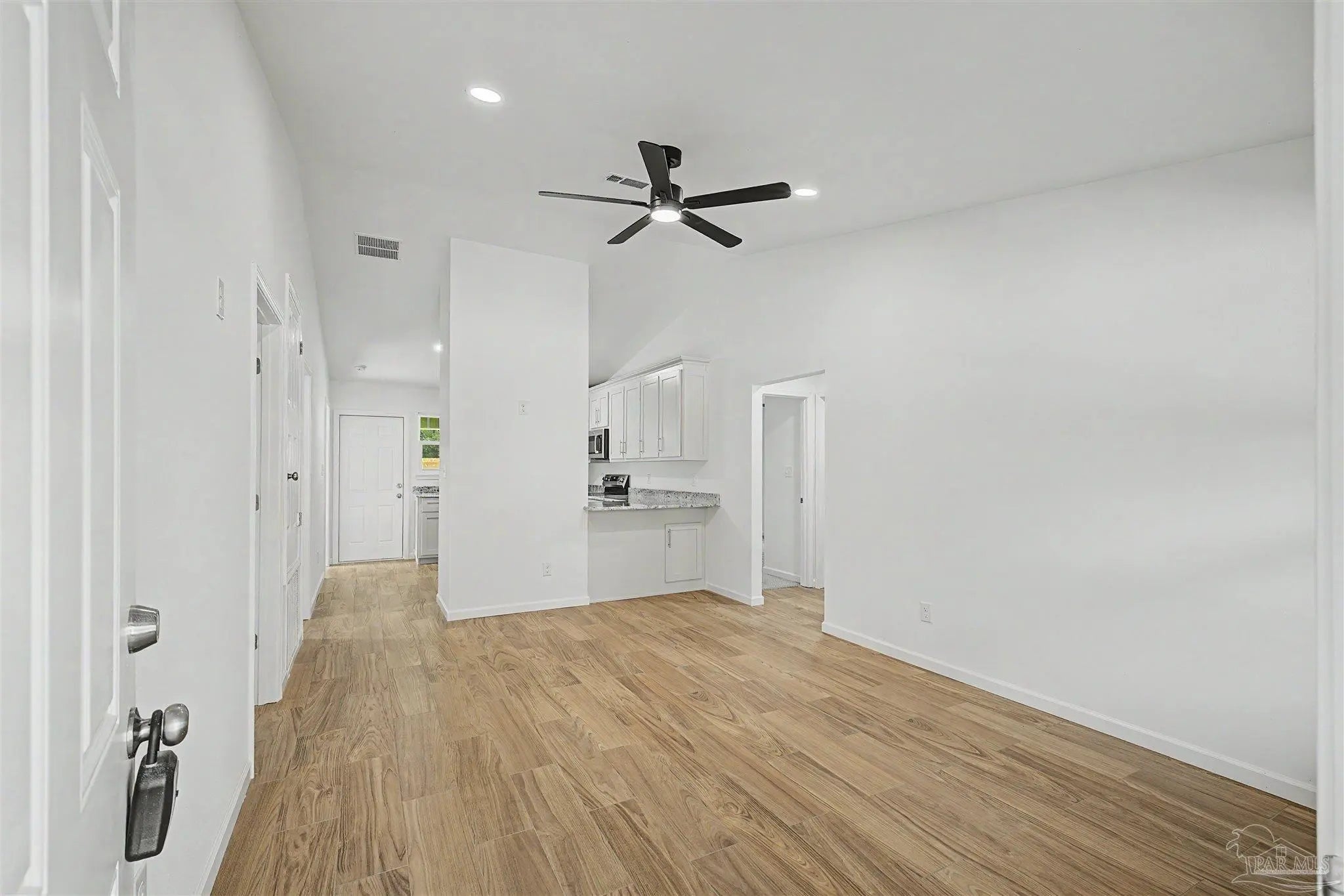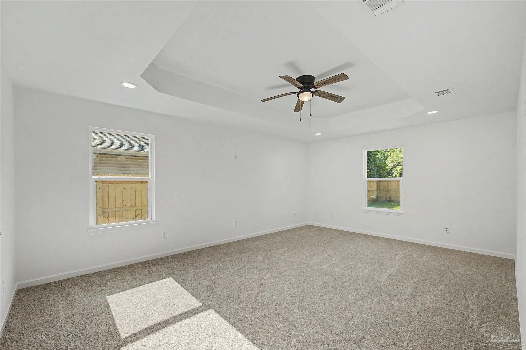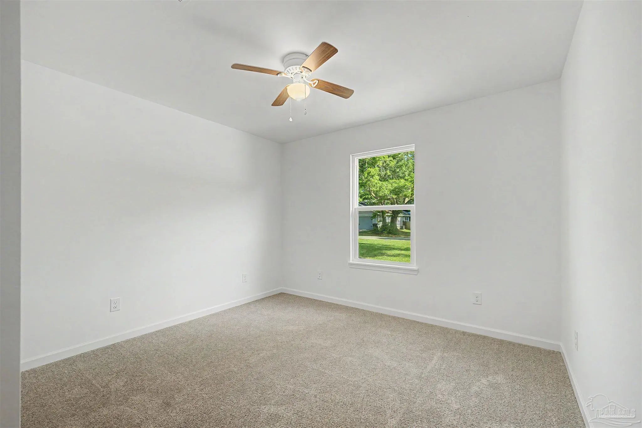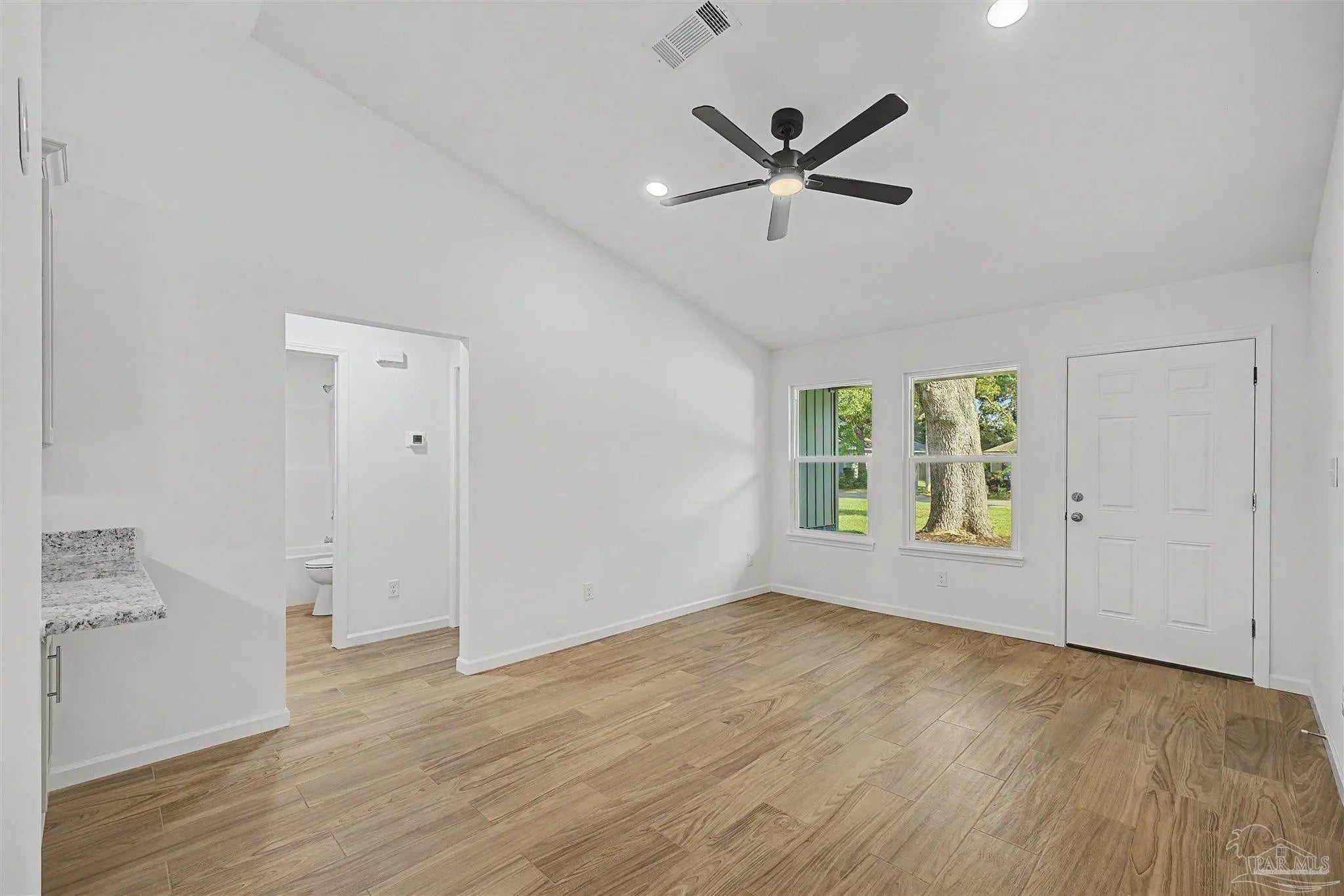 Brand New Home with Premium Finishes and Custom Features on Dead End Street with NO HOA! Minutes from Olive Rd and Davis Hwy, not only is the home Stunning, but convenient as well with less than 10 minutes to malls, shopping, restaurants, Hospitals and the Airport! Just under 1250 Sq Ft of living space with 3 Bedrooms and 2 Full Bathrooms. High Ceilings greet you in the living space, with LED lighting for energy efficiency and waterproof ceramic wood look flooring throughout the kitchen and bathrooms makes cleaning effortless. The kitchen is fitted with elegant Granite counters and a service window/breakfast bar. Painted cabinets with stainless appliances and a double door fridge. The master bedroom features a tray ceiling with ensuite bathroom and custom tile shower. The home is fitted with a privacy fence at the seller's expense and the one car garage has an additional back yard access. Hurricane Impact Windows! No shutters necessary. Spacious backyard with covered back porch for tons of outdoor possibilities!