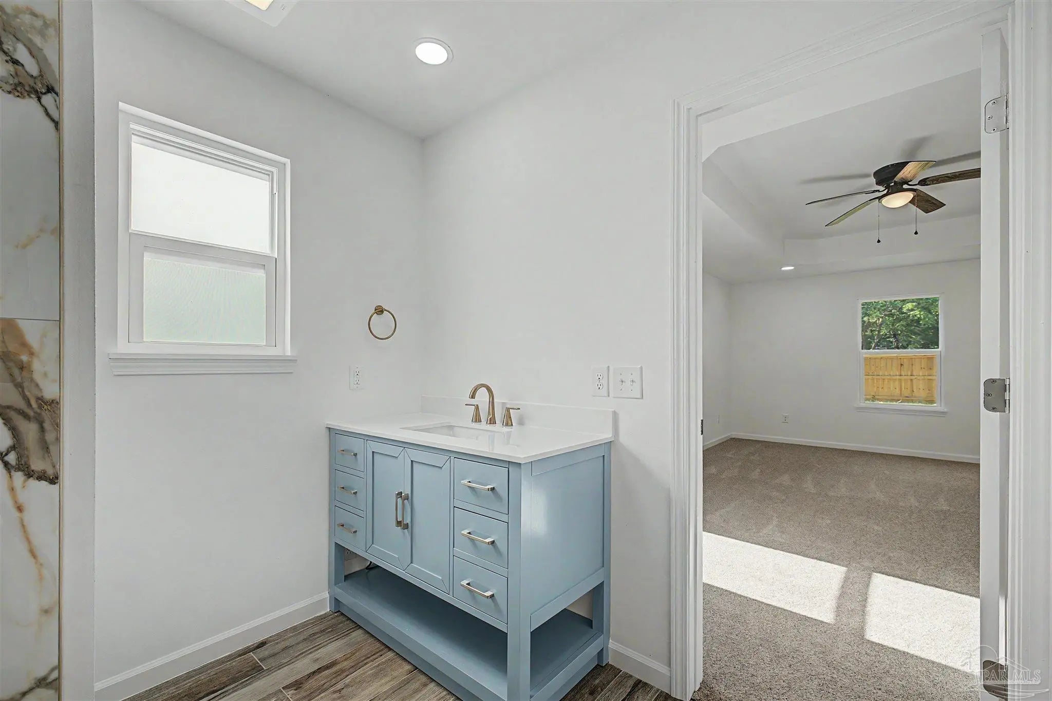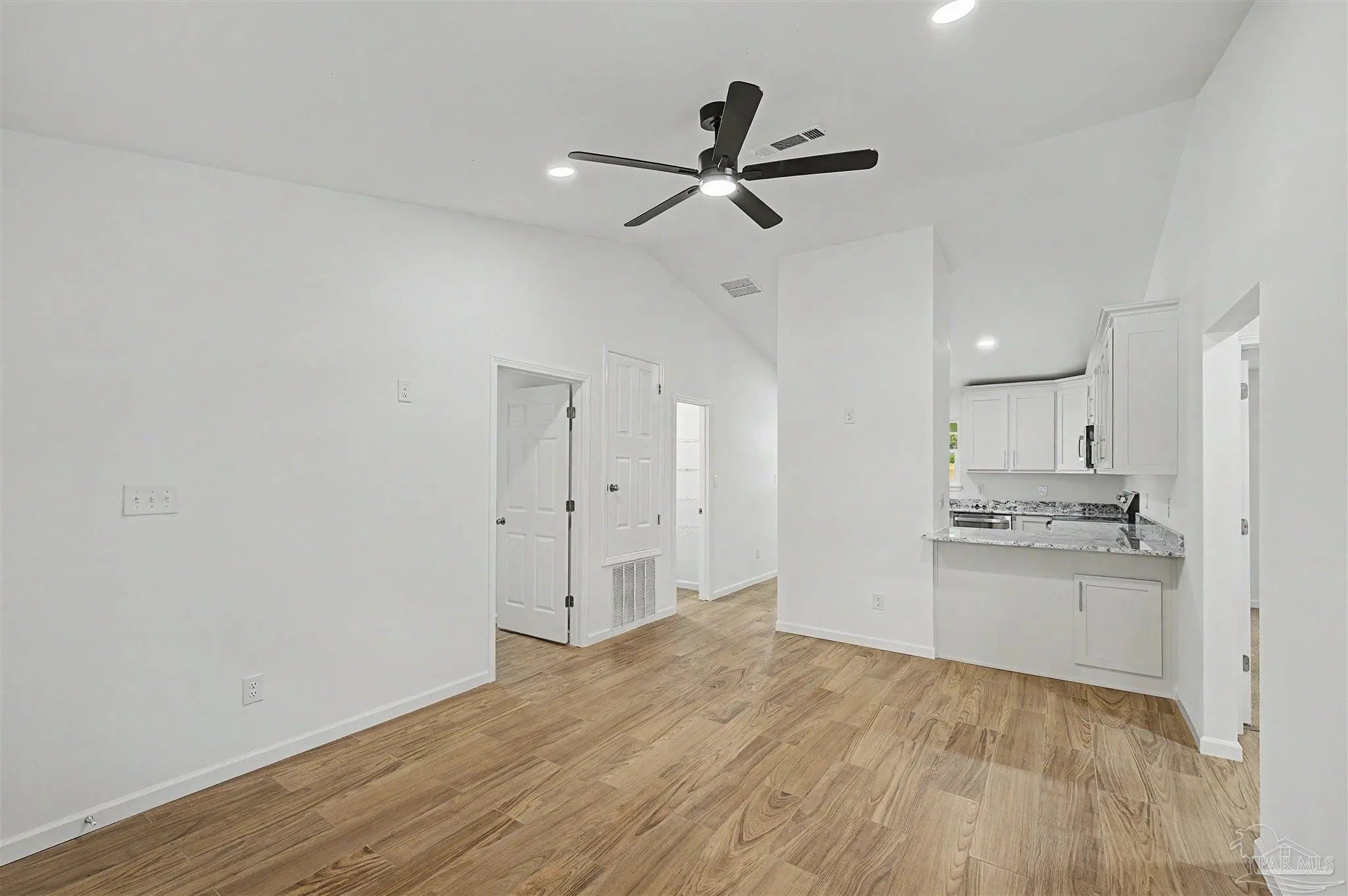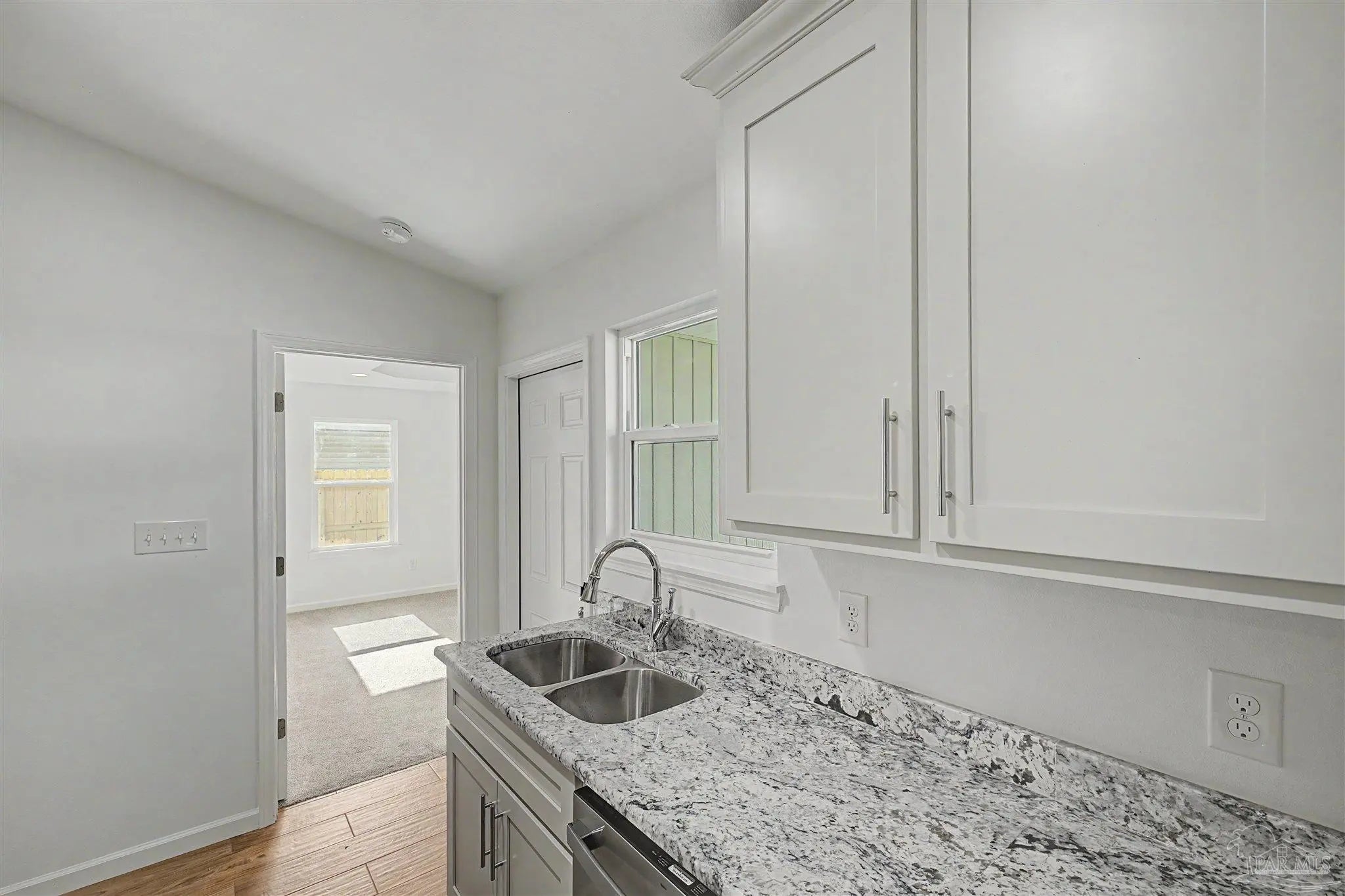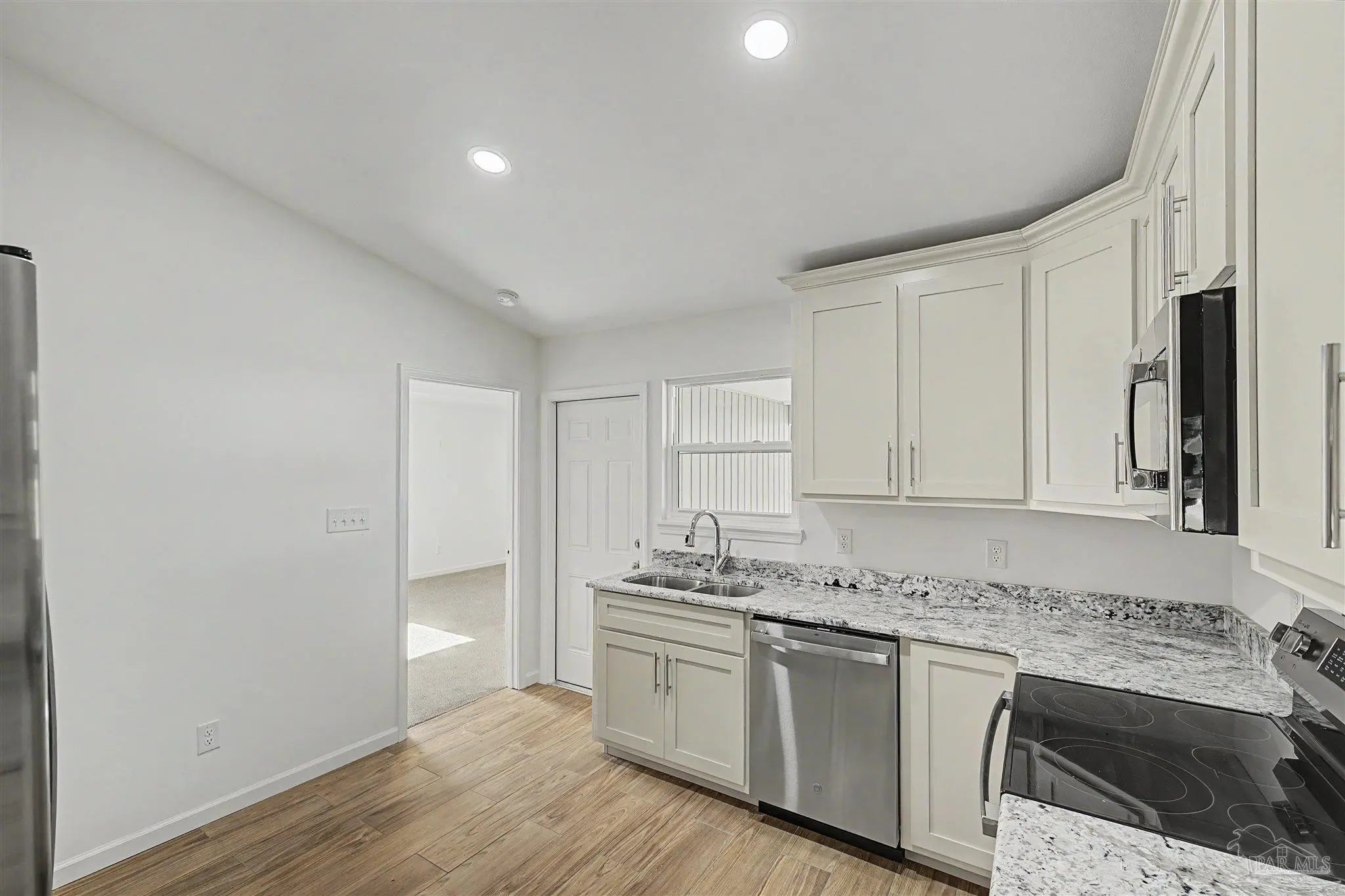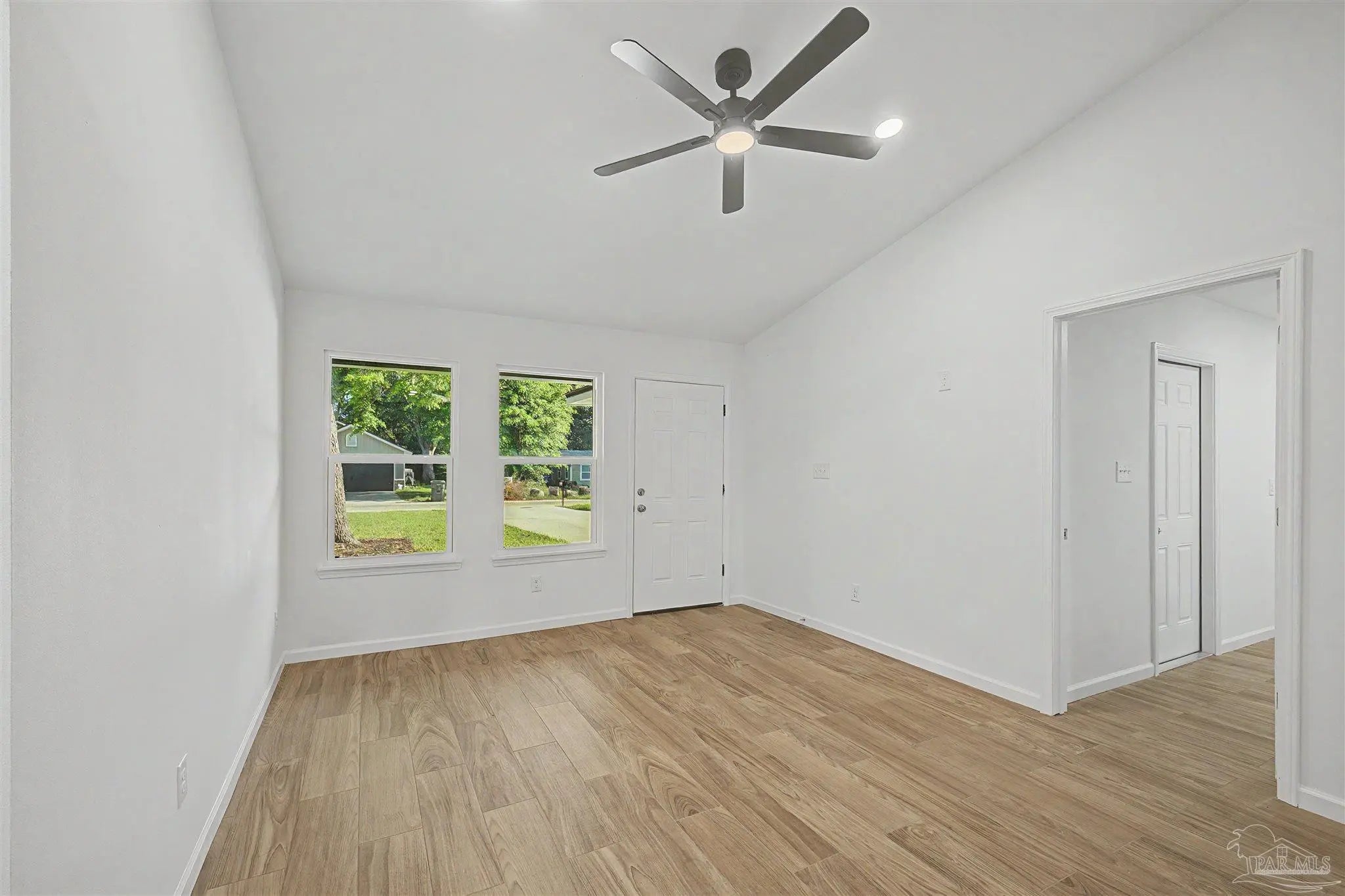 Brand New Home with Premium Finishes and Custom Features on Dead End Street with NO HOA! Minutes from Olive Rd and Davis Hwy, not only is the home Stunning, but convenient as well with less than 10 minutes to malls, shopping, restaurants, Hospitals and the Airport! Just under 1250 Sq Ft of living space with 3 Bedrooms and 2 Full Bathrooms. High Ceilings greet you in the living space, with LED lighting for energy efficiency and waterproof ceramic wood look flooring throughout the kitchen and bathrooms makes cleaning effortless. The kitchen is fitted with elegant Granite counters and a service window/breakfast bar. Painted cabinets with stainless appliances and a double door fridge. The master bedroom features a tray ceiling with ensuite bathroom and custom tile shower. The home is fitted with a privacy fence at the seller's expense and the one car garage has an additional back yard access. Hurricane Impact Windows! No shutters necessary. Spacious backyard with covered back porch for tons of outdoor possibilities!